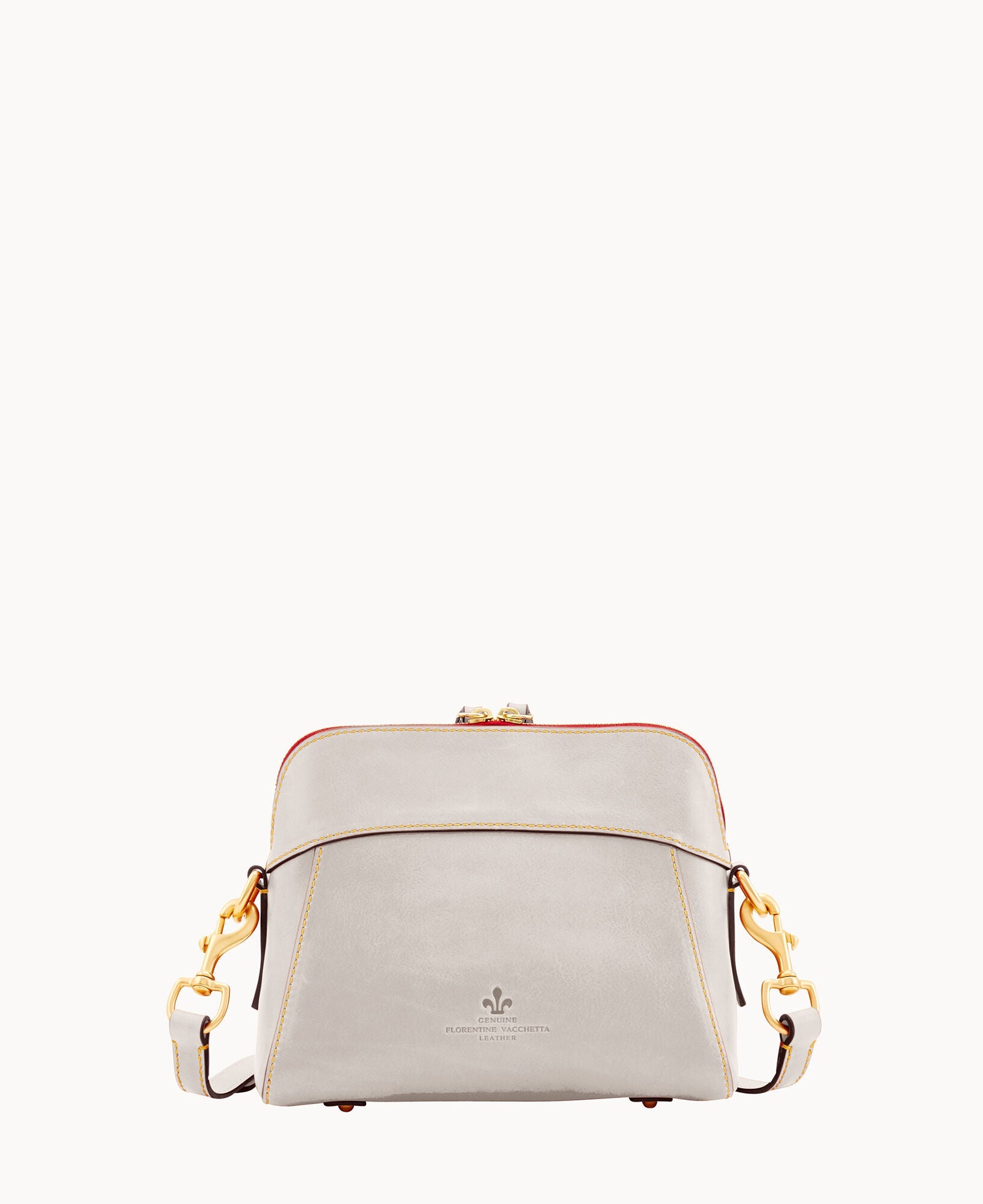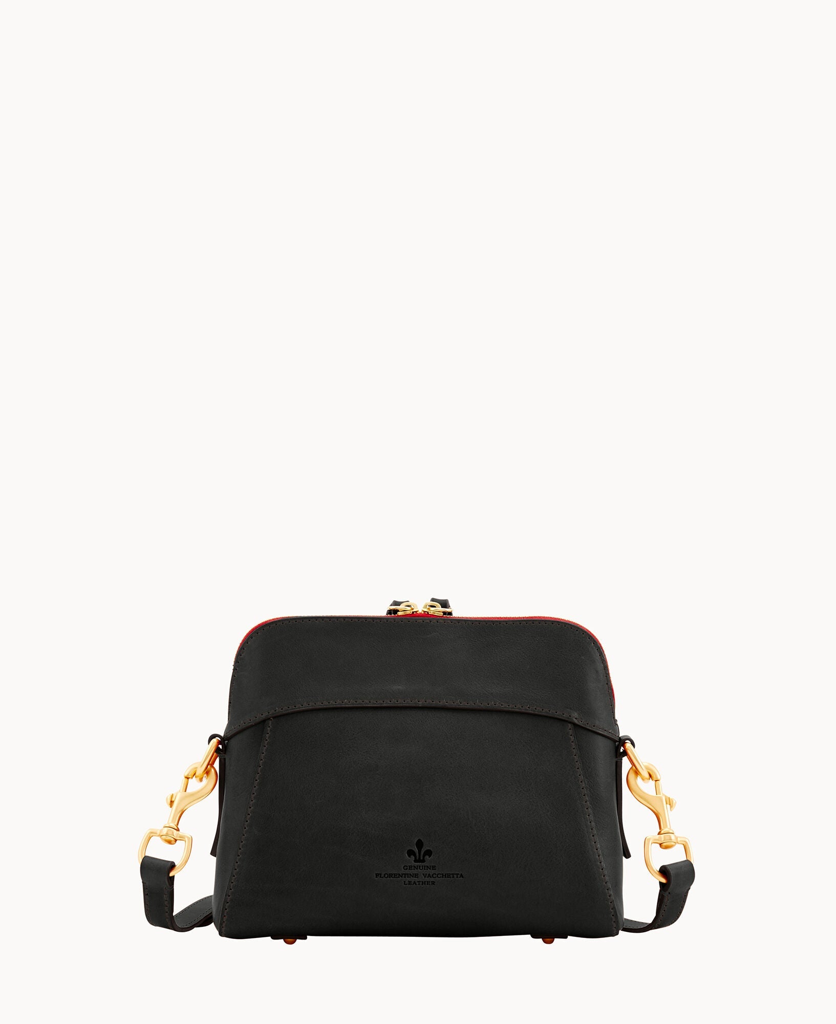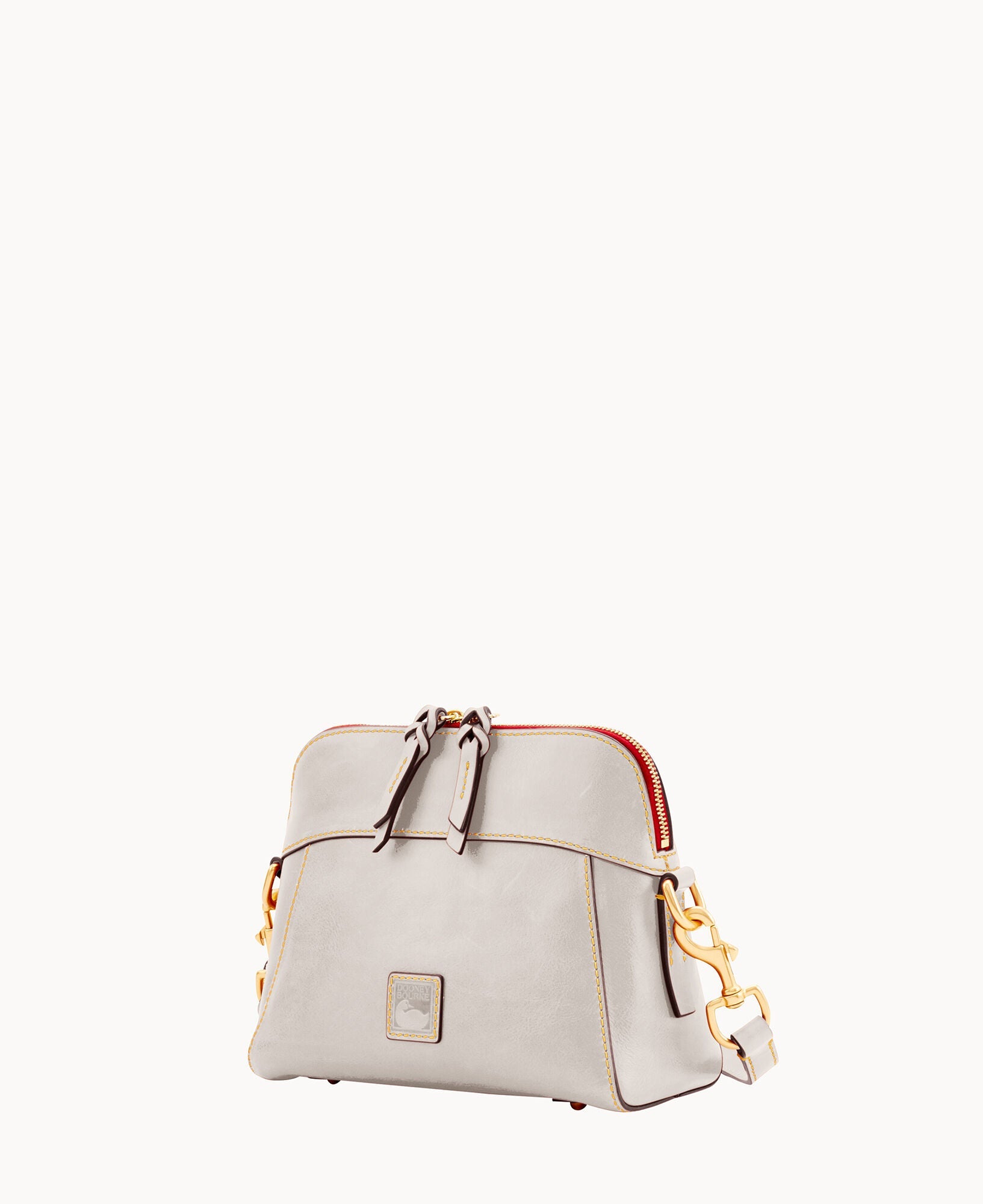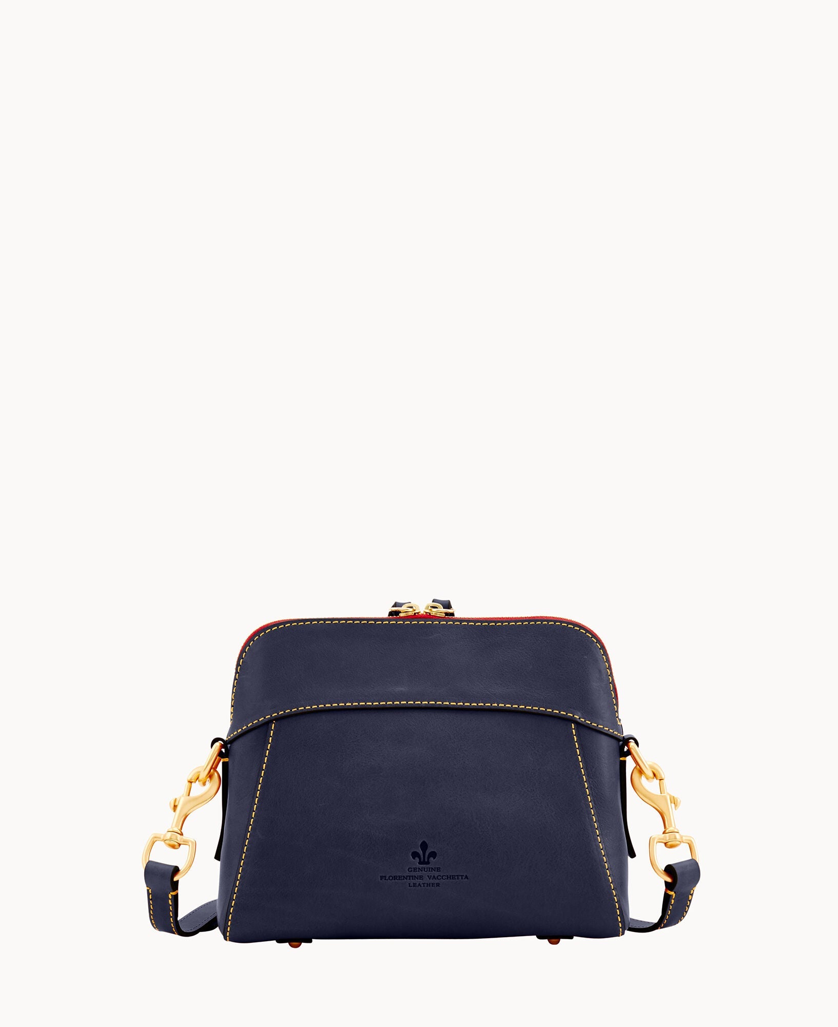 One inside zip pocket. Two inside pockets. Cell phone pocket. Inside key hook. Strap drop length 22.5". Lined. Feet. Zipper closure.