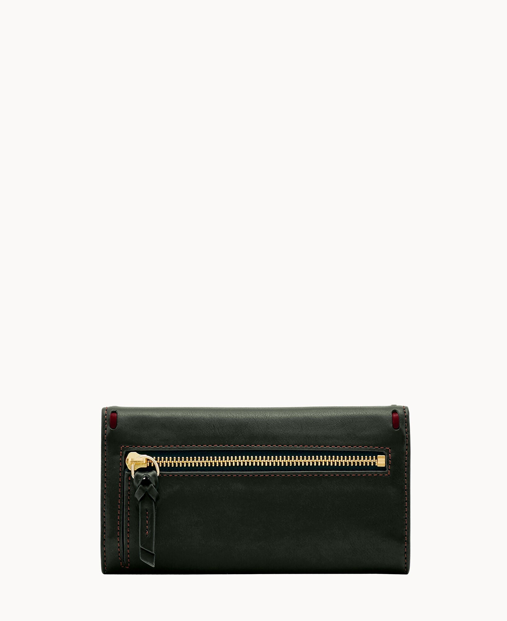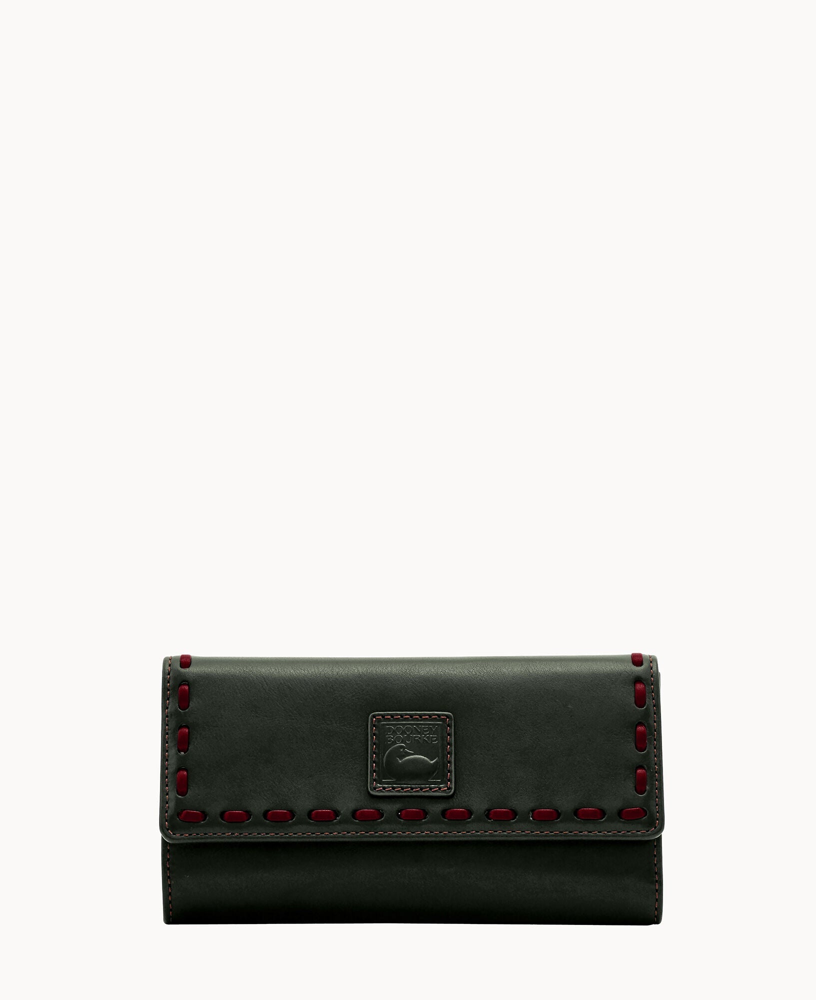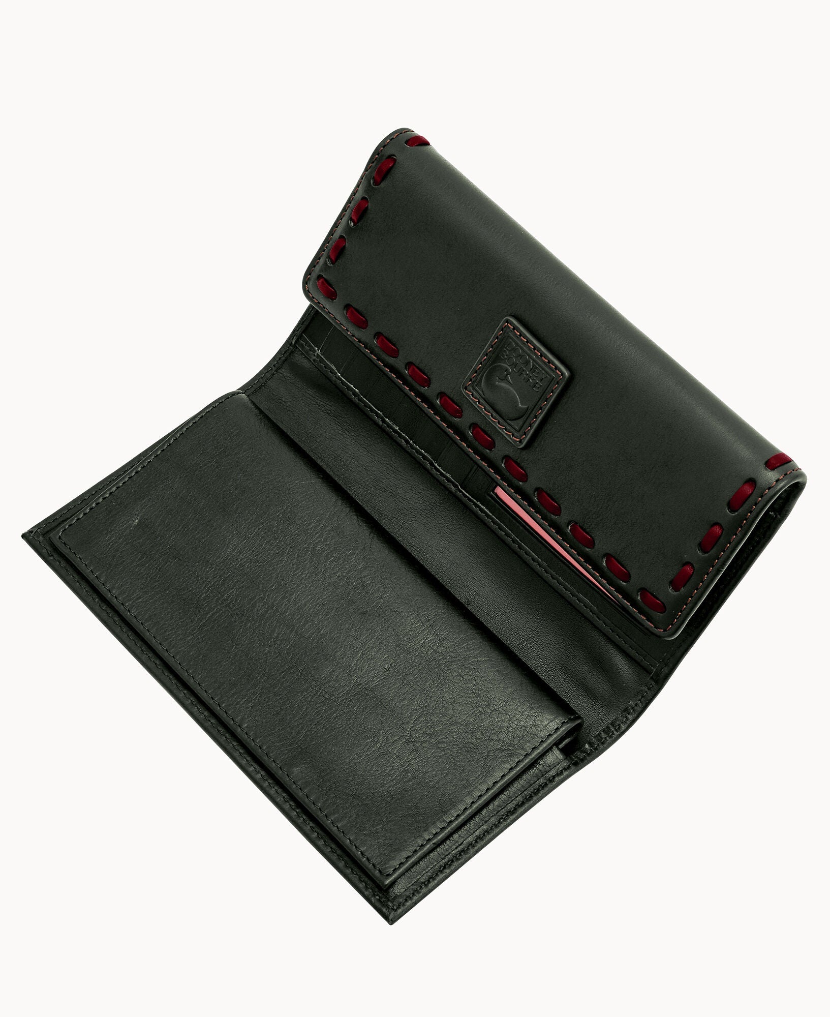One outside zip pocket. Two inside pockets. Two bill compartments. License pocket with window. Seven credit card slots. Lined. Snap closure.