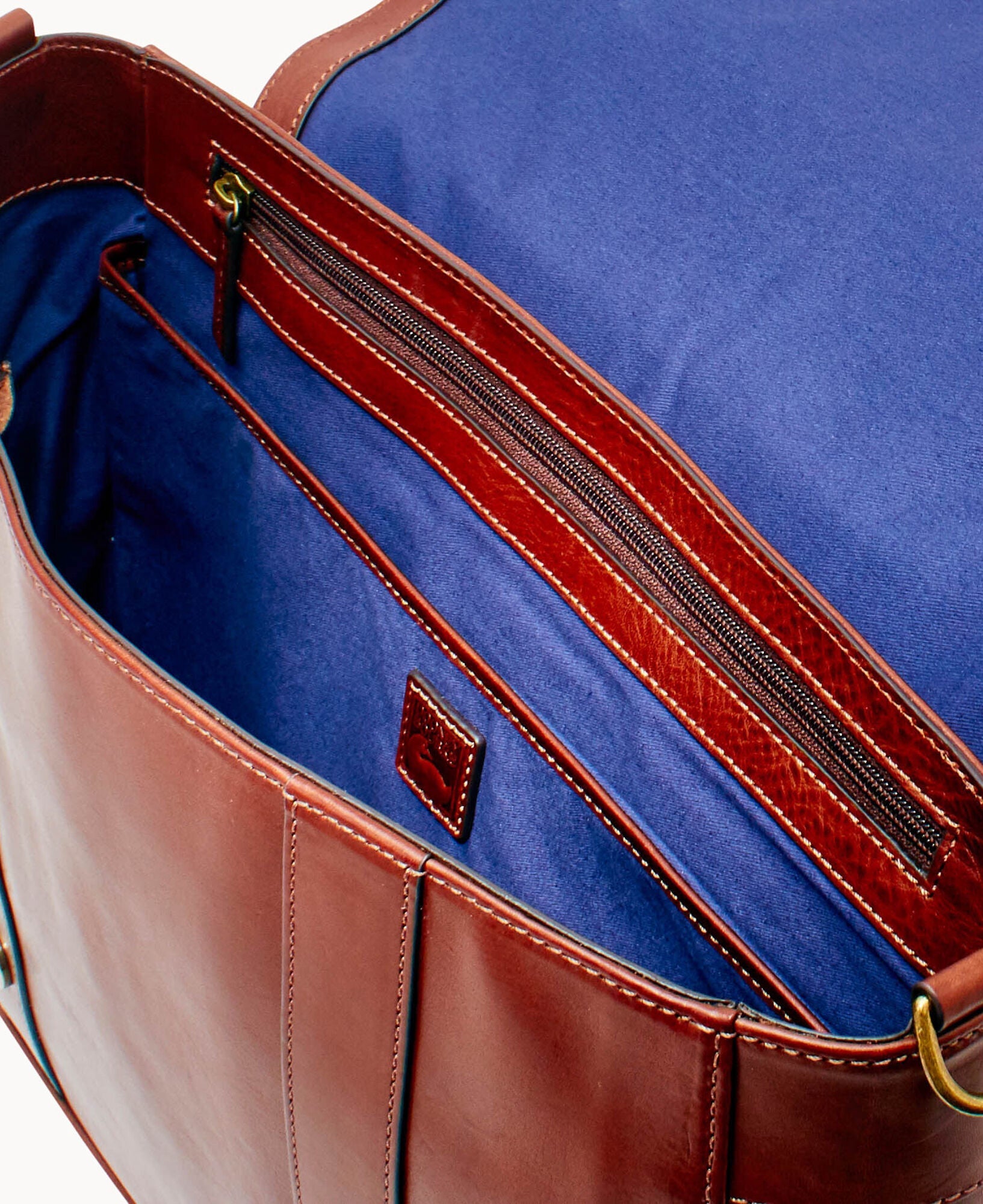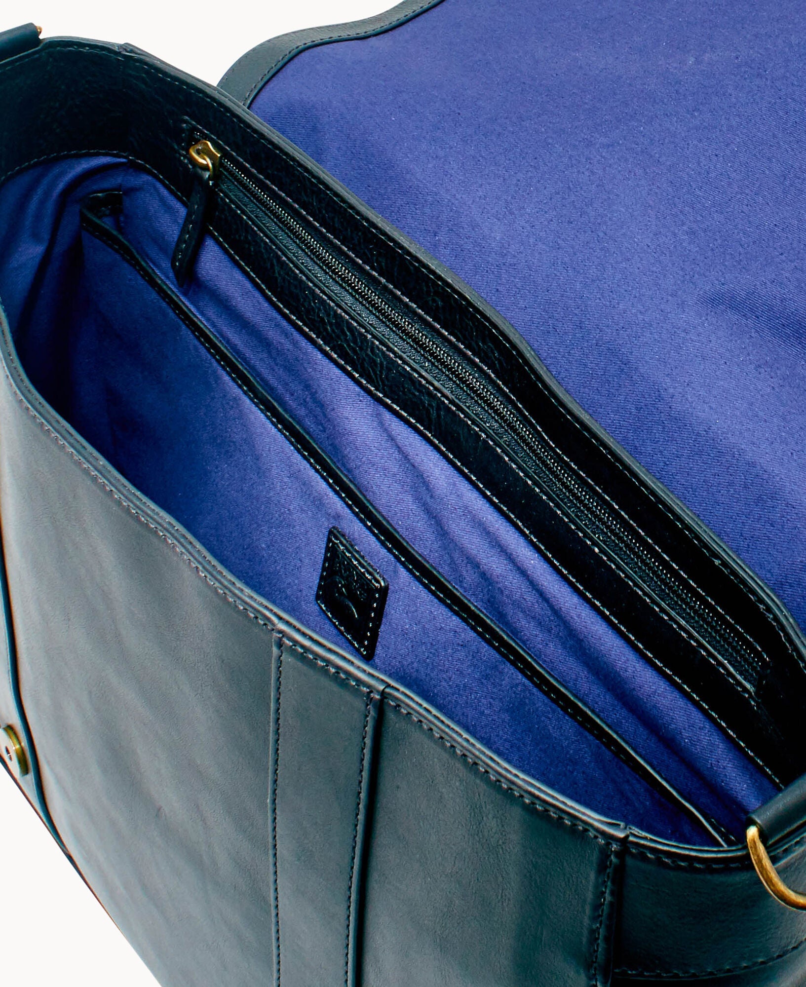One inside zip pocket. Multifunctional pockets. Laptop compartment. Handle drop length 7.75". Adjustable shoulder strap. Strap drop length 25". Lined. Feet. Magnetic snap flap closure.