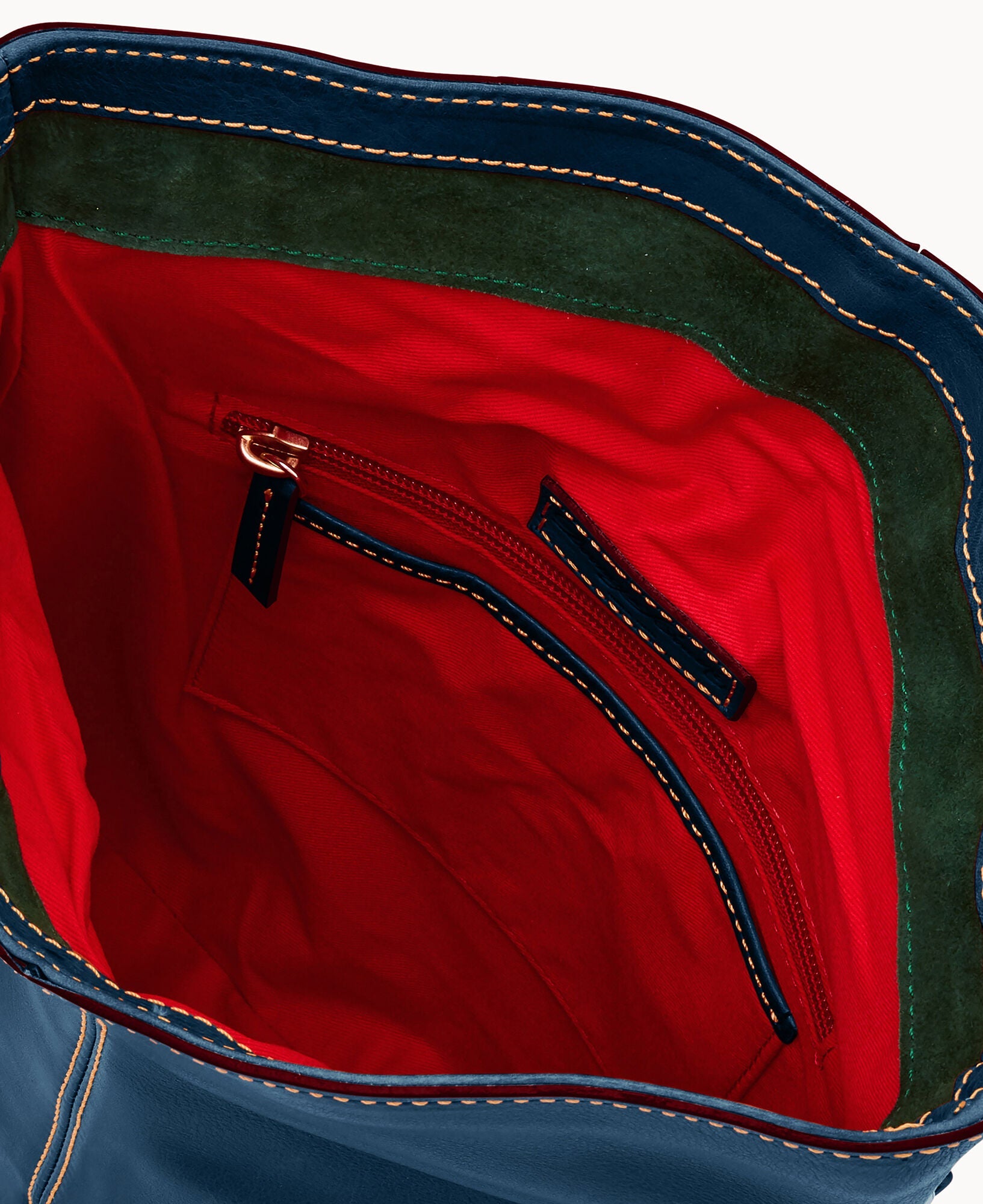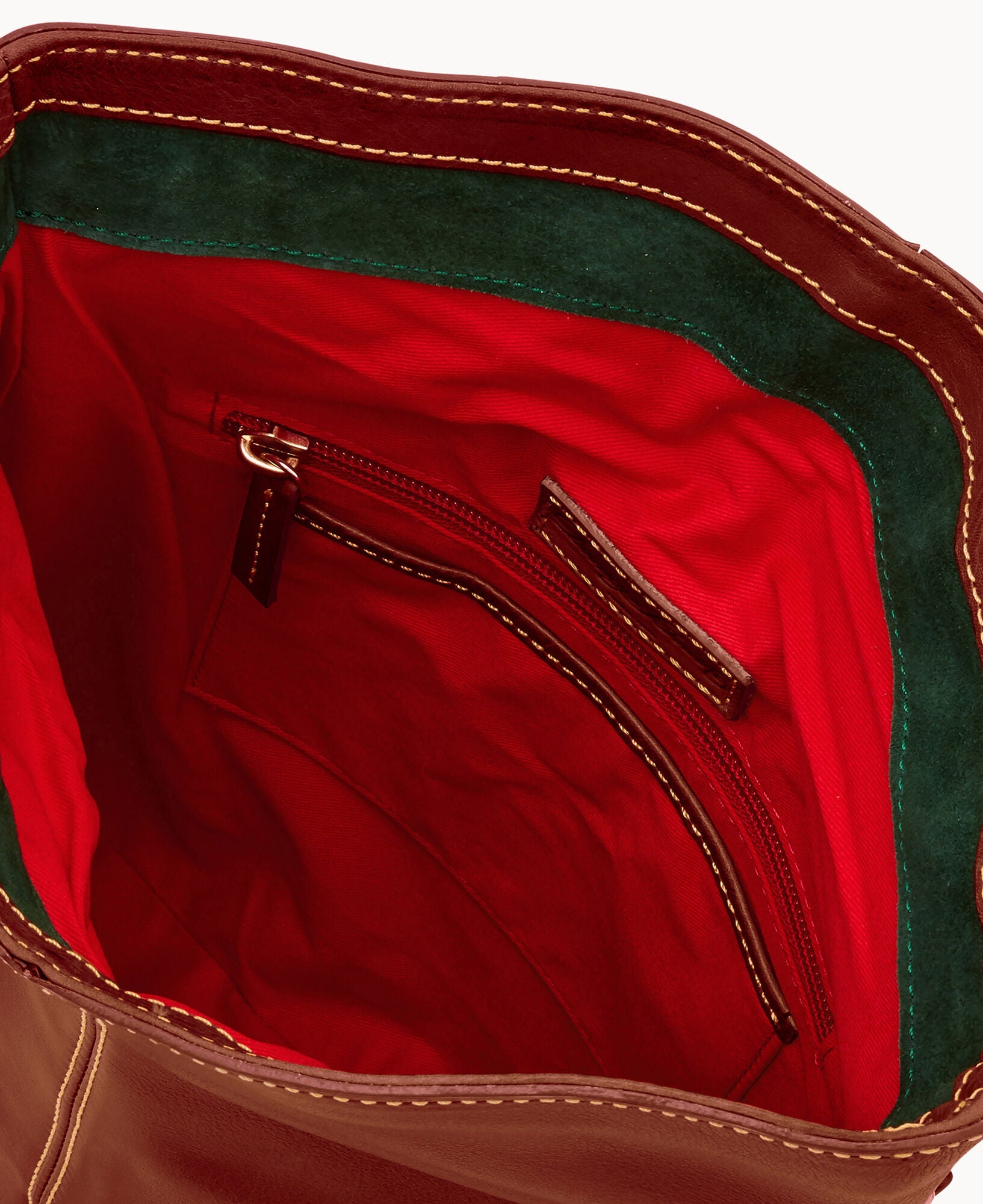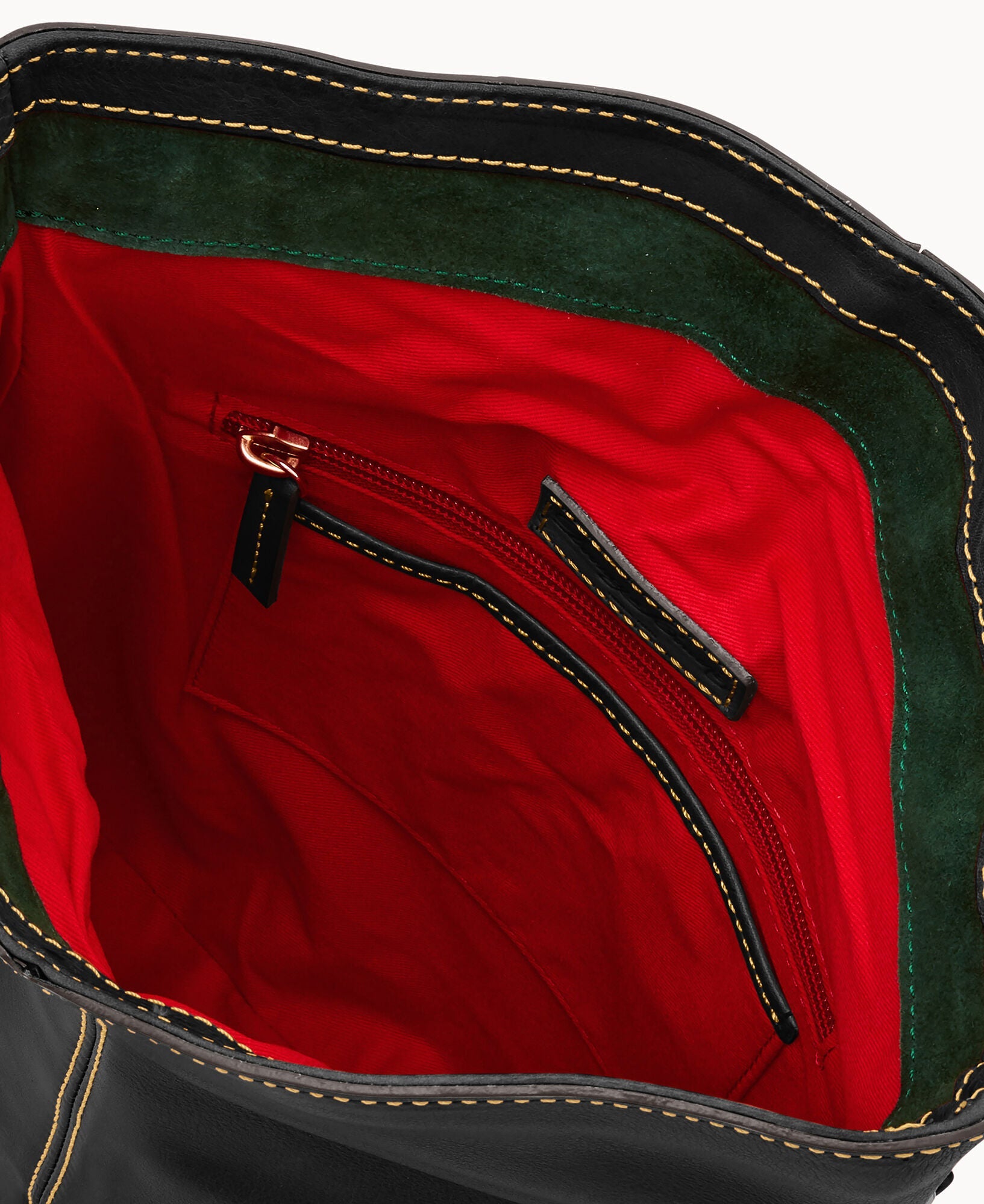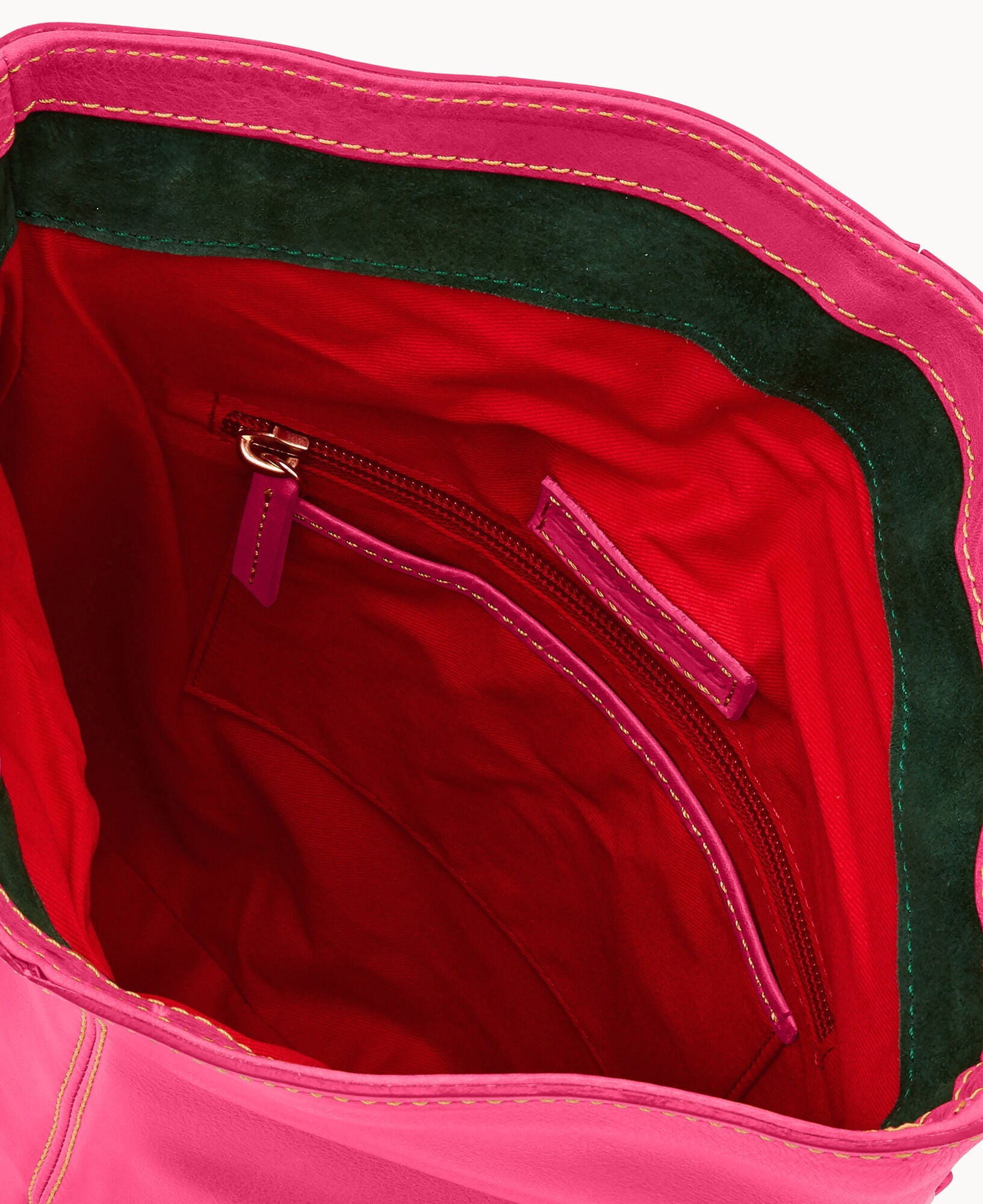 One outside zip pocket. One inside zip pocket. One inside pocket. Cell phone pocket. Inside key hook. Handle drop length 5". Adjustable shoulder strap. Strap drop length 24". Lined. Feet. Toggle closure.