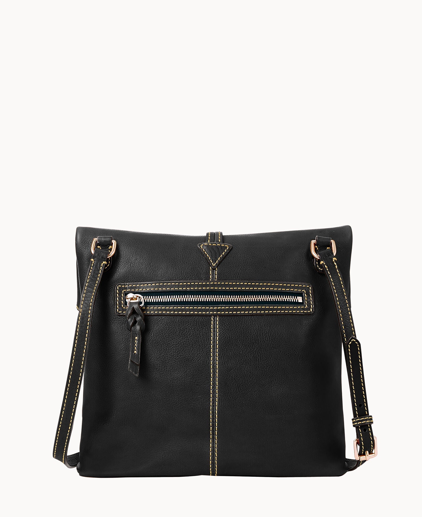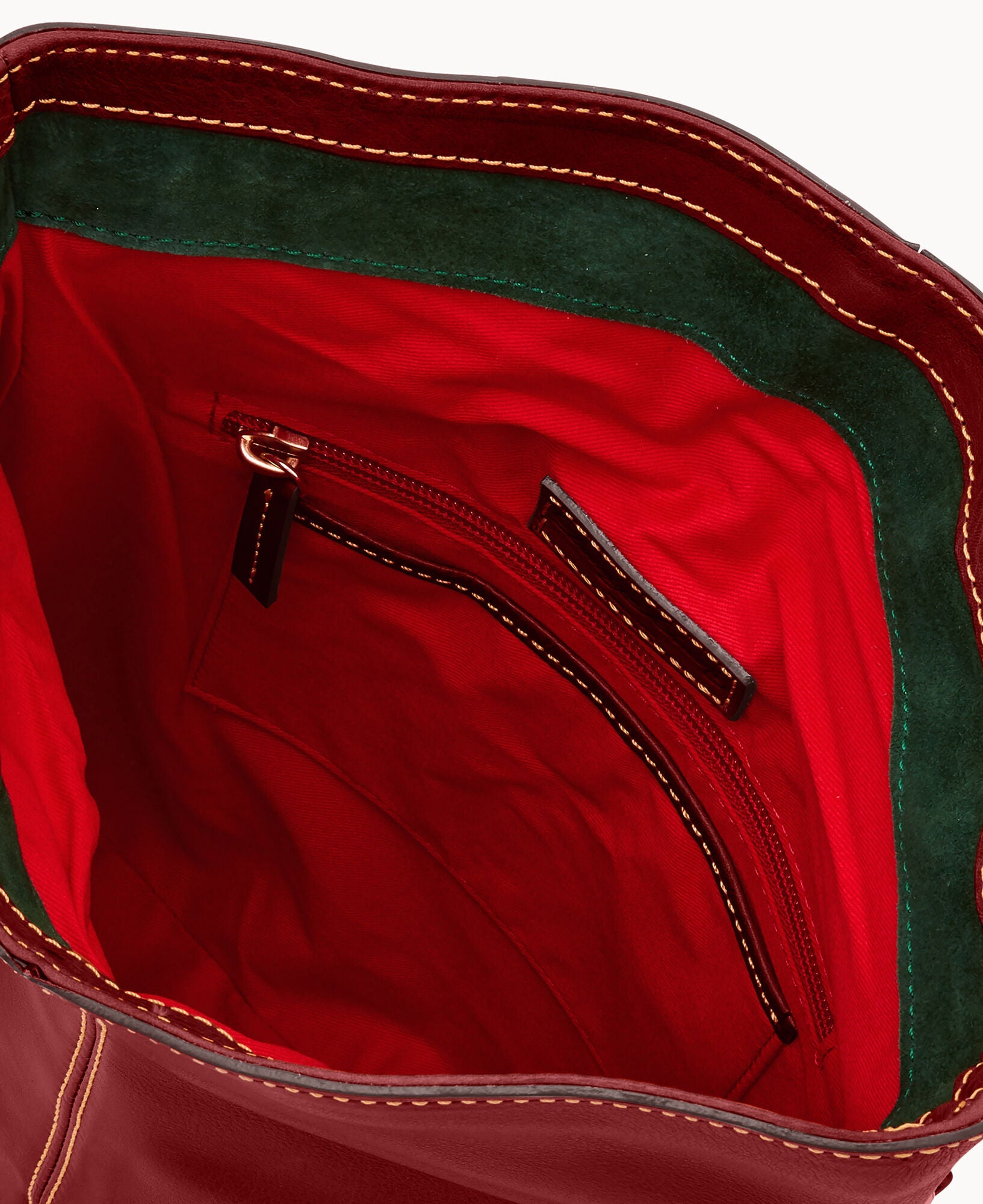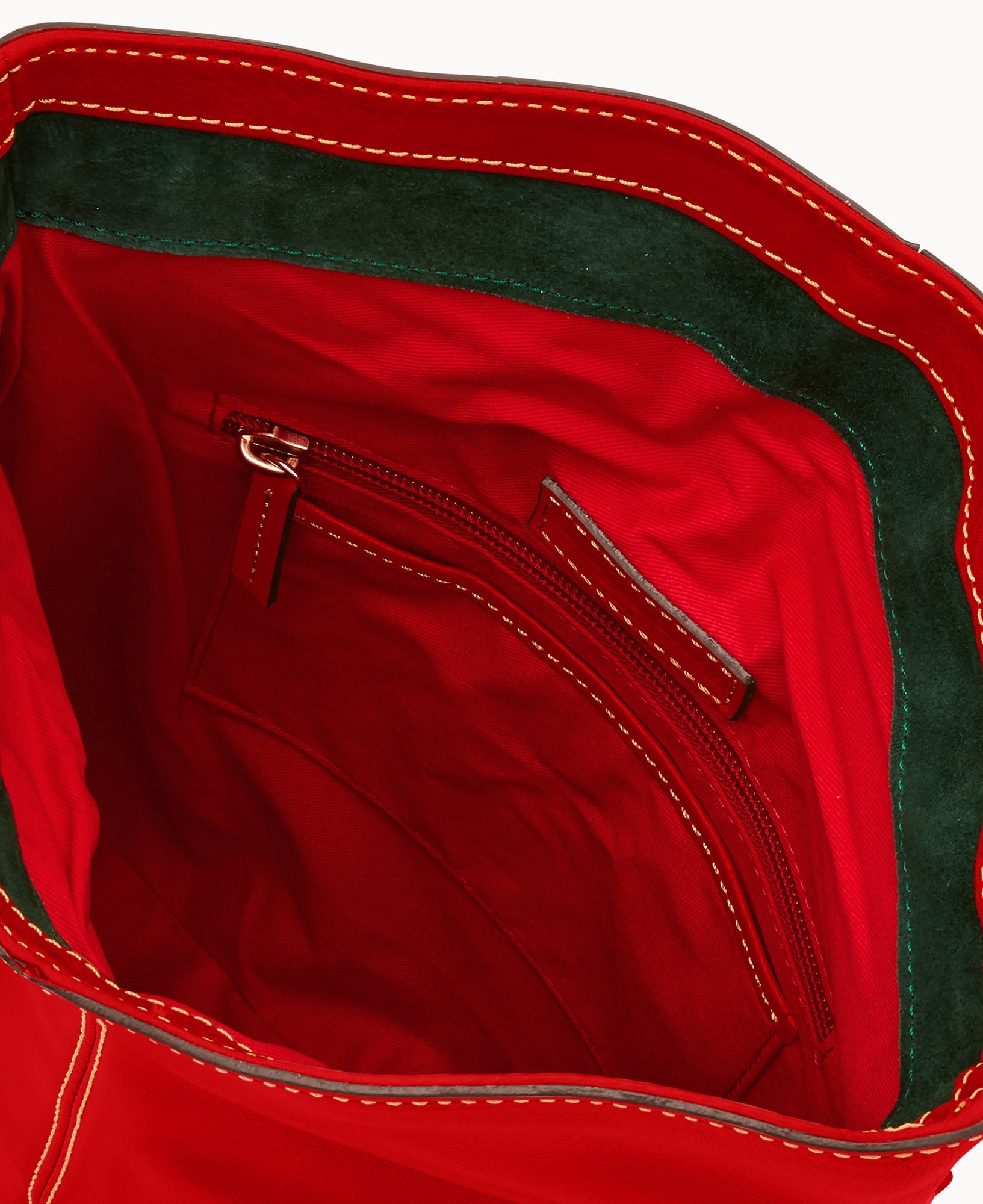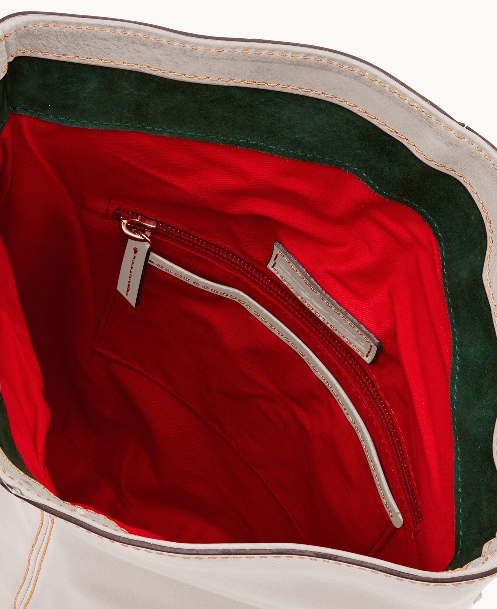 One outside zip pocket. One inside zip pocket. One inside pocket. Cell phone pocket. Inside key hook. Handle drop length 5". Adjustable shoulder strap. Strap drop length 24". Lined. Feet. Toggle closure.