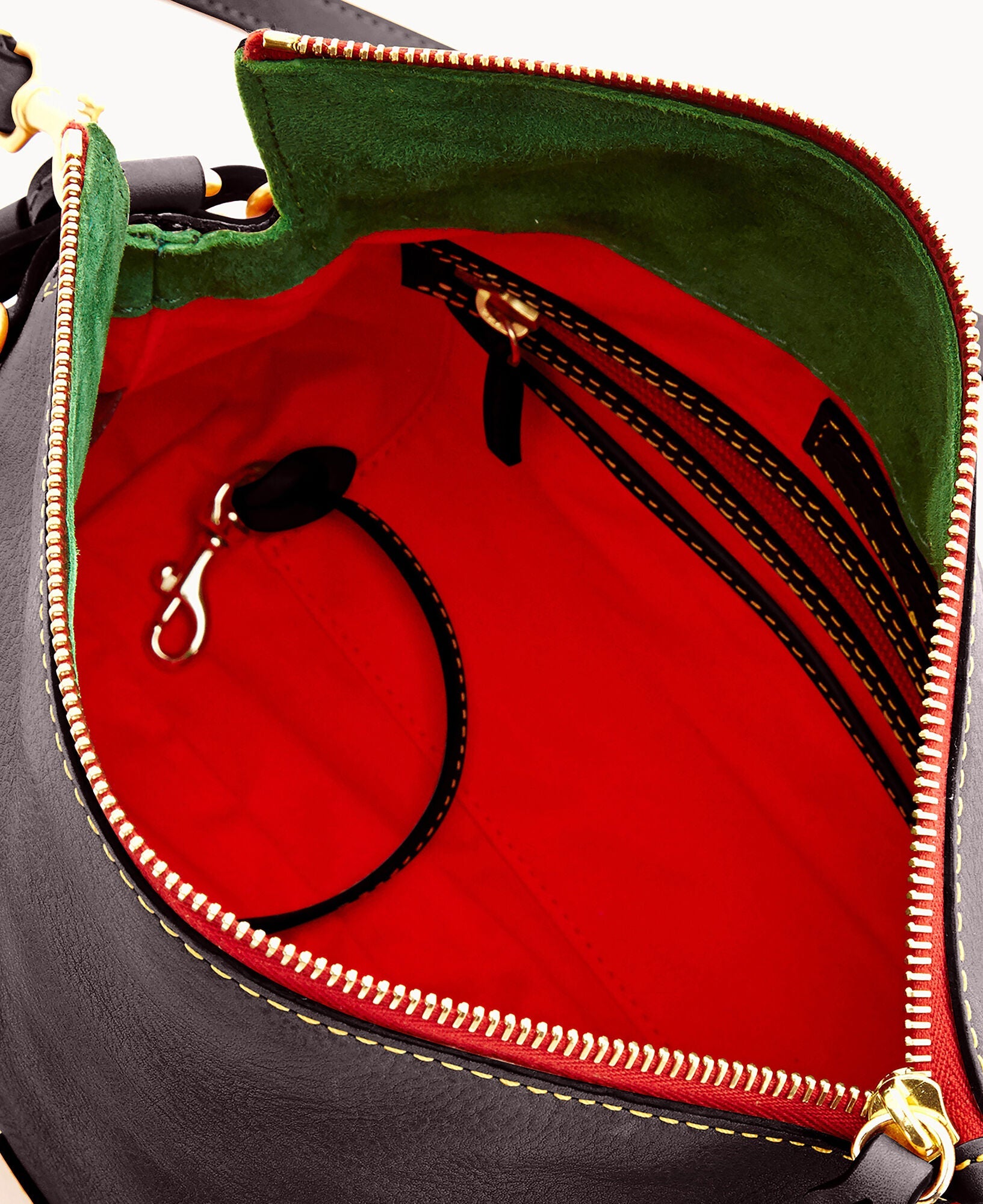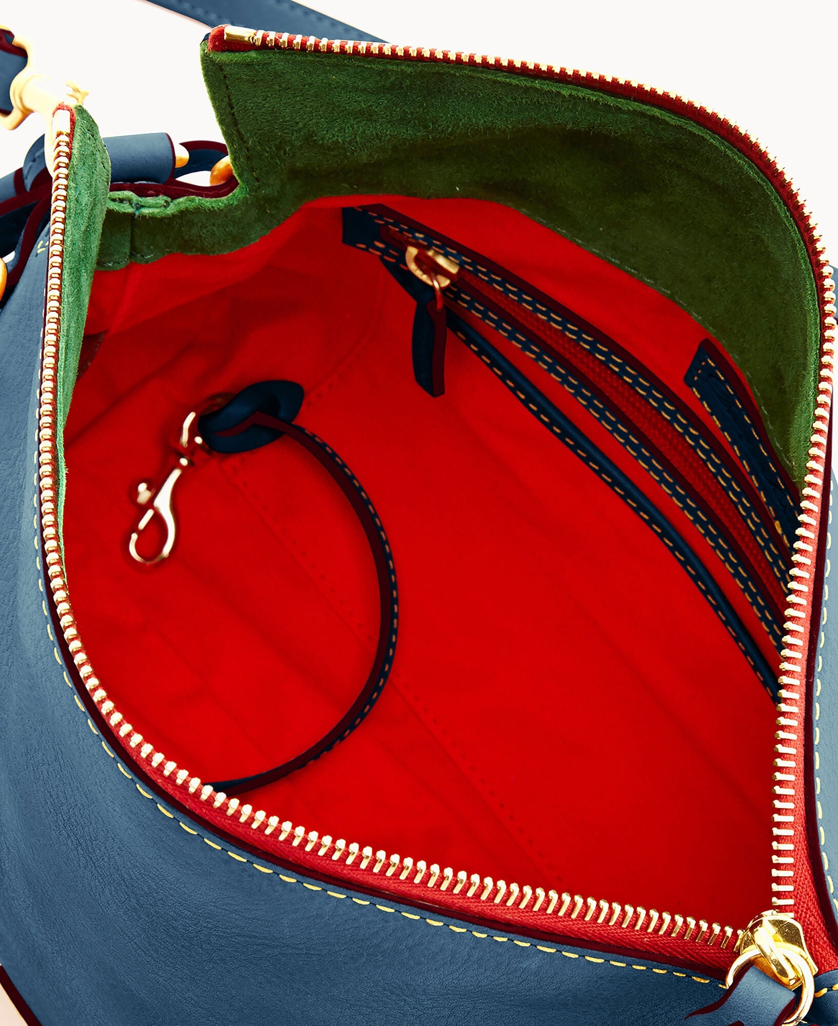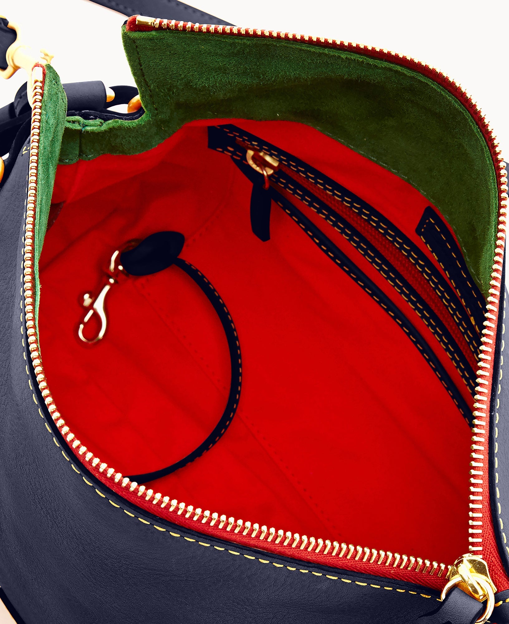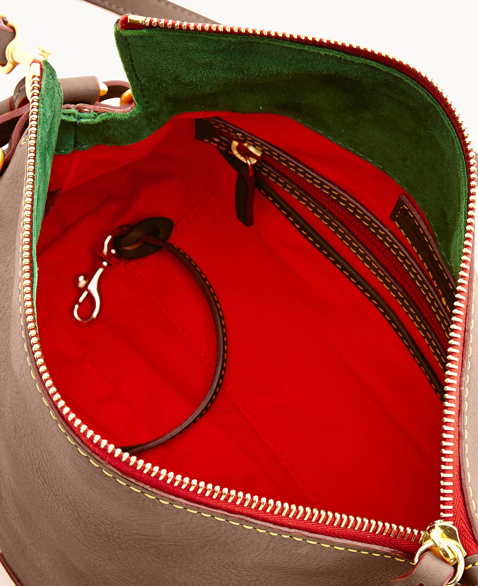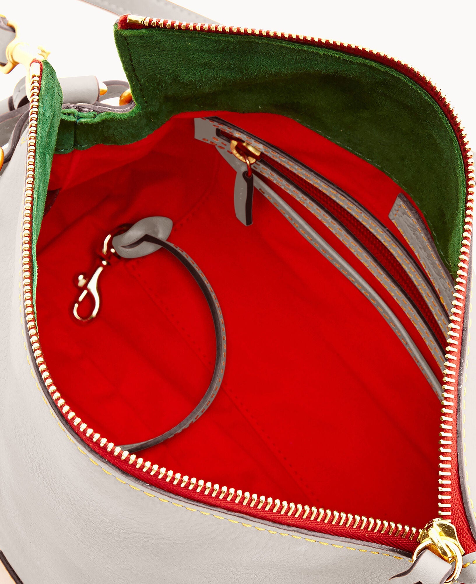 One inside zip pocket. Two inside pockets. Cell phone pocket. Inside key hook. Handle drop length 9". Adjustable, detachable shoulder strap. Strap drop length 19". Lined. Feet. Zipper closure.