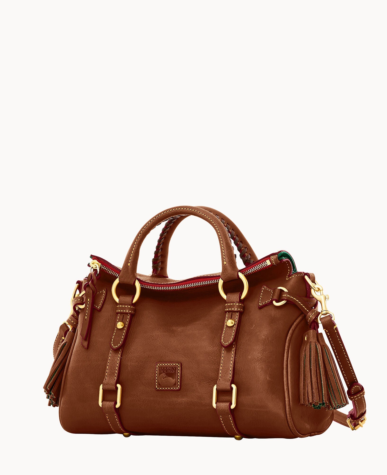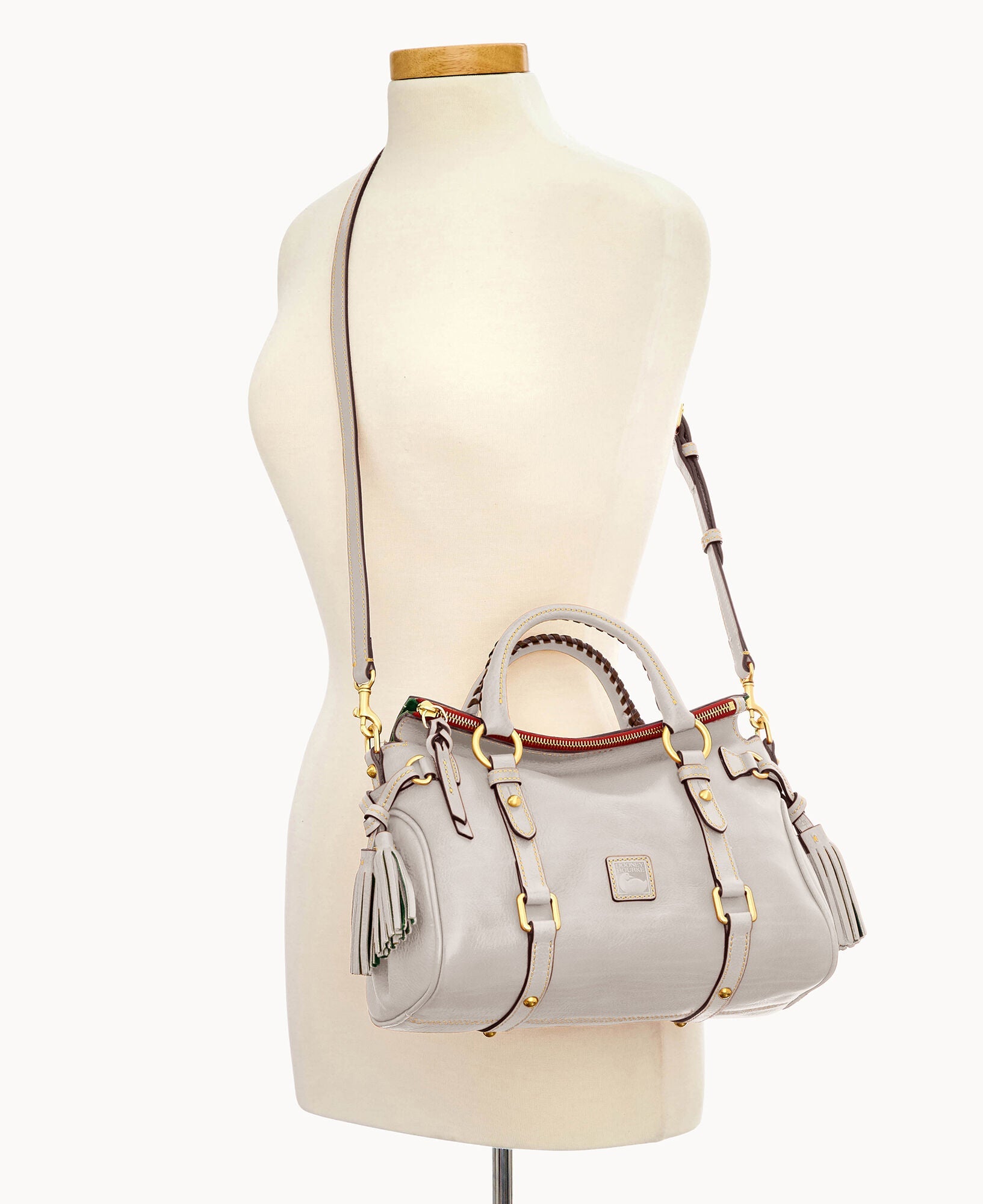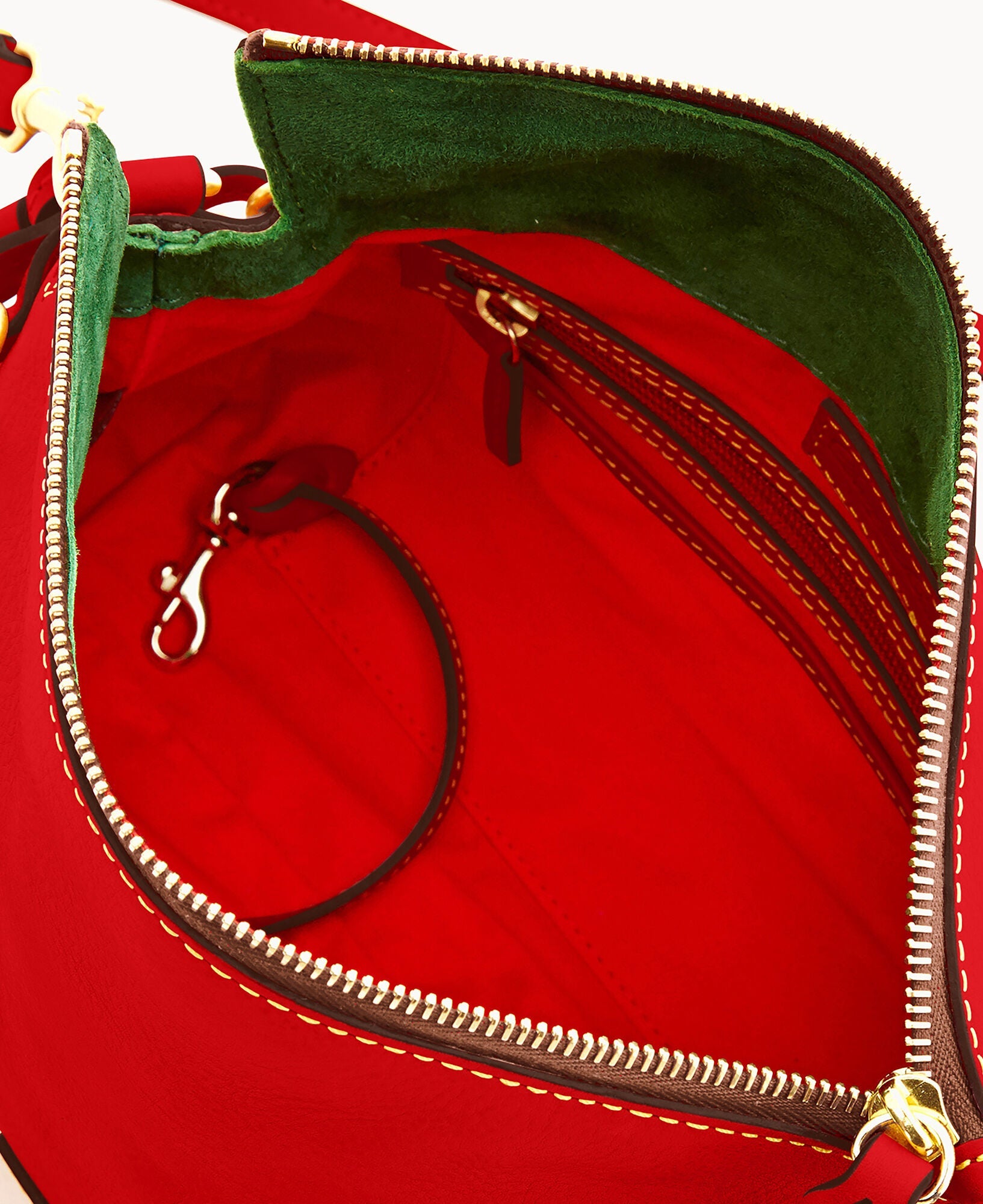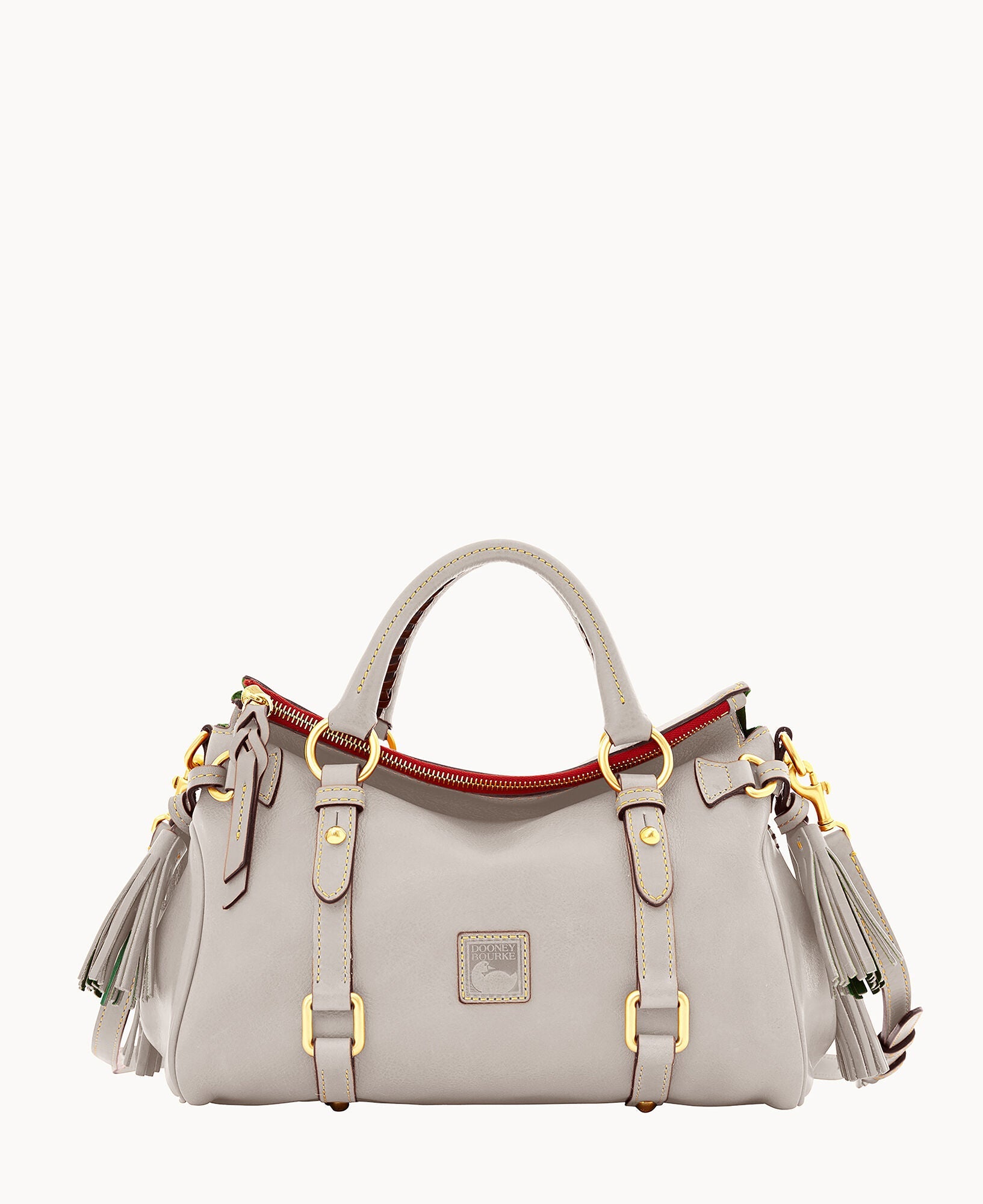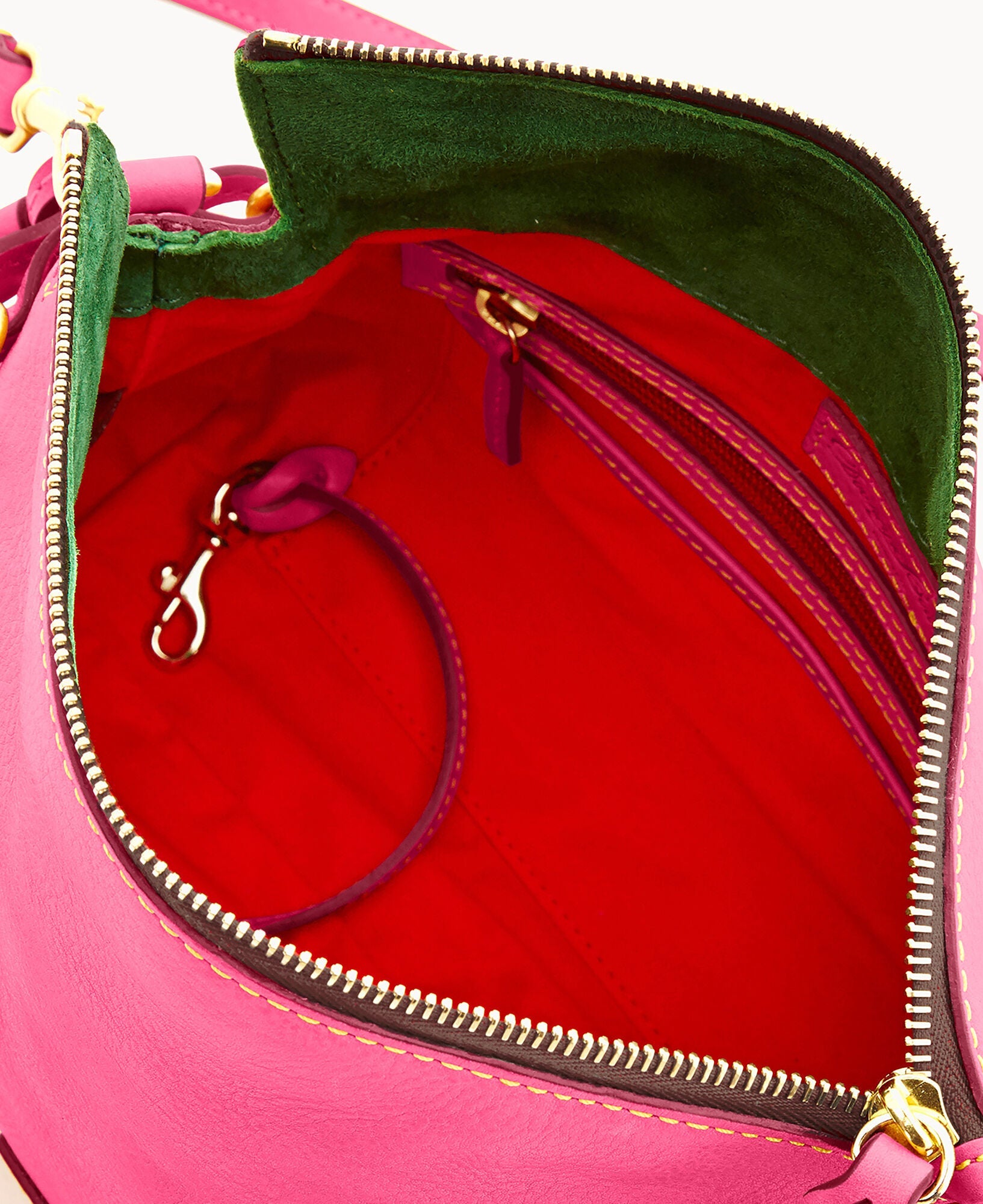 One inside zip pocket. Two inside pockets. Cell phone pocket. Inside key hook. Handle drop length 9". Adjustable, detachable shoulder strap. Strap drop length 19". Lined. Feet. Zipper closure.
