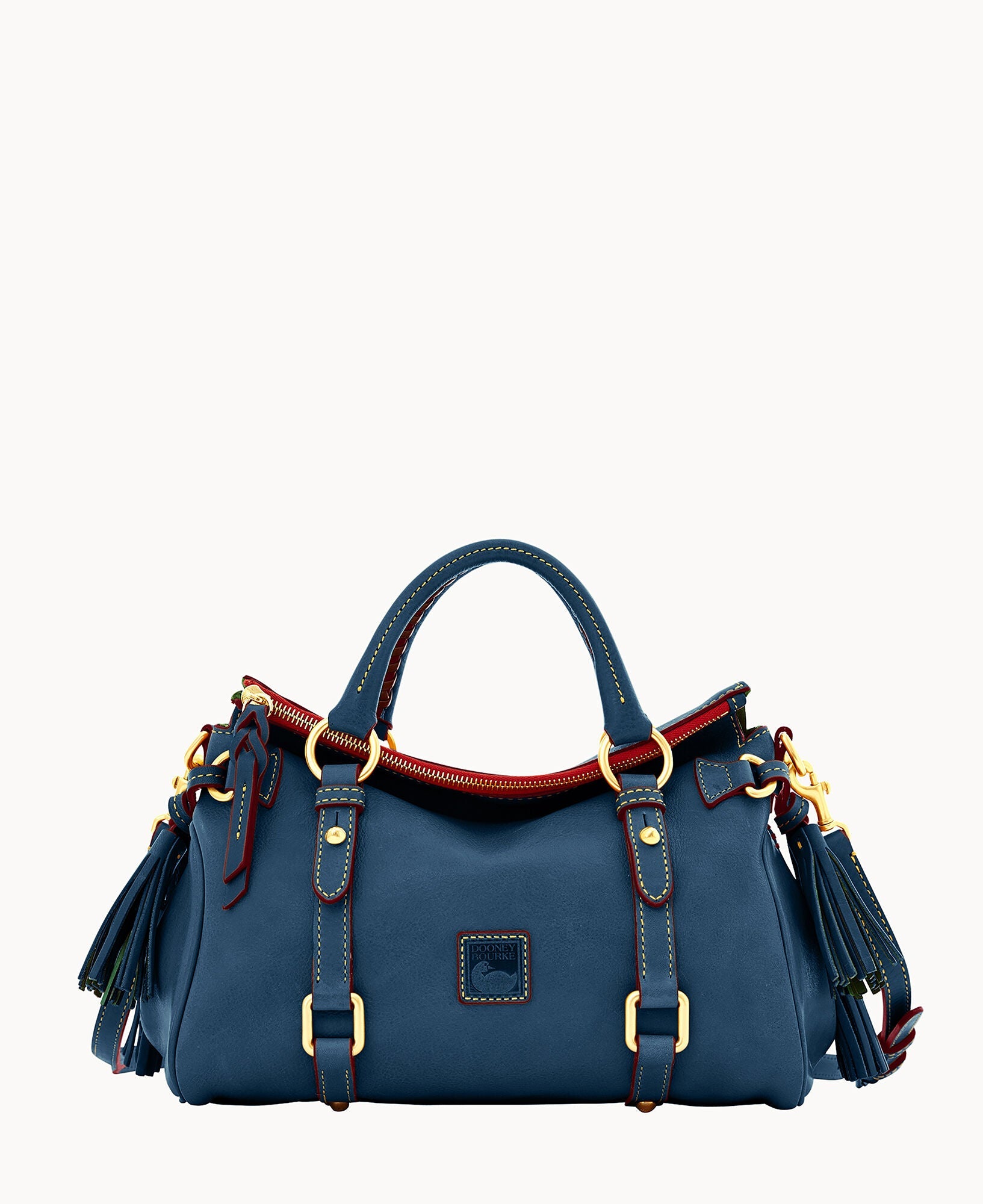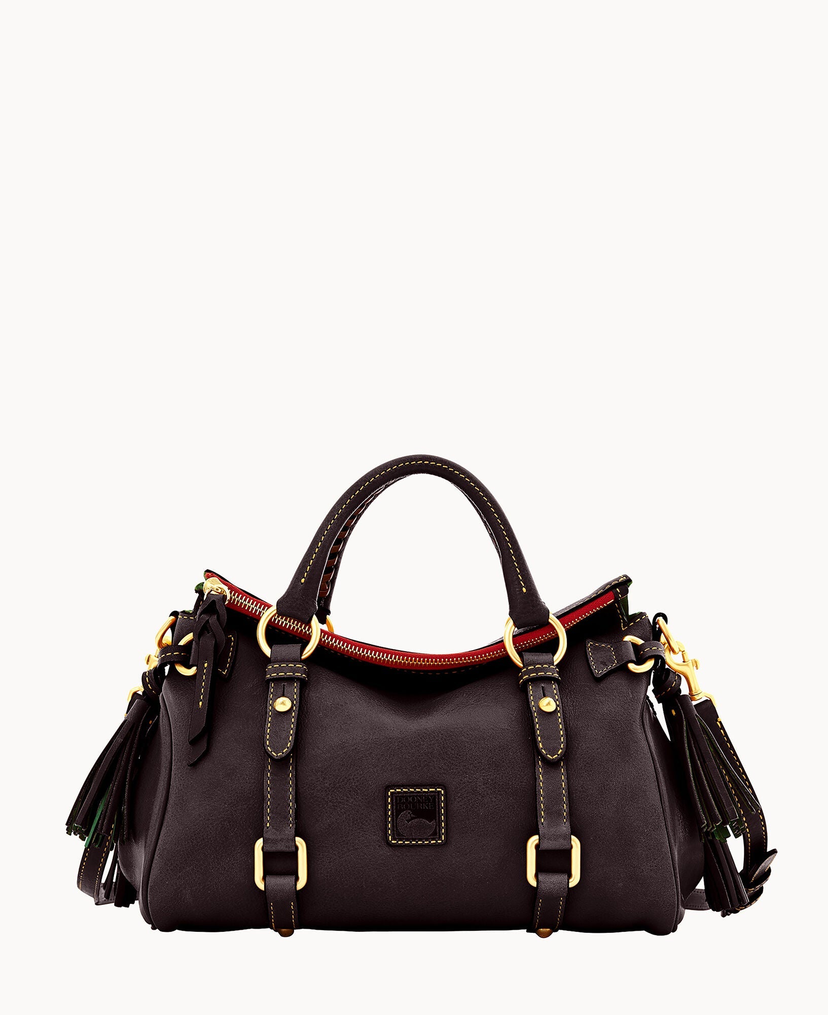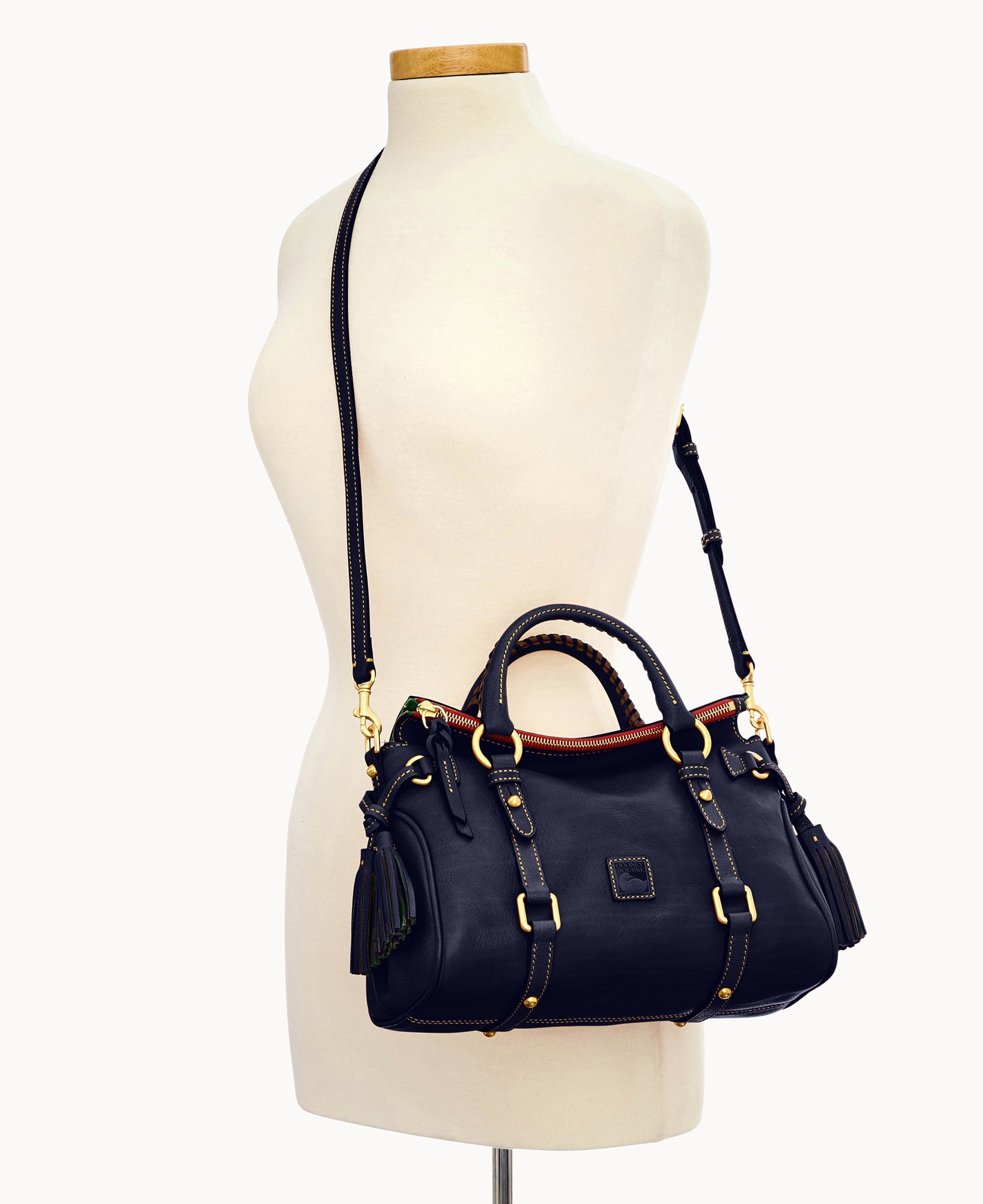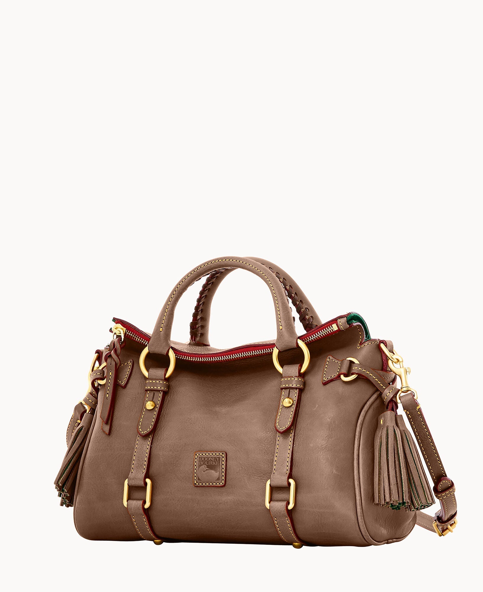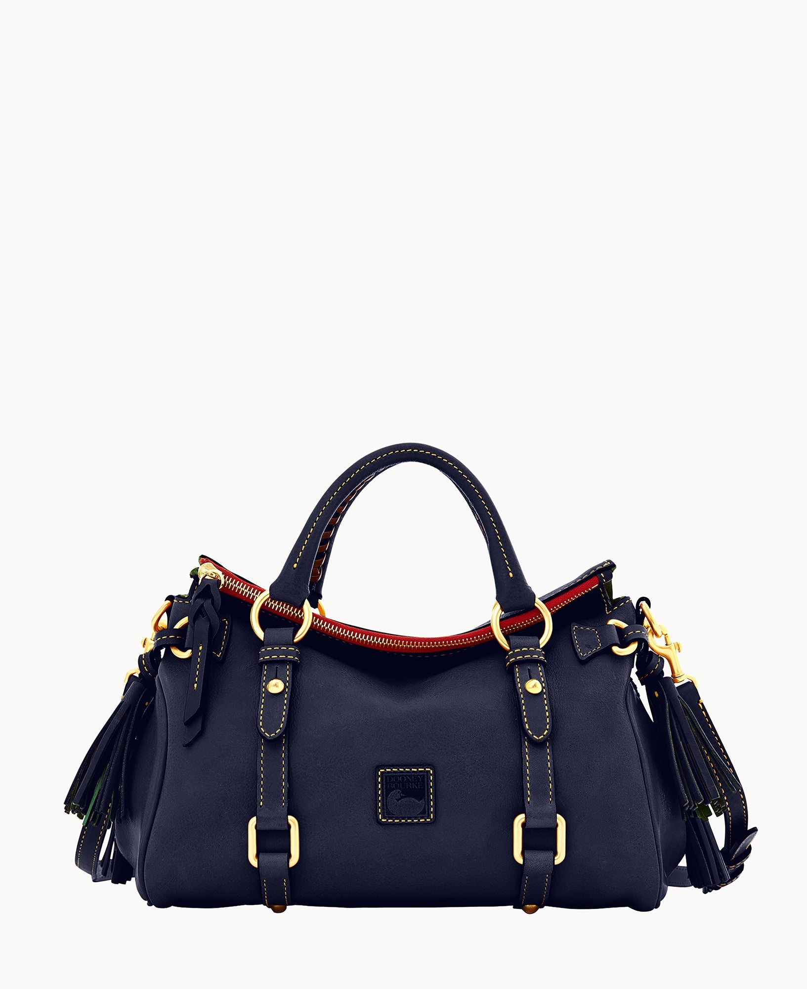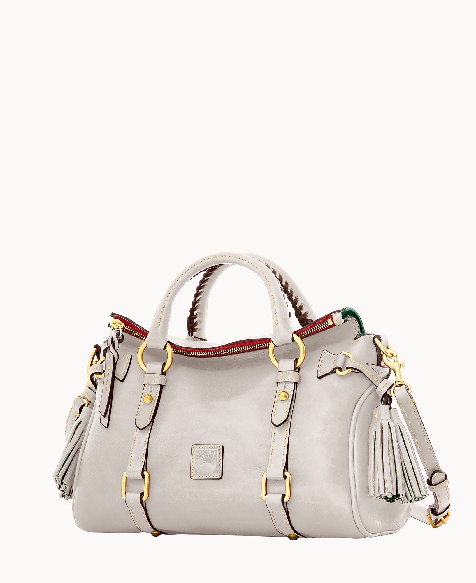 One inside zip pocket. Two inside pockets. Cell phone pocket. Inside key hook. Handle drop length 9". Adjustable, detachable shoulder strap. Strap drop length 19". Lined. Feet. Zipper closure.