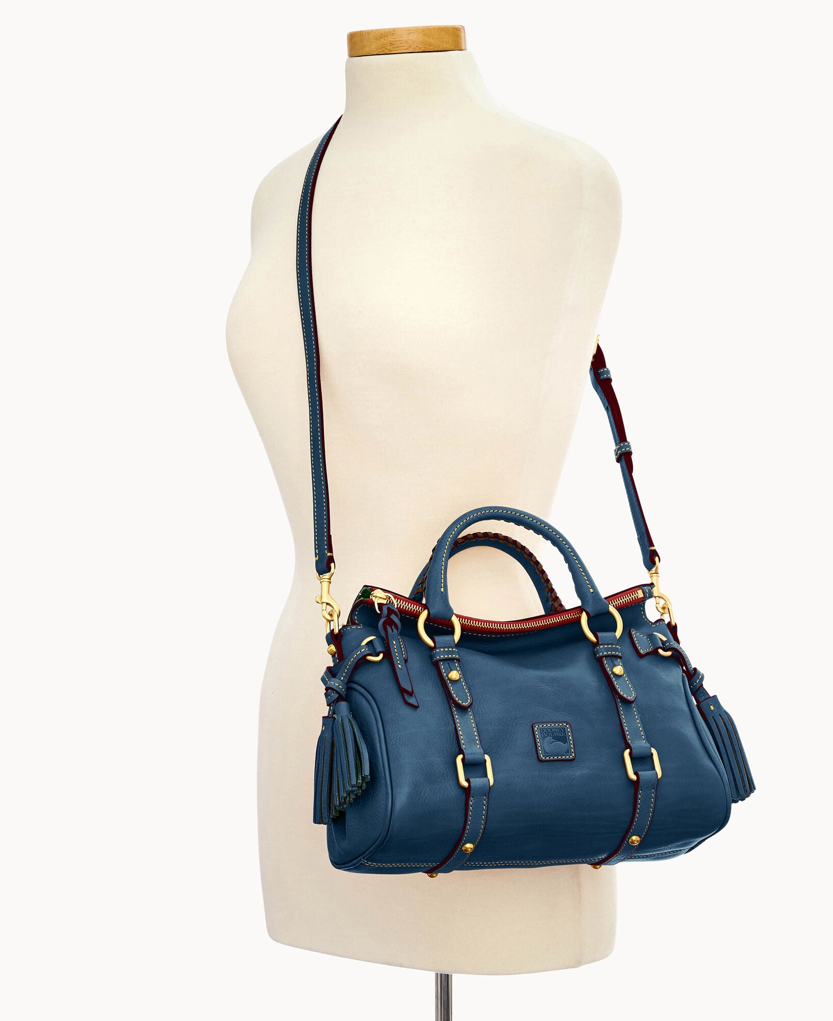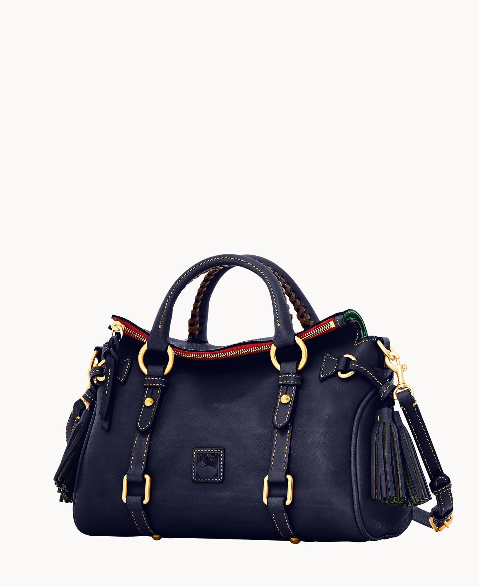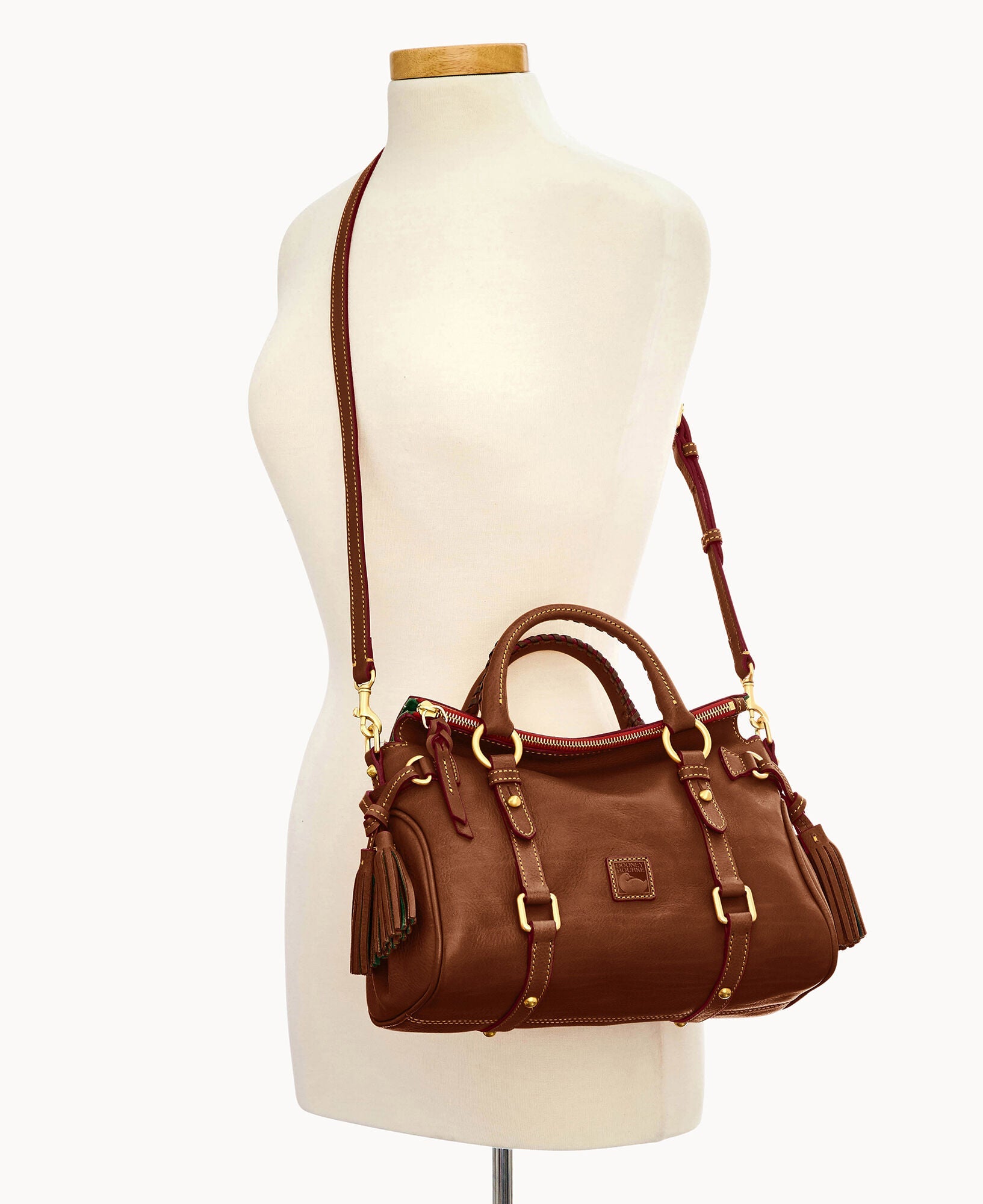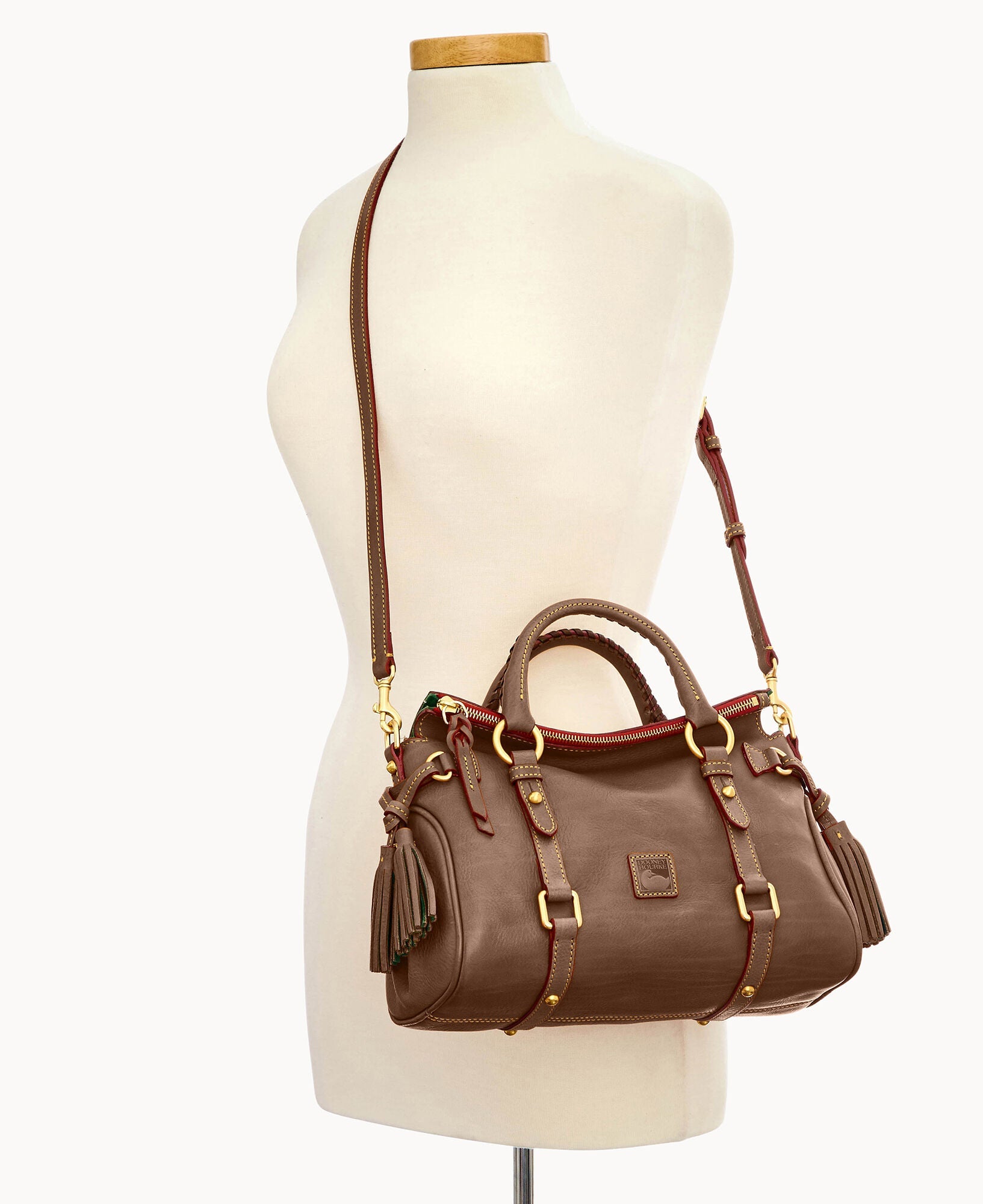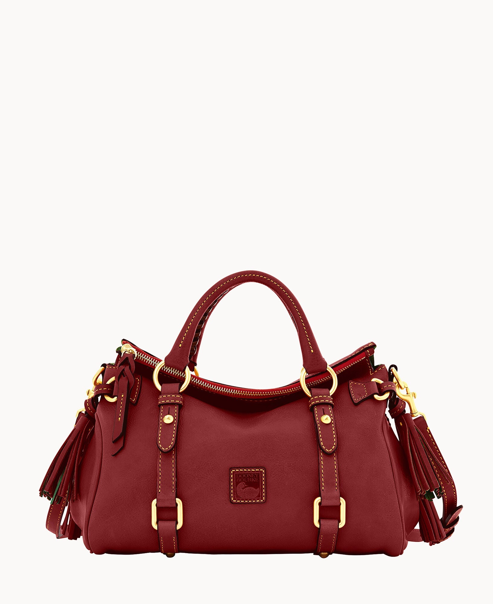 One inside zip pocket. Two inside pockets. Cell phone pocket. Inside key hook. Handle drop length 9". Adjustable, detachable shoulder strap. Strap drop length 19". Lined. Feet. Zipper closure.