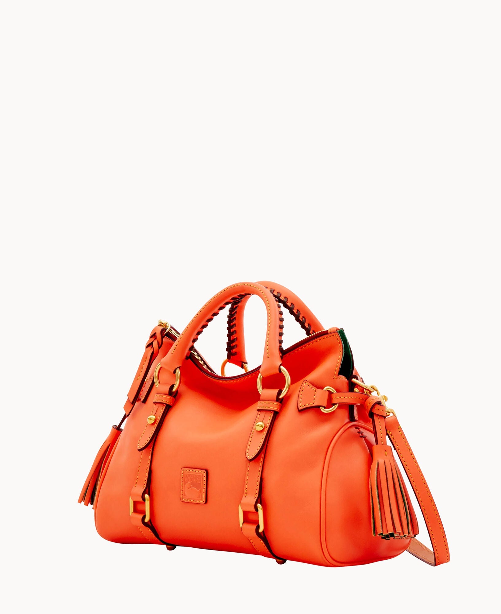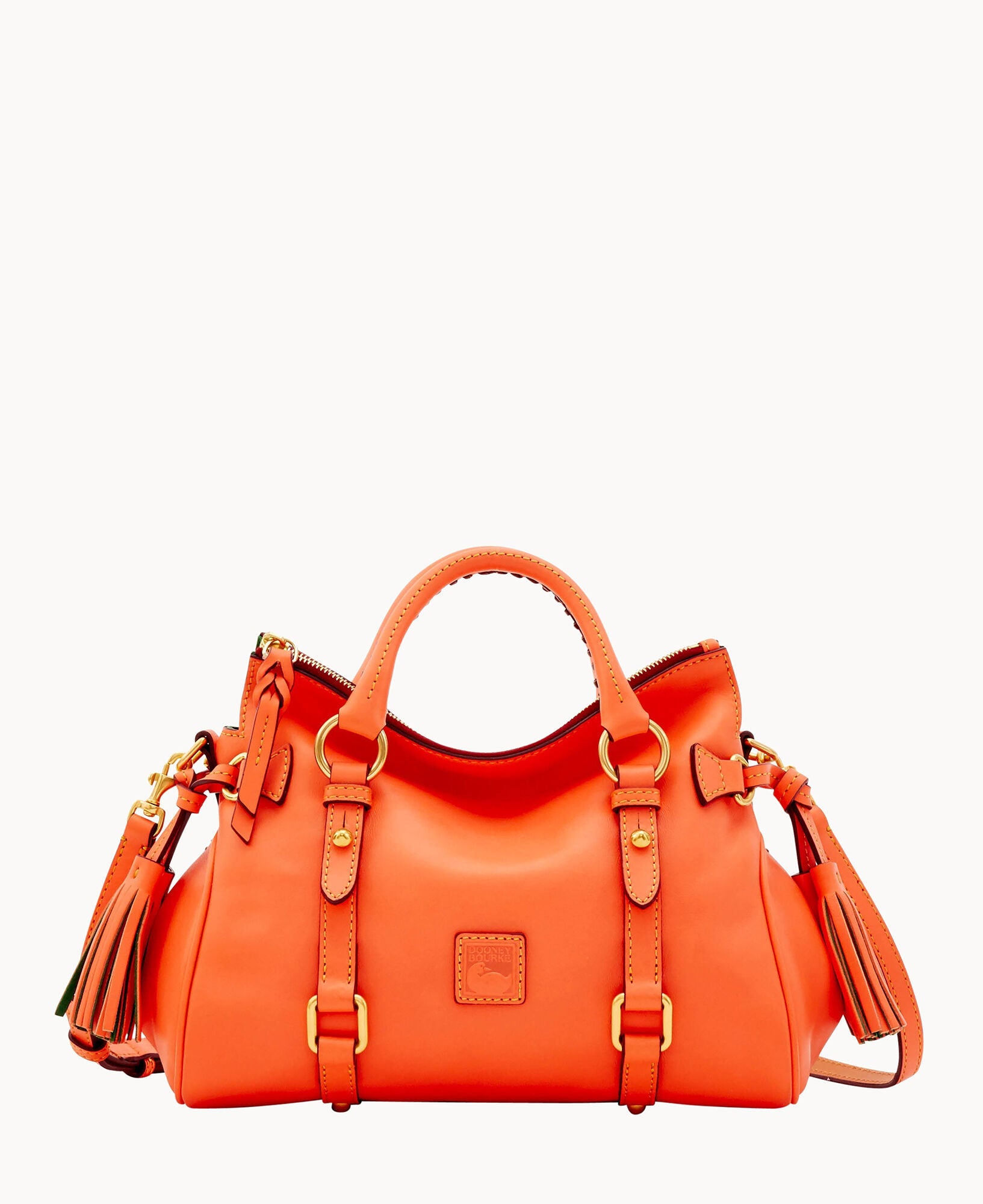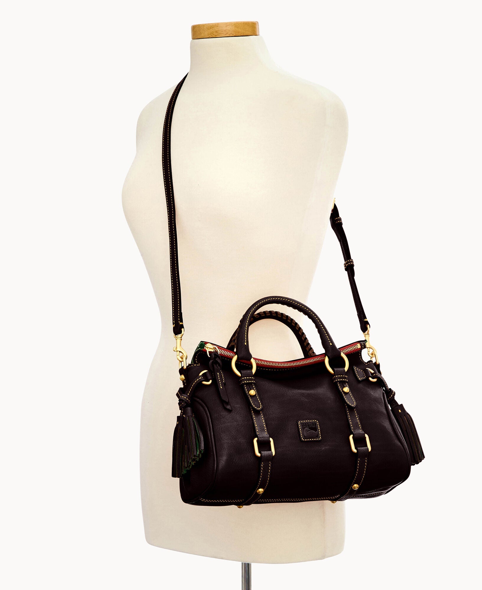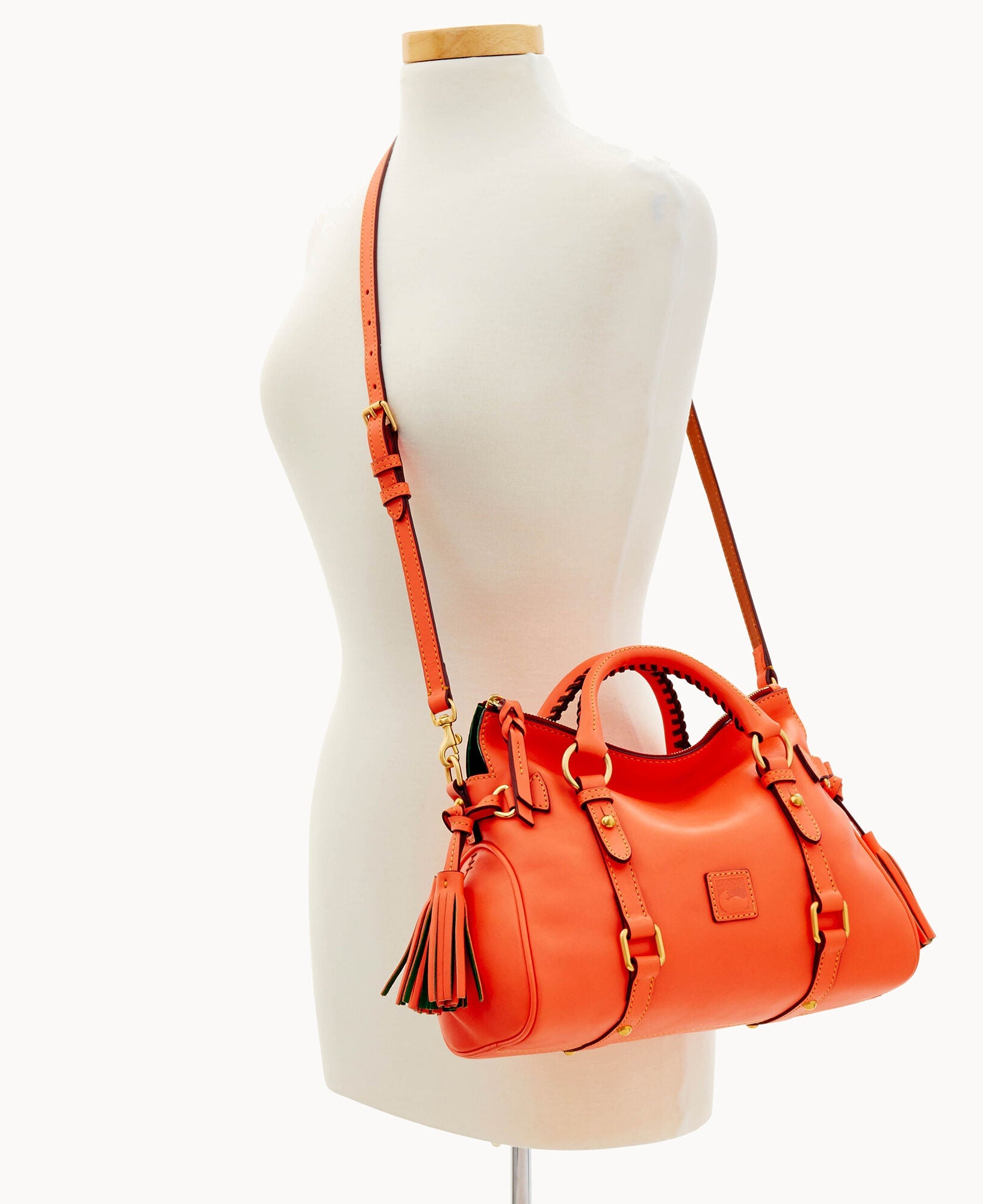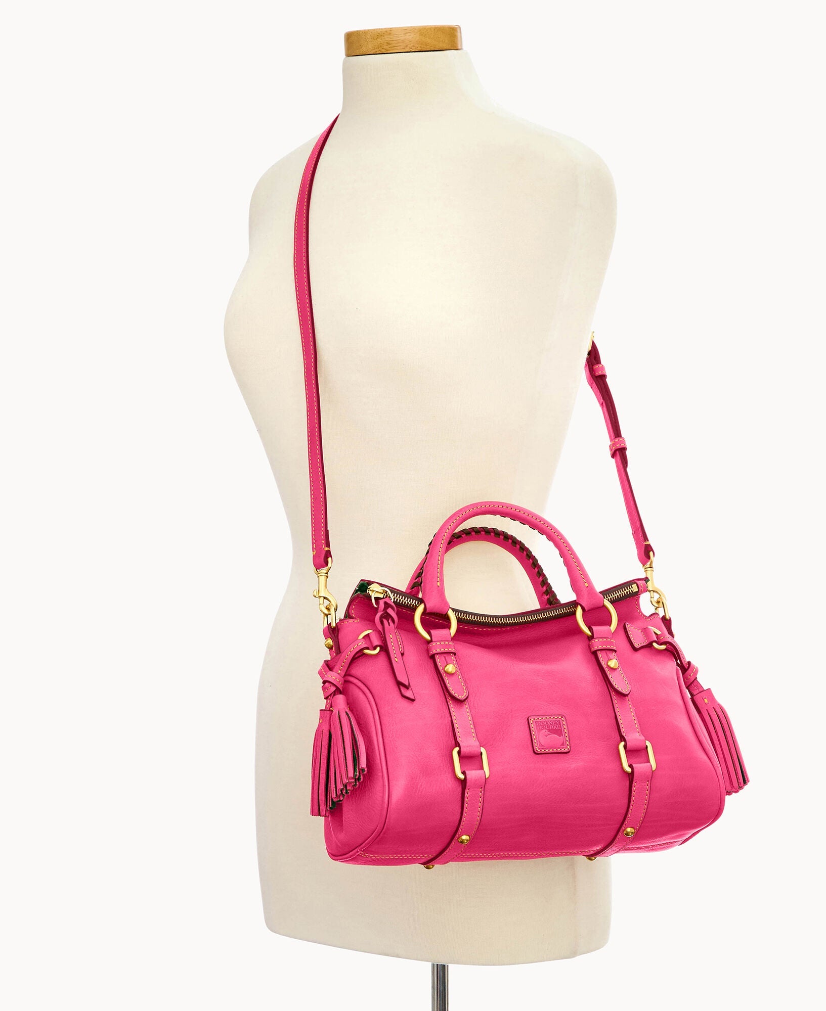 One inside zip pocket. Two inside pockets. Cell phone pocket. Inside key hook. Handle drop length 9". Adjustable, detachable shoulder strap. Strap drop length 19". Lined. Feet. Zipper closure.