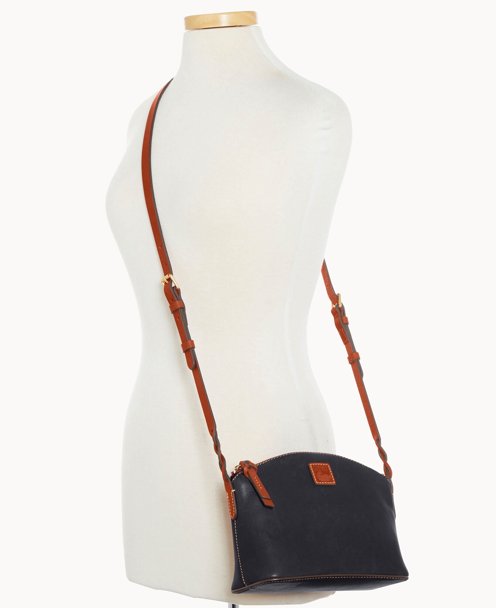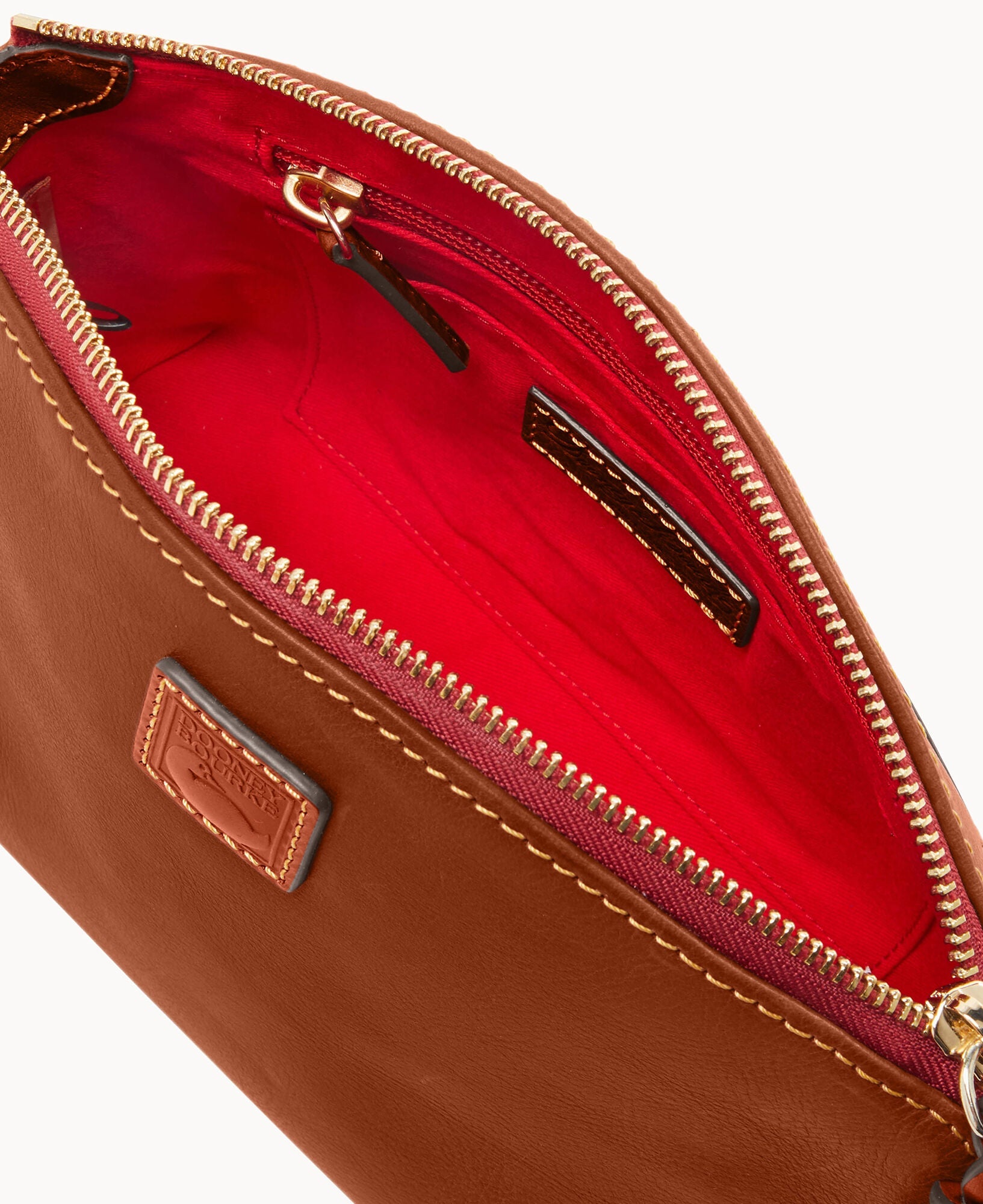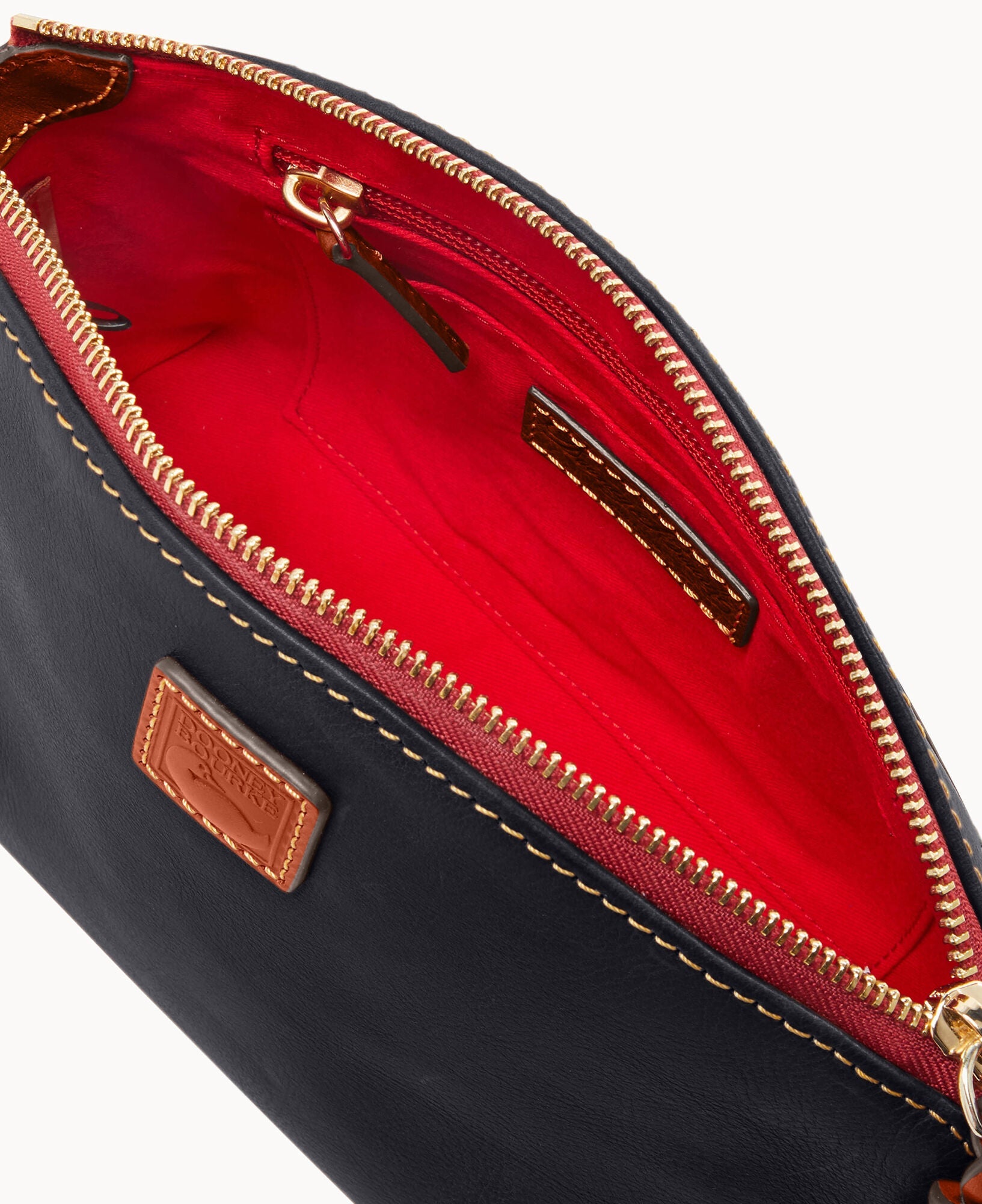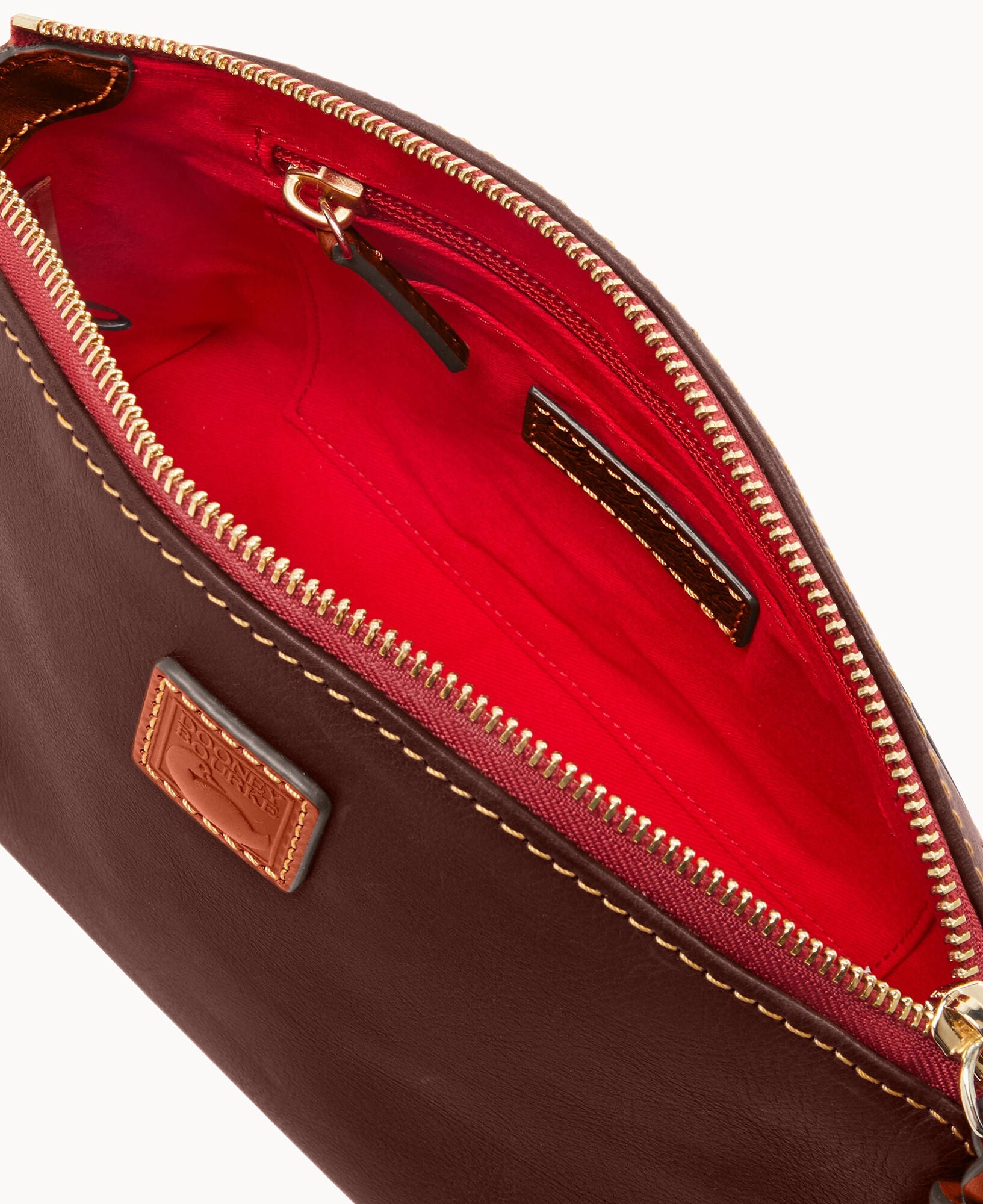 One outside pocket. One inside zip pocket. Two inside pockets. Cell phone pocket. Adjustable shoulder strap. Strap drop length 24.5". Lined. Zipper closure.