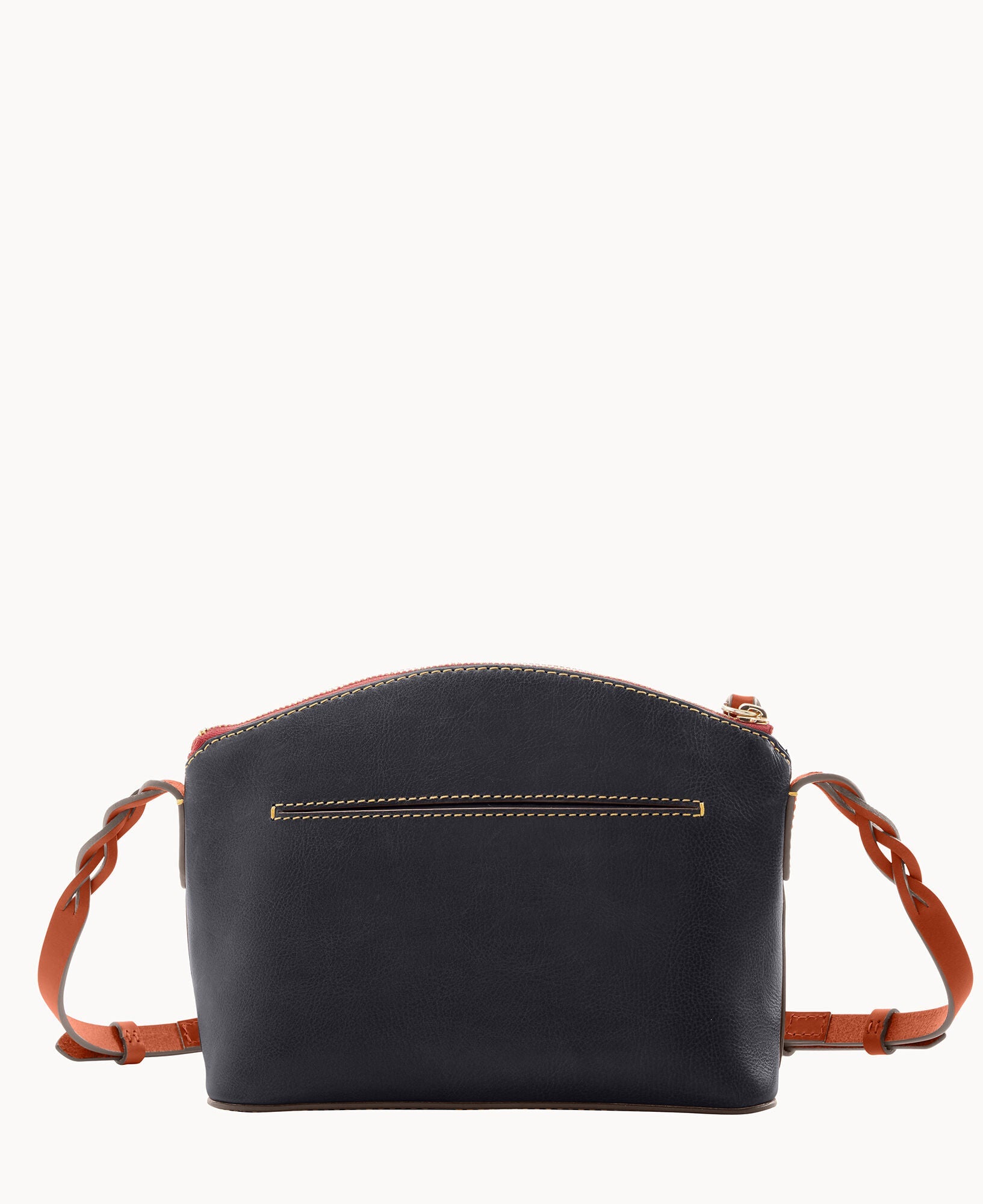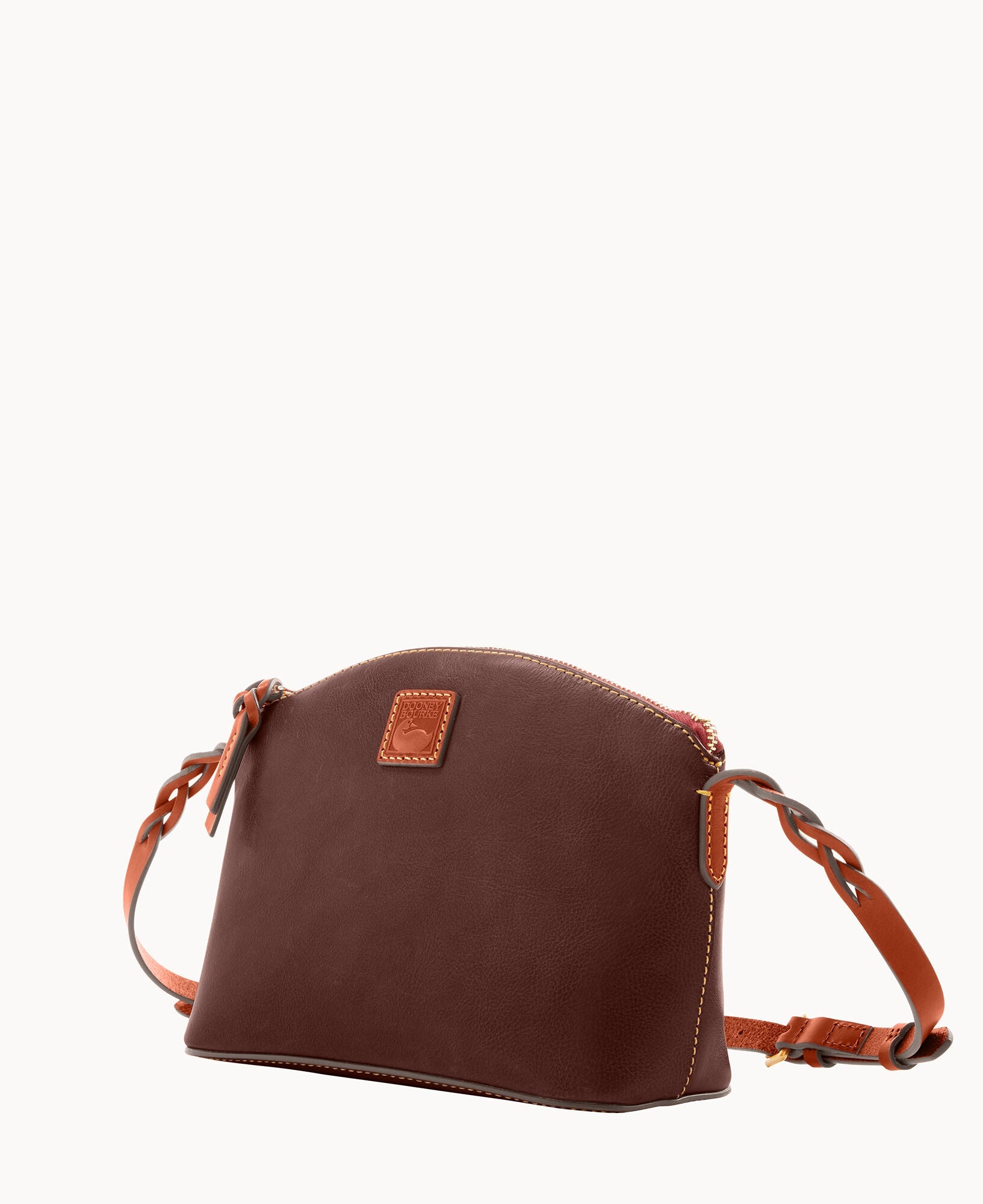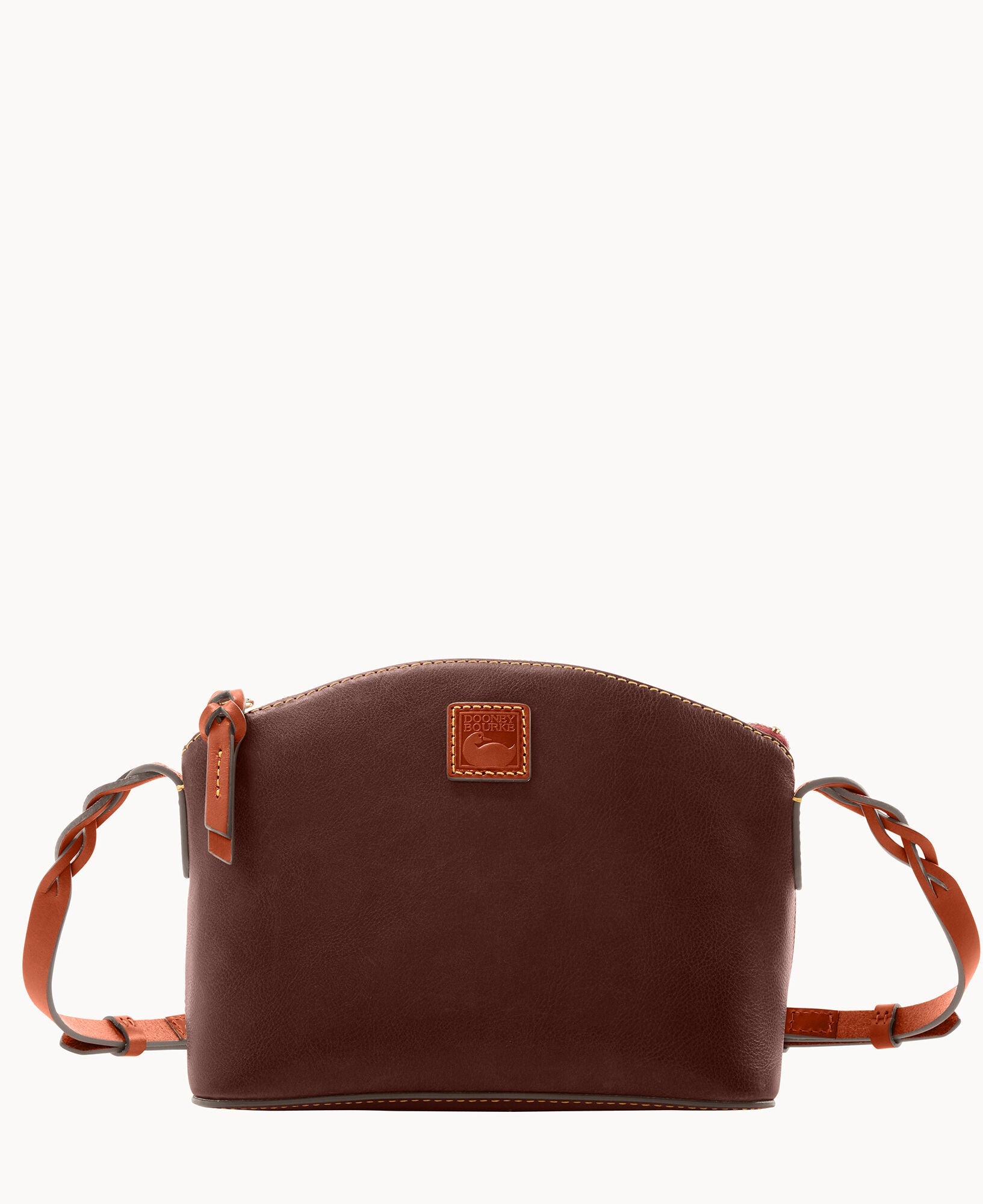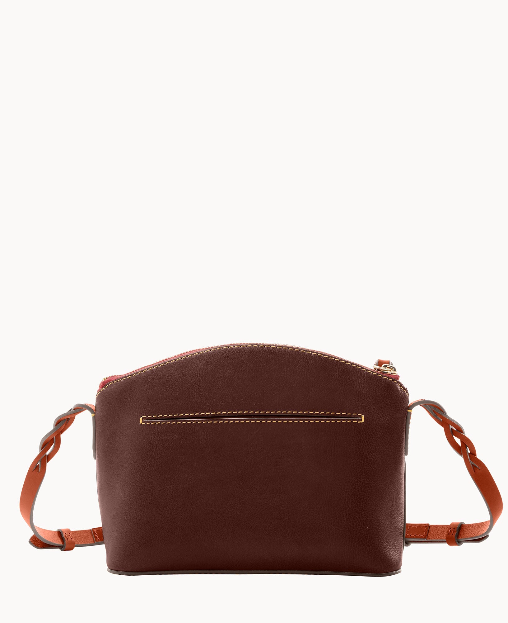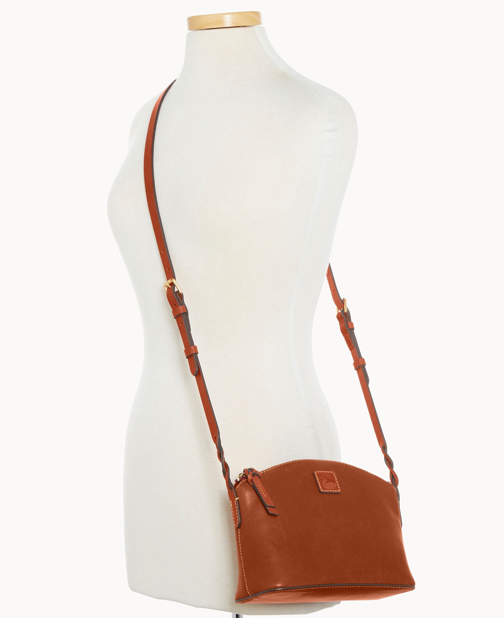 One outside pocket. One inside zip pocket. Two inside pockets. Cell phone pocket. Adjustable shoulder strap. Strap drop length 24.5". Lined. Zipper closure.