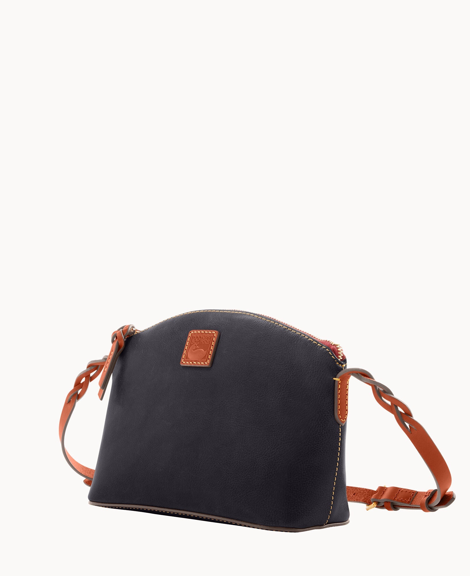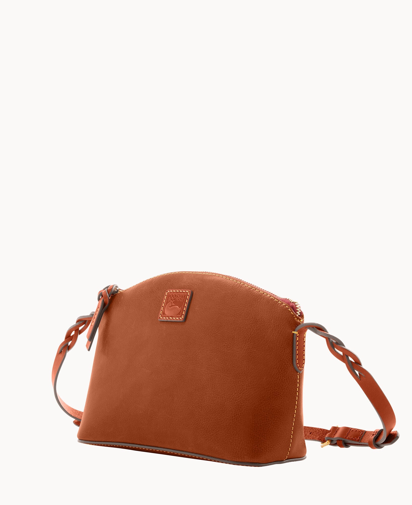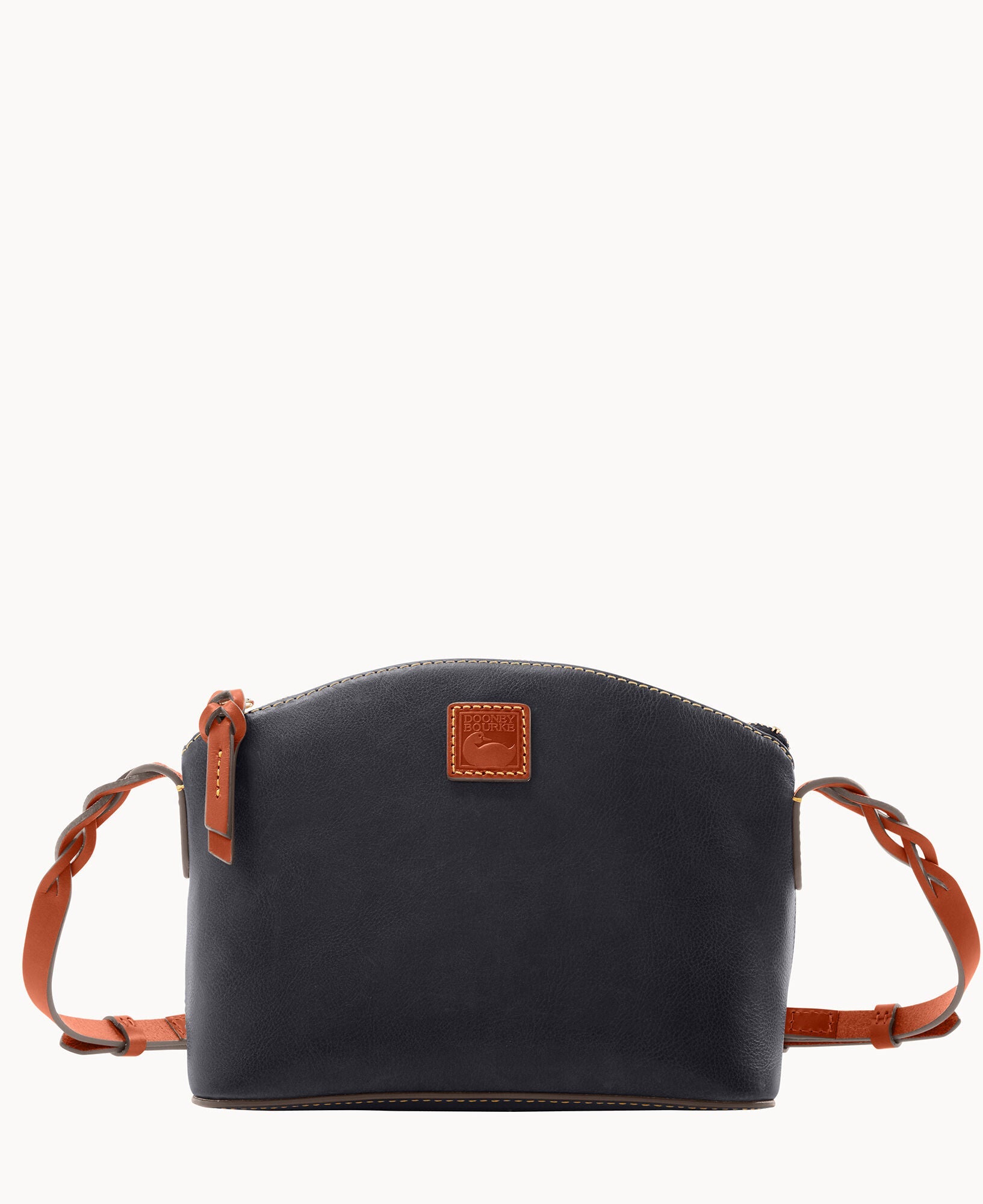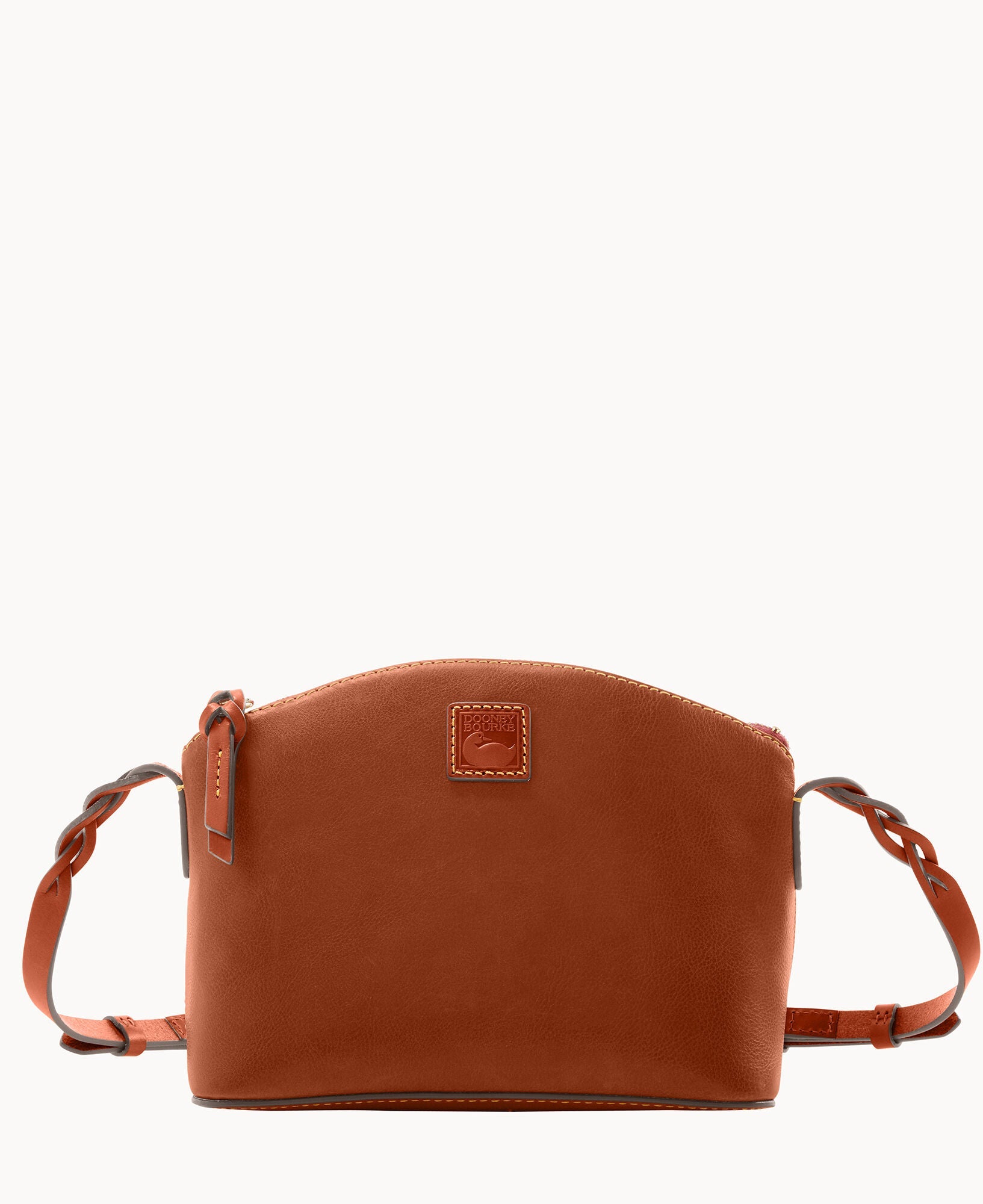One outside pocket. One inside zip pocket. Two inside pockets. Cell phone pocket. Adjustable shoulder strap. Strap drop length 24.5". Lined. Zipper closure.