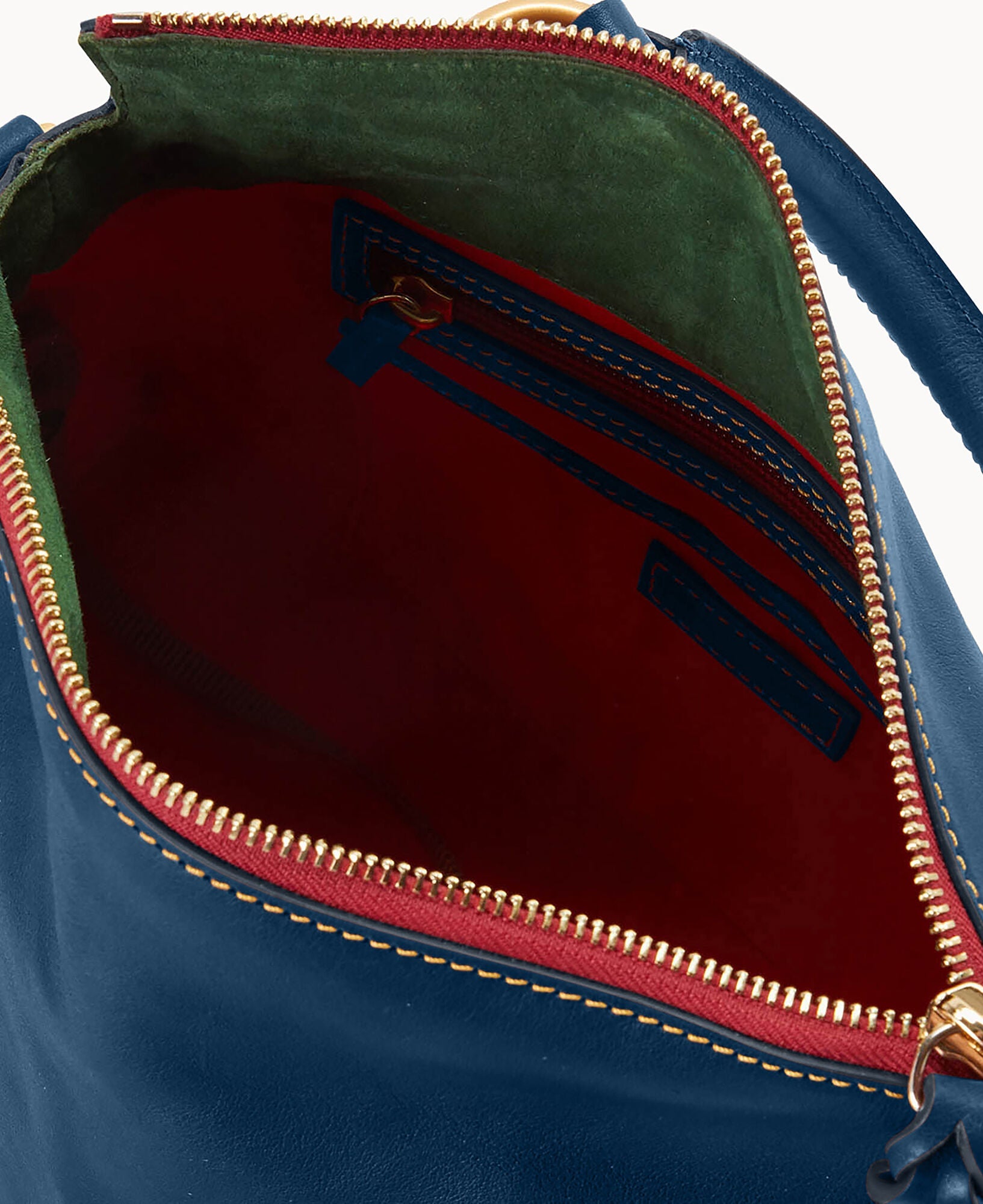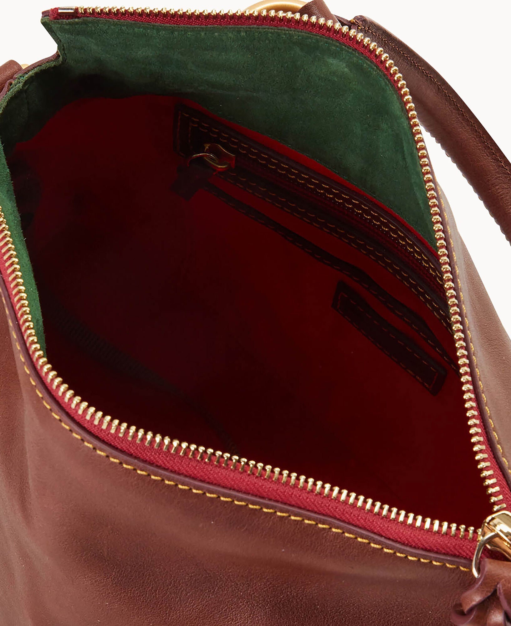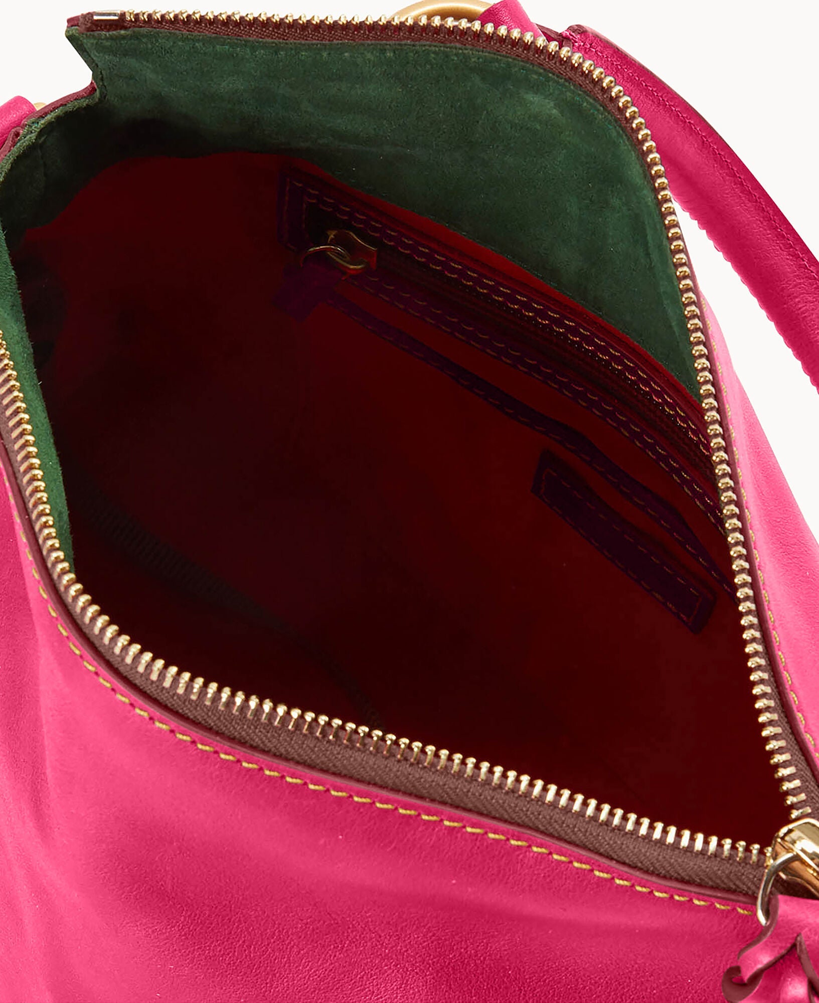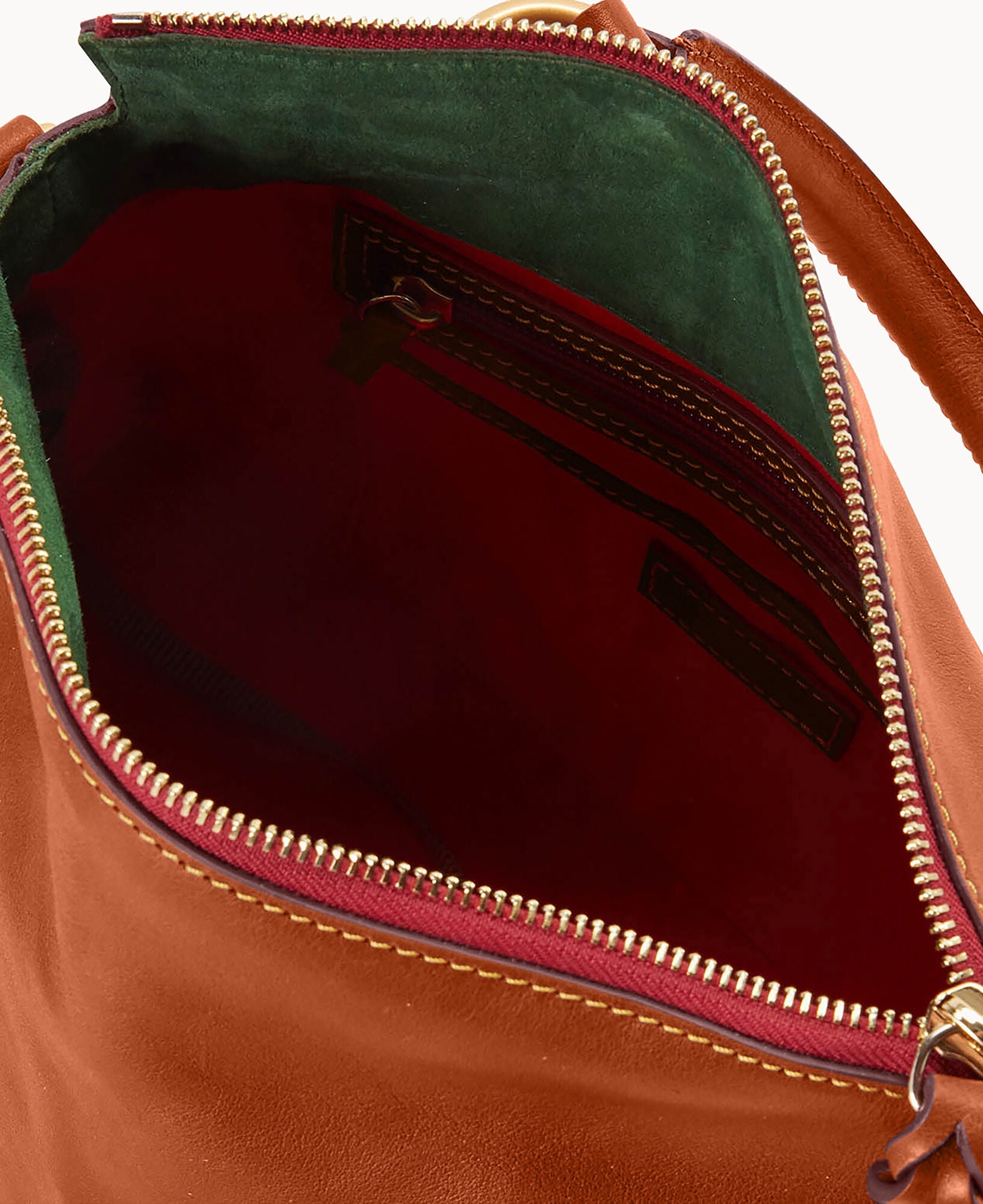 One inside zip pocket. Two inside slip pockets. One inside cell phone pocket. Inside key hook. Adjustable strap. Removable strap. Detachable strap. Strap drop length 24". Handle drop length 6". Lined. Feet. Zipper closure.