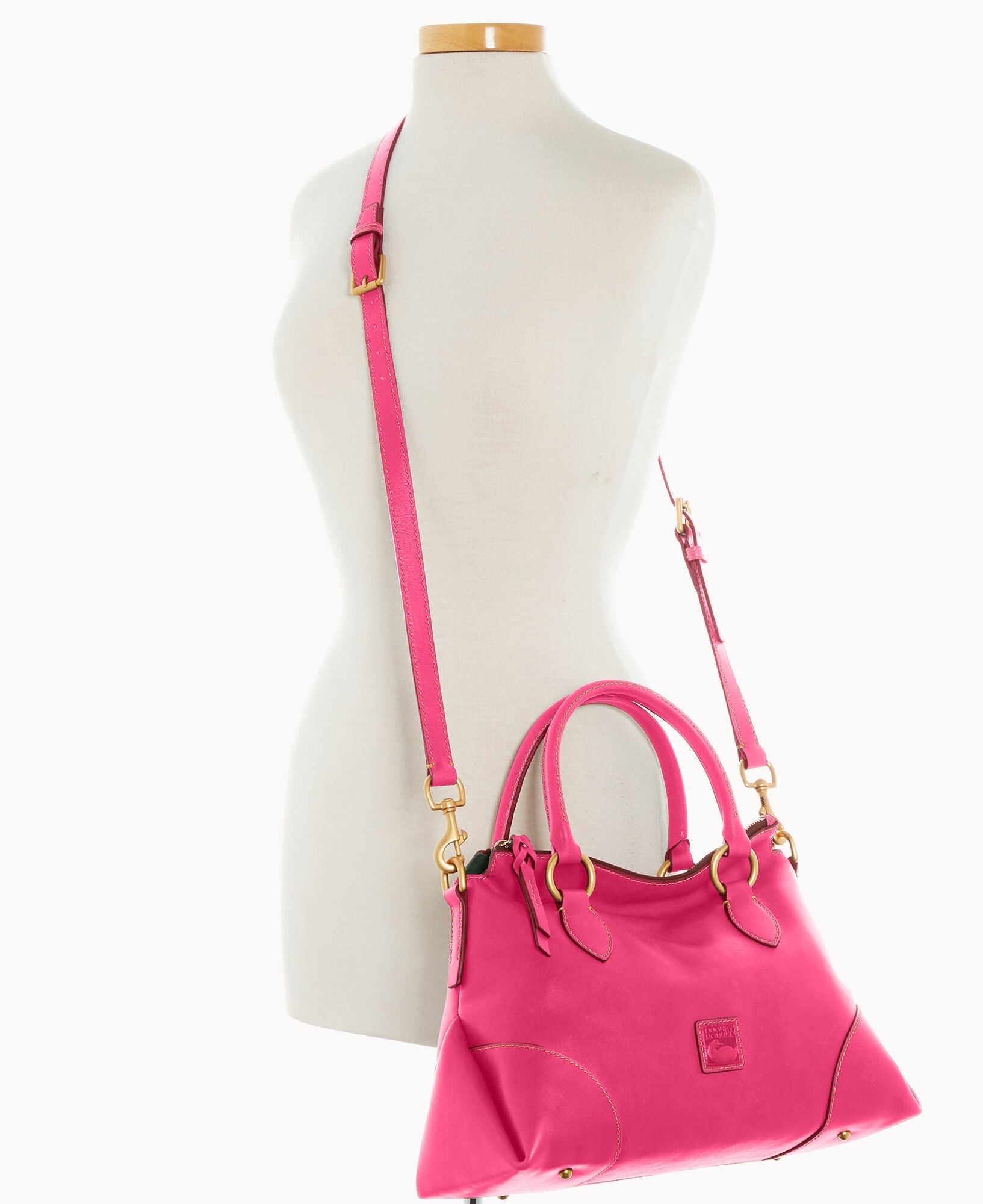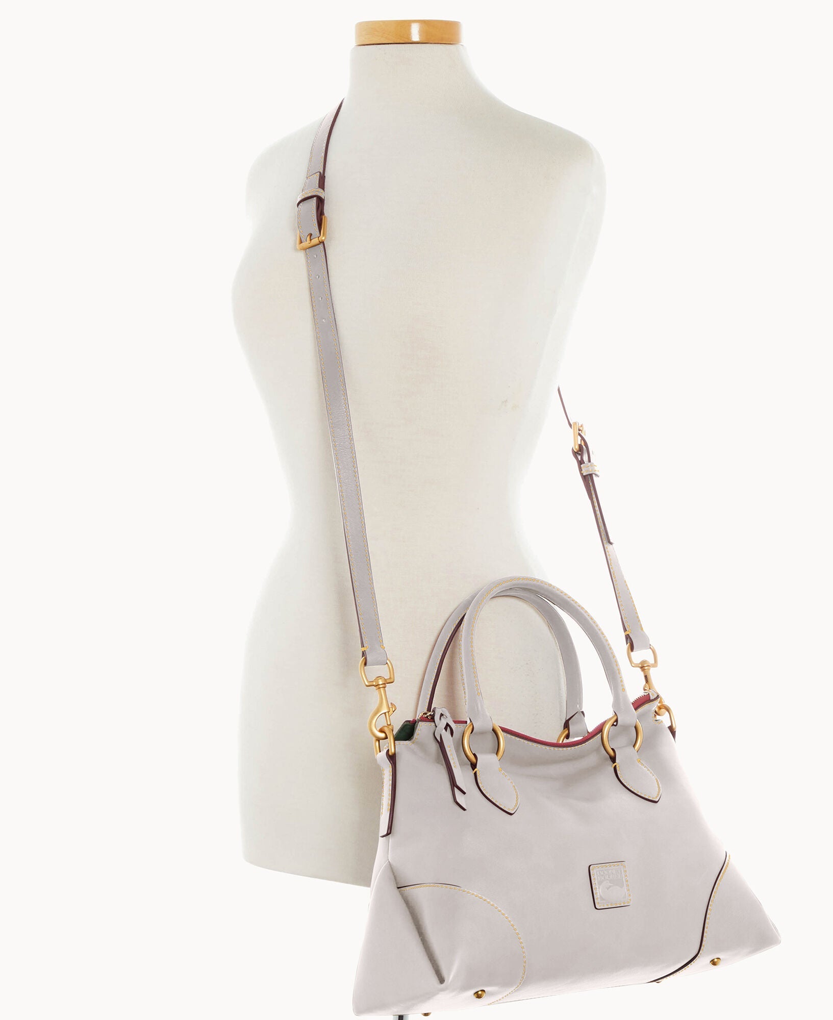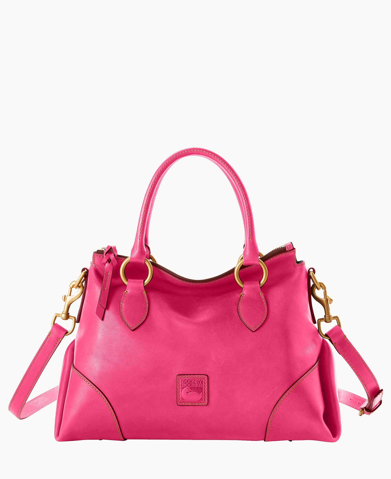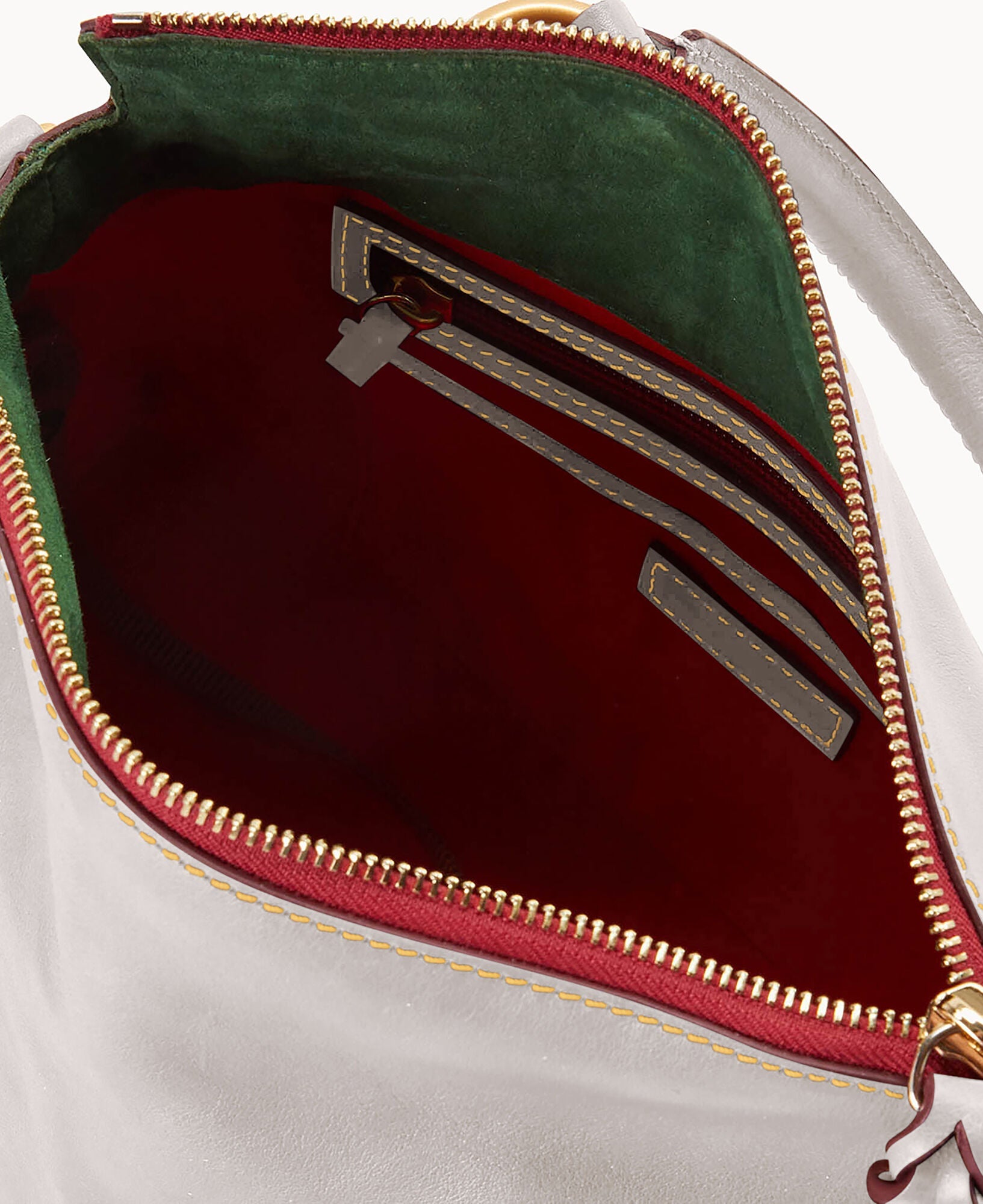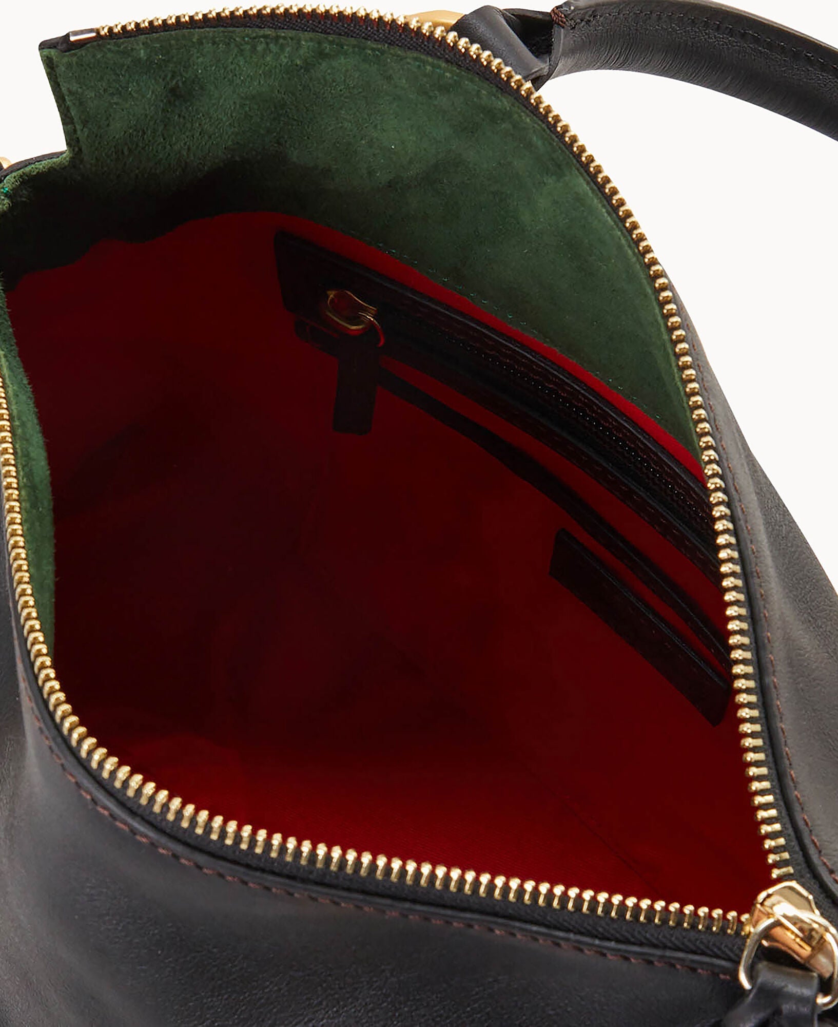 One inside zip pocket. Two inside slip pockets. One inside cell phone pocket. Inside key hook. Adjustable strap. Removable strap. Detachable strap. Strap drop length 24". Handle drop length 6". Lined. Feet. Zipper closure.