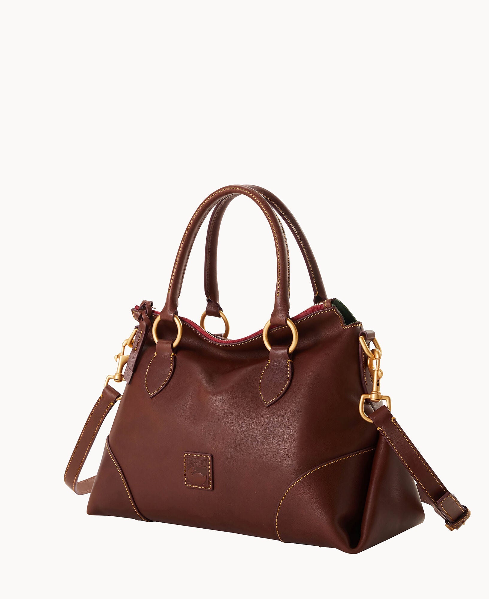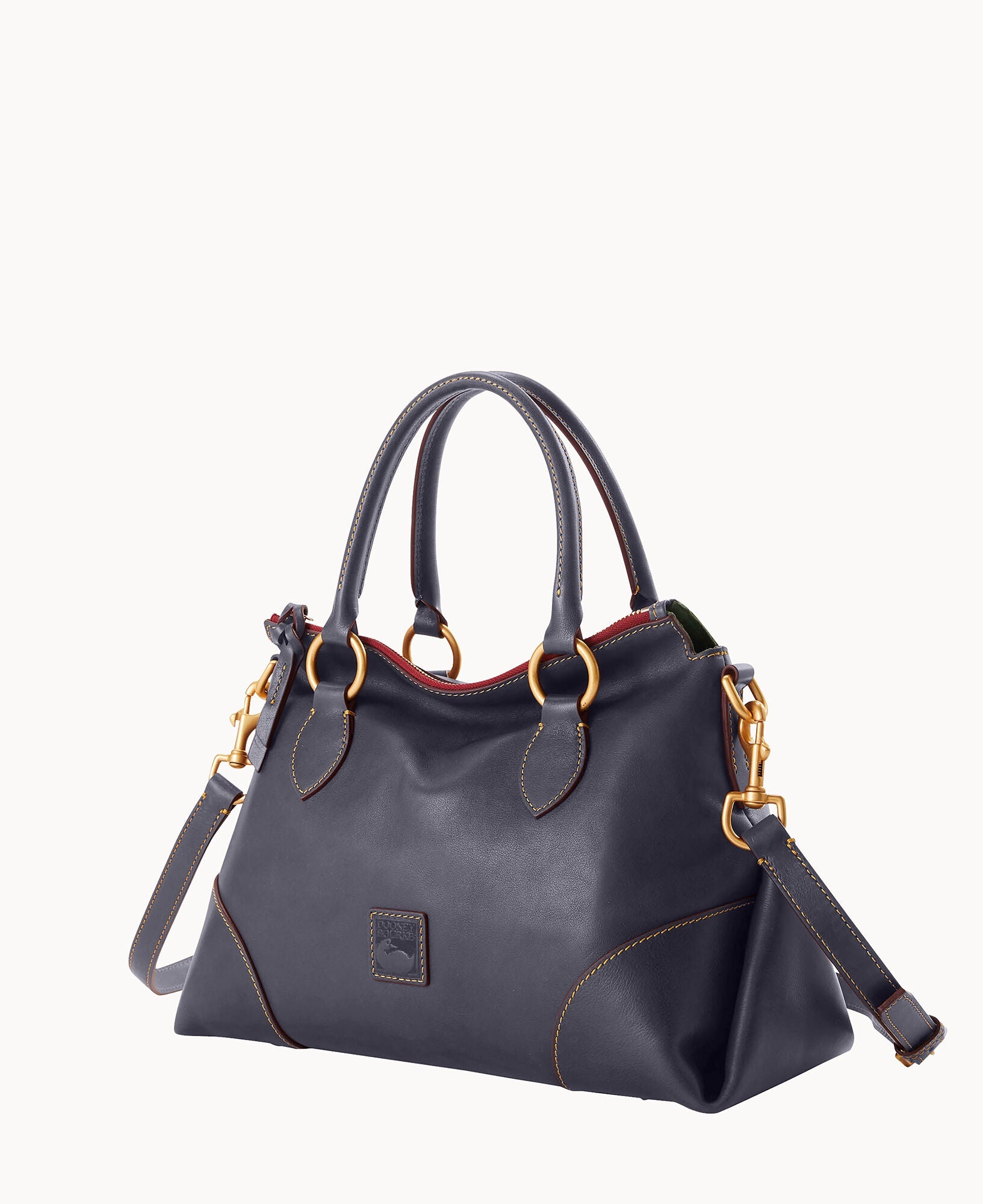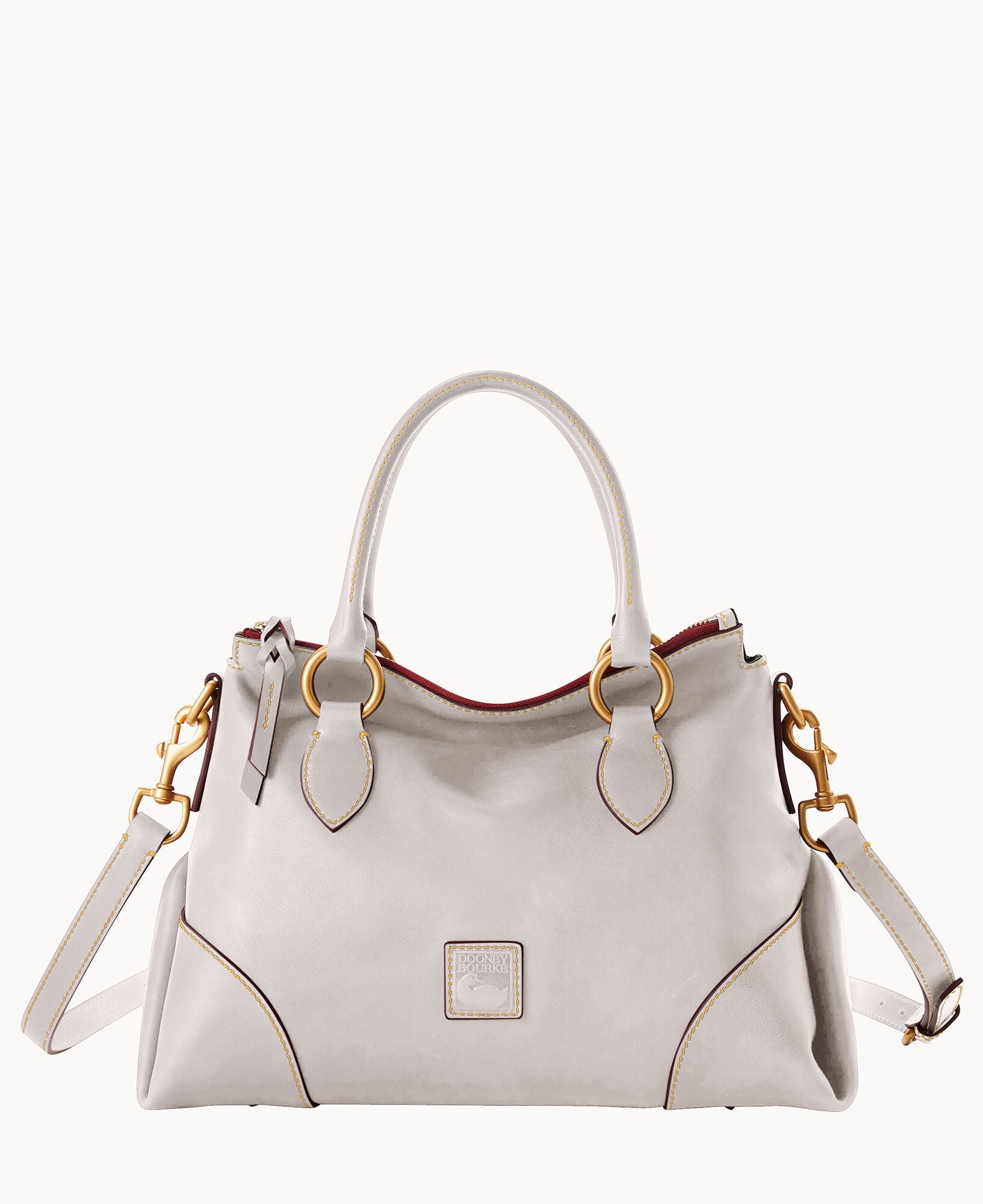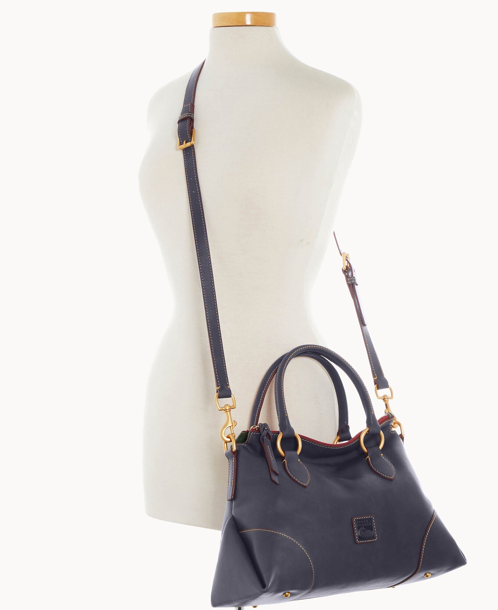 One inside zip pocket. Two inside slip pockets. One inside cell phone pocket. Inside key hook. Adjustable strap. Removable strap. Detachable strap. Strap drop length 24". Handle drop length 6". Lined. Feet. Zipper closure.