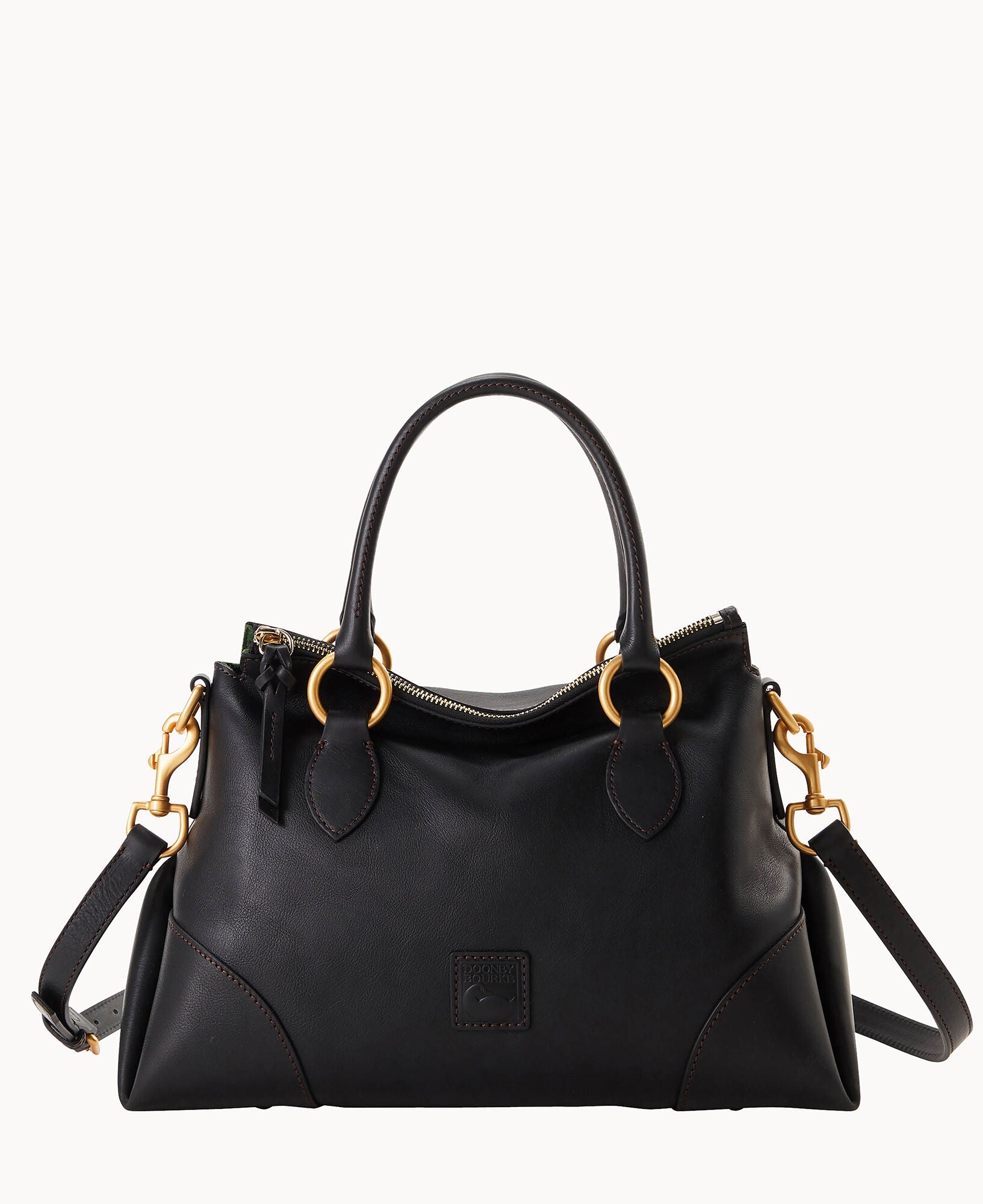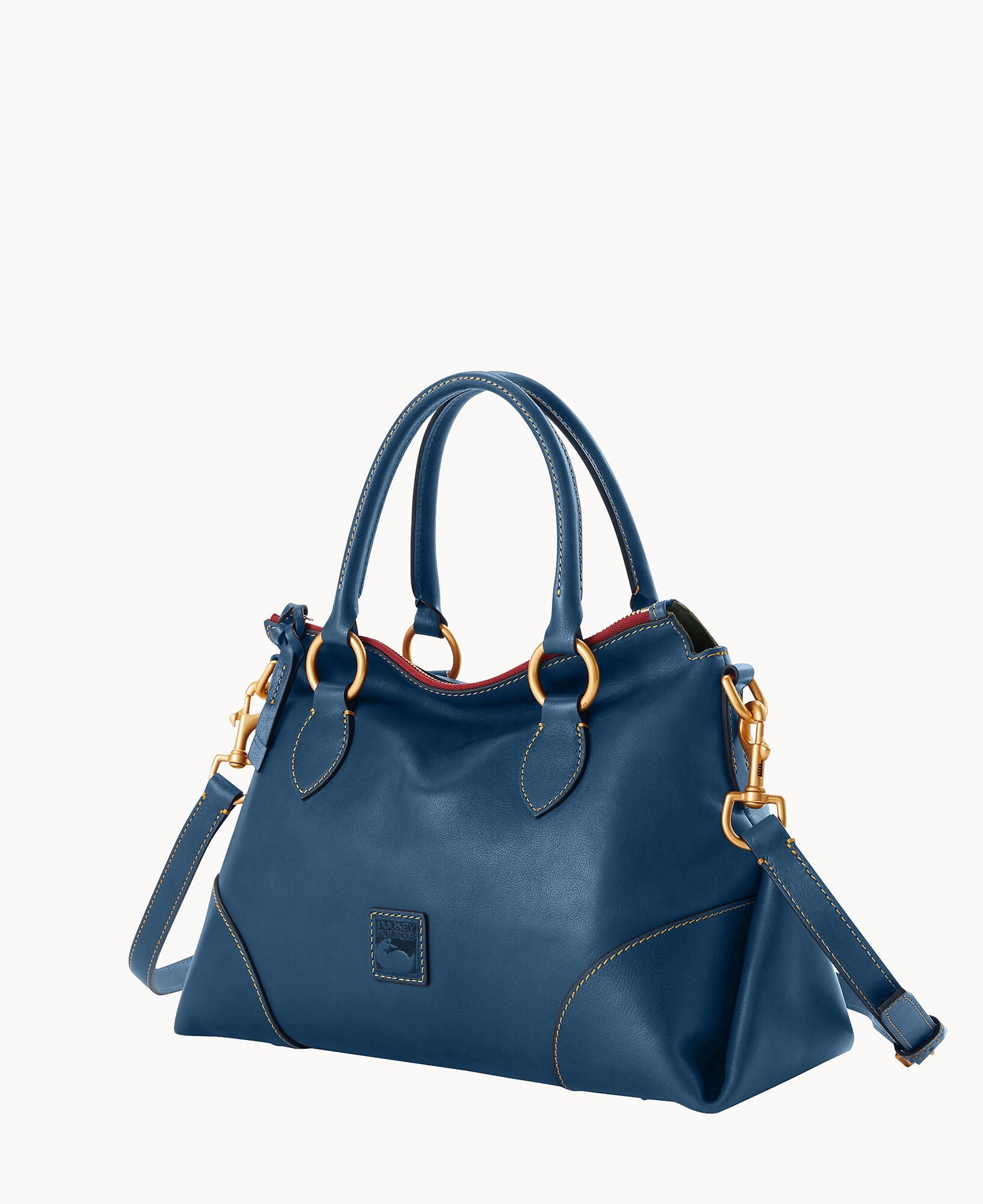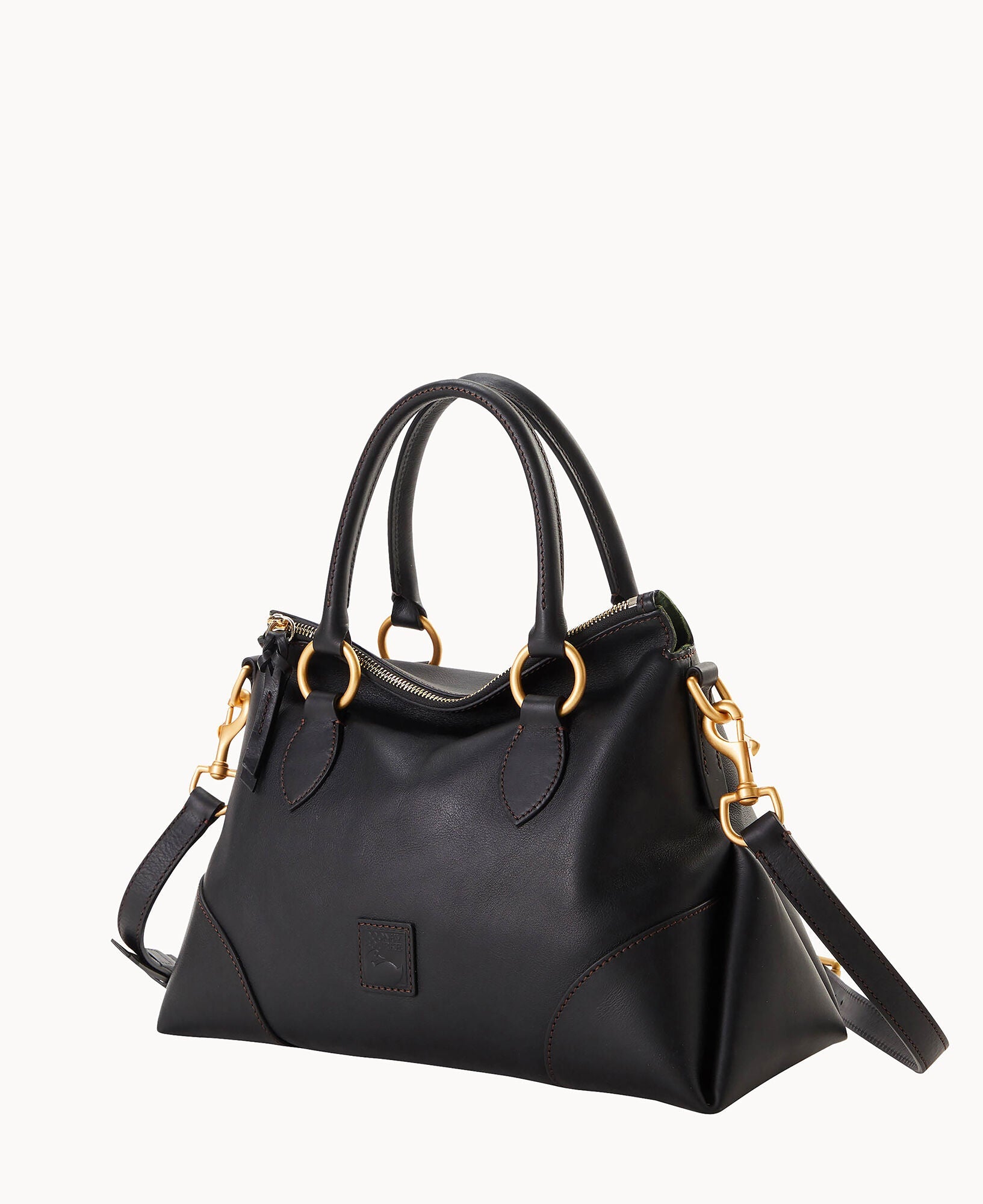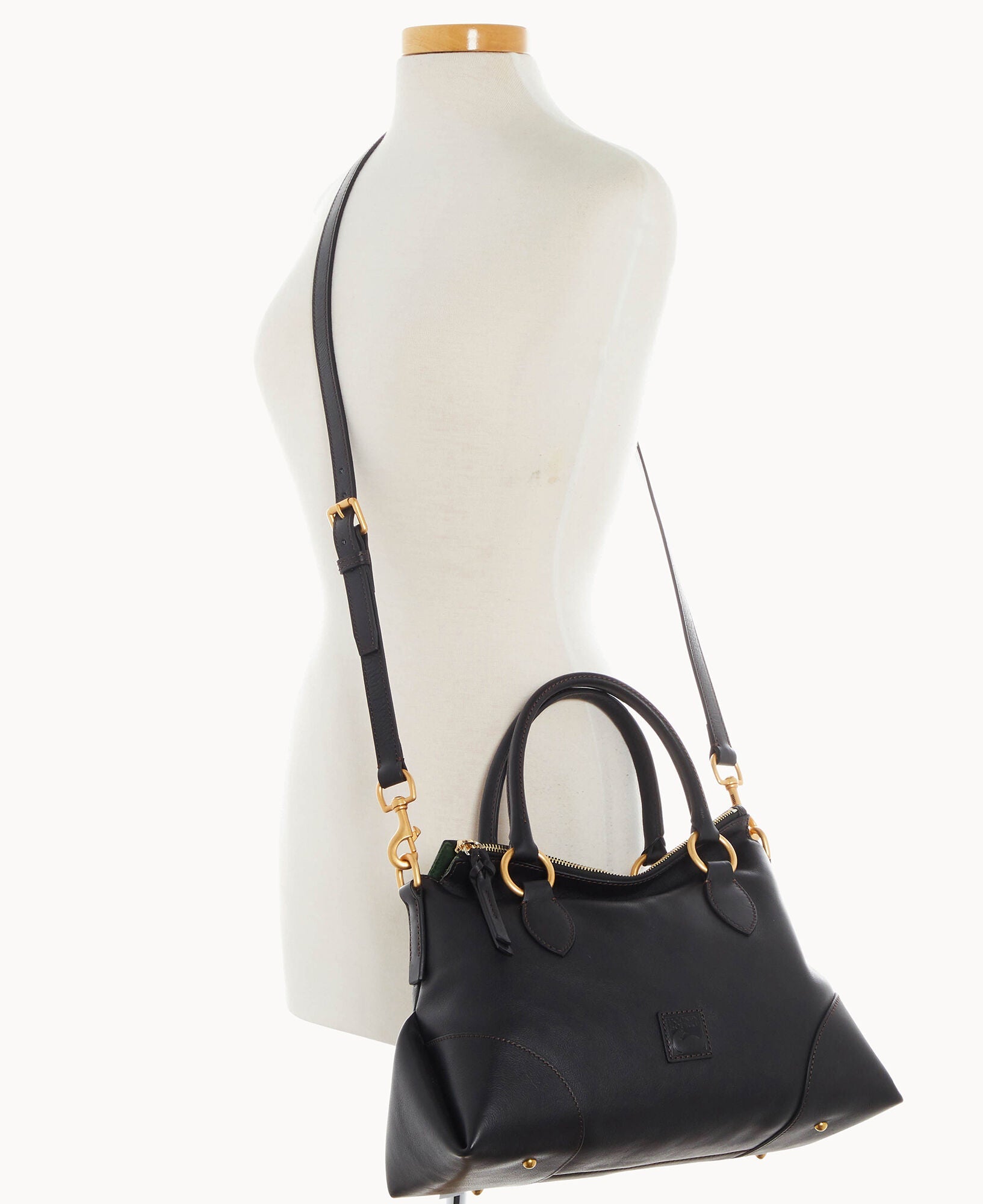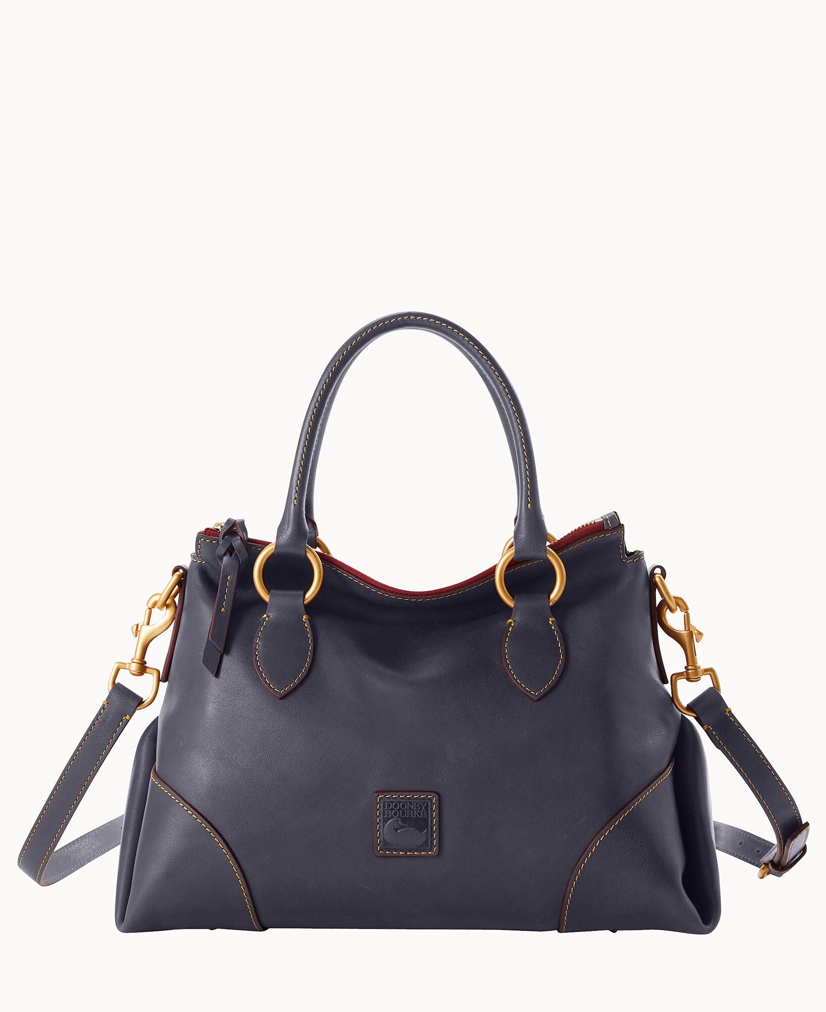 One inside zip pocket. Two inside slip pockets. One inside cell phone pocket. Inside key hook. Adjustable strap. Removable strap. Detachable strap. Strap drop length 24". Handle drop length 6". Lined. Feet. Zipper closure.