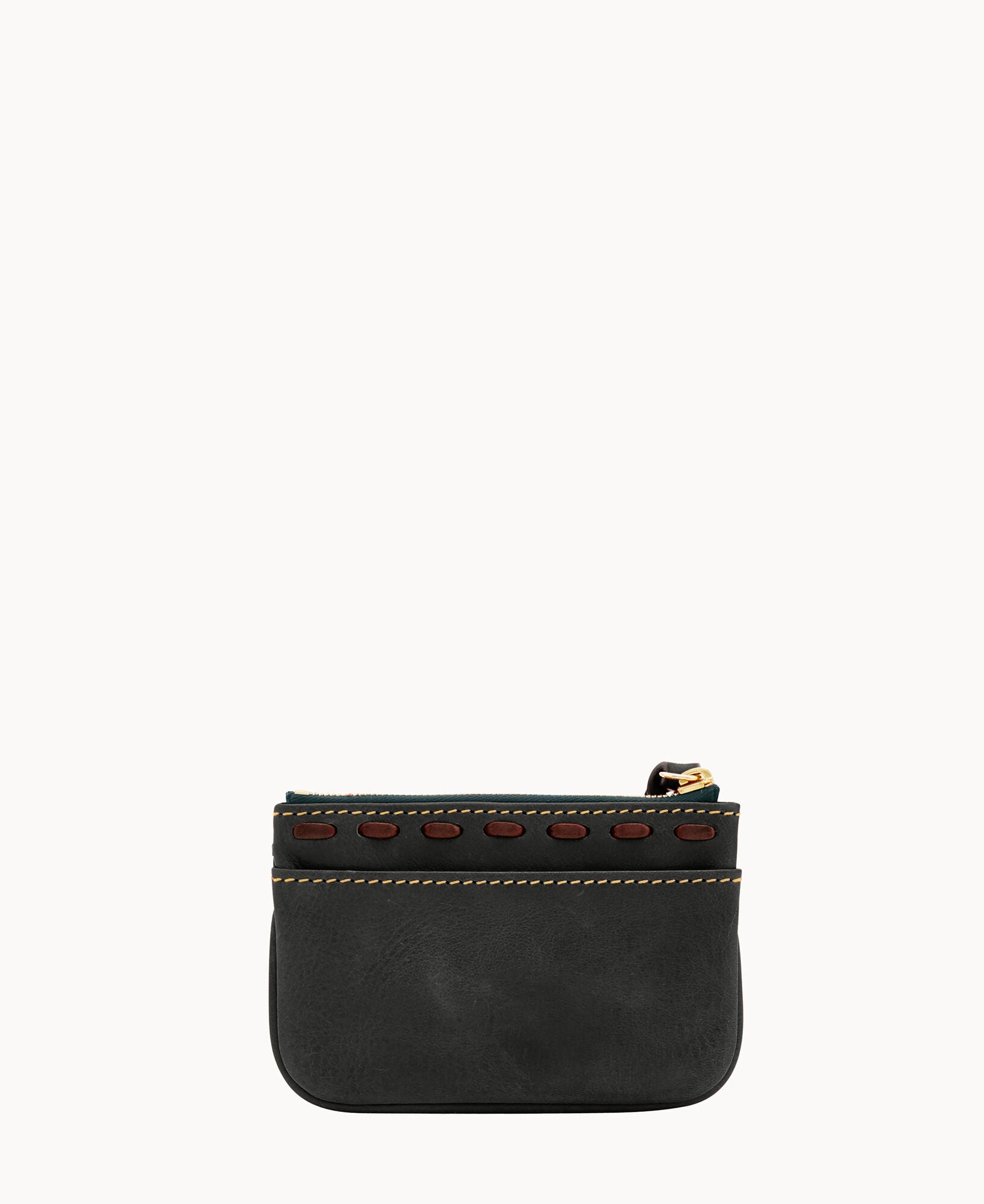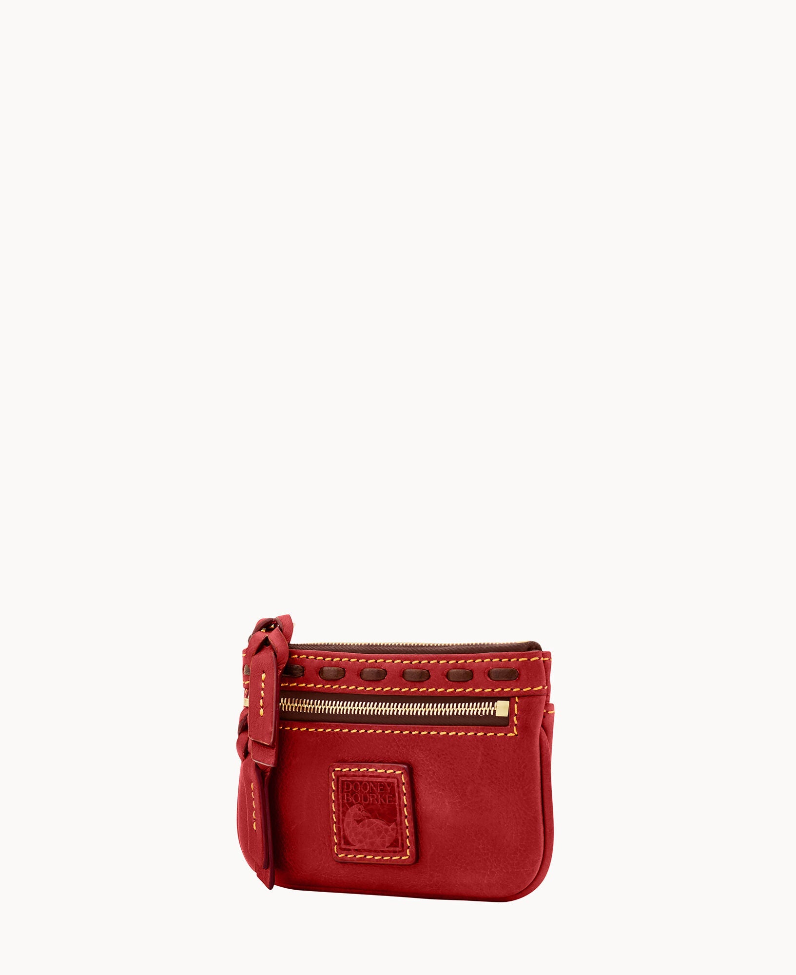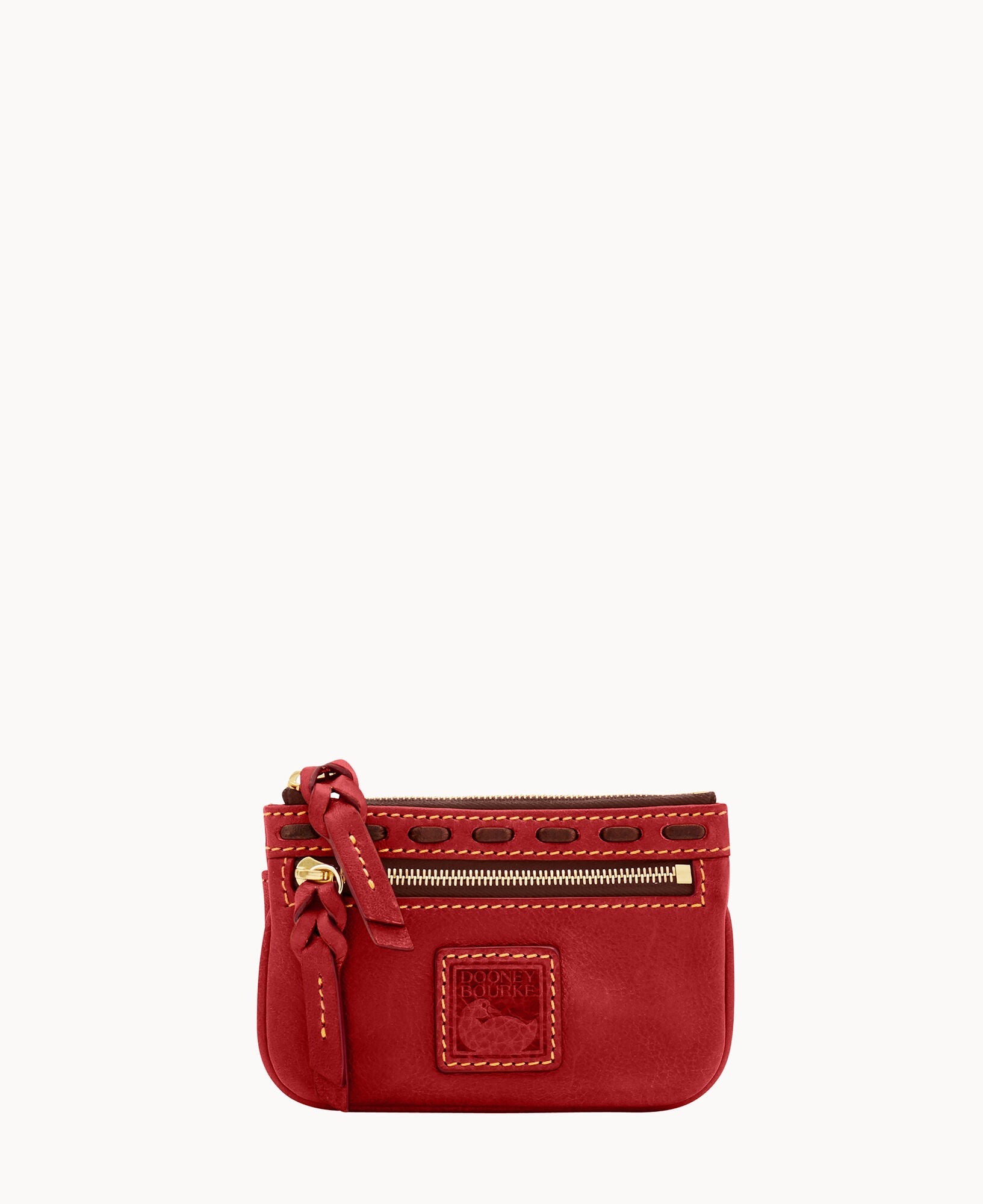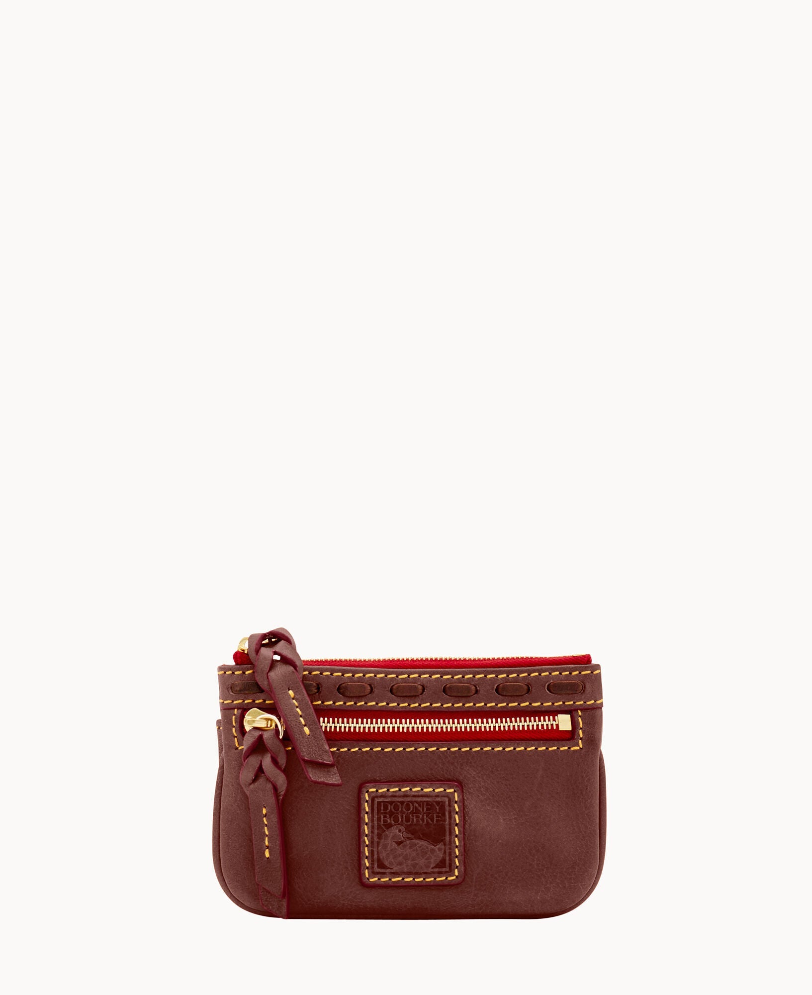 One outside zip pocket. Inside key ring. Lined. Zipper closure.