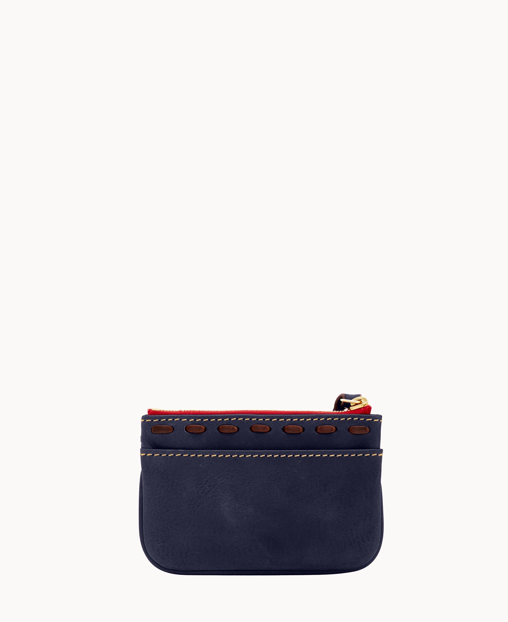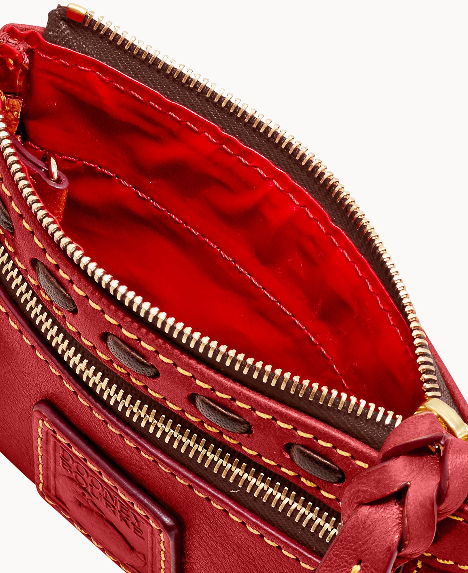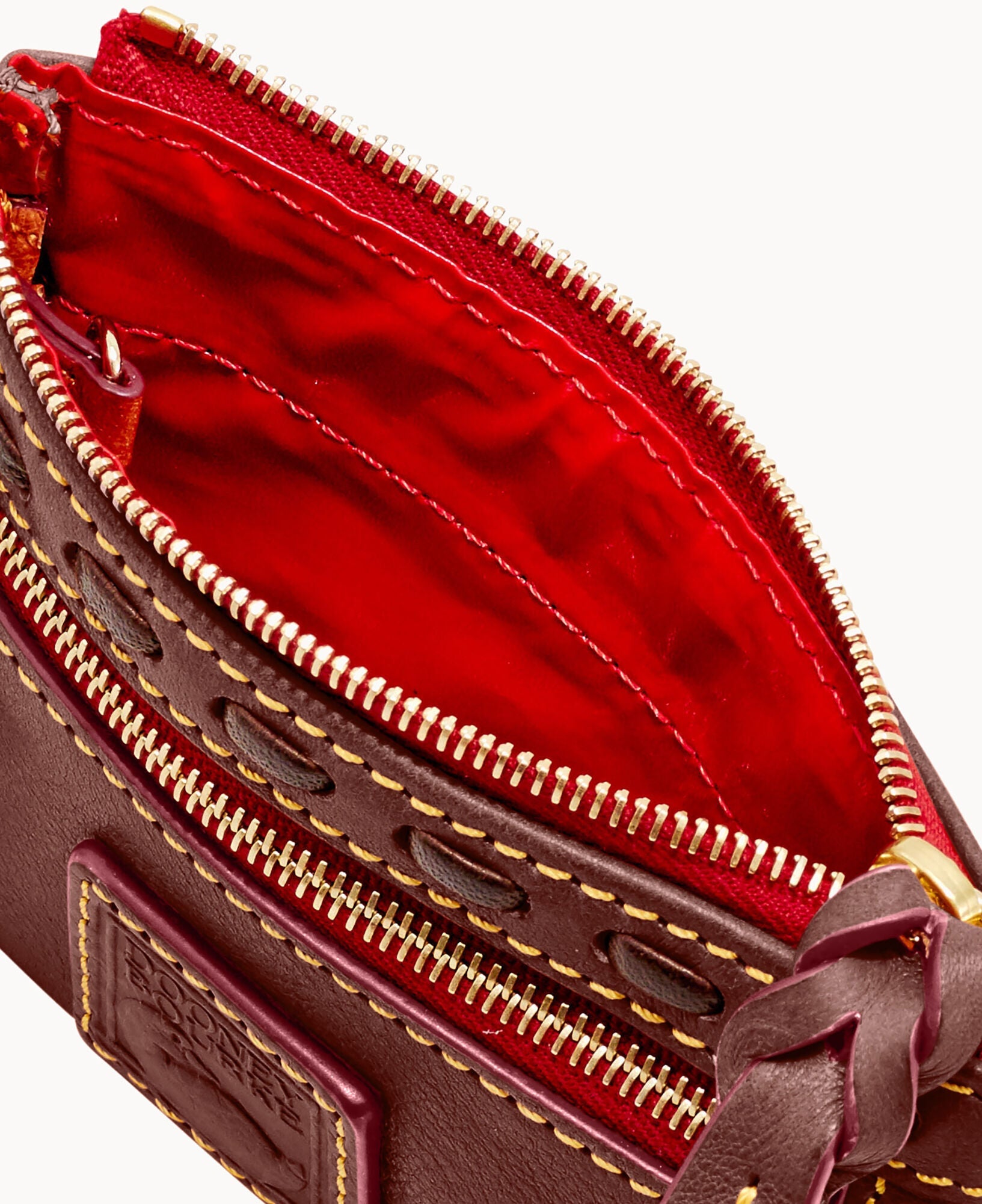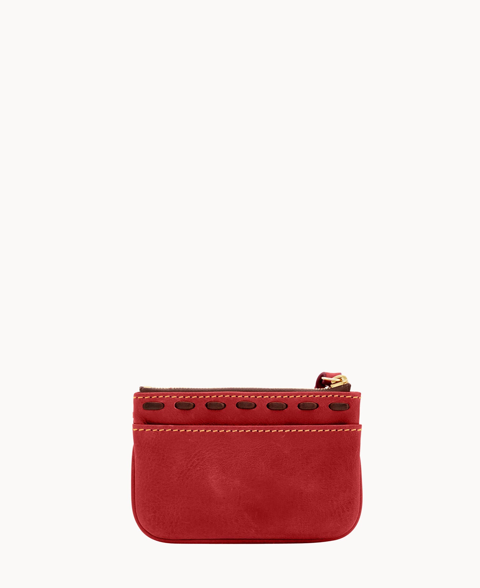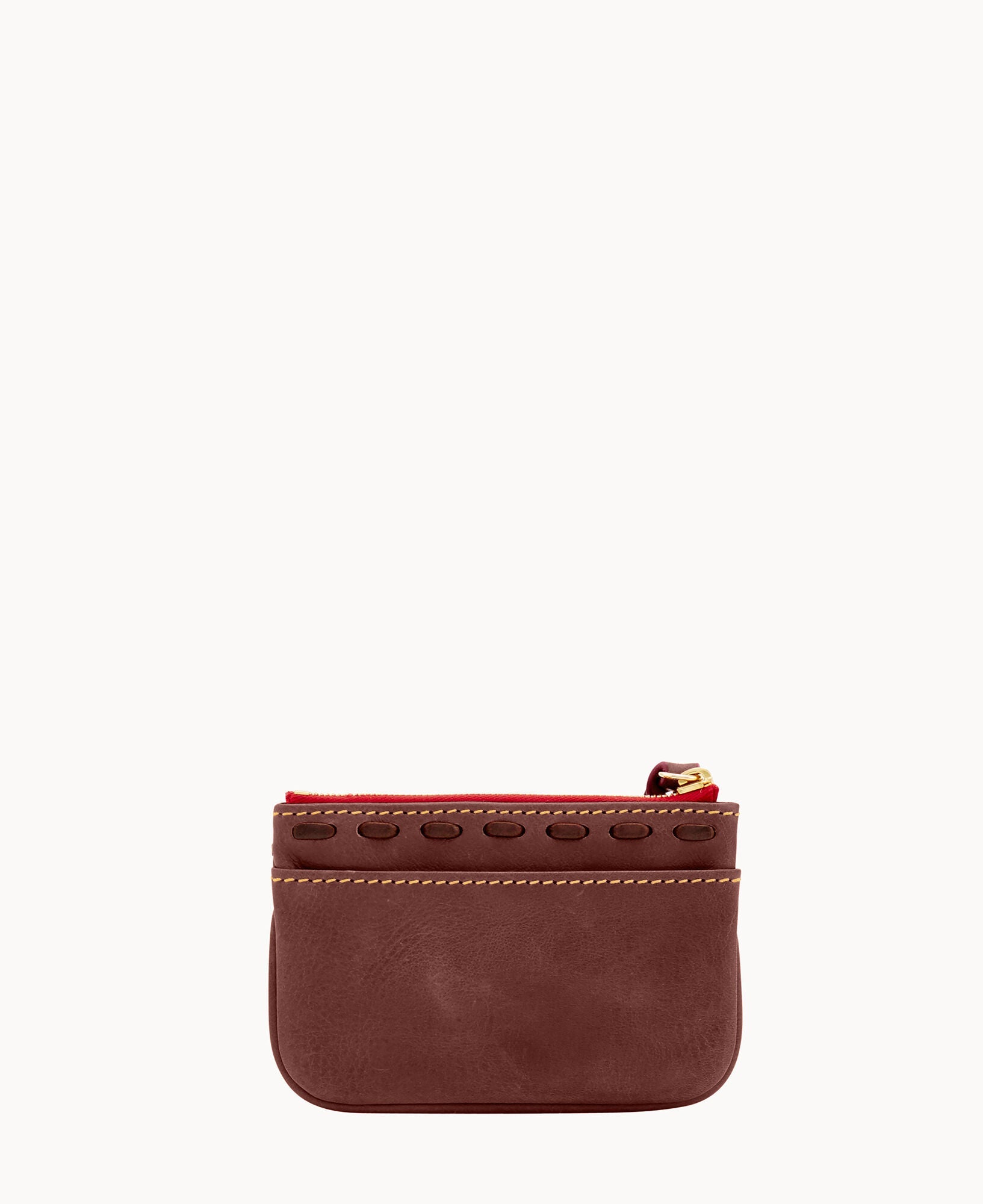 One outside zip pocket. Inside key ring. Lined. Zipper closure.