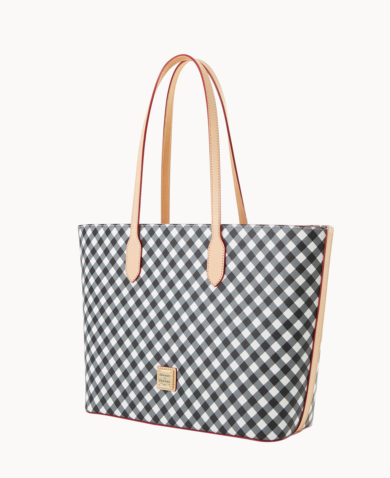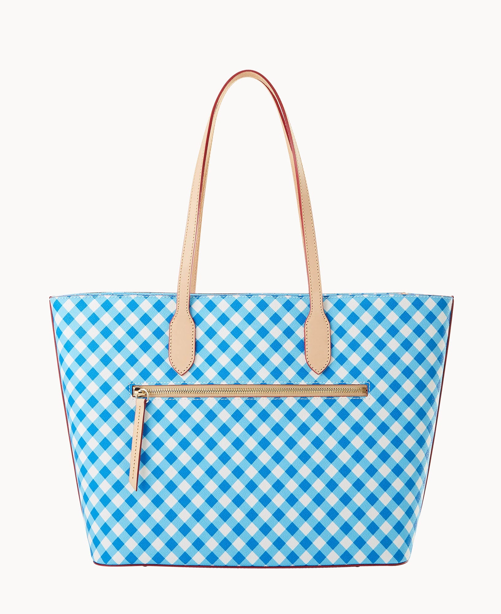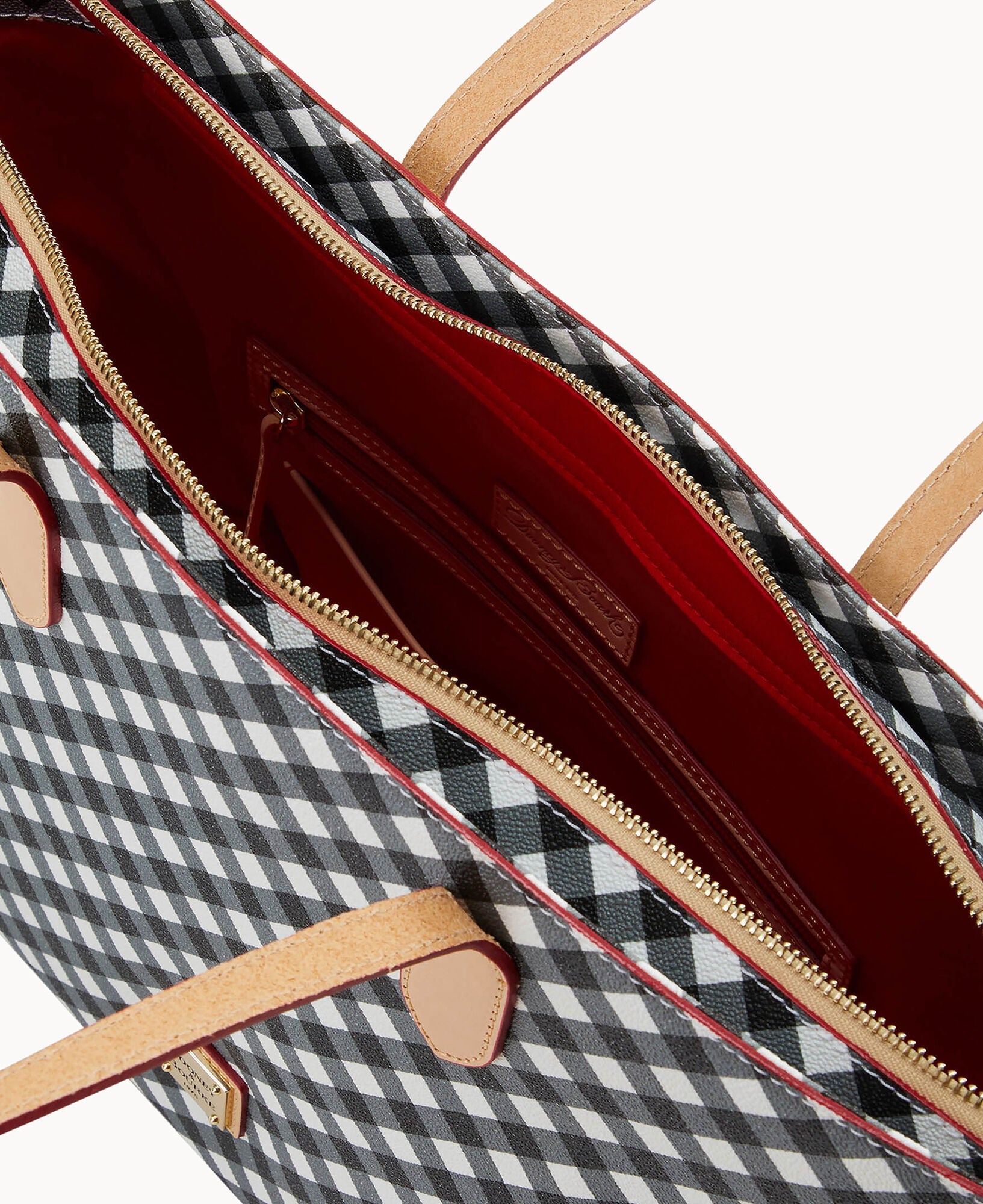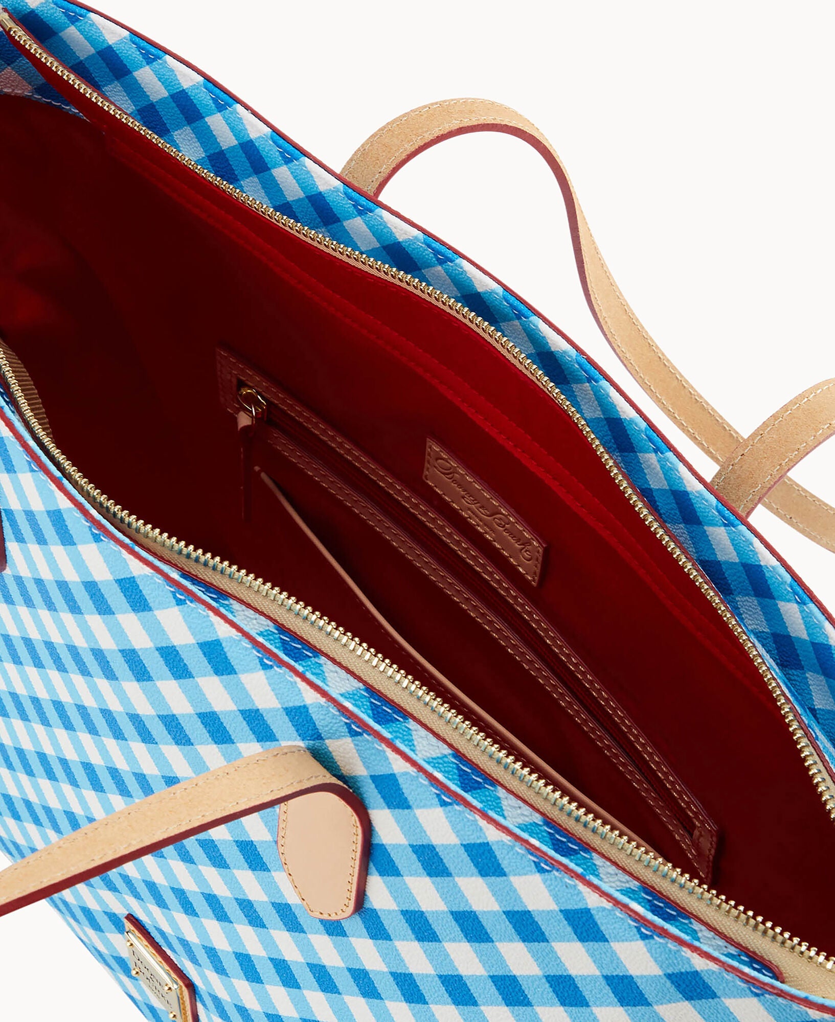 One outside zip pocket. One inside zip pocket. Two inside pockets. Cell phone pocket. Inside key hook. Strap drop length 10". Lined. Feet. Zipper closure.
