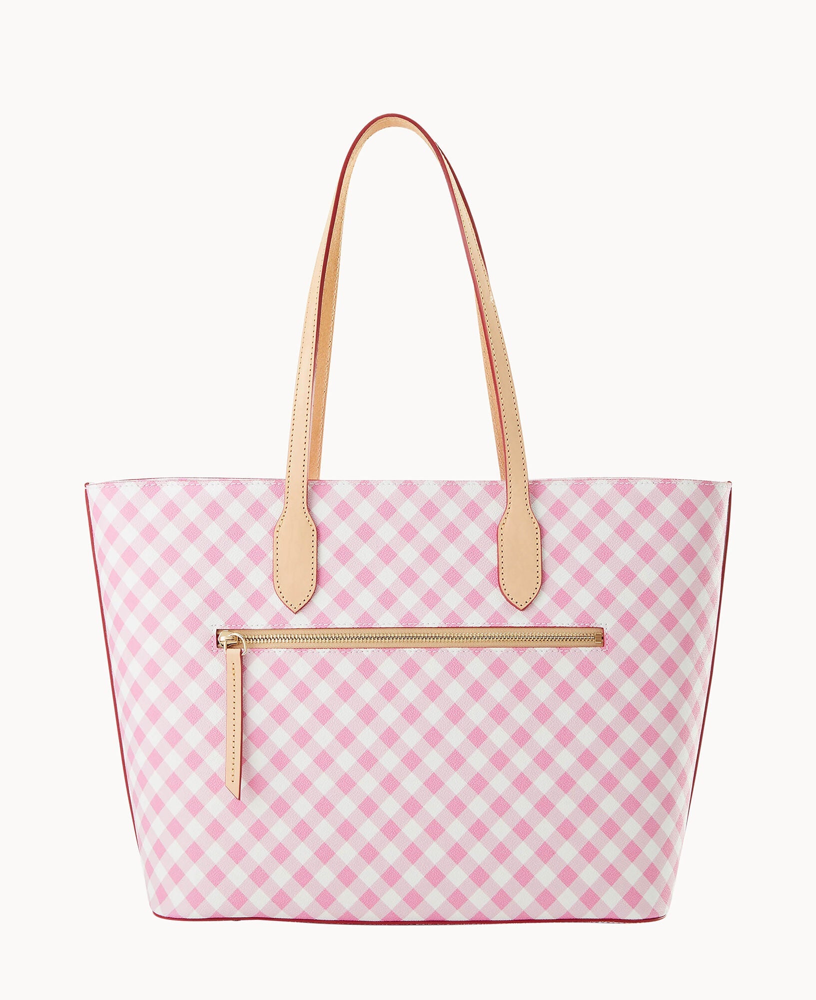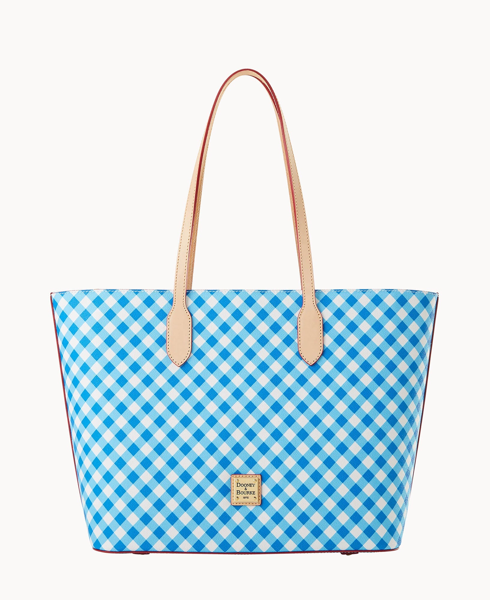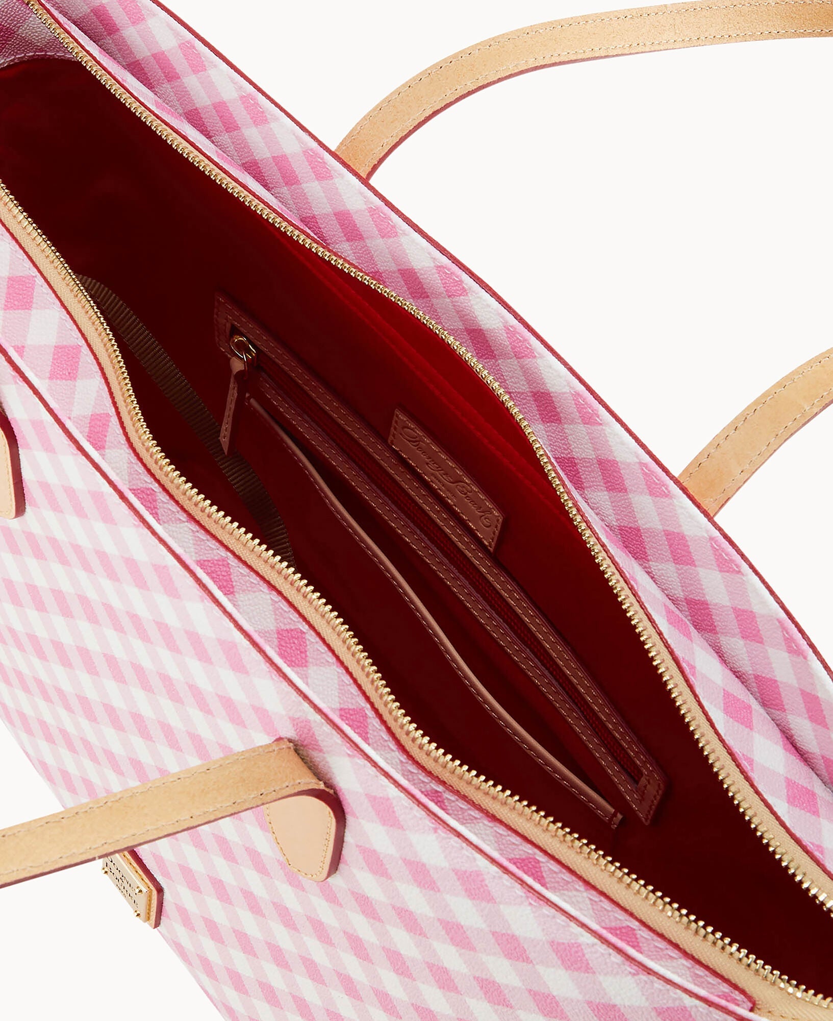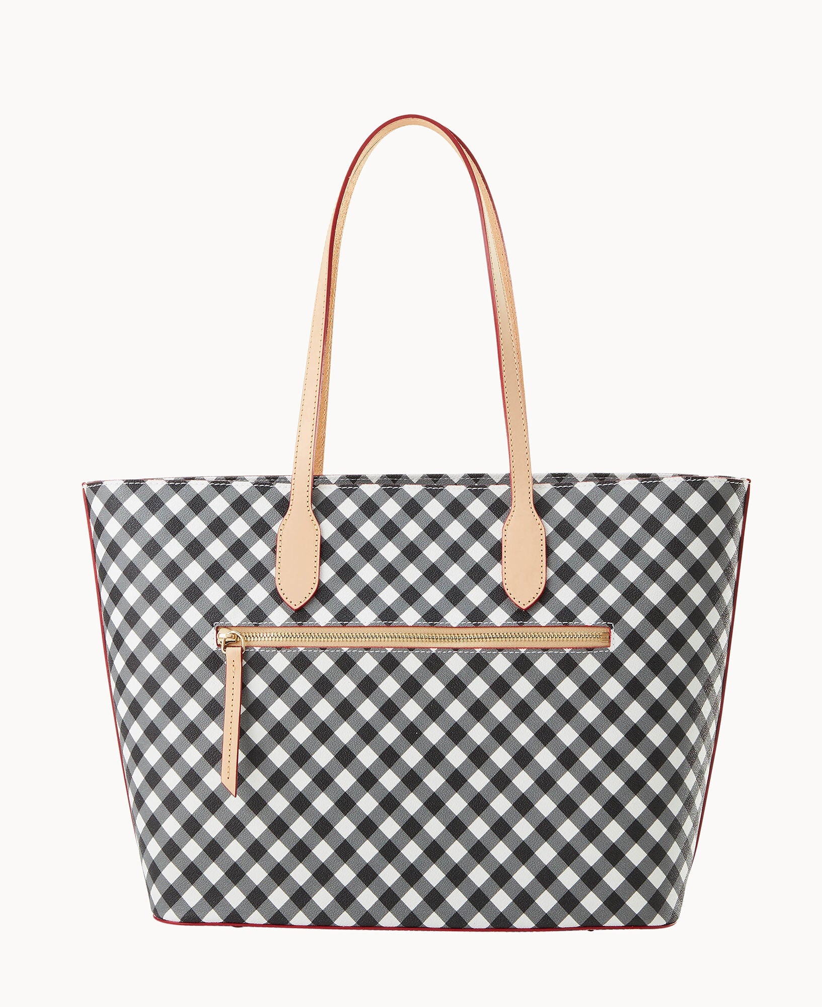 One outside zip pocket. One inside zip pocket. Two inside pockets. Cell phone pocket. Inside key hook. Strap drop length 10". Lined. Feet. Zipper closure.
