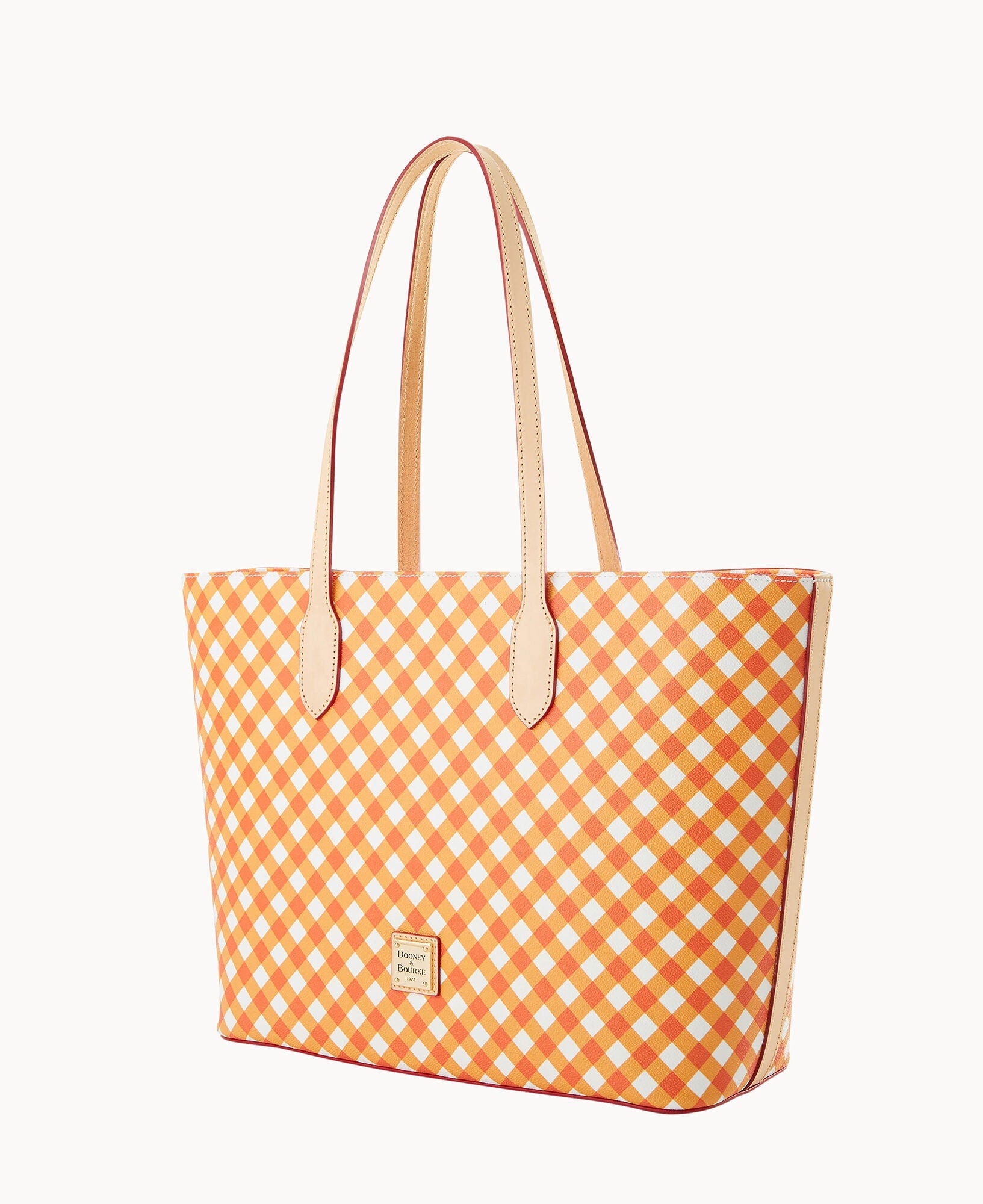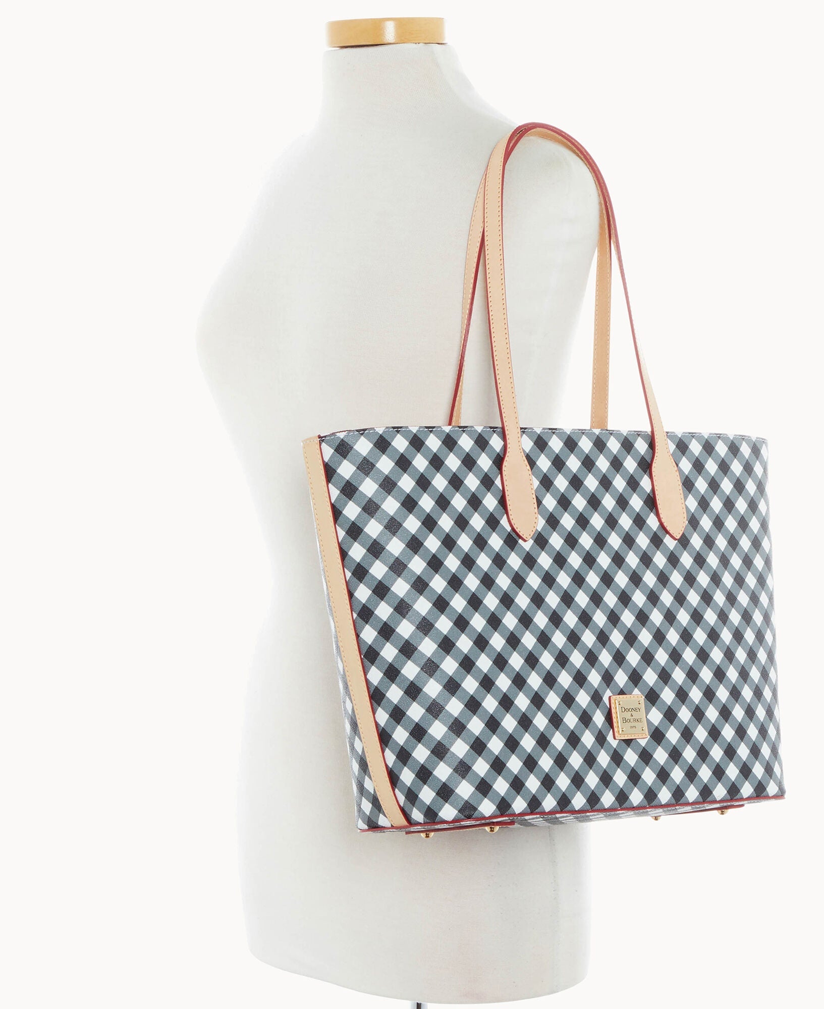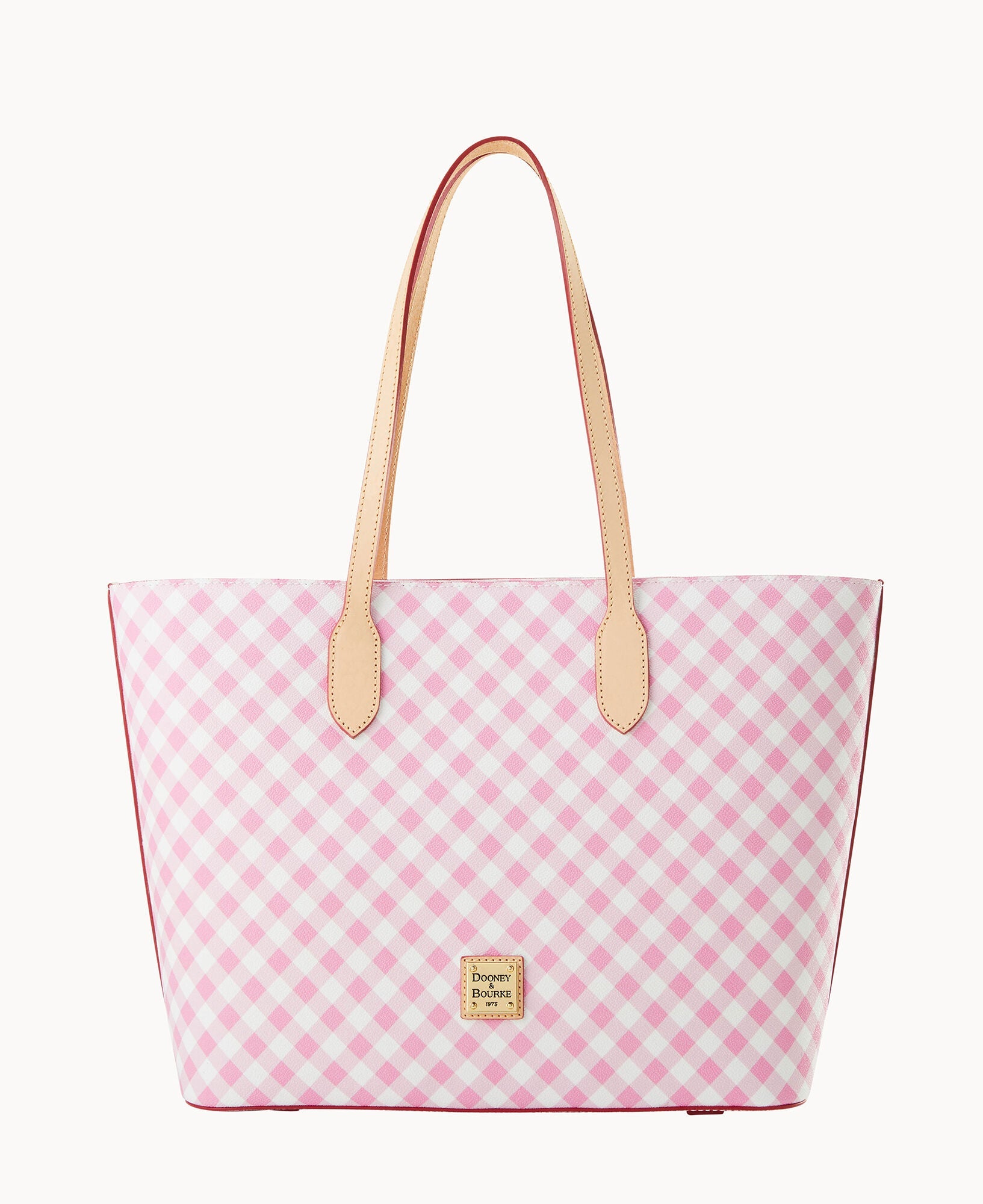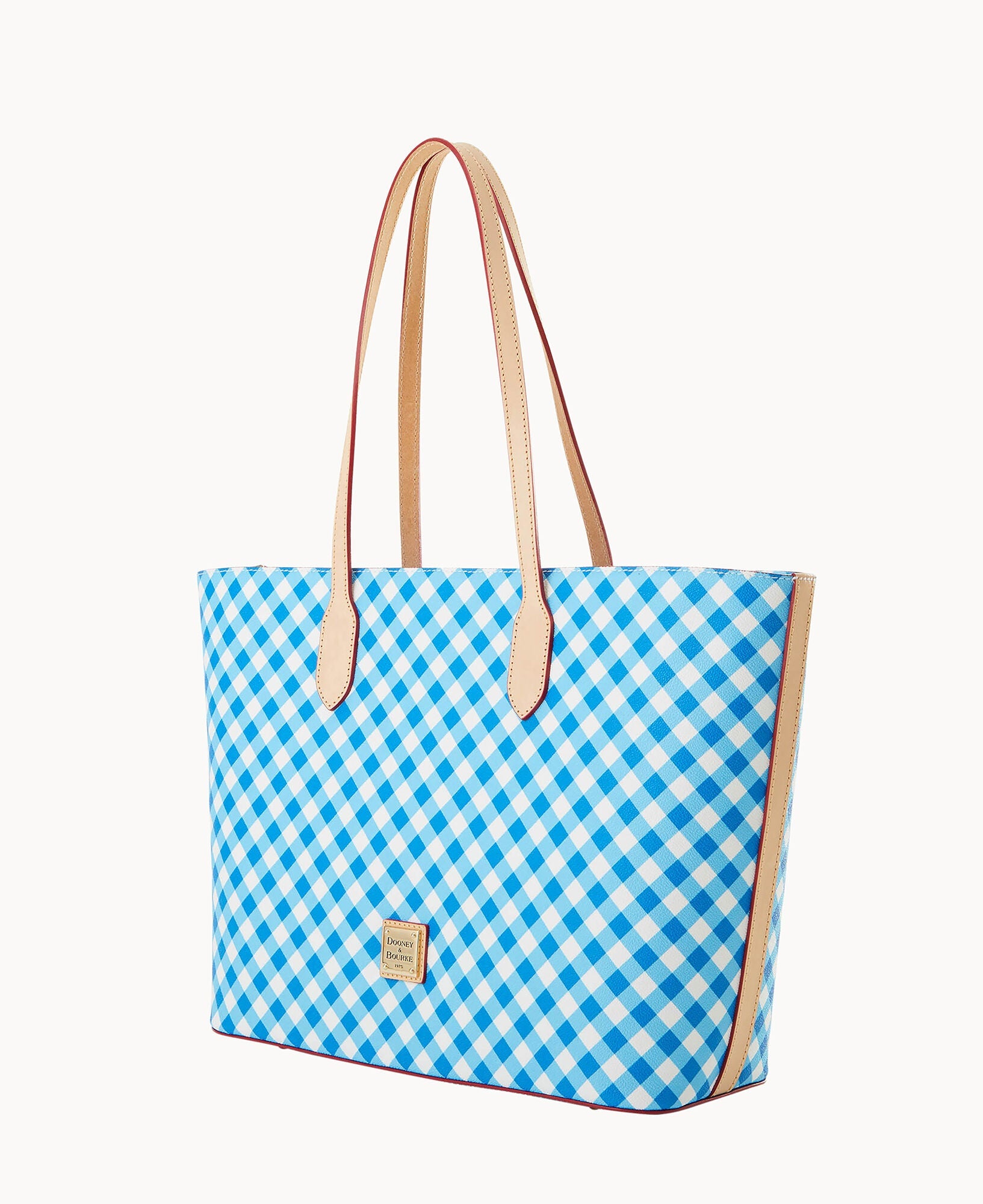 One outside zip pocket. One inside zip pocket. Two inside pockets. Cell phone pocket. Inside key hook. Strap drop length 10". Lined. Feet. Zipper closure.