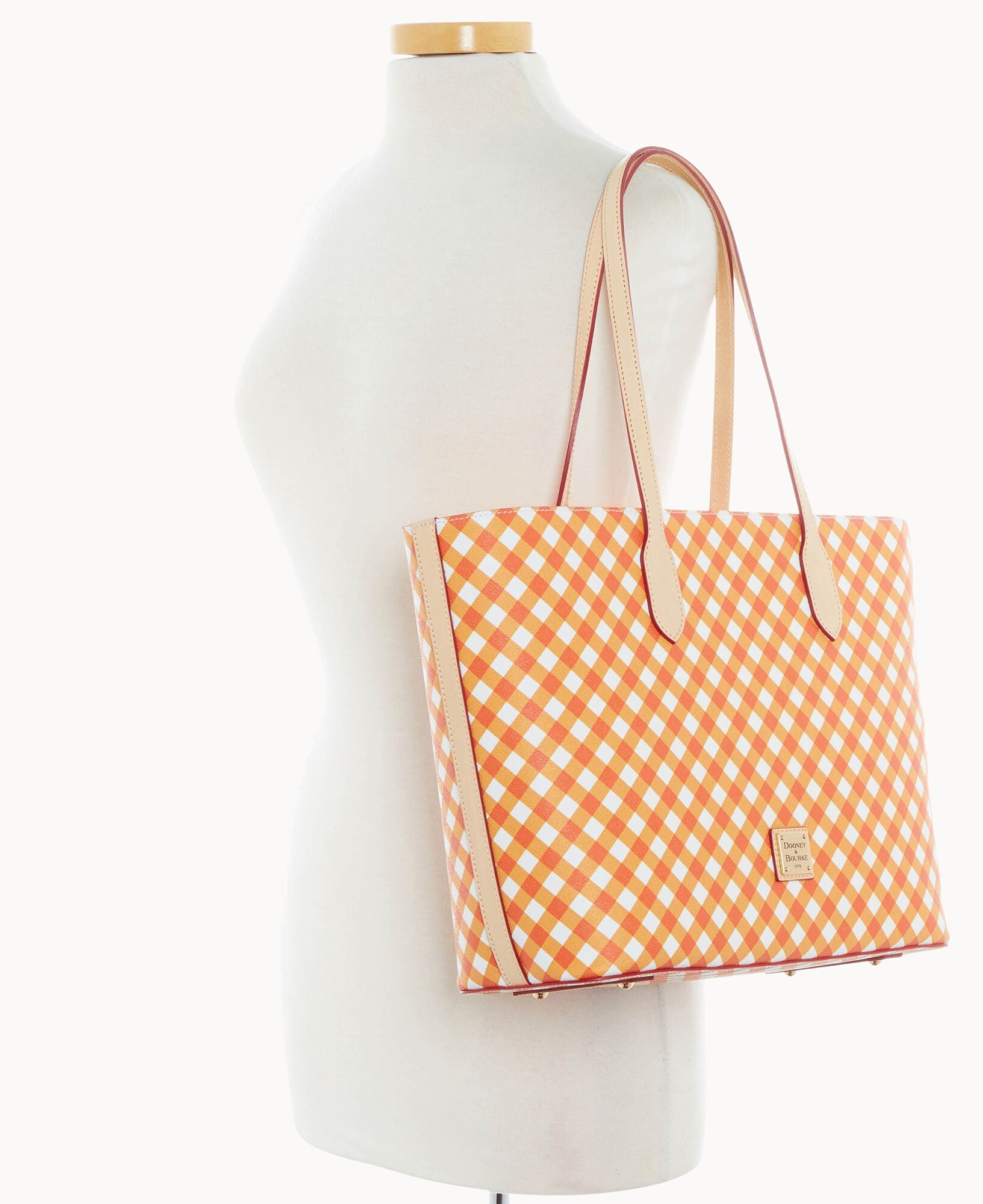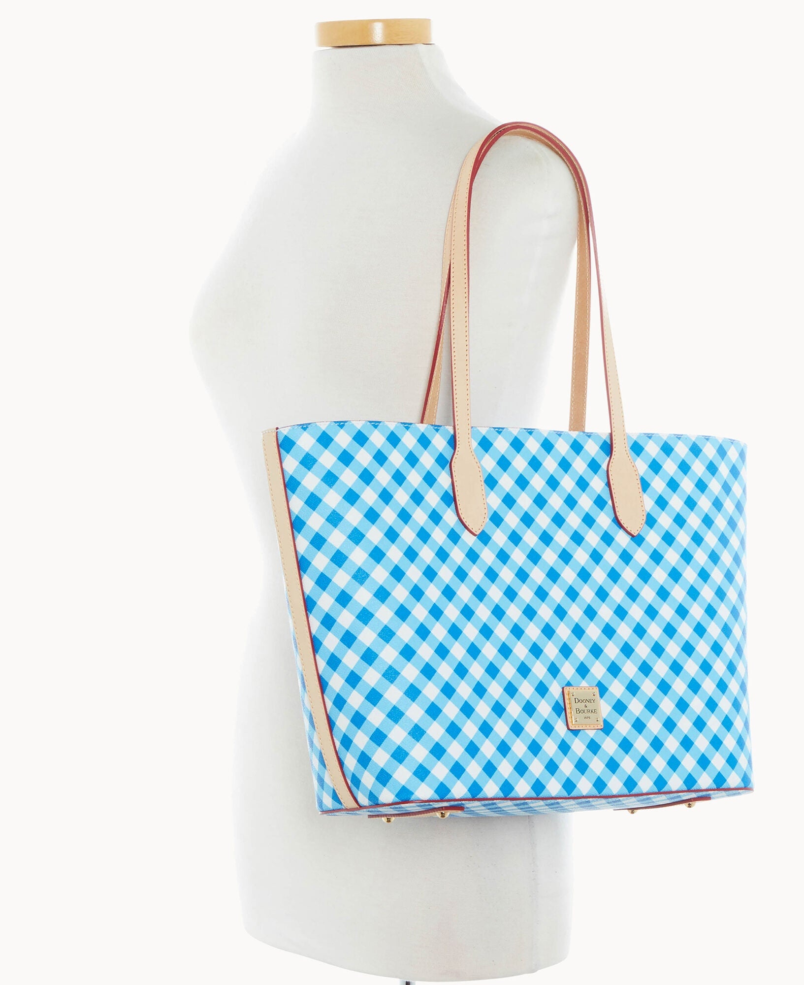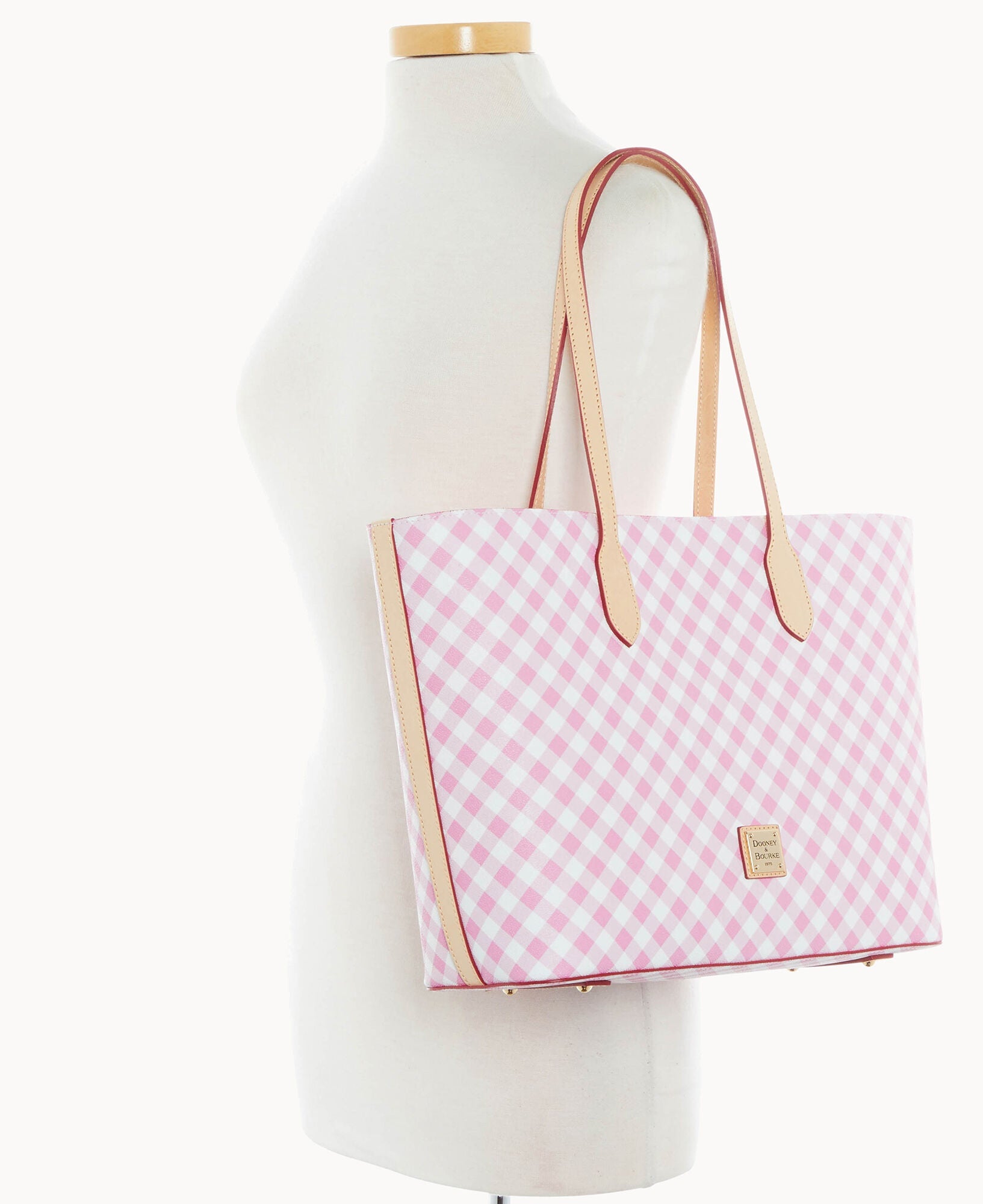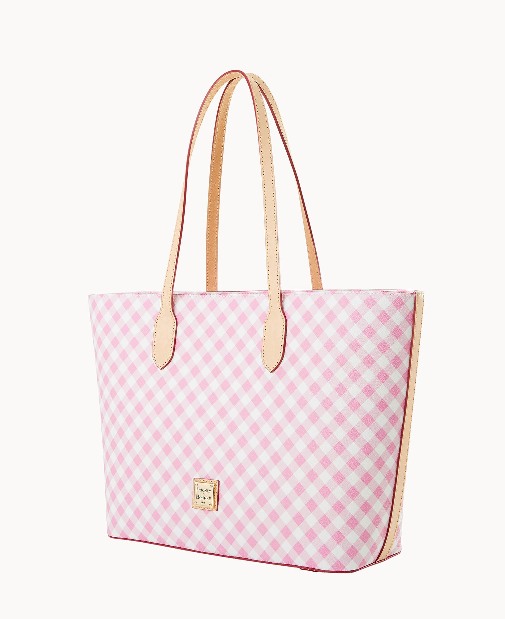 One outside zip pocket. One inside zip pocket. Two inside pockets. Cell phone pocket. Inside key hook. Strap drop length 10". Lined. Feet. Zipper closure.