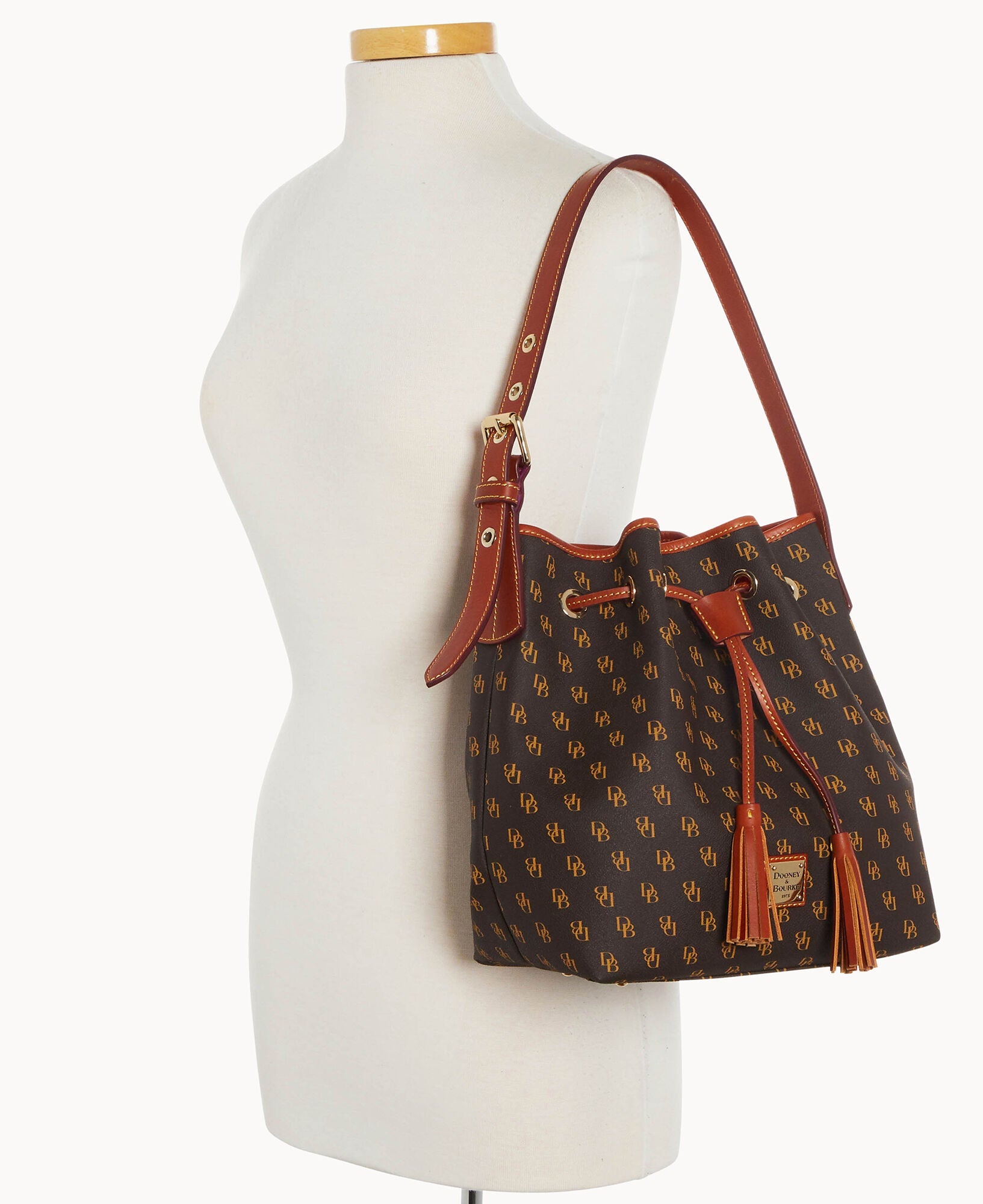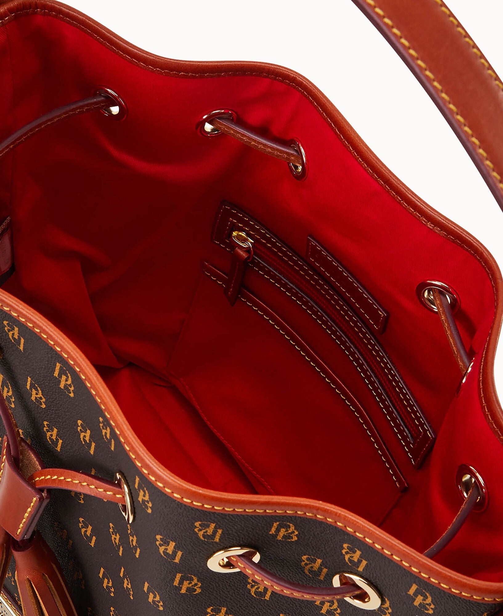 Two inside pockets. One inside zip pocket. Cell phone pocket. Inside key hook. Adjustable shoulder strap. Strap drop length 11". Lined. Feet. Drawstring closure.