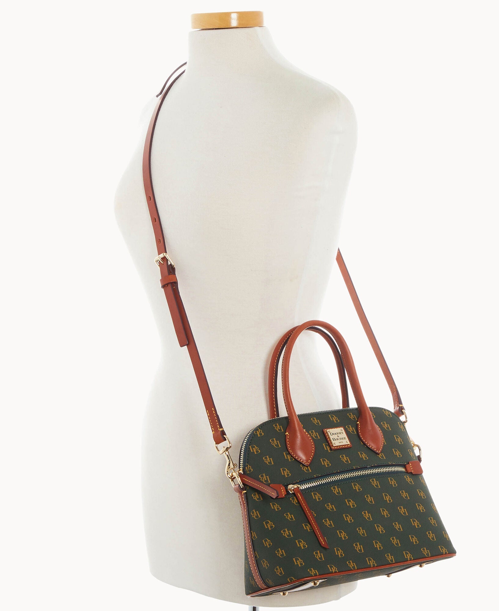 One outside zip pocket. Two inside slip pockets. One inside phone pocket. Inside key hook. Adjustable strap. Detachable strap. Strap drop length 23". Handle drop length 4.5". Feet. Lined. Zipper closure.
