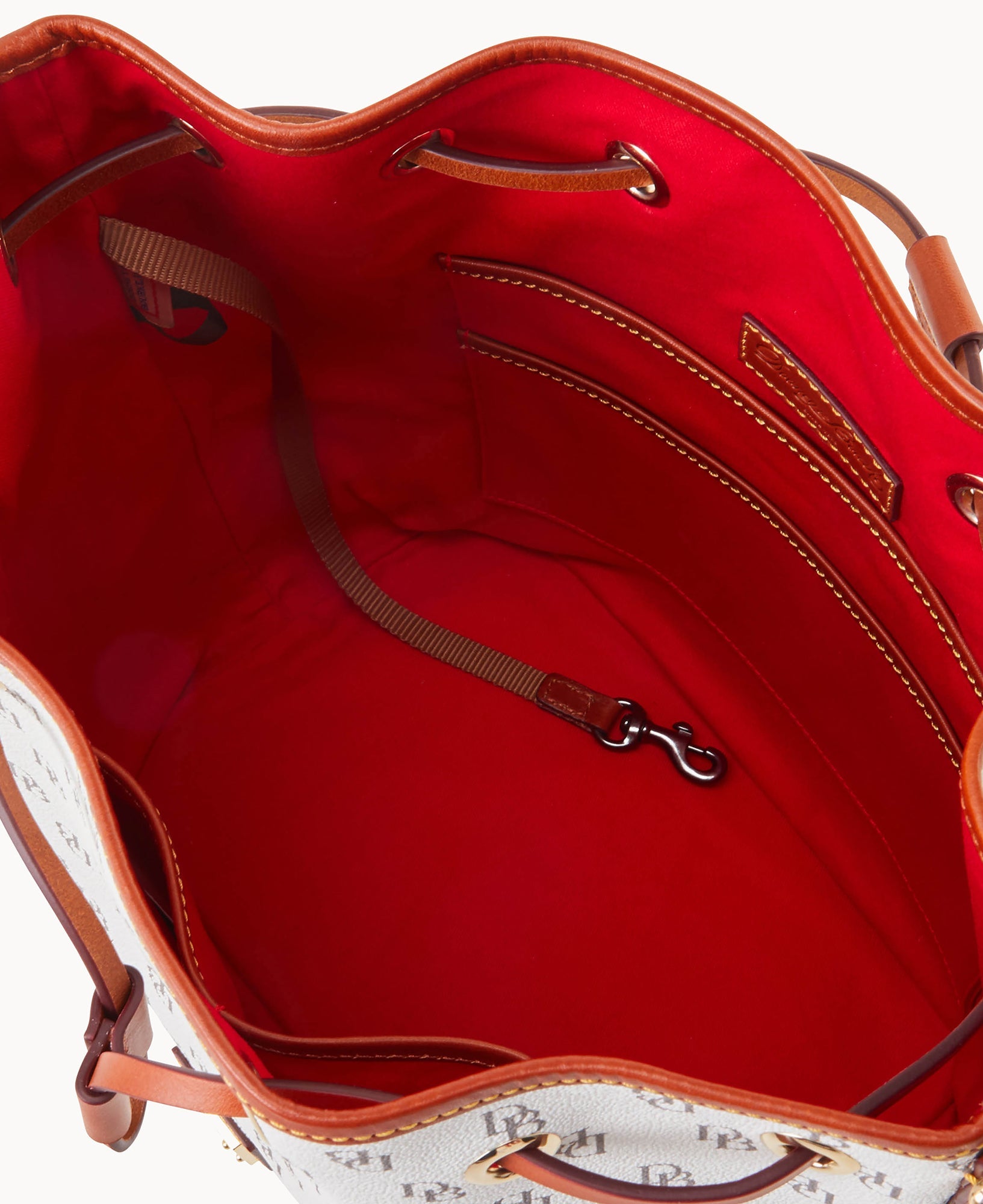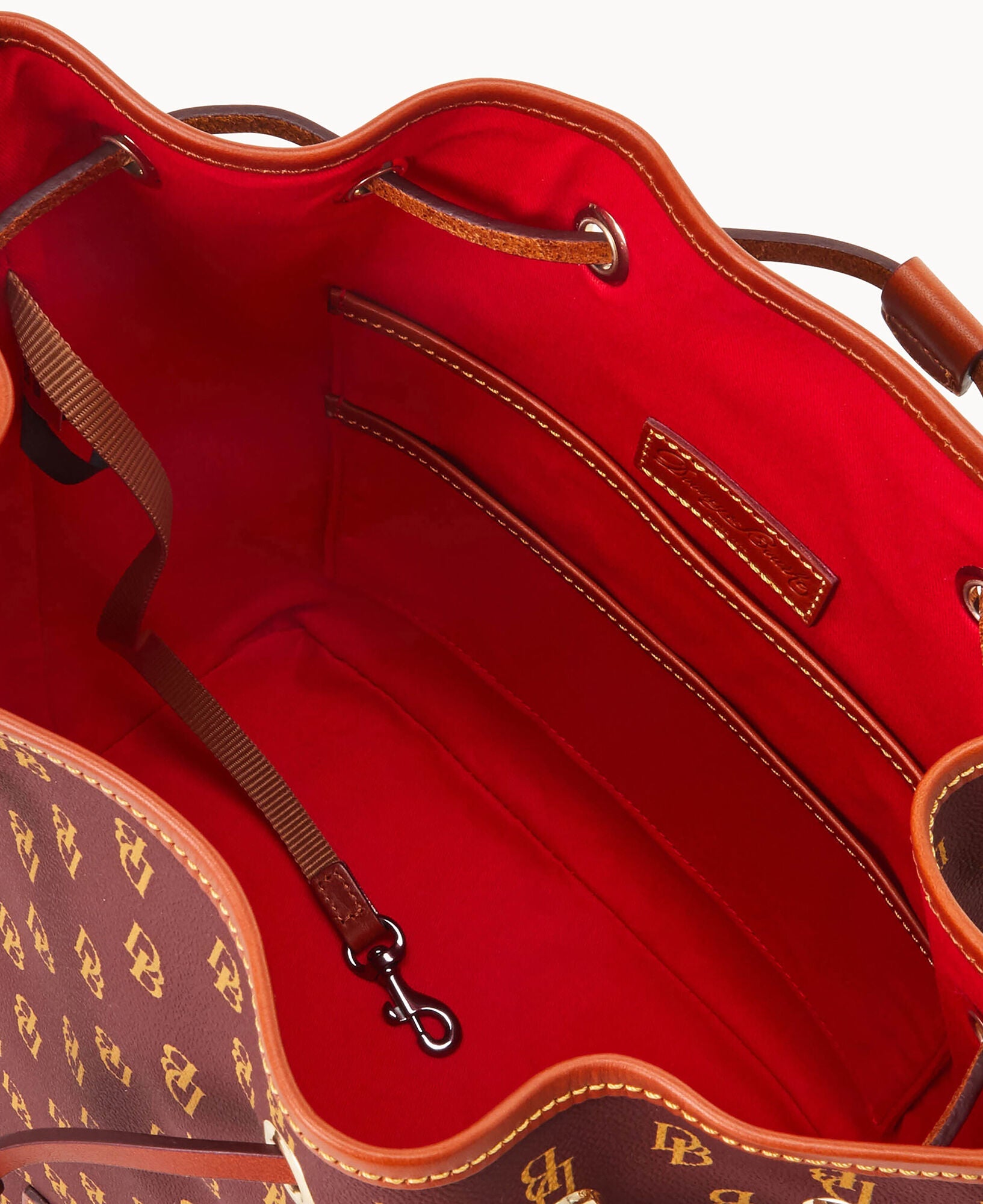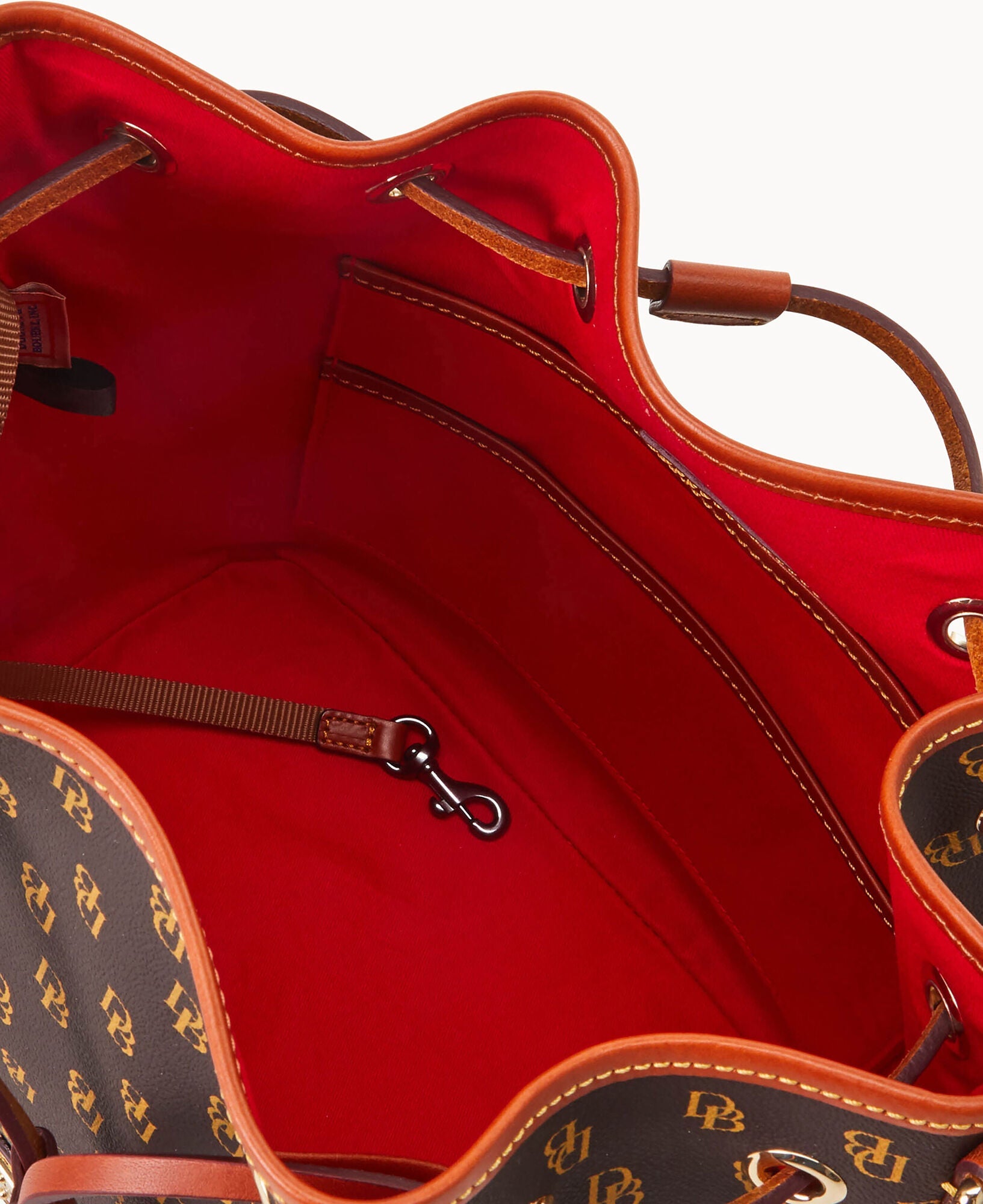 One inside zip pocket. Two inside pockets. Cell phone pocket. Inside key hook. Detachable shoulder strap. Strap drop length 12". Lined. Feet. Drawstring closure.