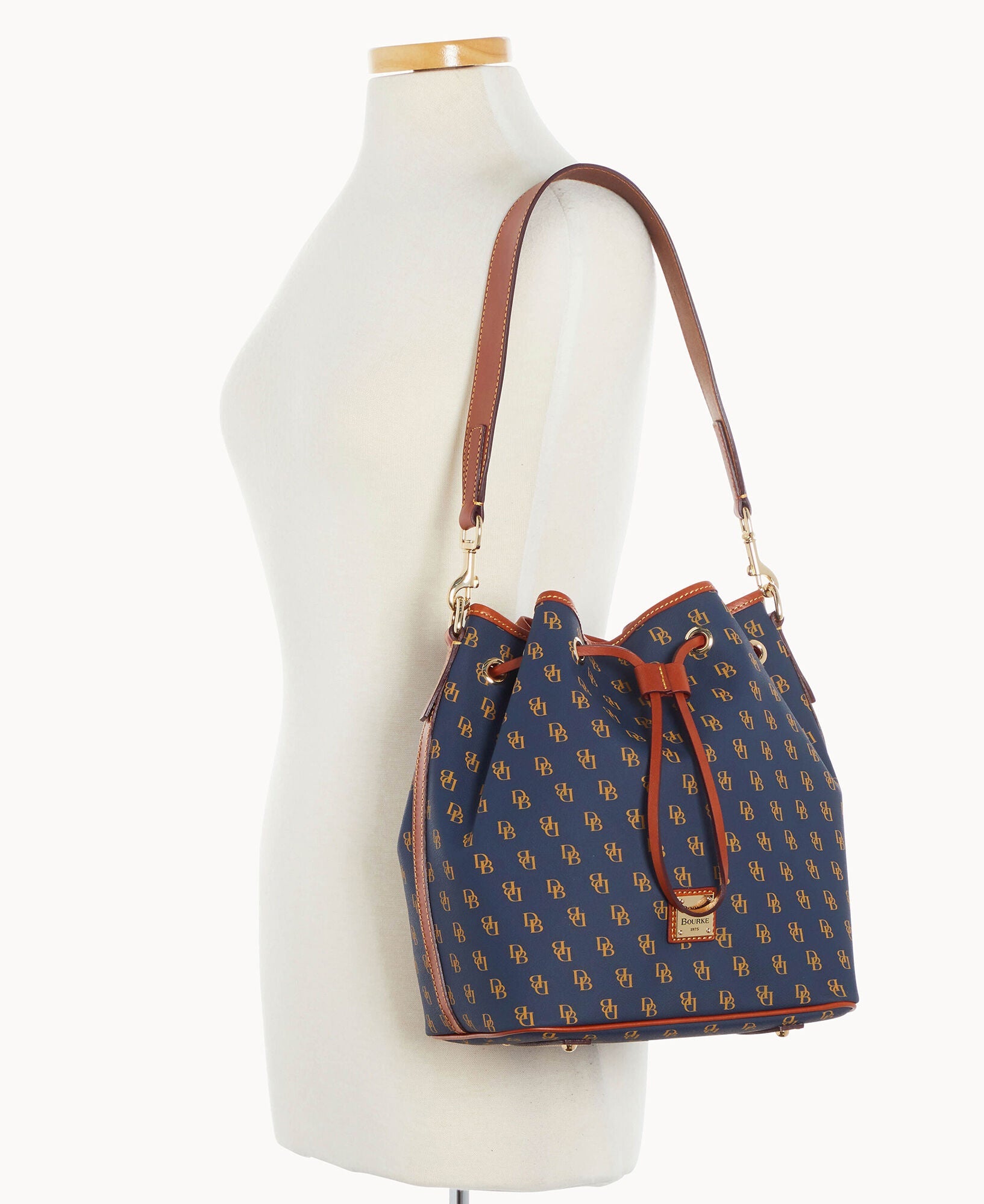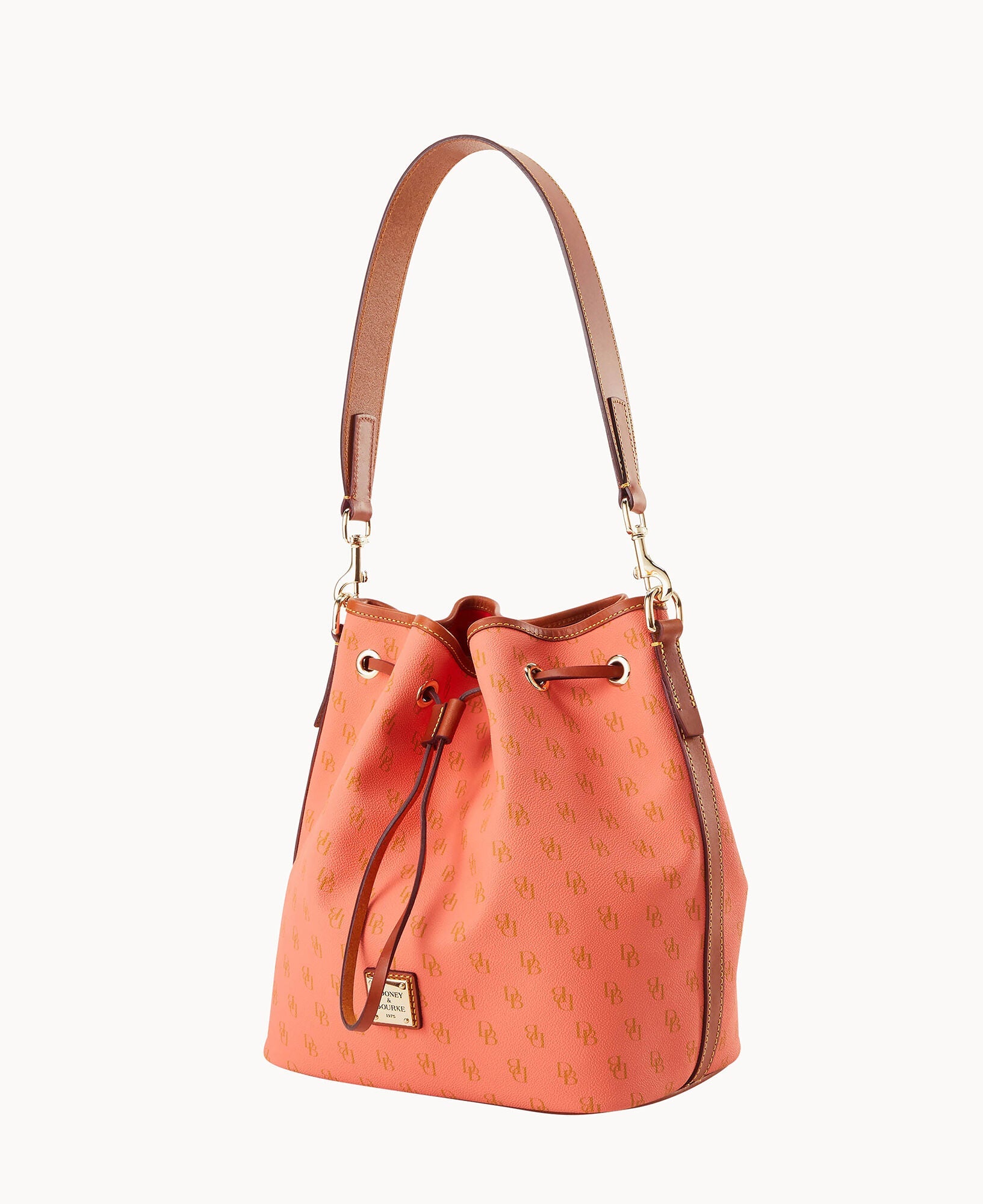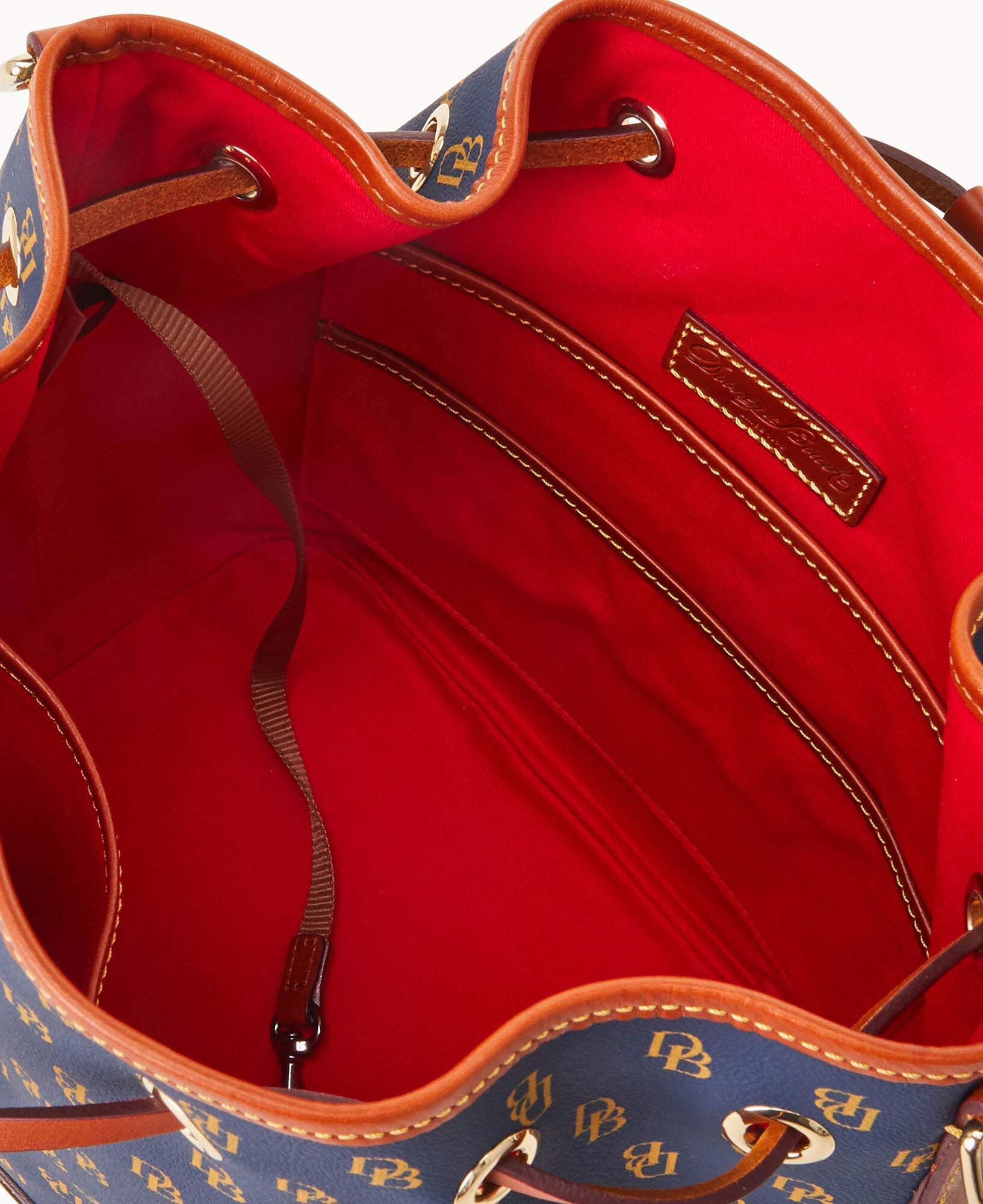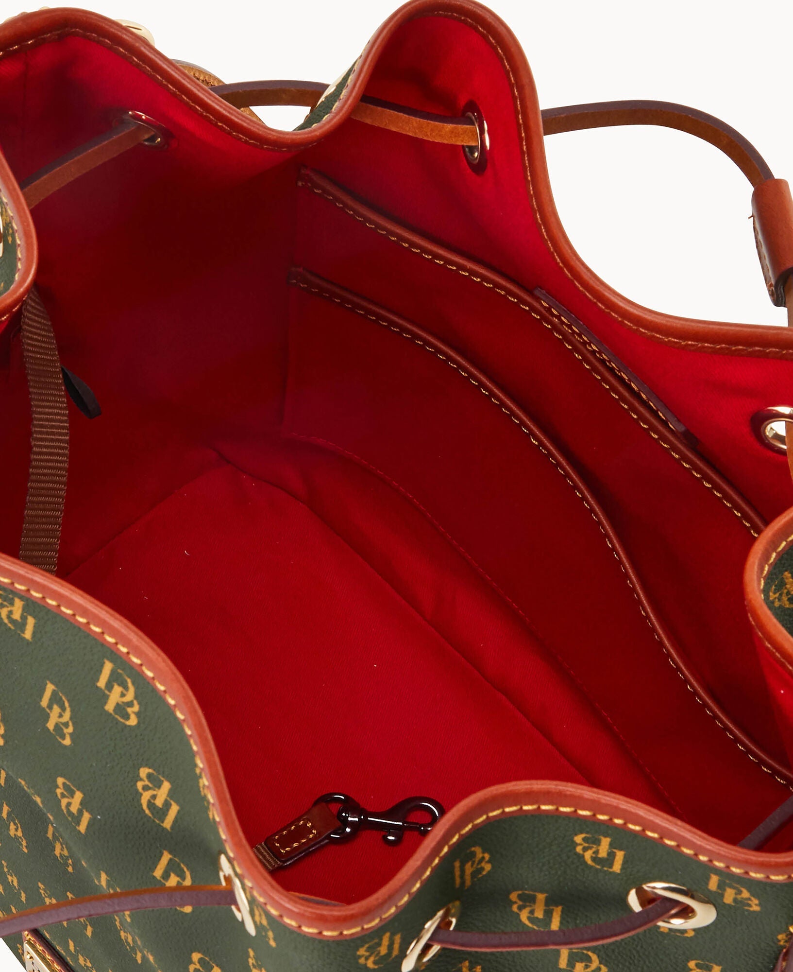 One inside zip pocket. Two inside pockets. Cell phone pocket. Inside key hook. Detachable shoulder strap. Strap drop length 12". Lined. Feet. Drawstring closure.