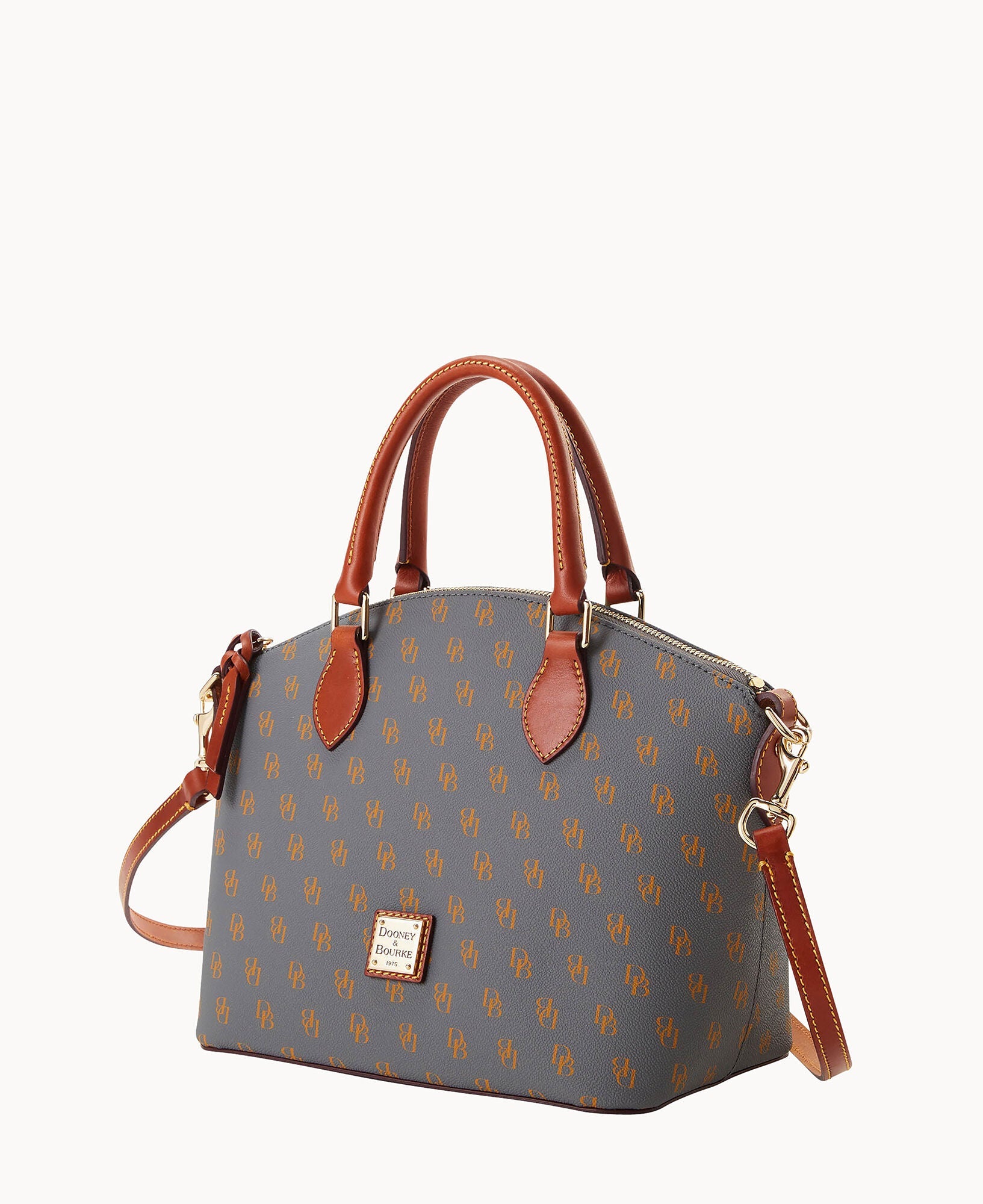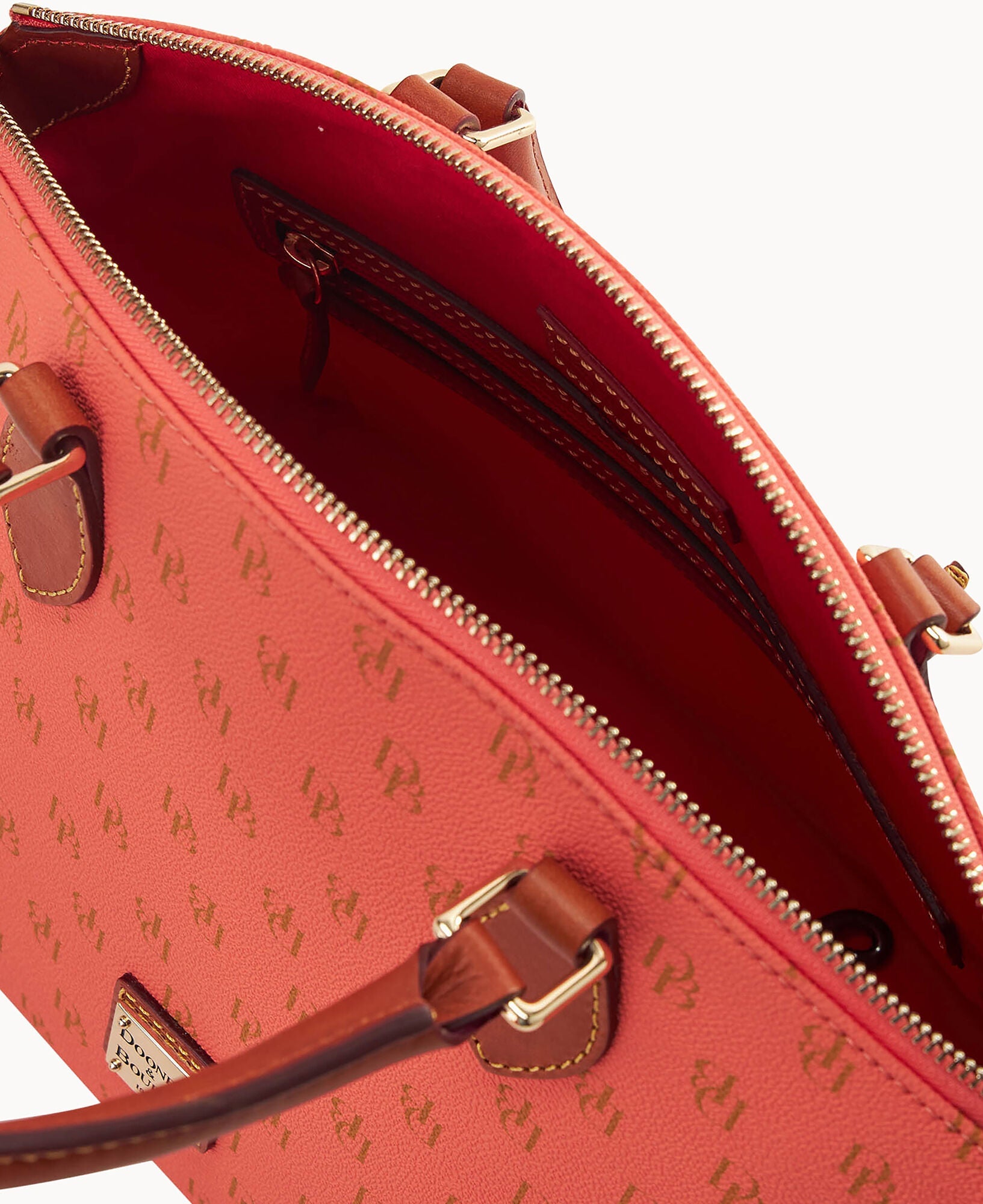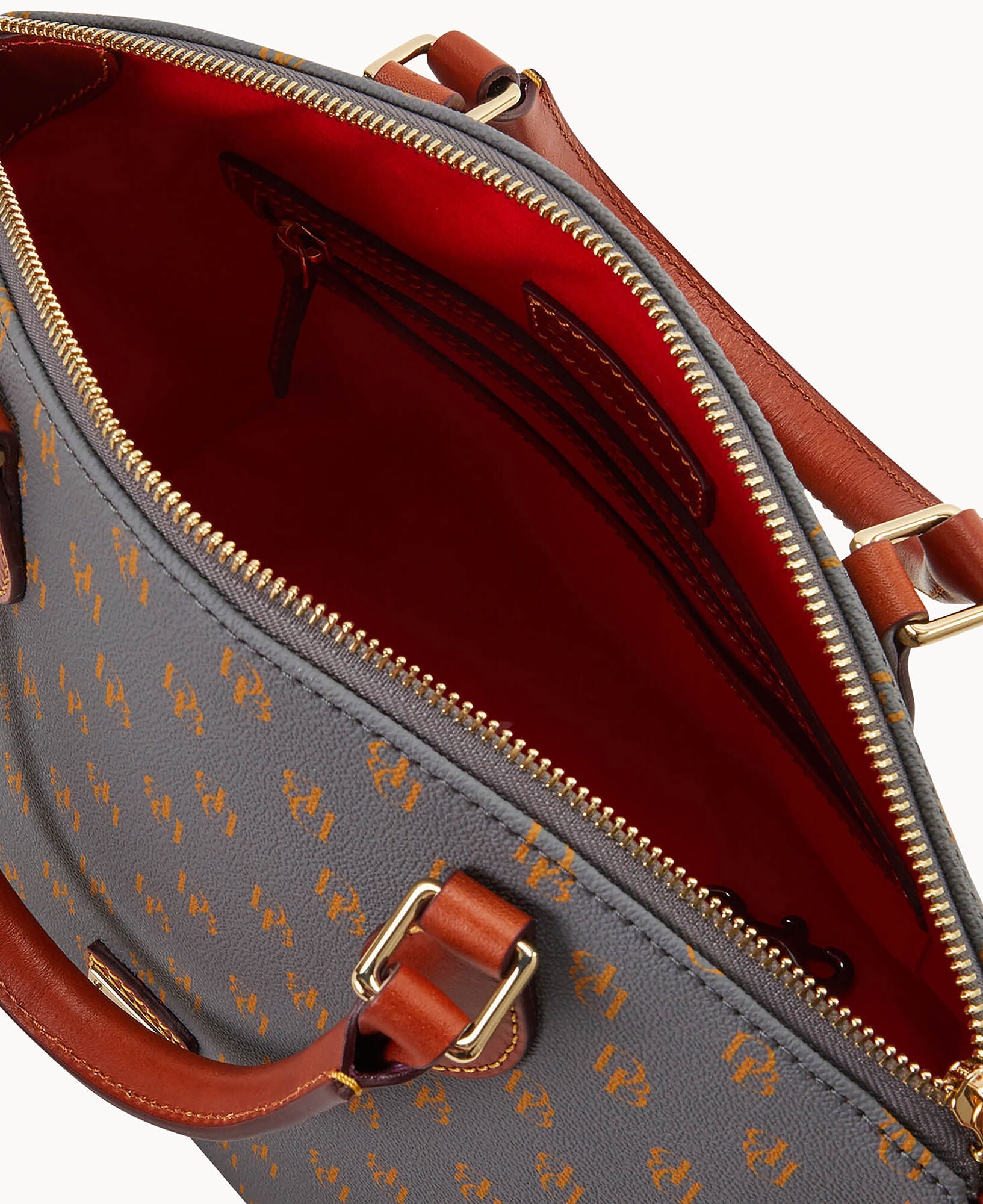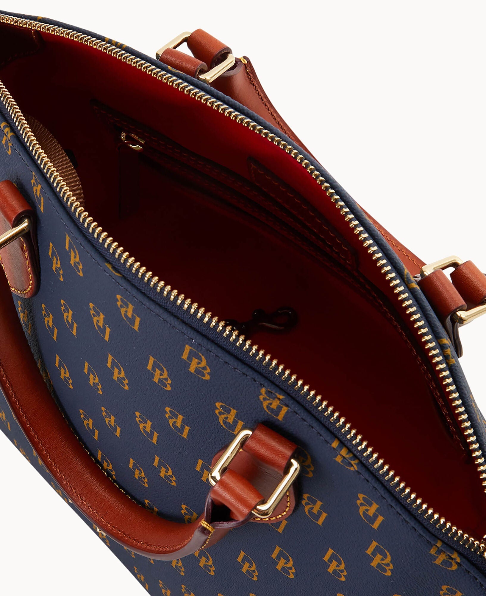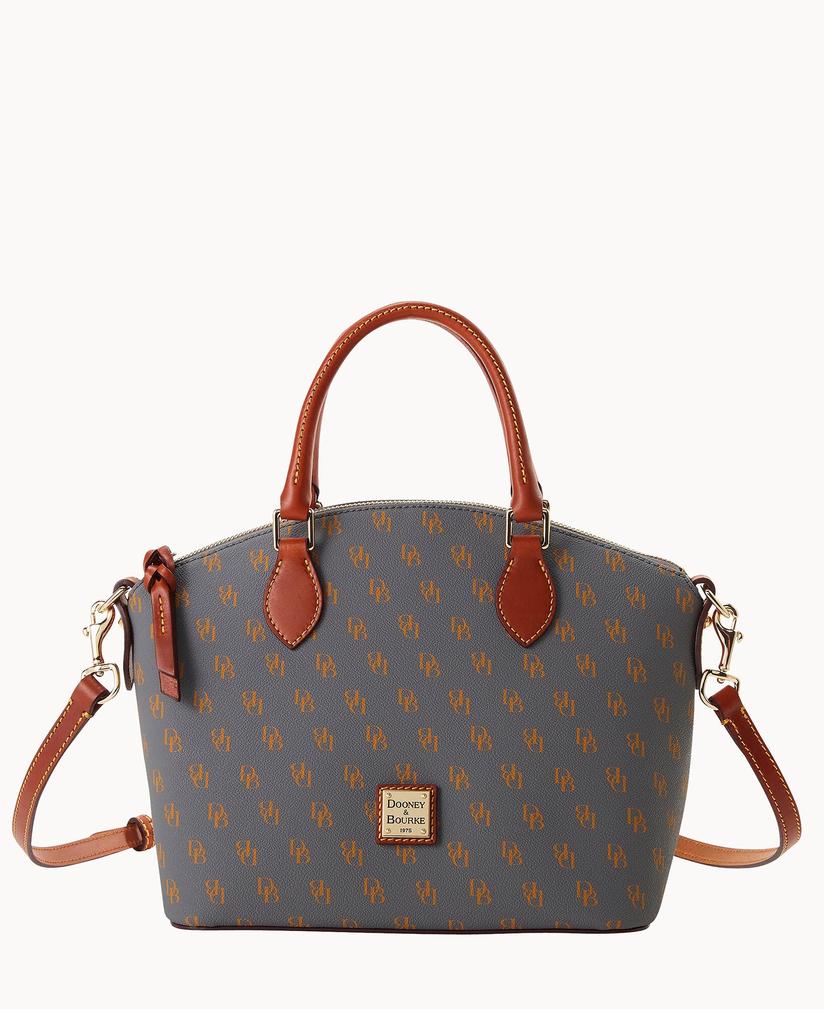 One outside pocket. One inside zip pocket. Two inside pockets. Cell phone pocket. Inside key hook. Handle drop length 4.5". Strap drop length 13". Lined. Feet. Zipper closure.