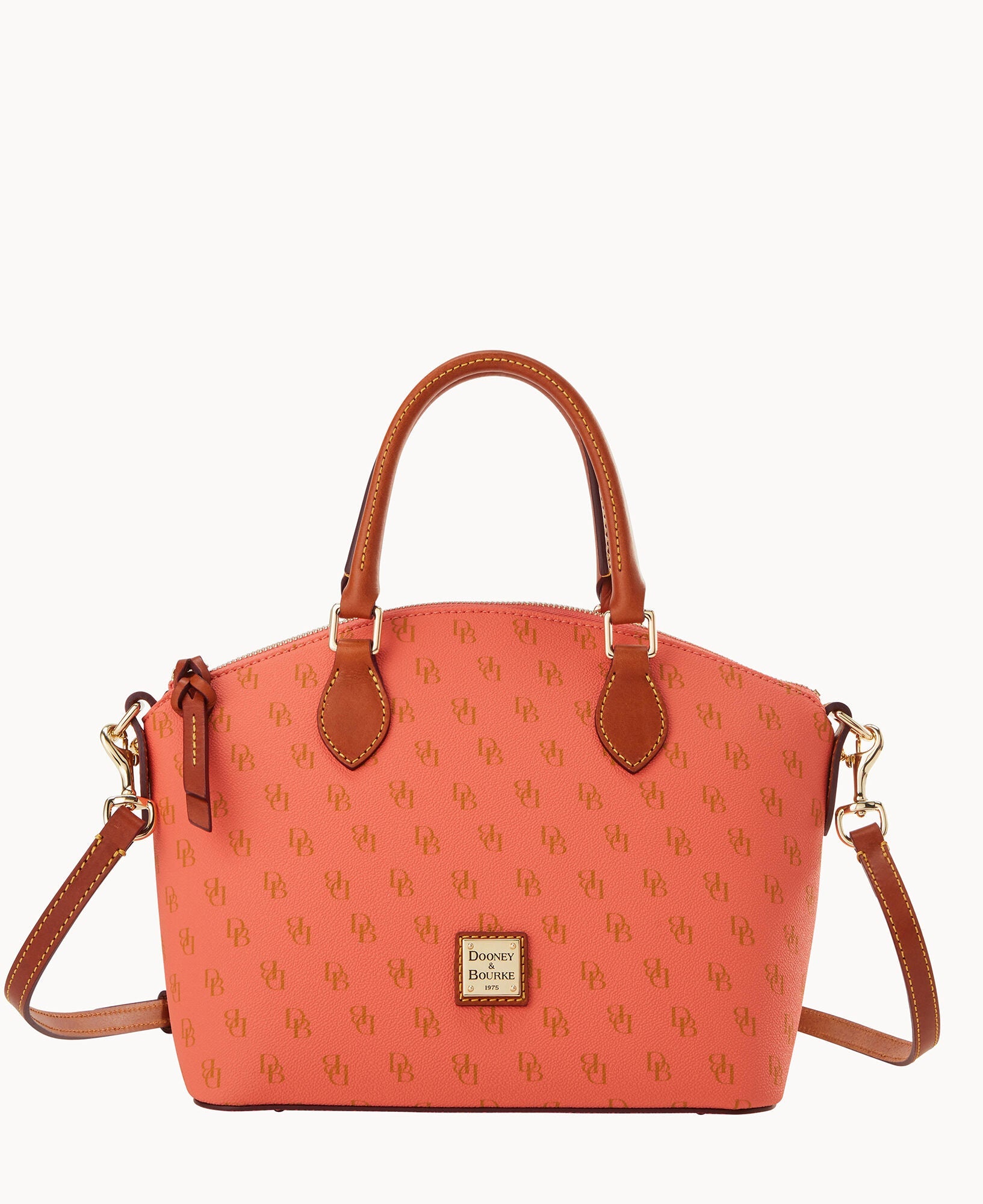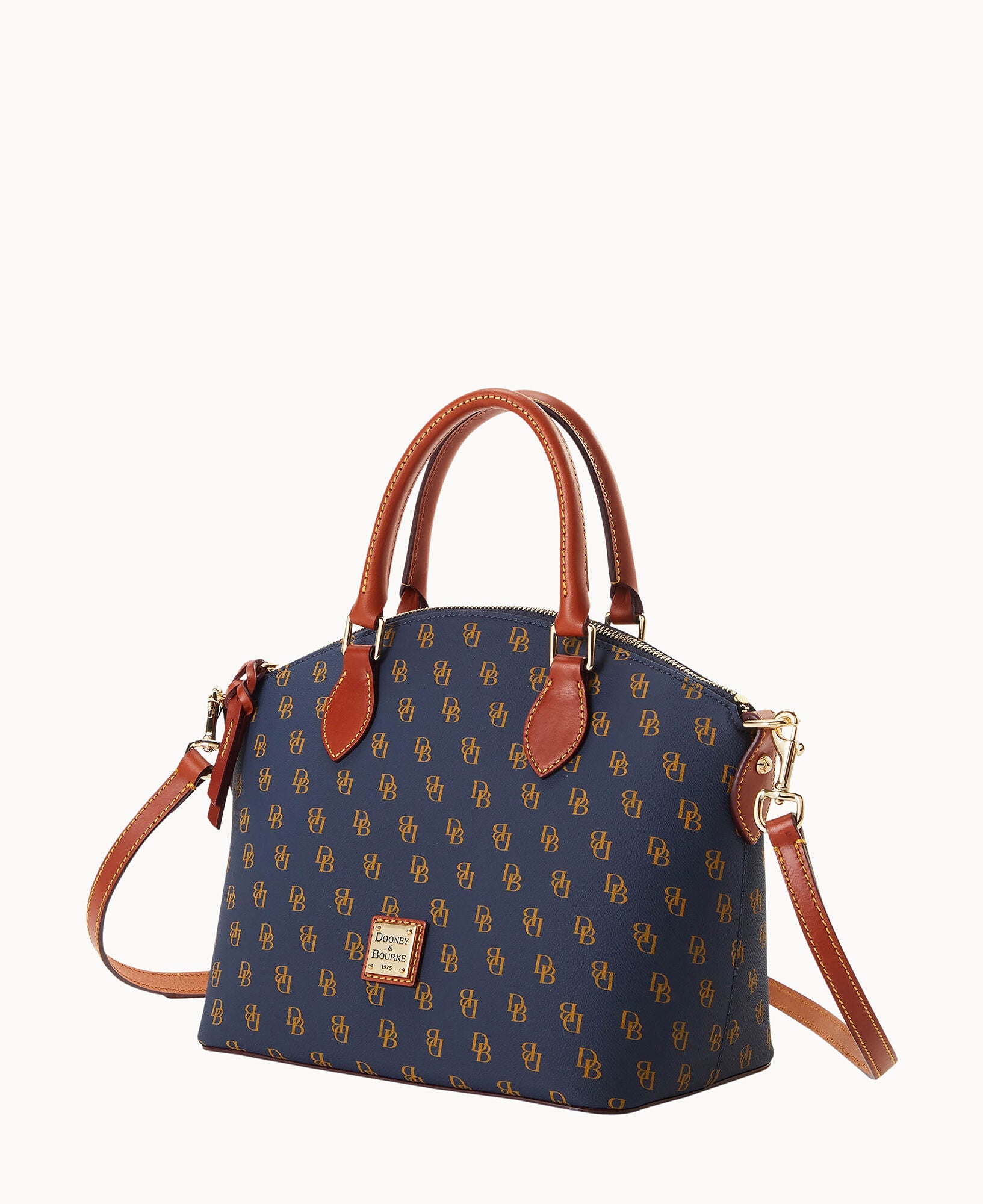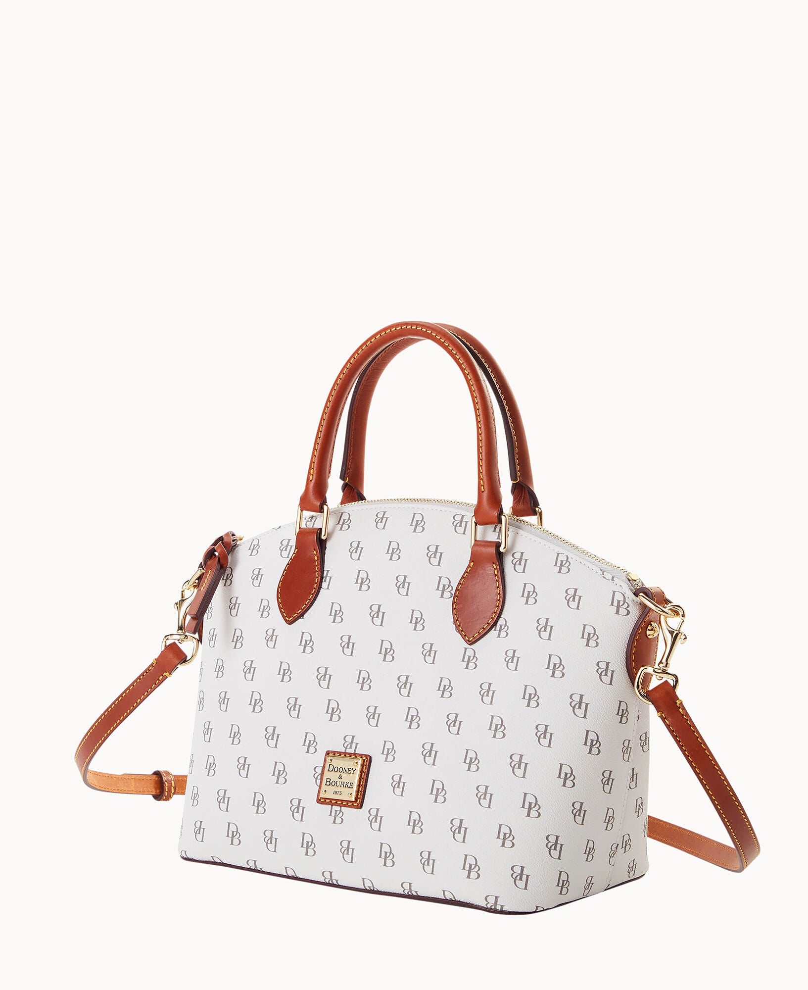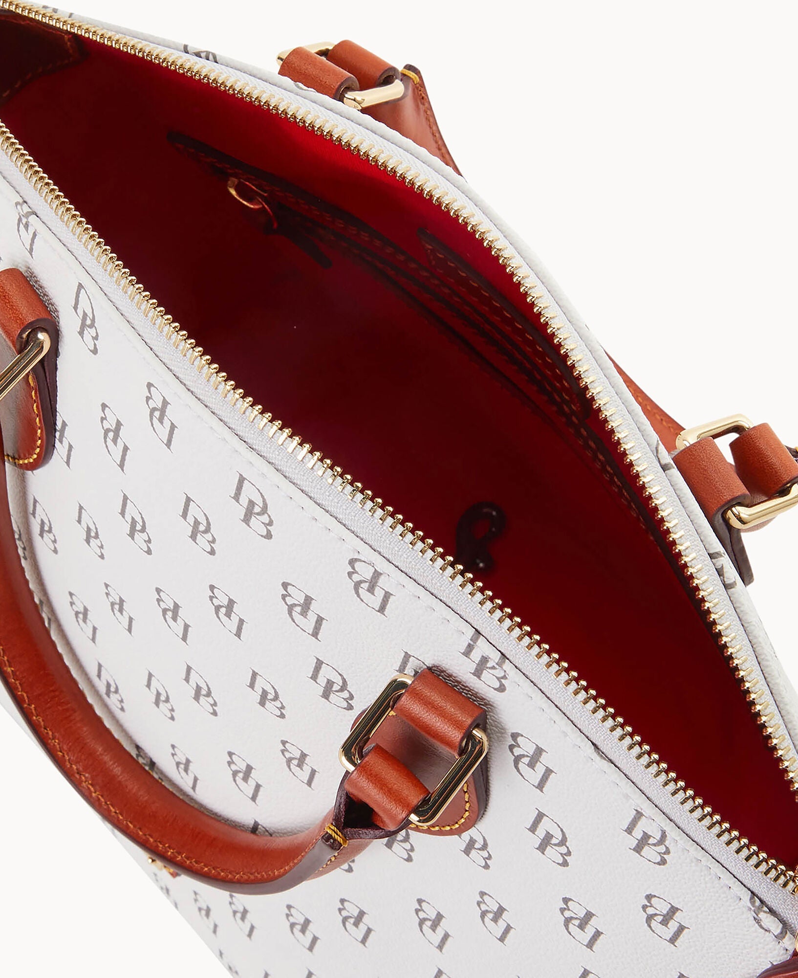 One outside pocket. One inside zip pocket. Two inside pockets. Cell phone pocket. Inside key hook. Handle drop length 4.5". Strap drop length 13". Lined. Feet. Zipper closure.