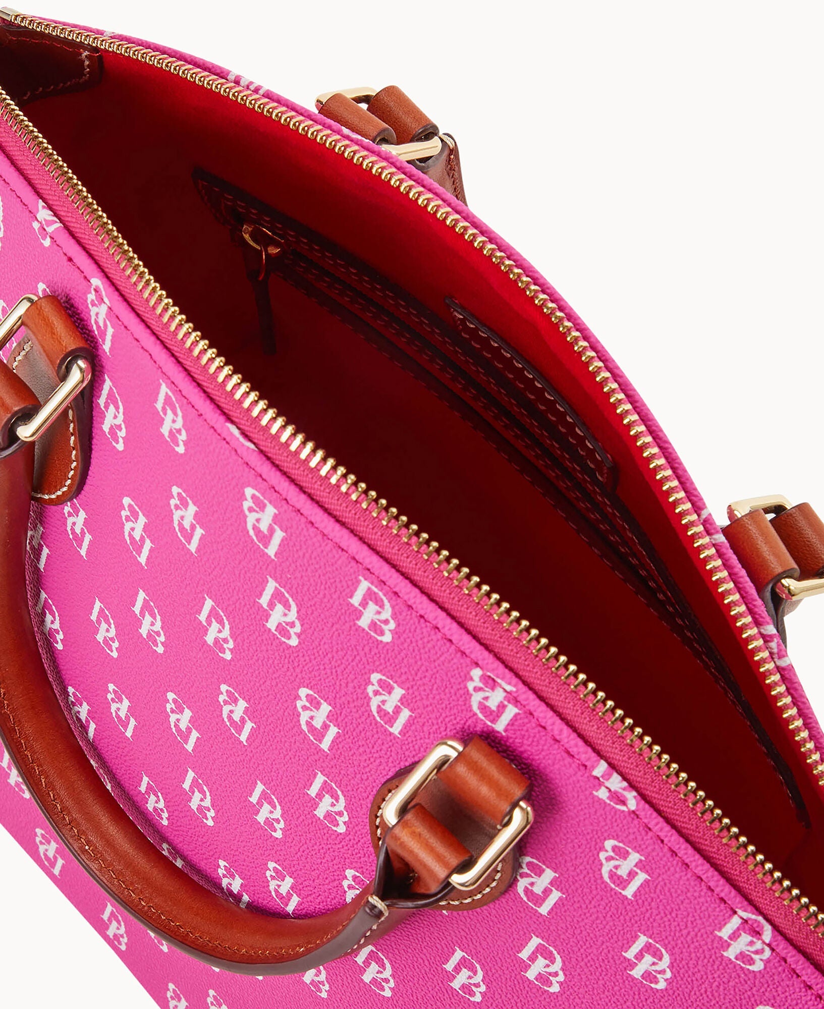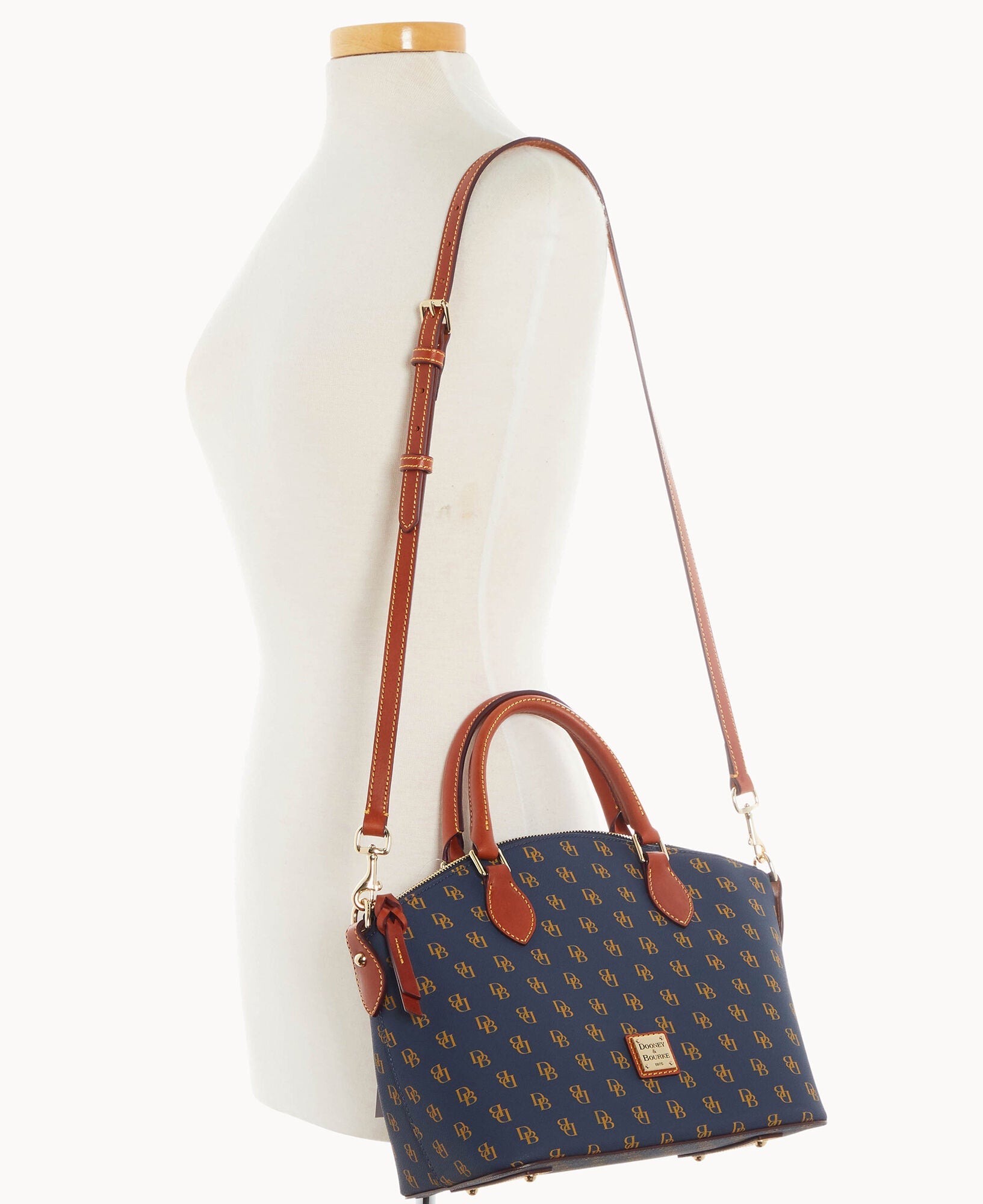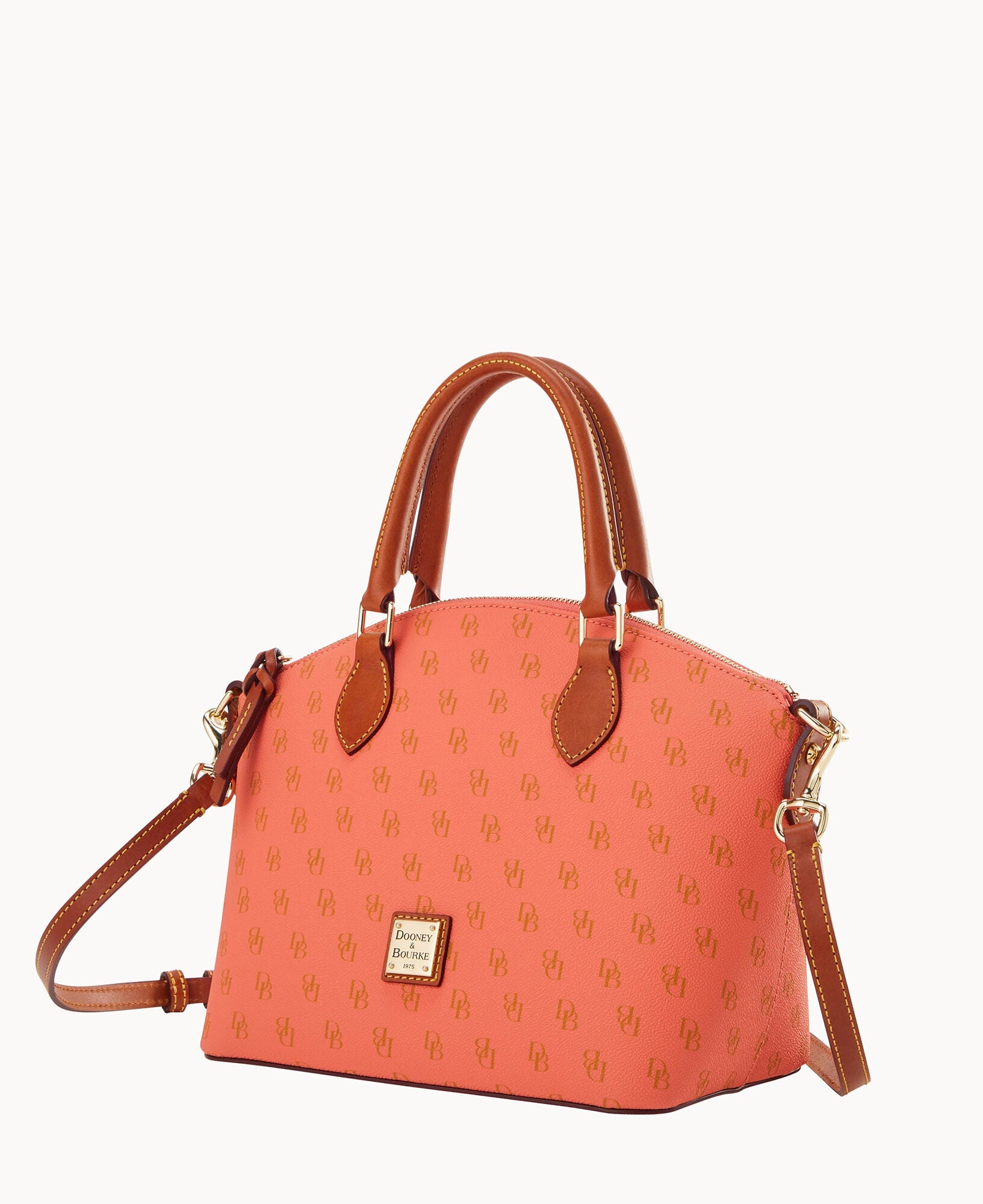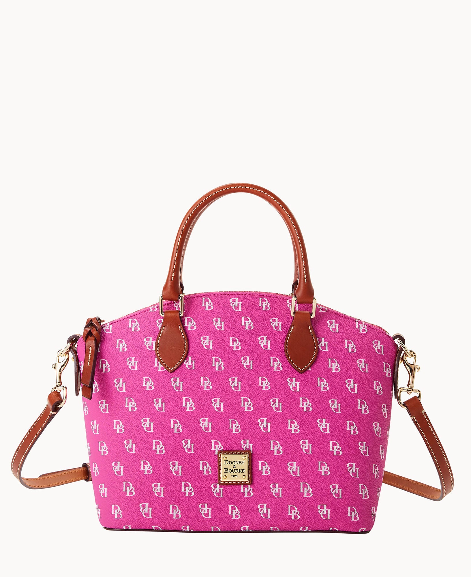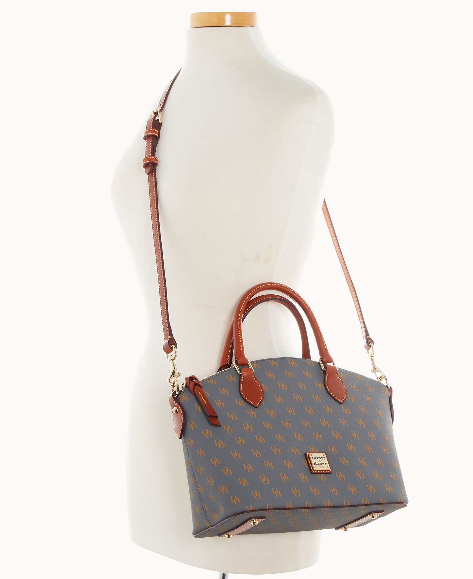 One outside pocket. One inside zip pocket. Two inside pockets. Cell phone pocket. Inside key hook. Handle drop length 4.5". Strap drop length 13". Lined. Feet. Zipper closure.