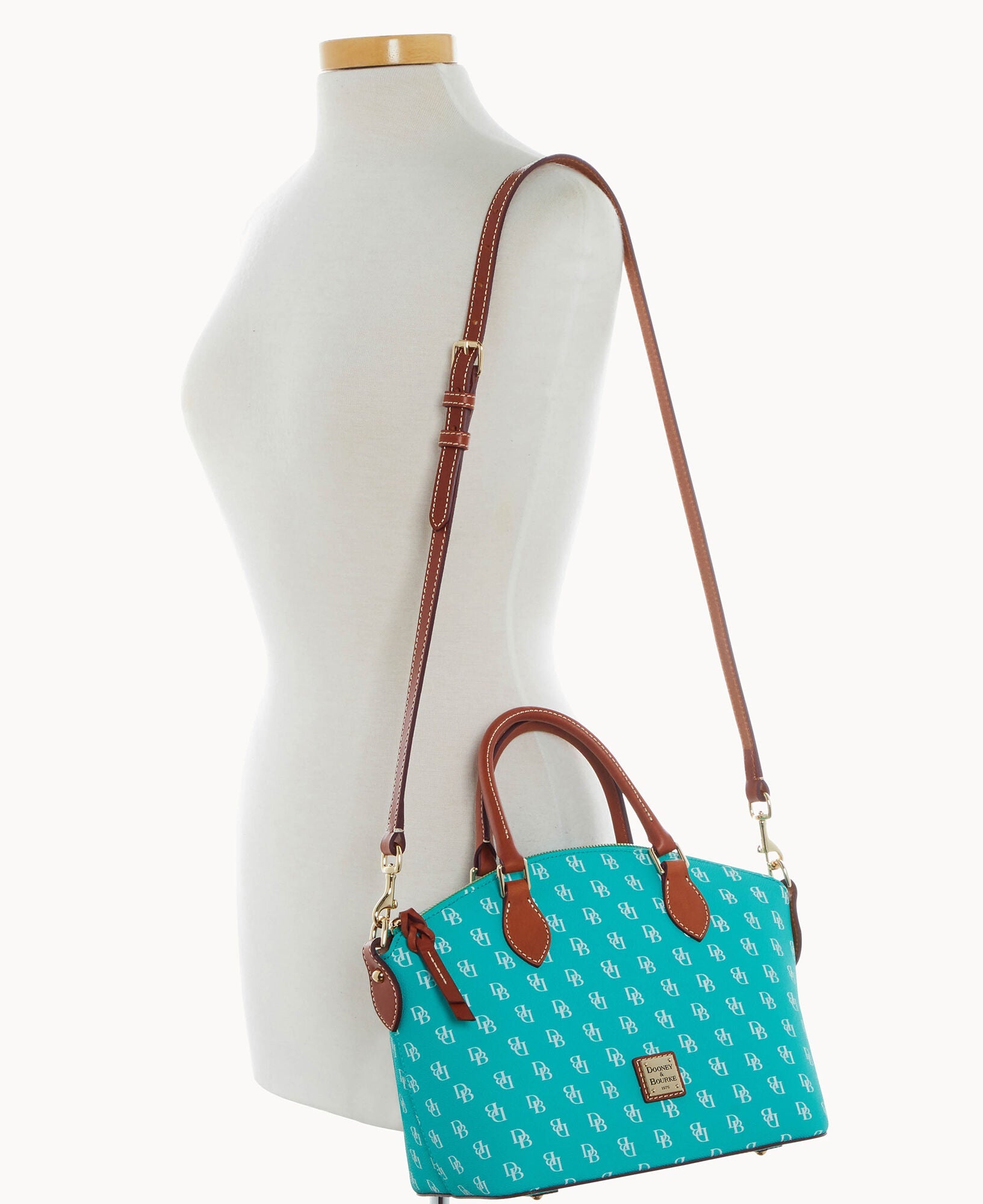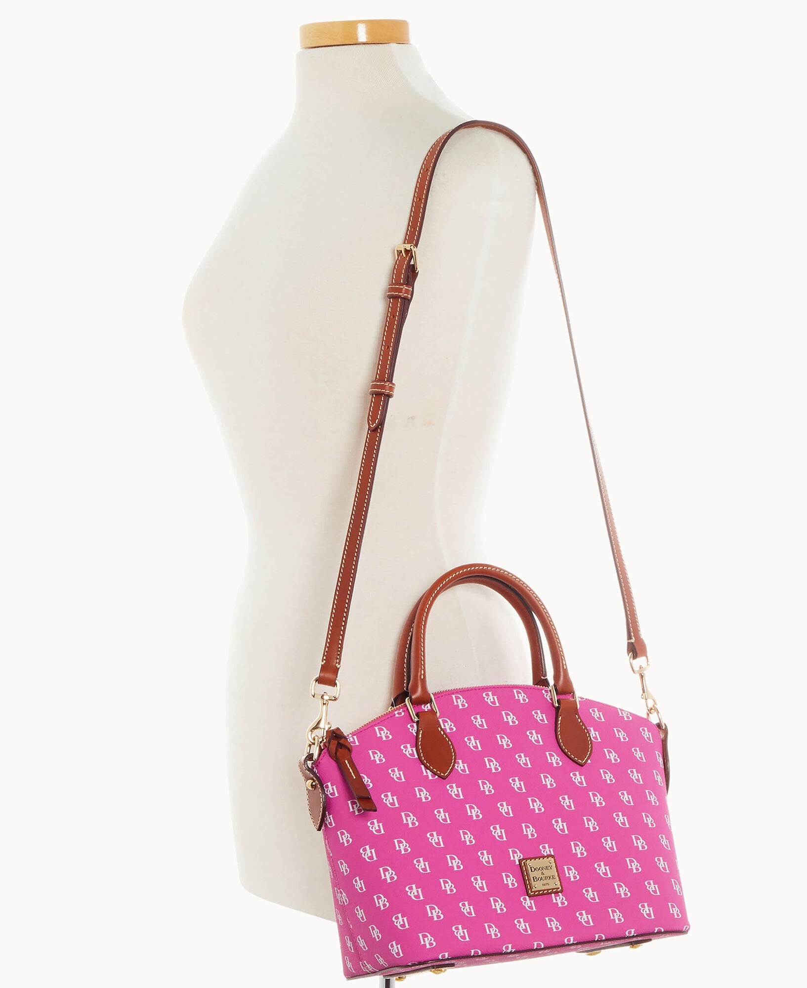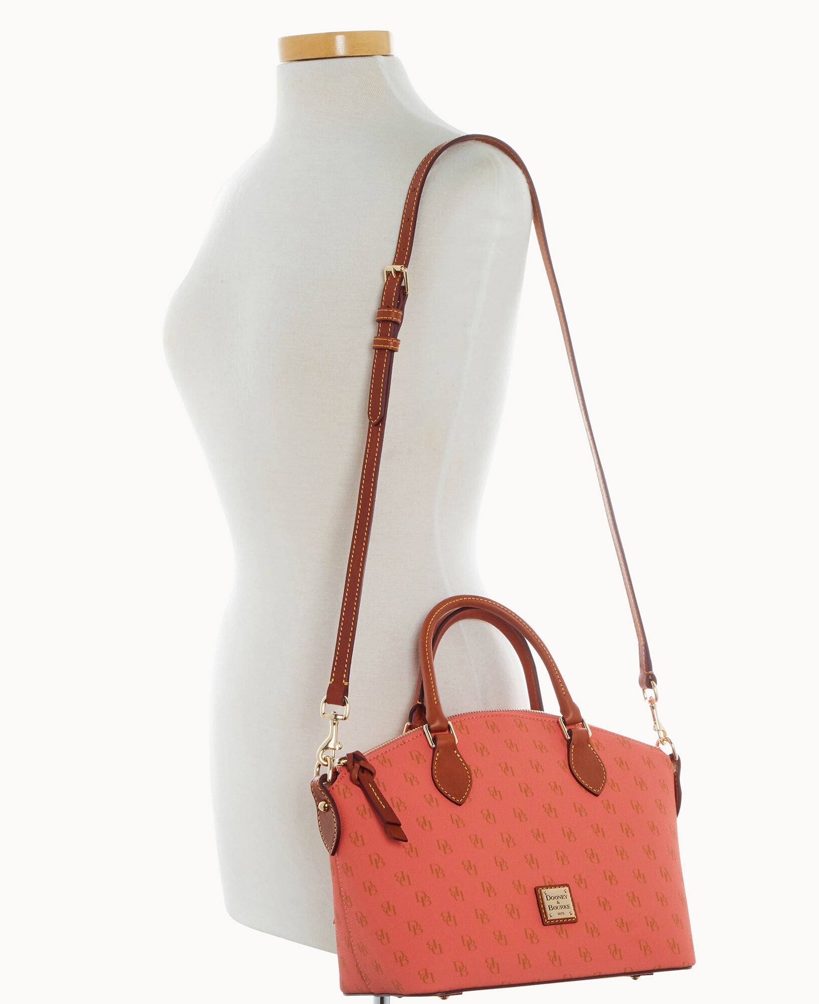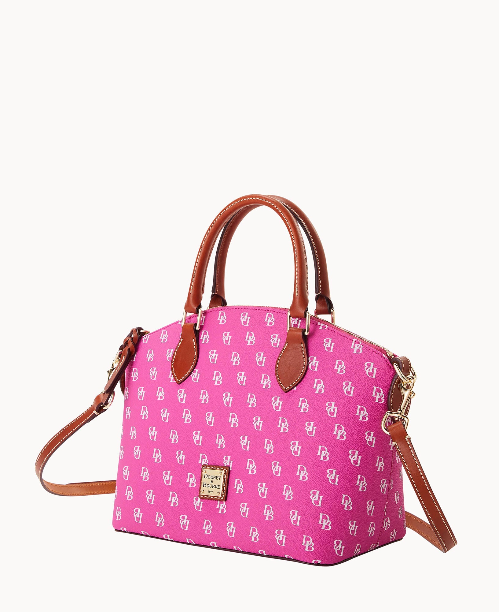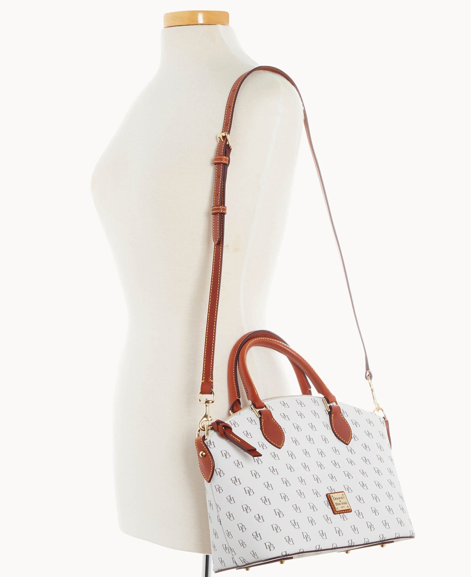 One outside pocket. One inside zip pocket. Two inside pockets. Cell phone pocket. Inside key hook. Handle drop length 4.5". Strap drop length 13". Lined. Feet. Zipper closure.