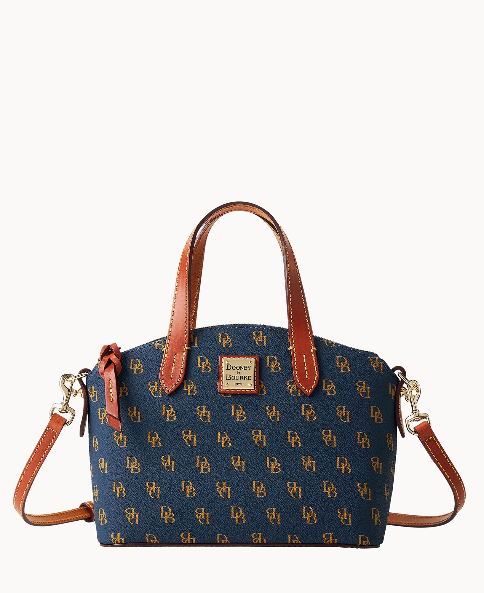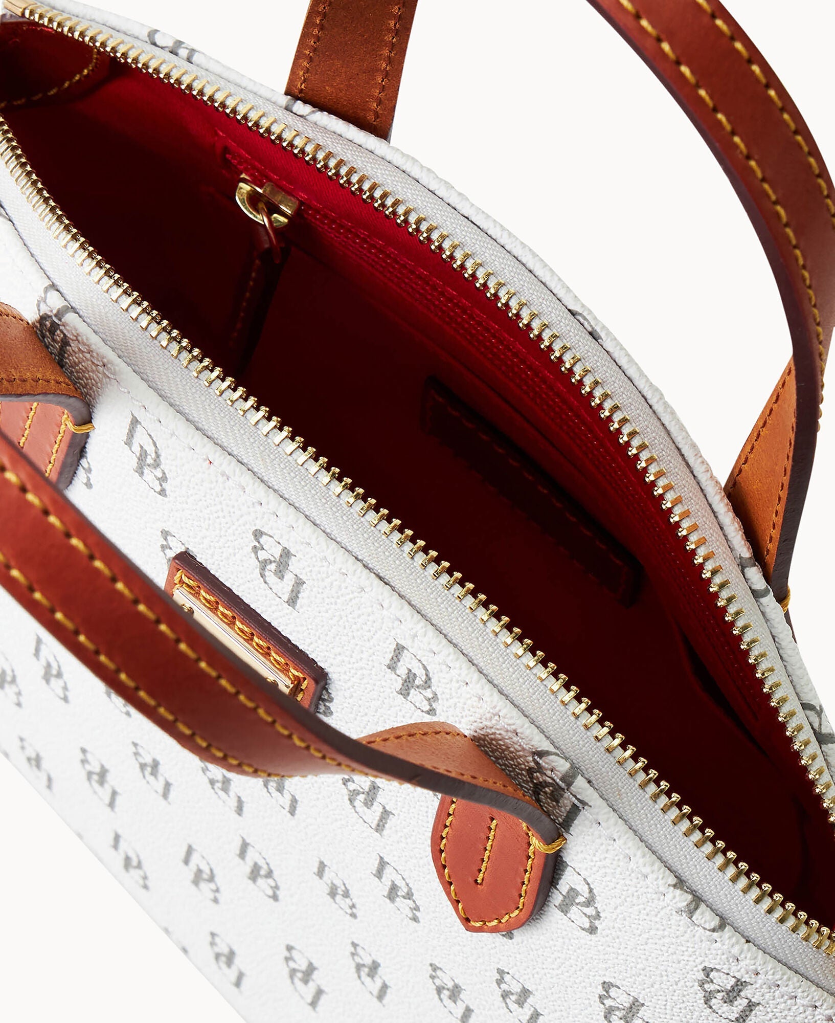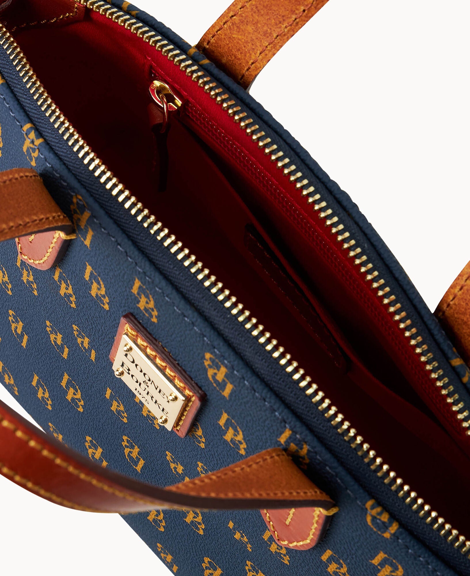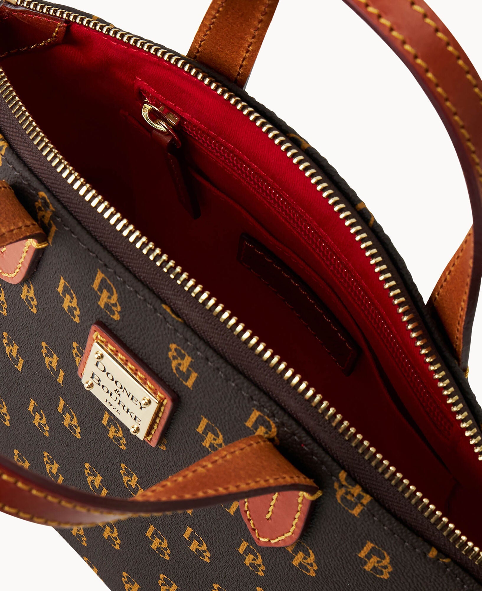 One inside zip pocket. Two inside pockets. Cell phone pocket. Handle drop length 3.5". Strap drop length 25". Lined. Zipper closure.