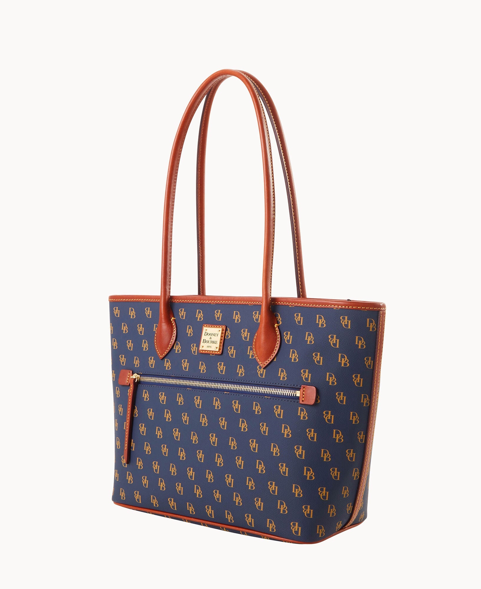 One outside zip pocket. Two inside slip pockets. One insie phone pocket. One inside zip pocket. Inside key hook. Strap drop length 10". Feet. Lined. Zipper closure.