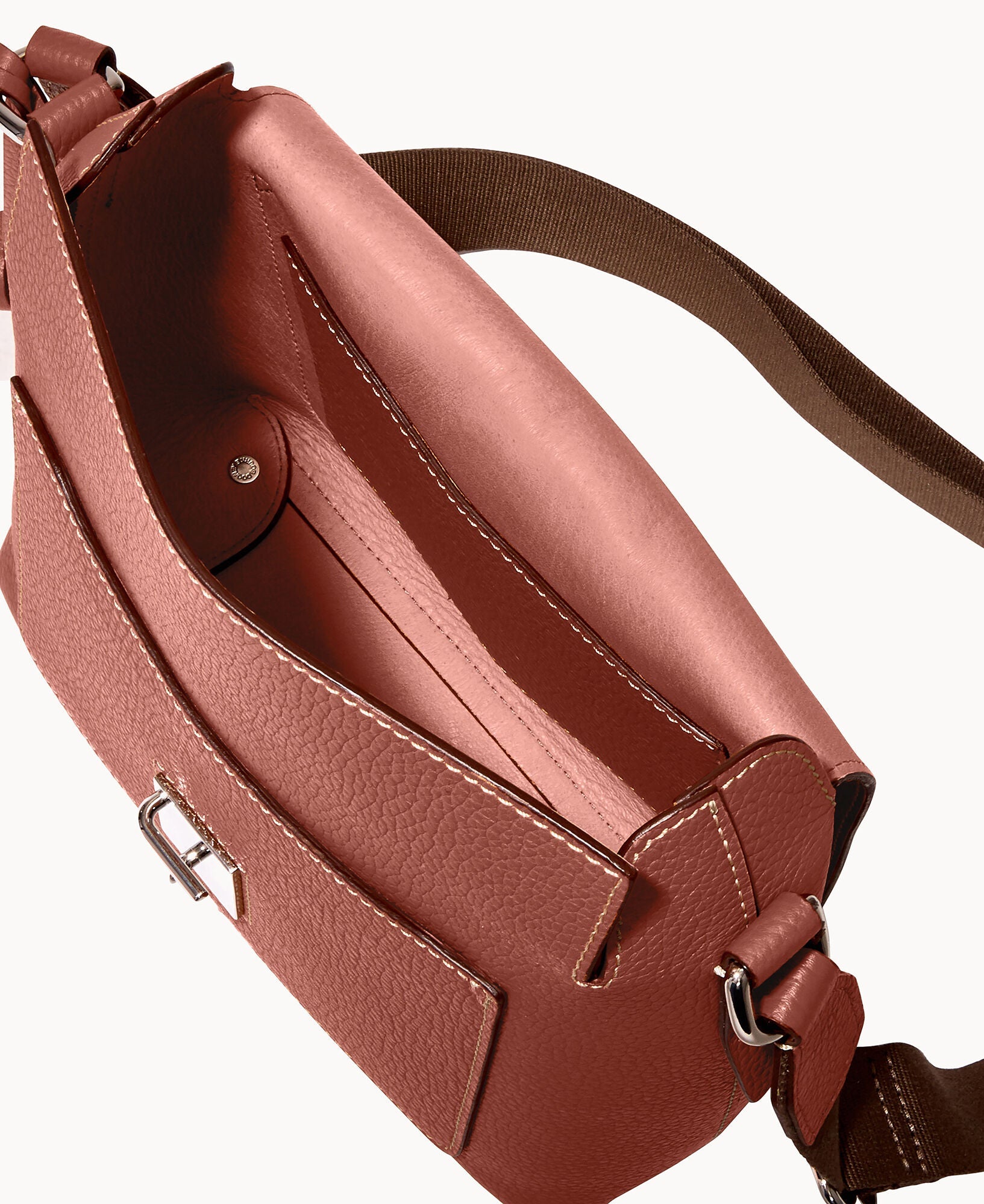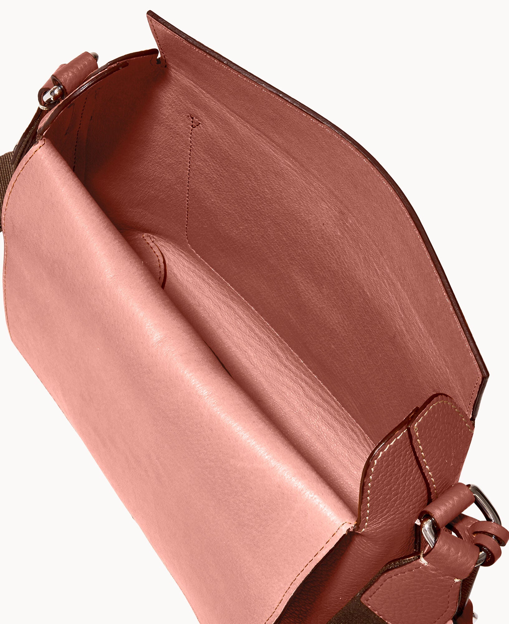 Two outside pockets. One inside pocket. Adjustable strap. Lined. Feet. Patented tongue and loop closure.