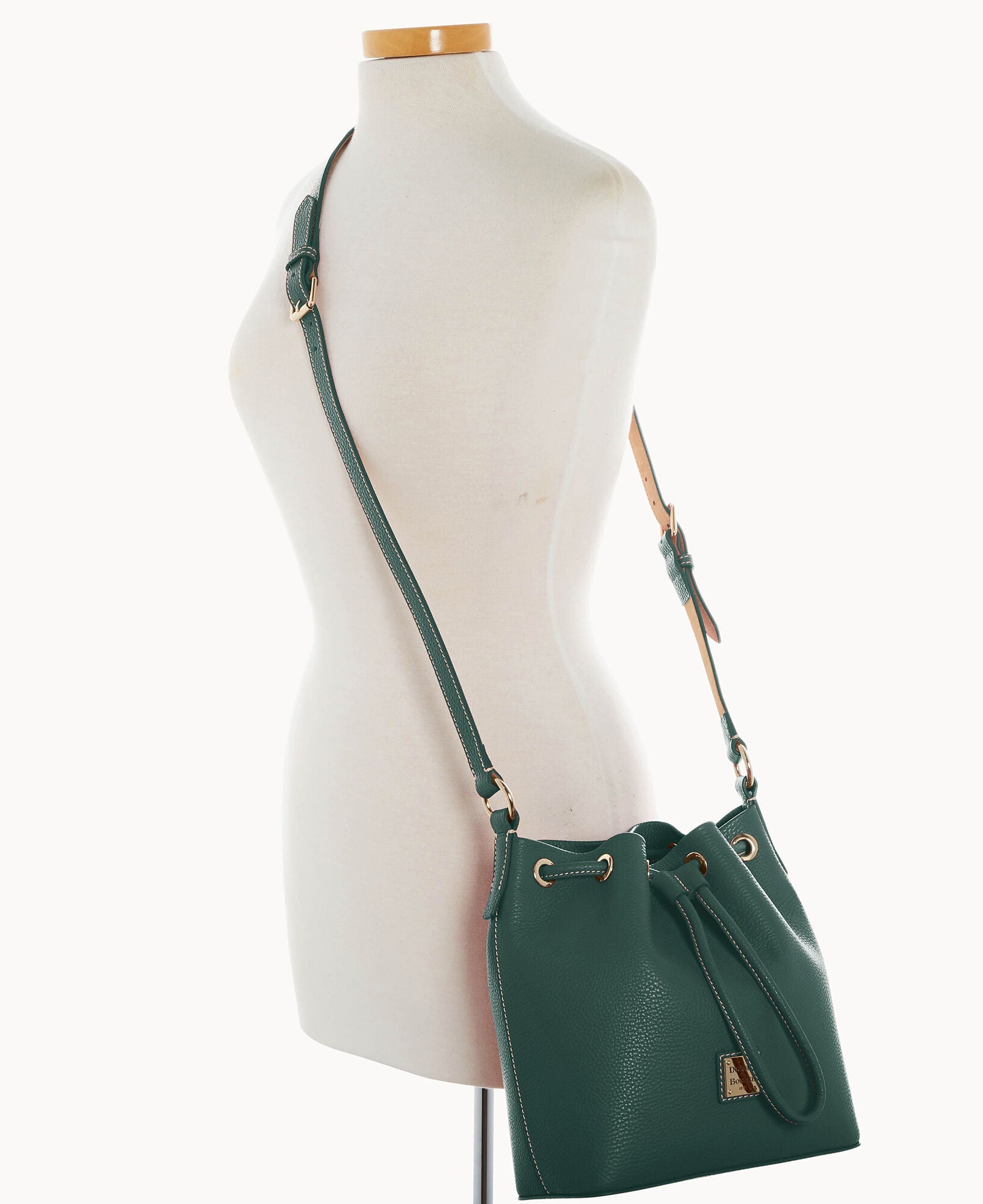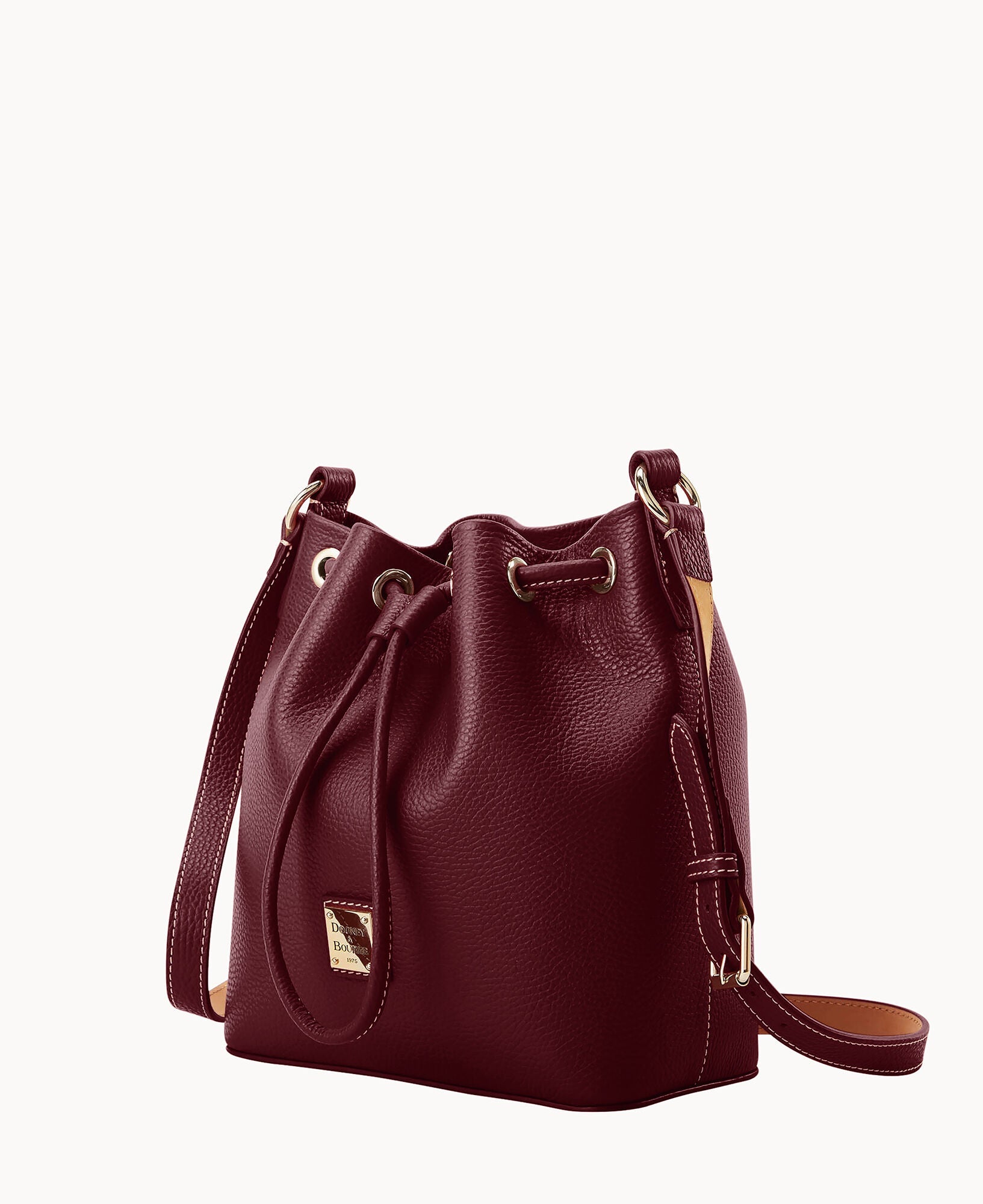 One inside pocket. One inside zip pocket. Inside key hook. Strap drop length 24.5". Drawstring closure. Lined.