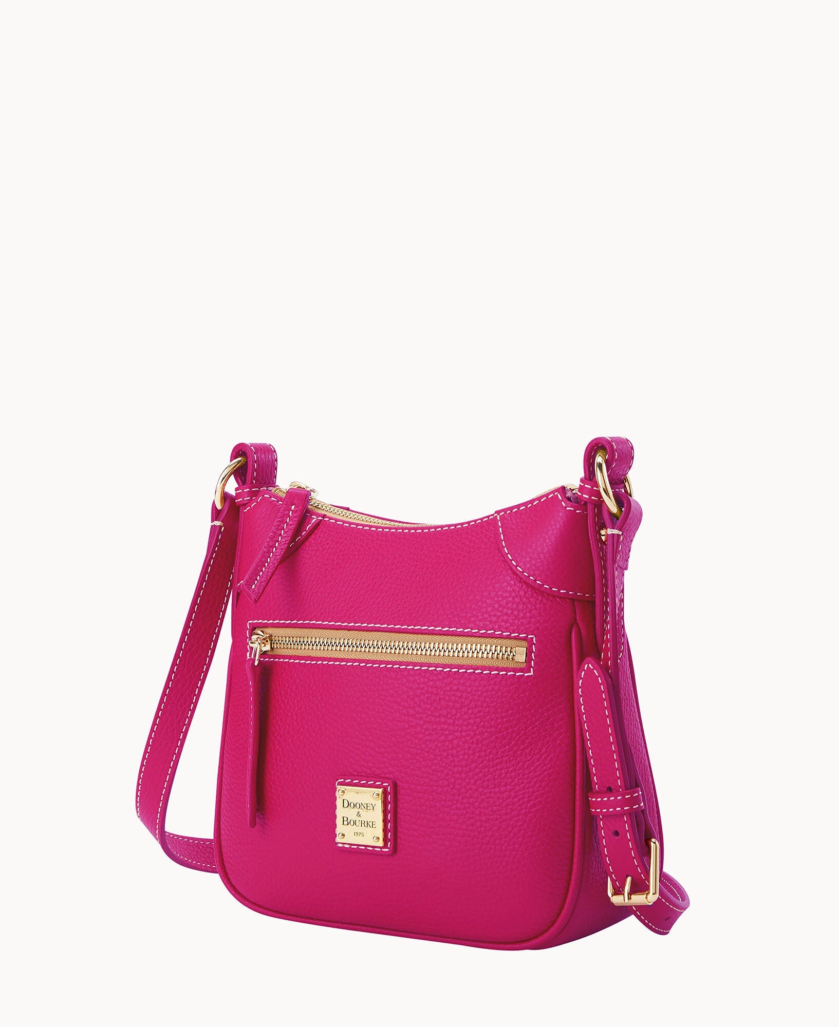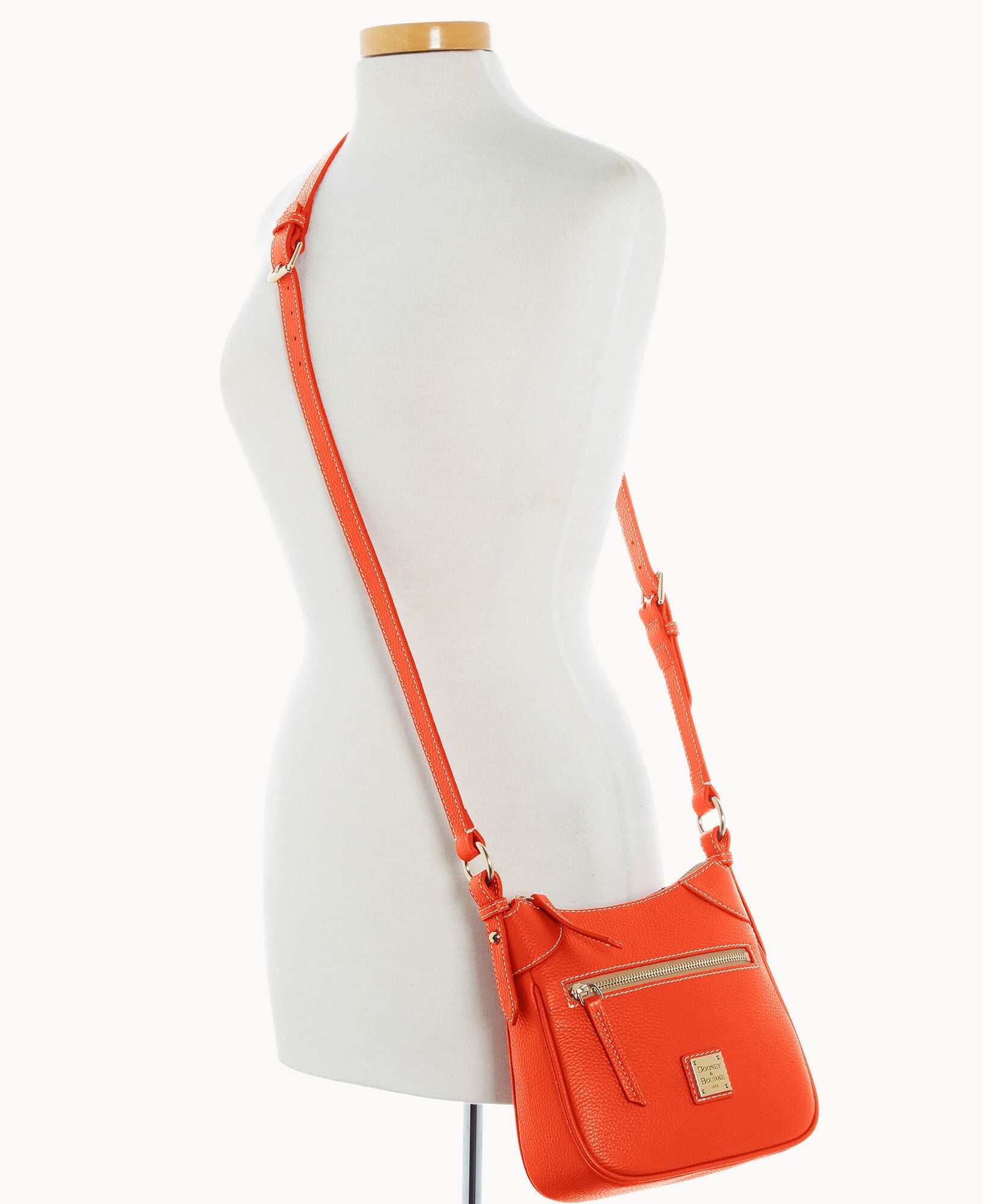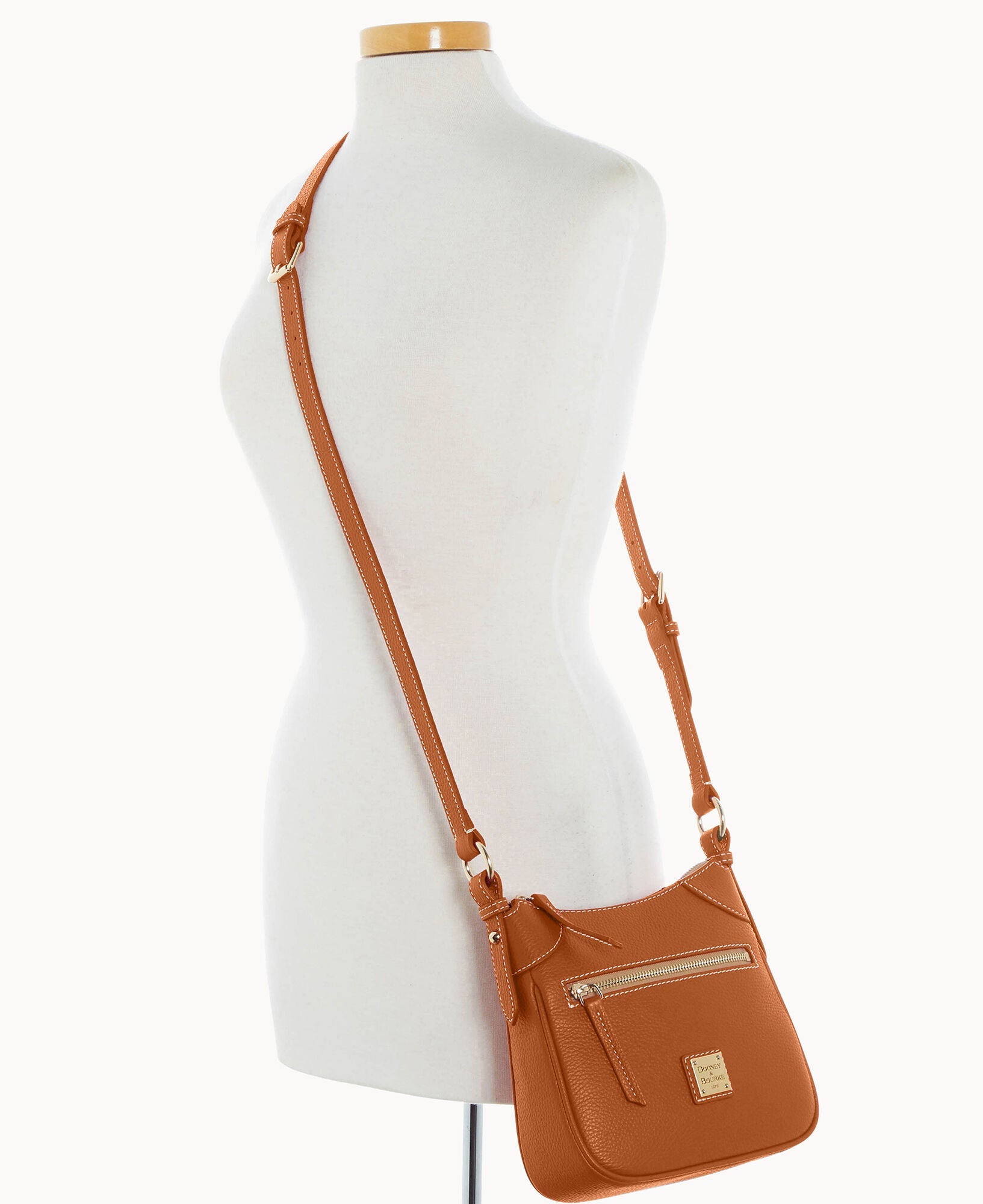 One outside zipper pocket. One inside pocket. One inside zipper pocket. Inside key hook. Lined. Zipper closure. Adjustable strap. Strap drop length 26".