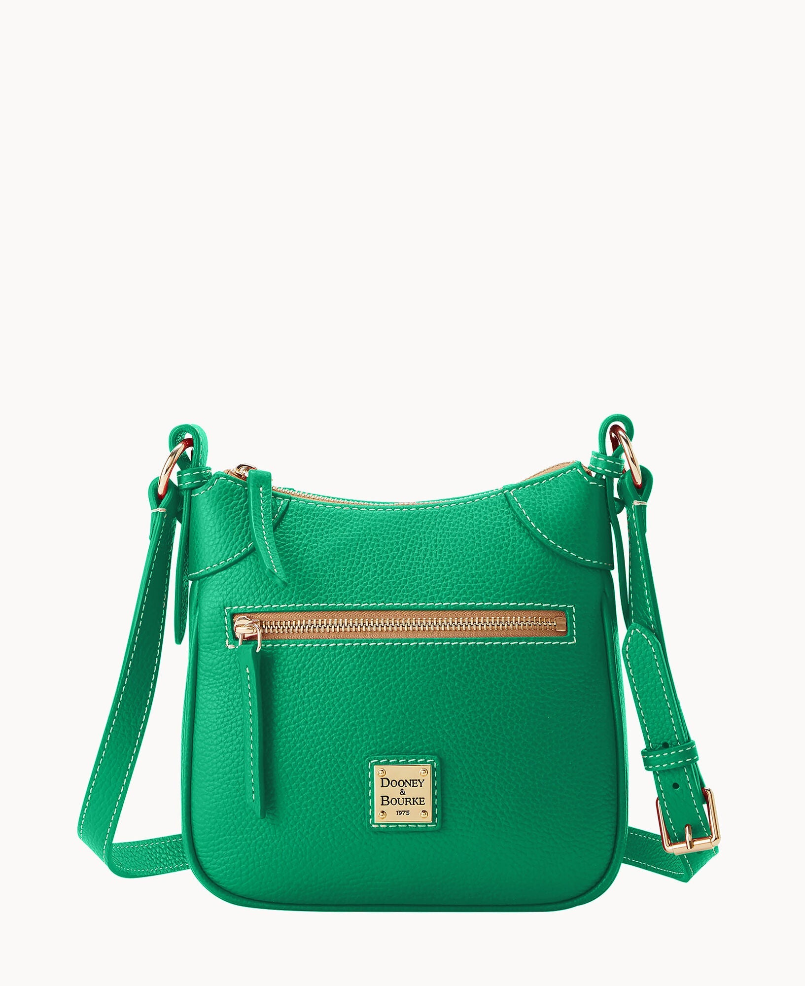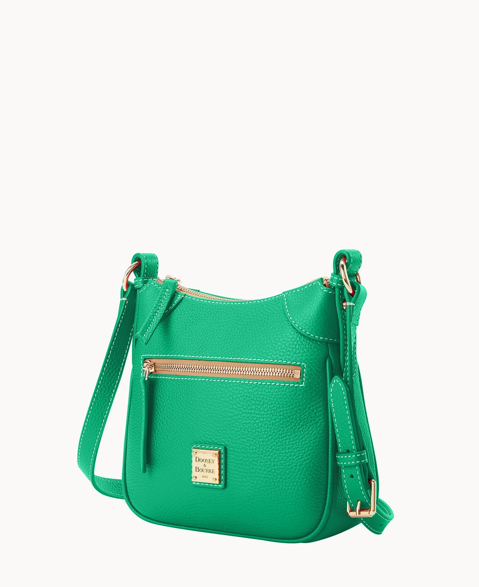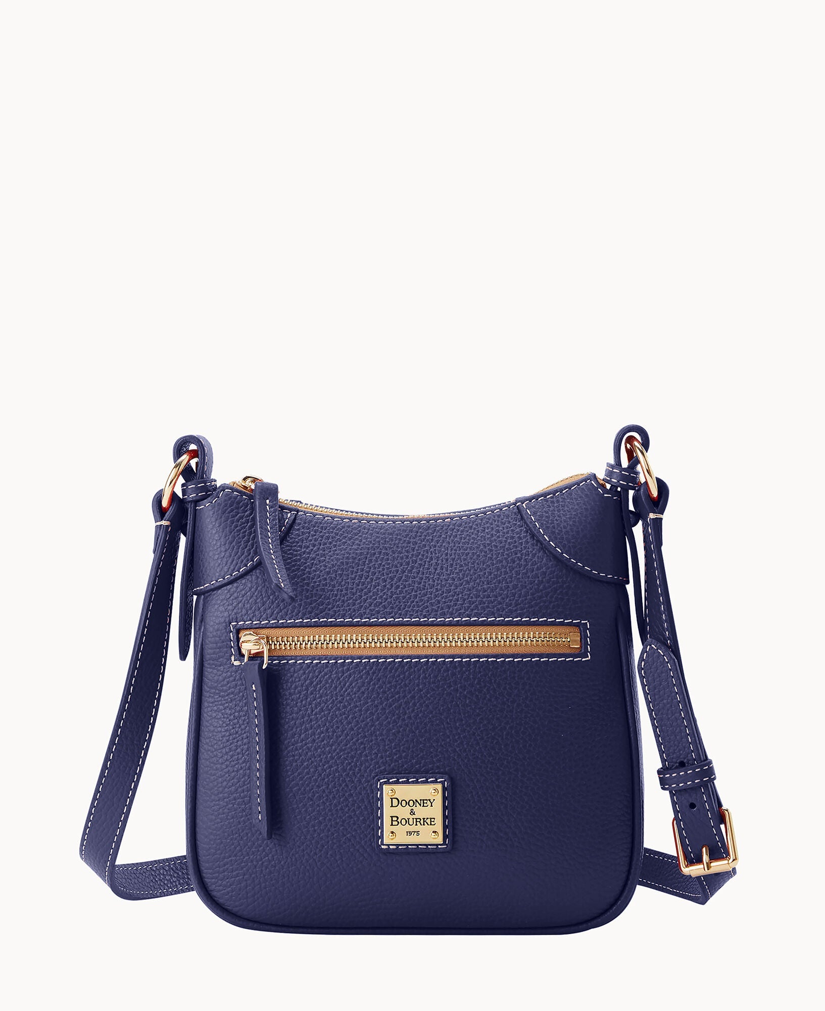 One outside zipper pocket. One inside pocket. One inside zipper pocket. Inside key hook. Lined. Zipper closure. Adjustable strap. Strap drop length 26".