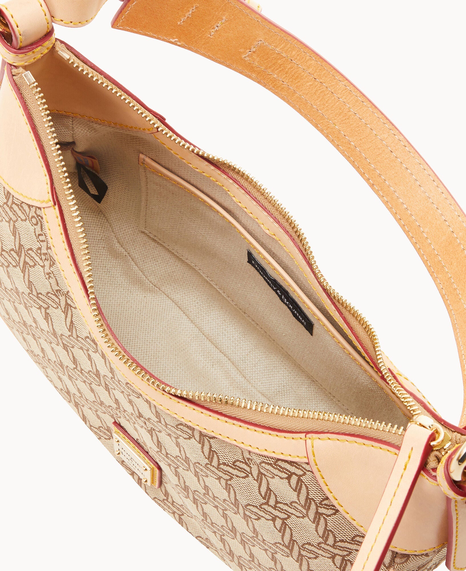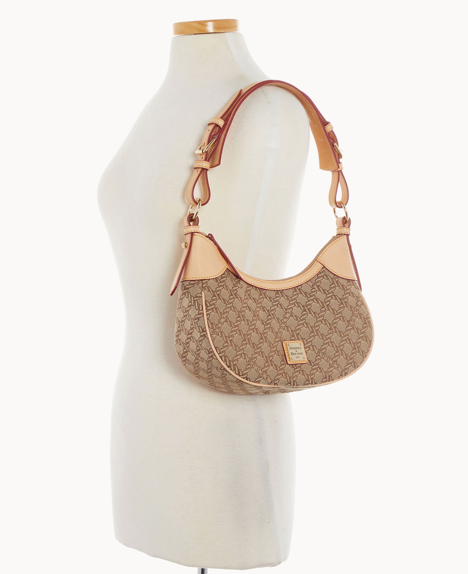 One outside zip pocket. One inside zip pocket. Two inside pockets. Inside key hook. Handle drop length 12". Lined. Zipper closure.