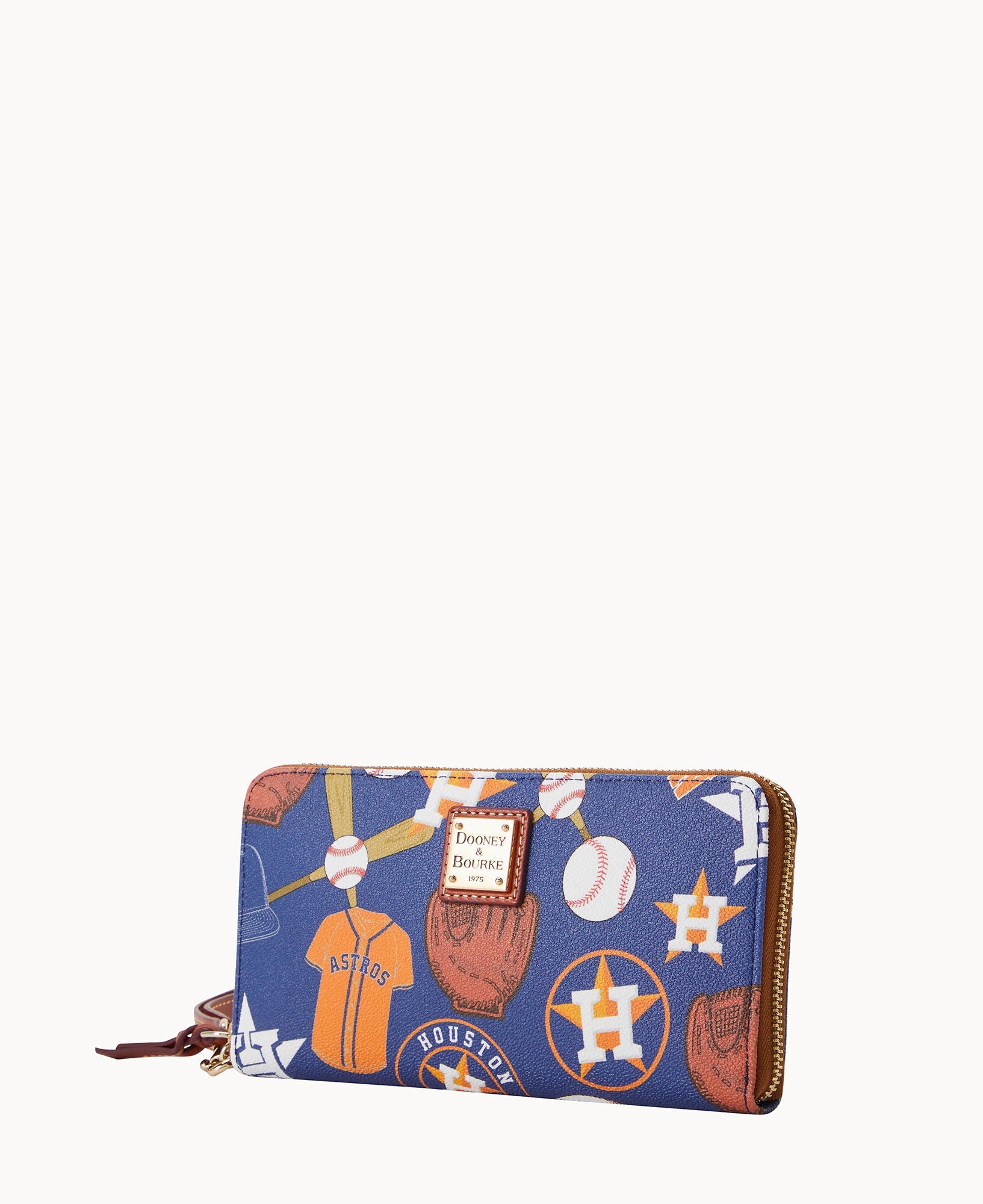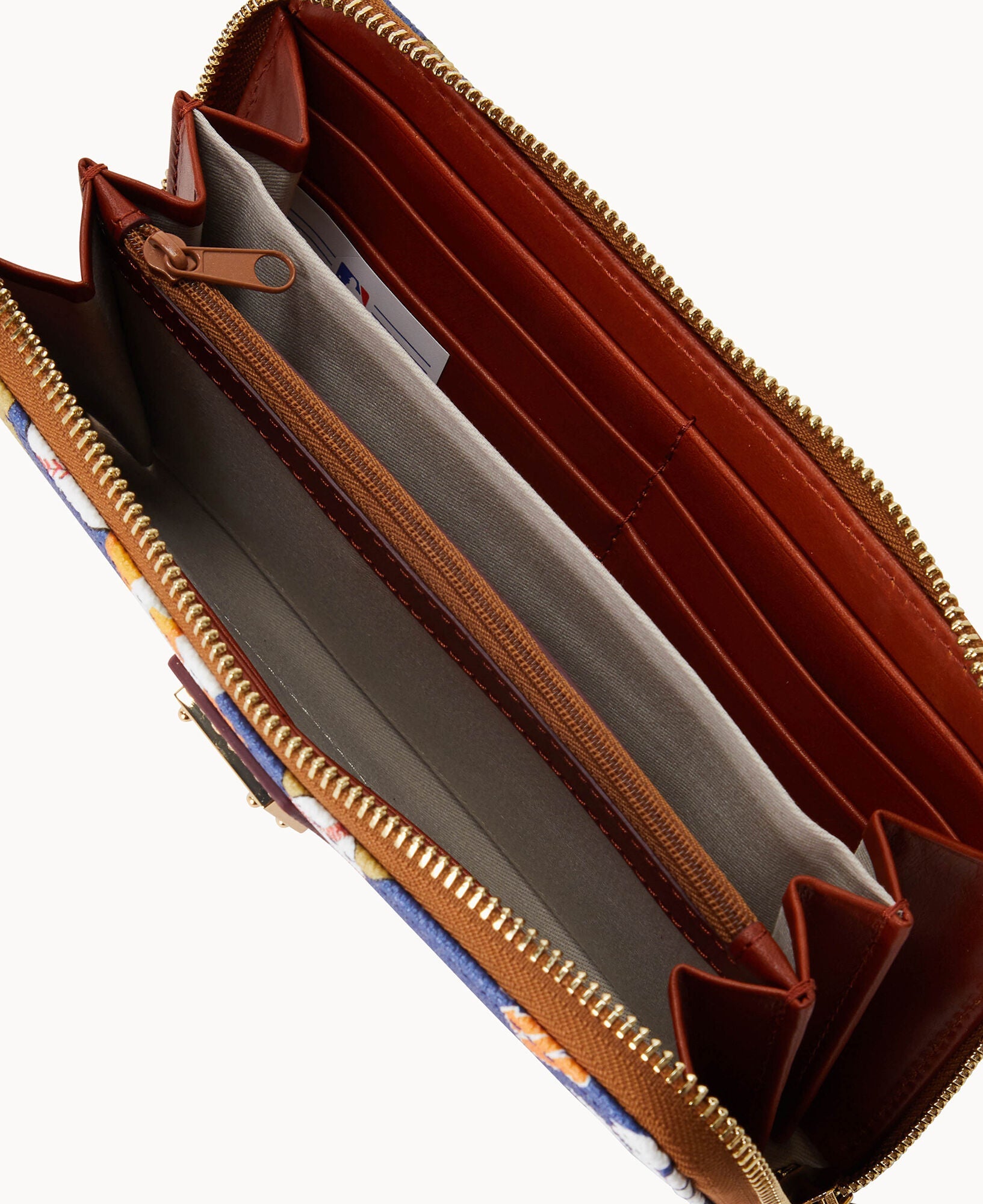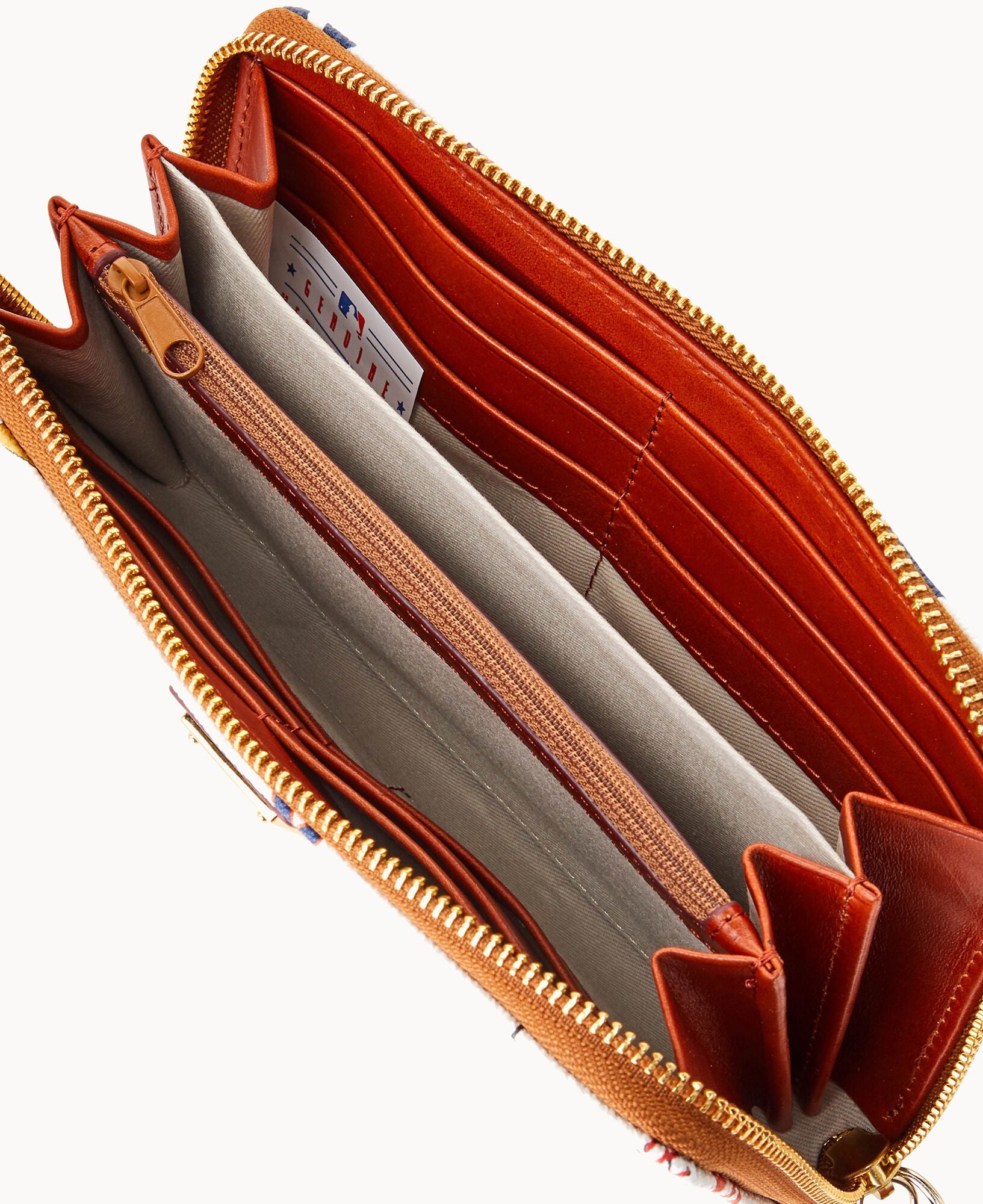 Two compartments. One zip compartment. Twelve credit card slots. Detachable wrist strap. Strap length 7". Lined. Zipper closure.