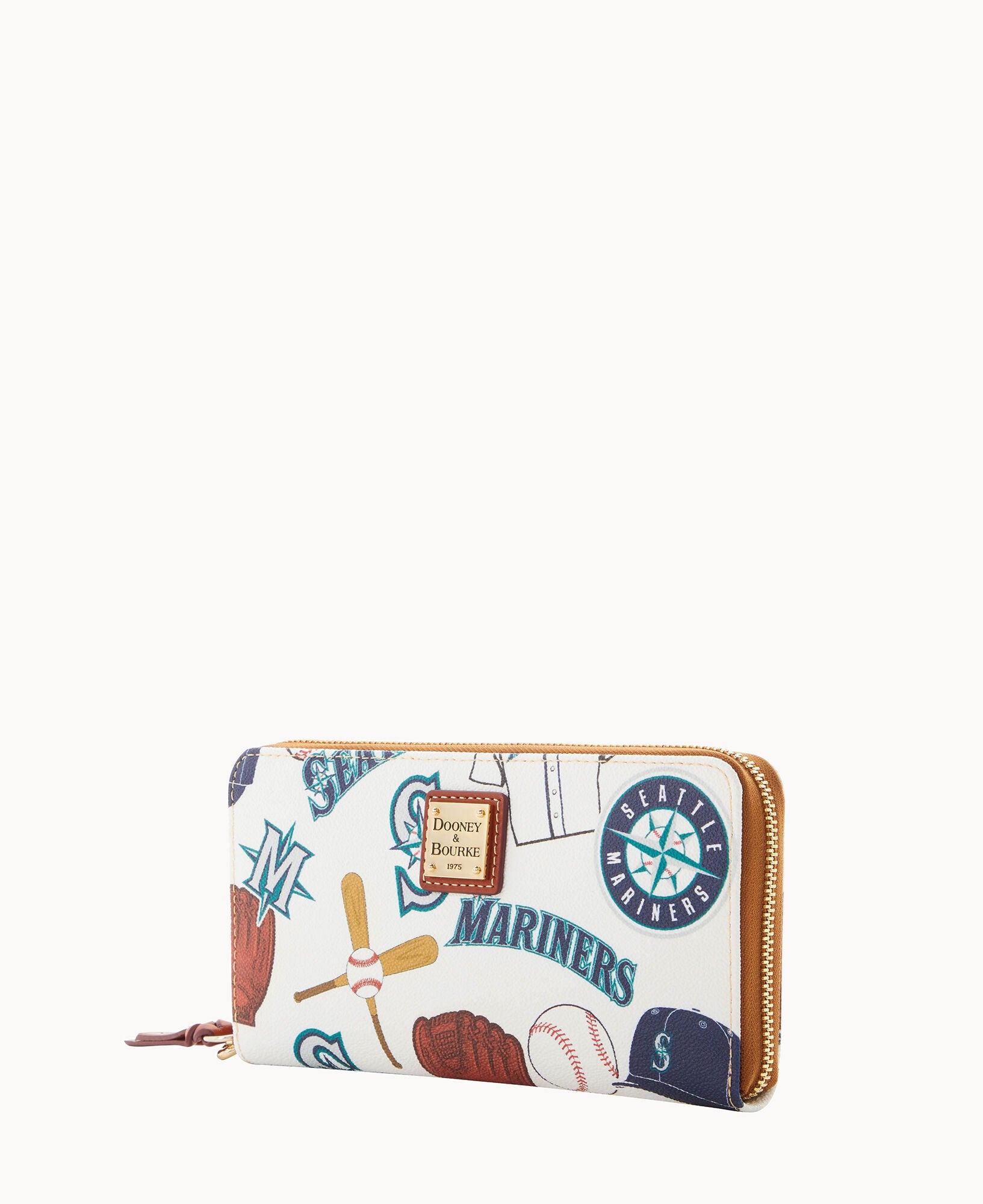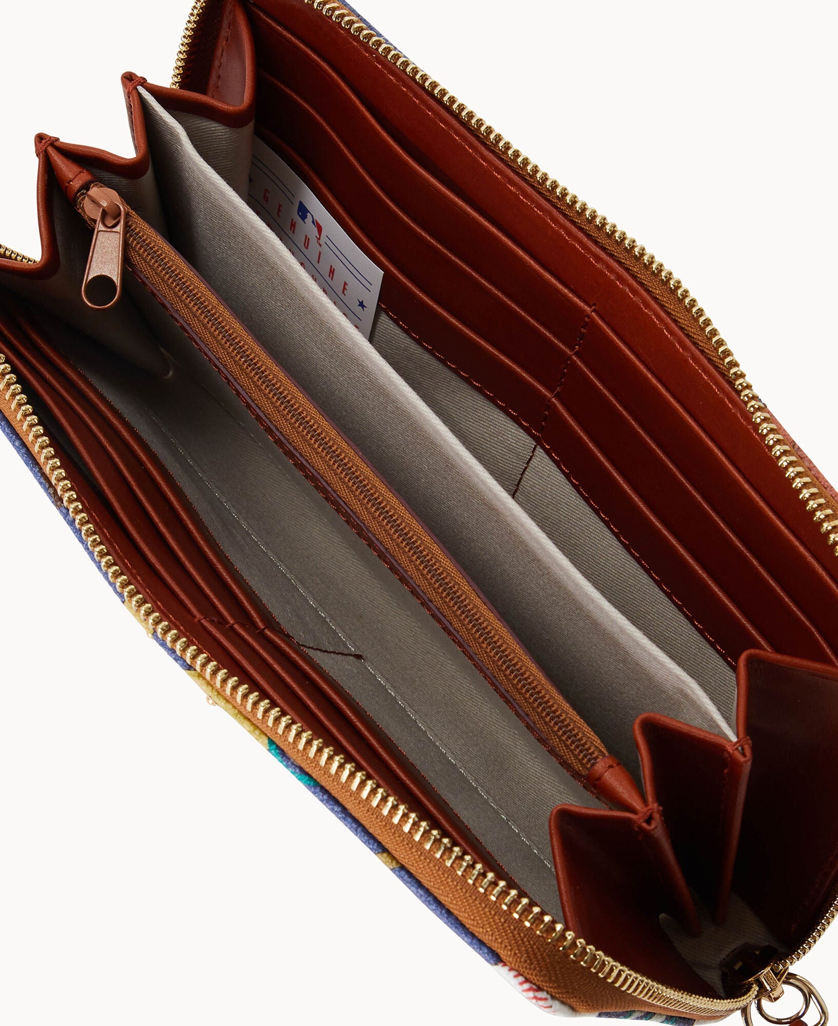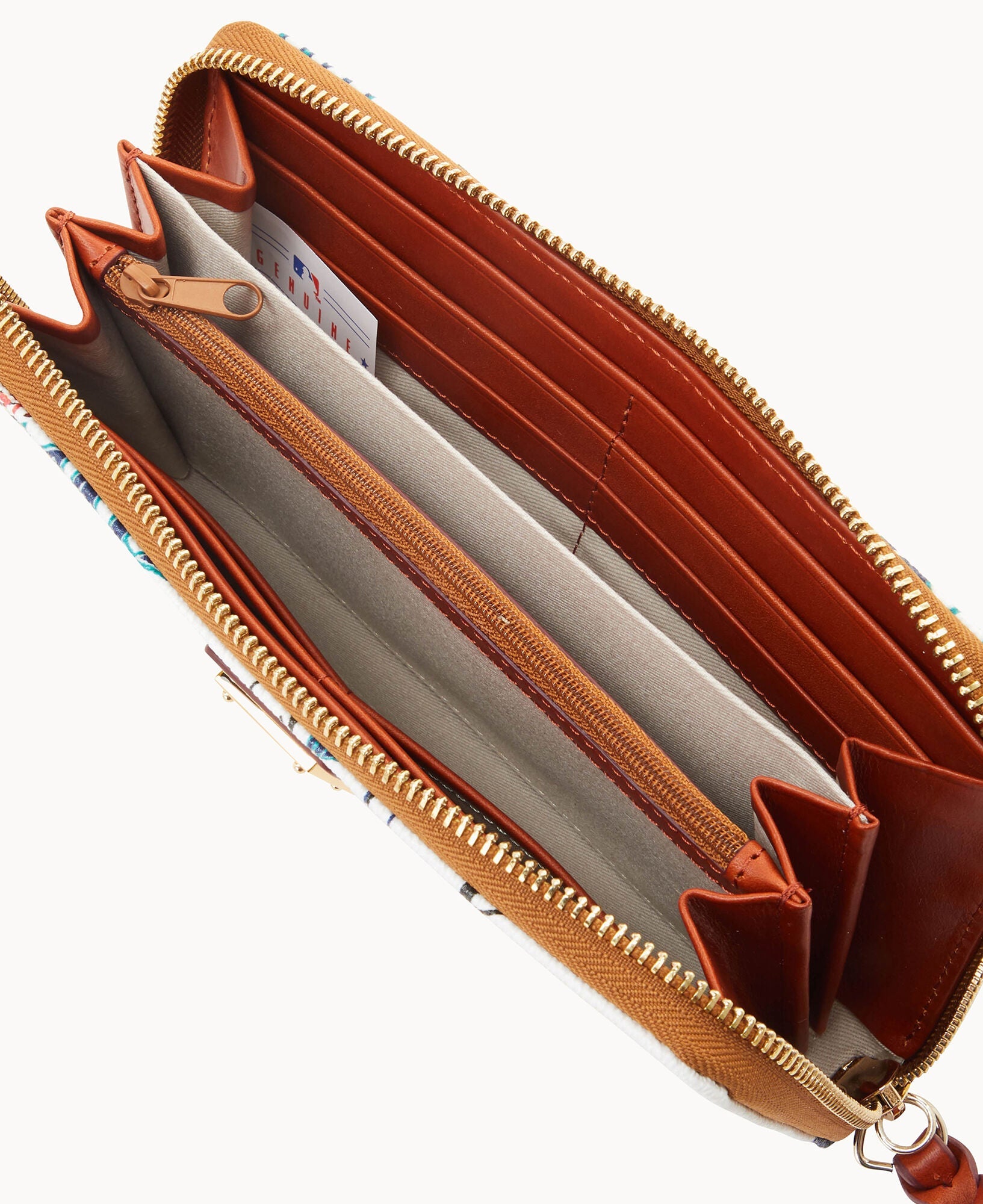 Two compartments. One zip compartment. Twelve credit card slots. Detachable wrist strap. Strap length 7". Lined. Zipper closure.