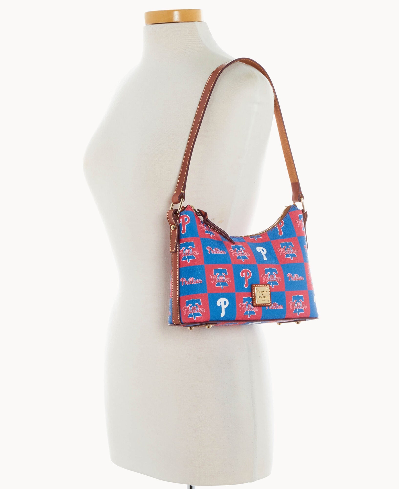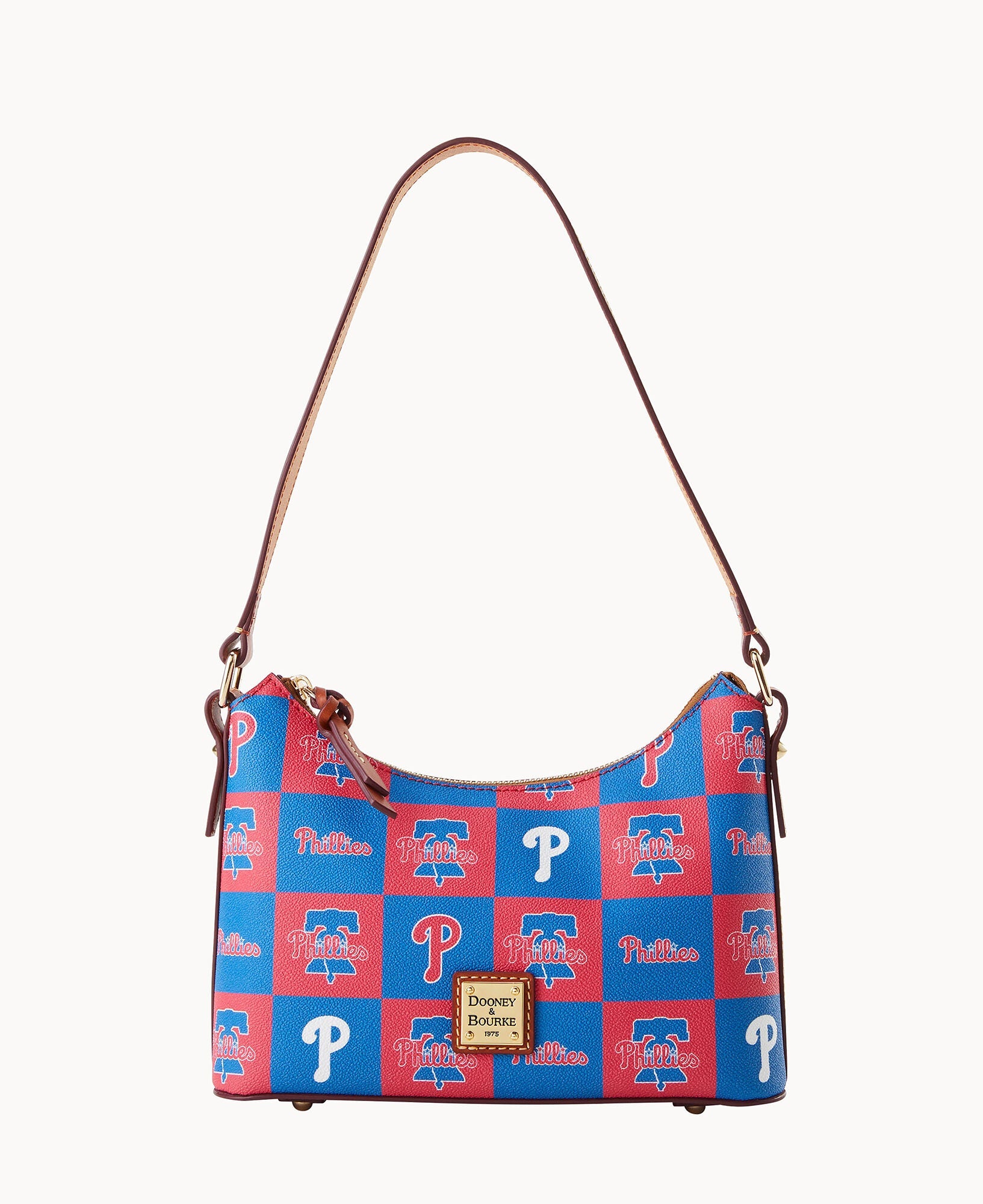 Two inside slip pockets. Inside key hook. Strap drop length 11". Lined. Feet. Zipper closure.