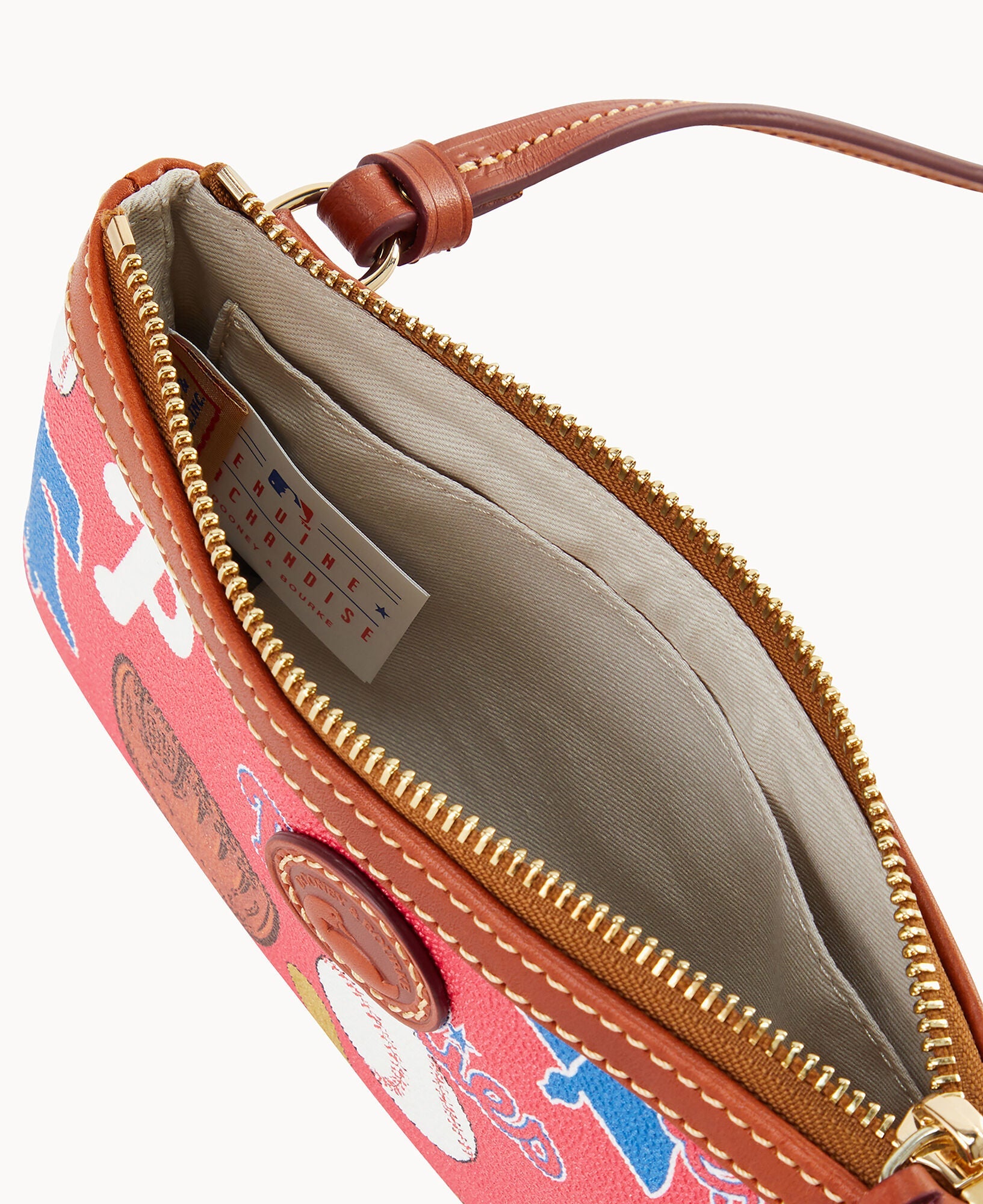 One inside pocket. One inside zip pocket. Cell phone pocket. Inside key hook. Handle drop length 3". Adjustable shoulder strap. Strap drop length 13". Lined. Feet. Zipper closure.