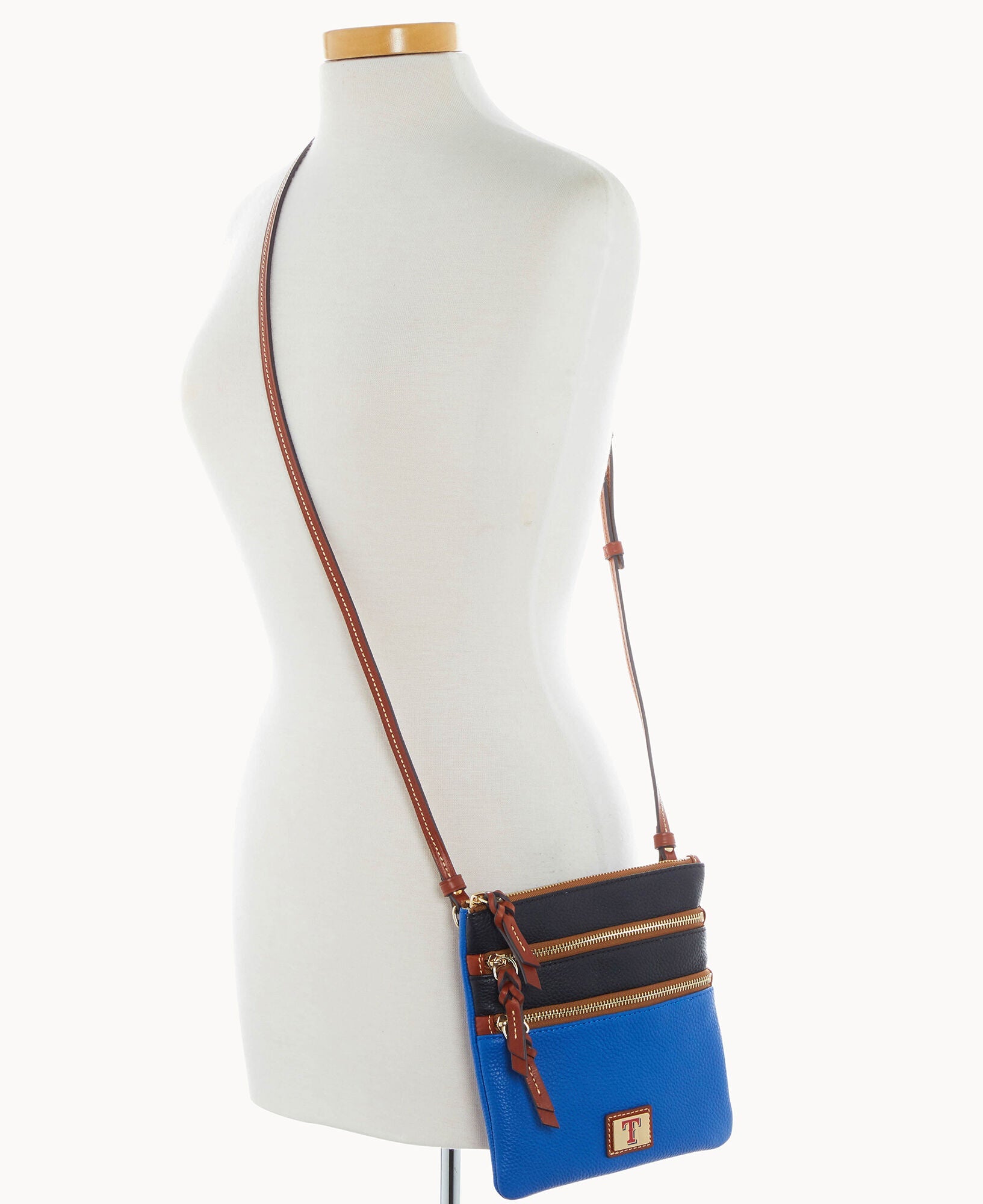 Two outside zip pockets. Cell phone pocket. Adjustable shoulder strap. Strap drop length 24". Lined. Zipper closure.