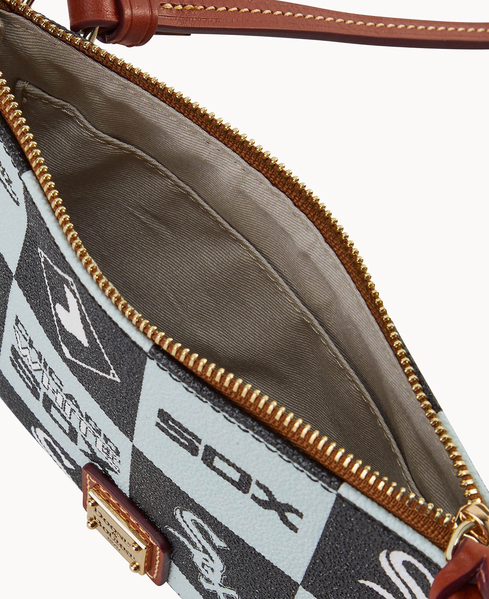 One inside zip pocket. Two inside pockets. Cell phone pocket. Inside key hook. Strap drop length 21". Lined. Feet. Zipper closure.