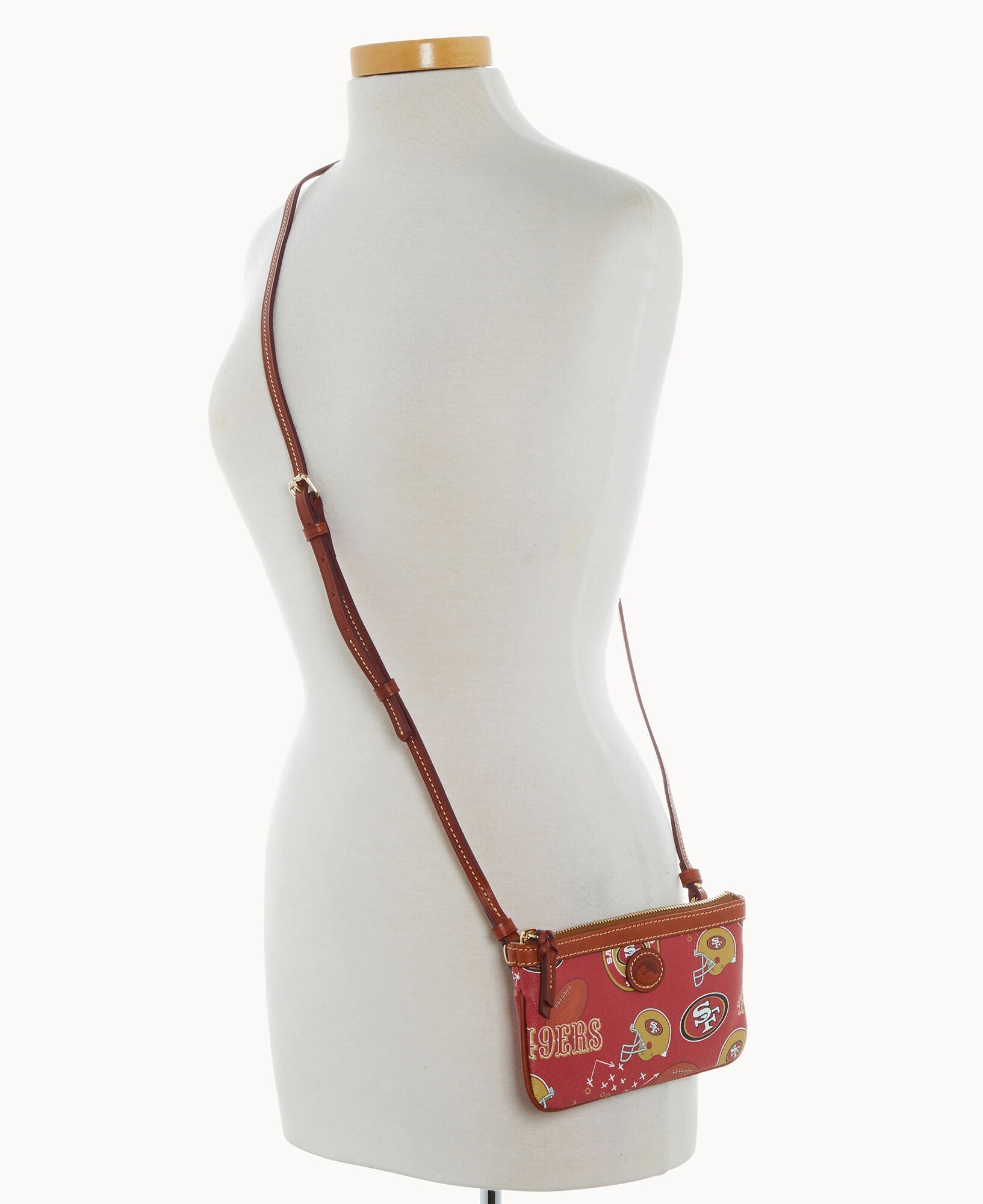 One inside slip pocket. Adjustable strap. Strap drop length 26". Lined. Zipper closure.