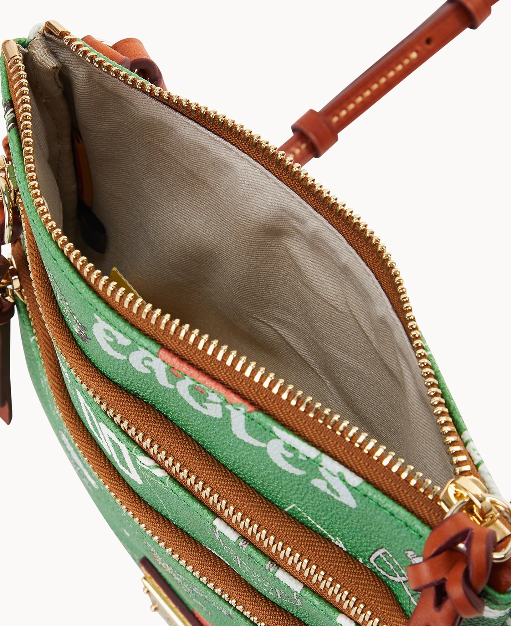 Two outside zip pockets. Cell phone pocket. Adjustable shoulder strap. Strap drop length 24". Lined. Zipper closure.