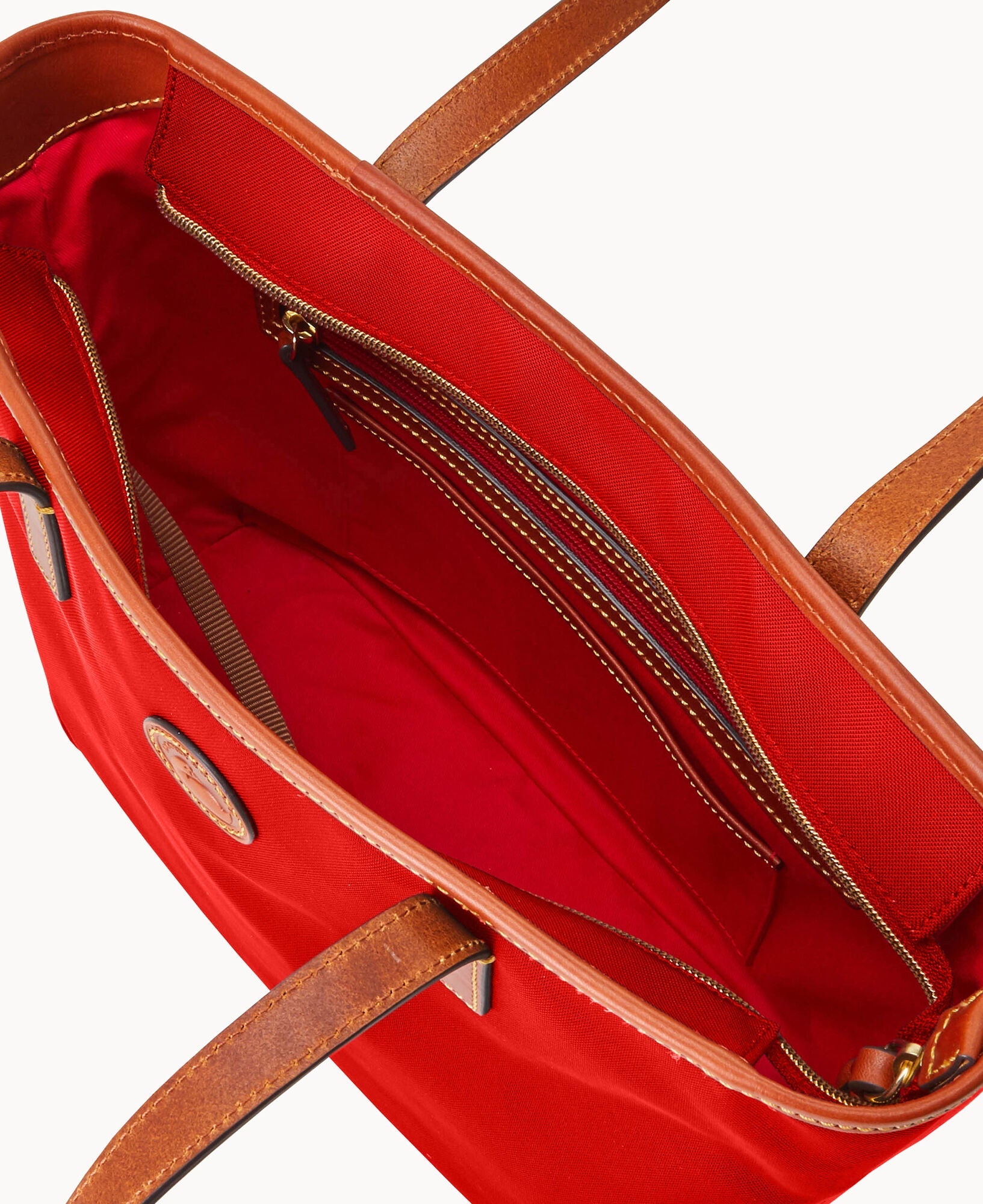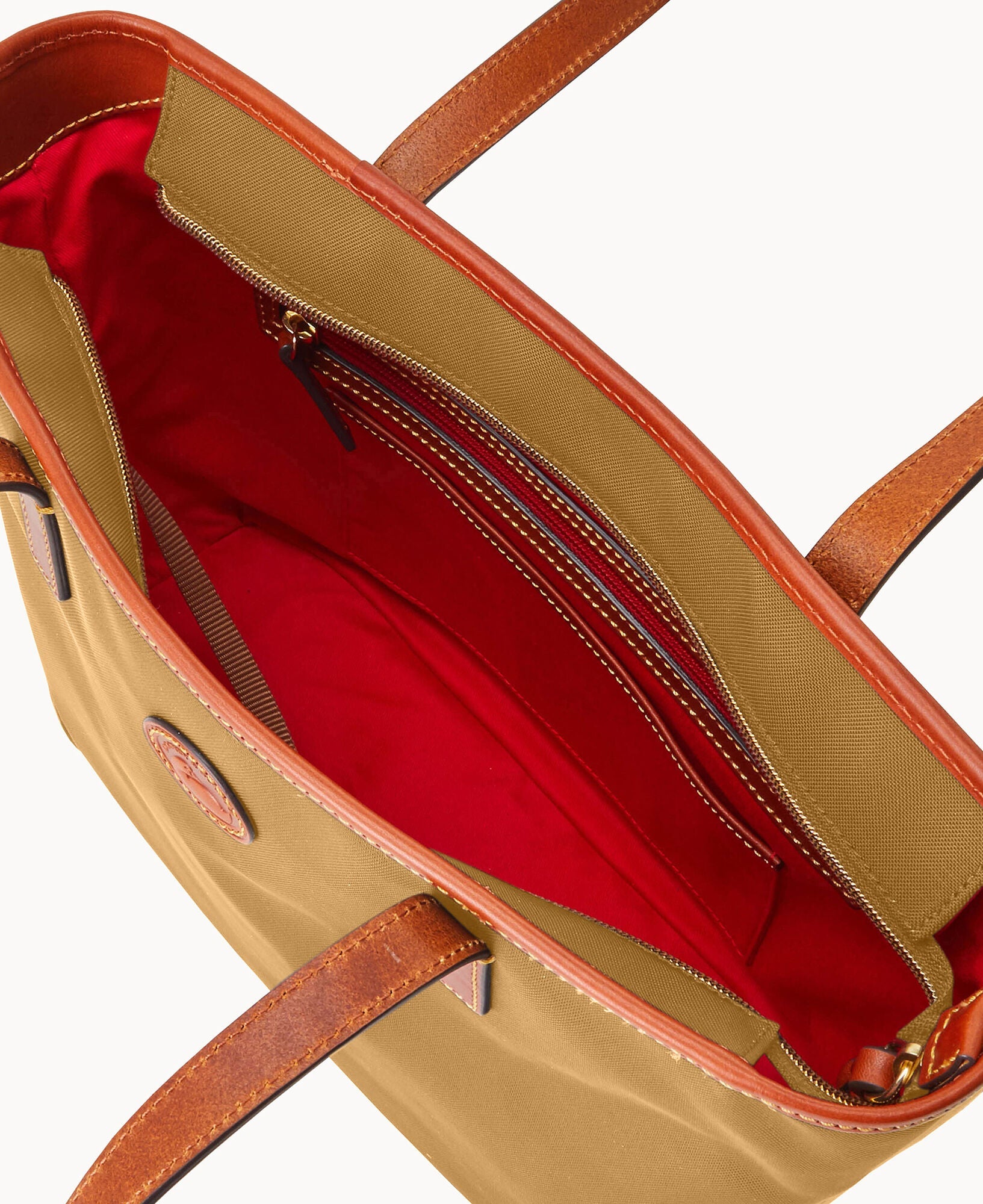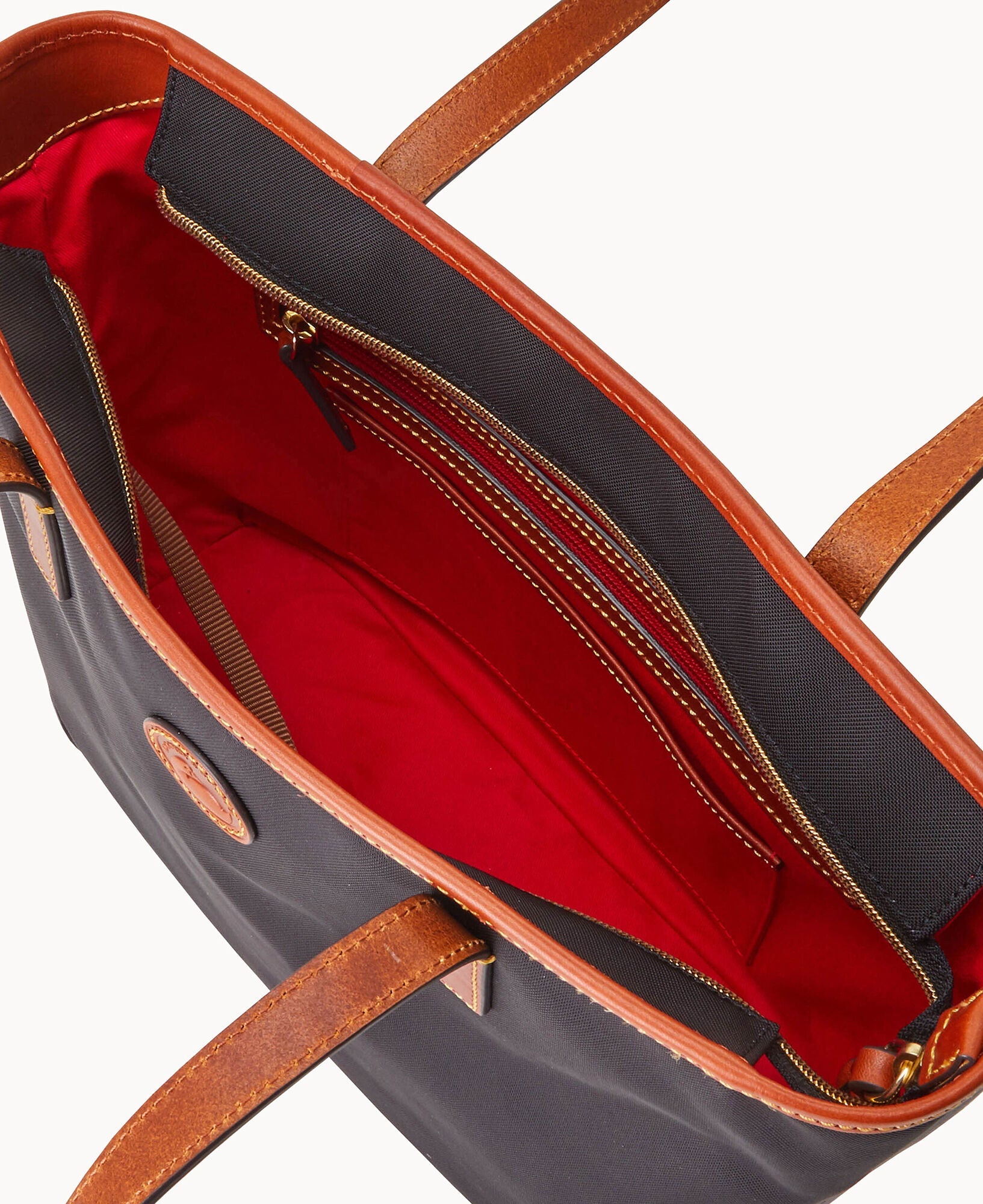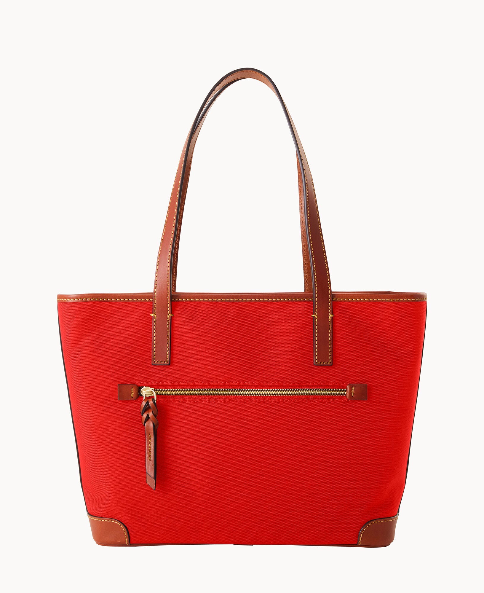 One outside zip pocket. One inside zip pocket. Two inside pockets. Cell phone pocket. Inside key hook. Handle drop length 10.25". Strap drop length 8.5". Lined. Feet. Zipper closure.