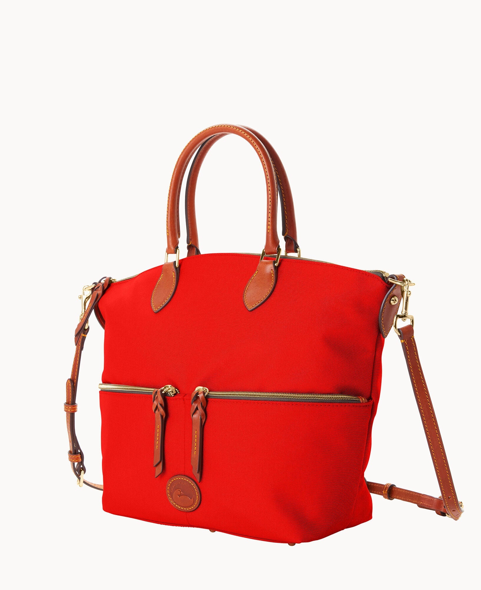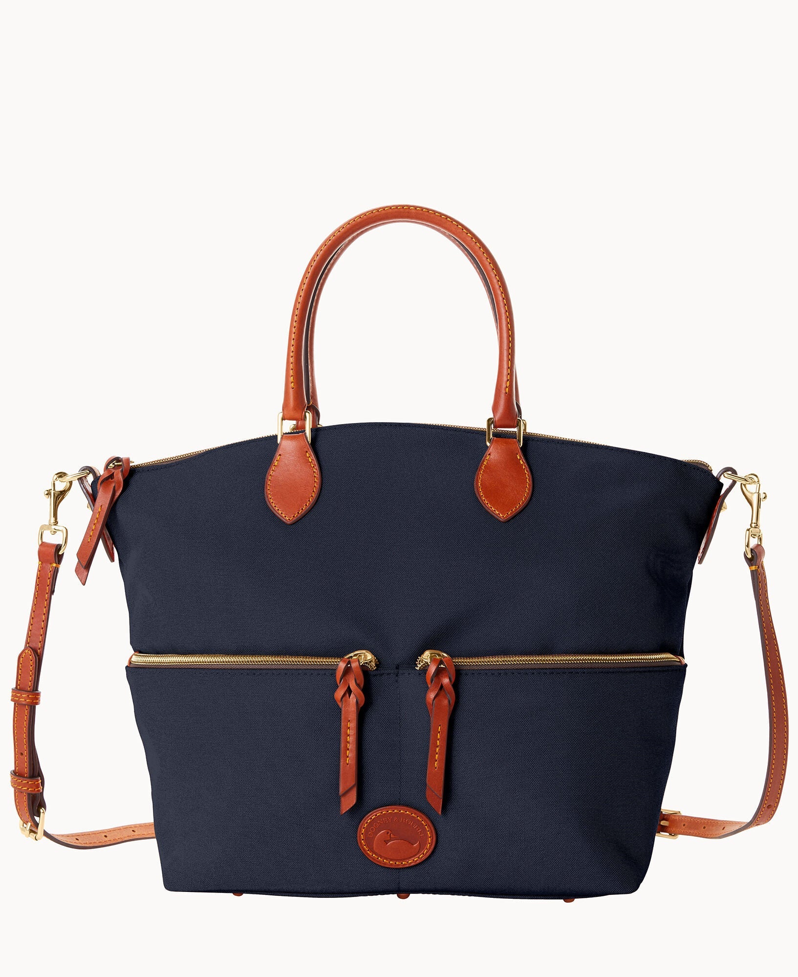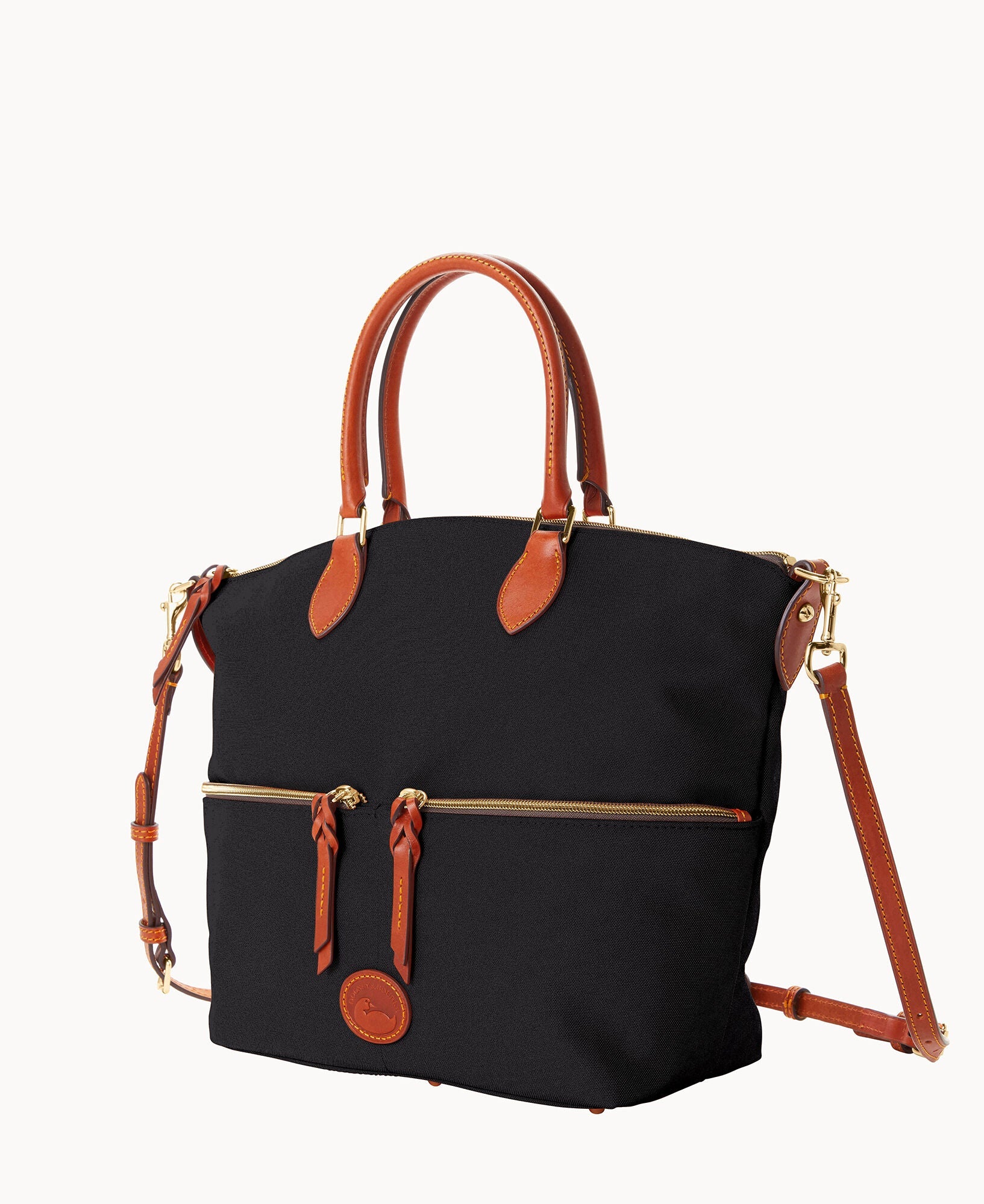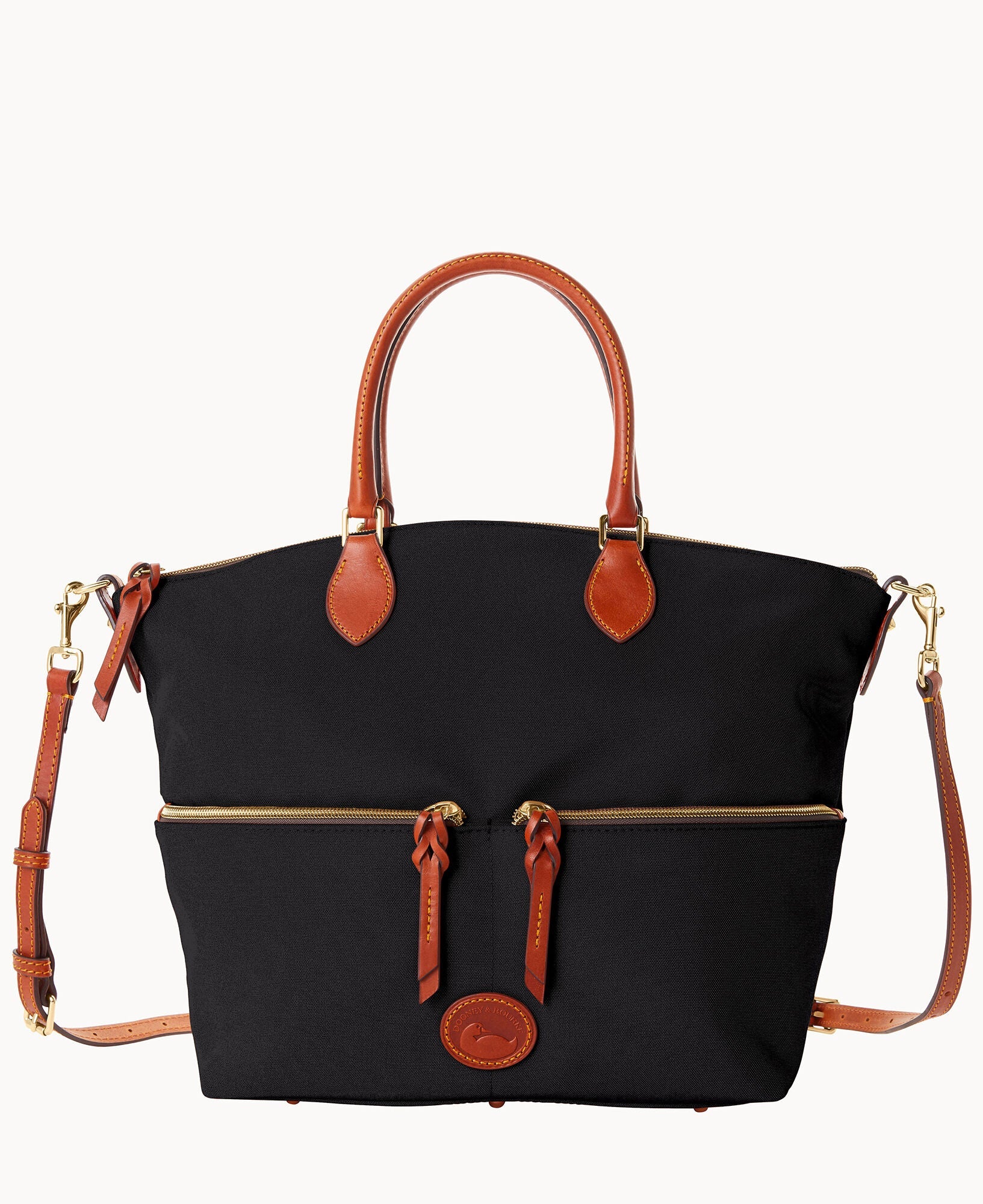 Two outside zip pockets. One inside zip pocket. Two inside pockets. Cell phone pocket. Inside key hook. Handle drop length 5.5". Adjustable, detachable shoulder strap. Strap drop length 22". Lined. Feet. Zipper closure.