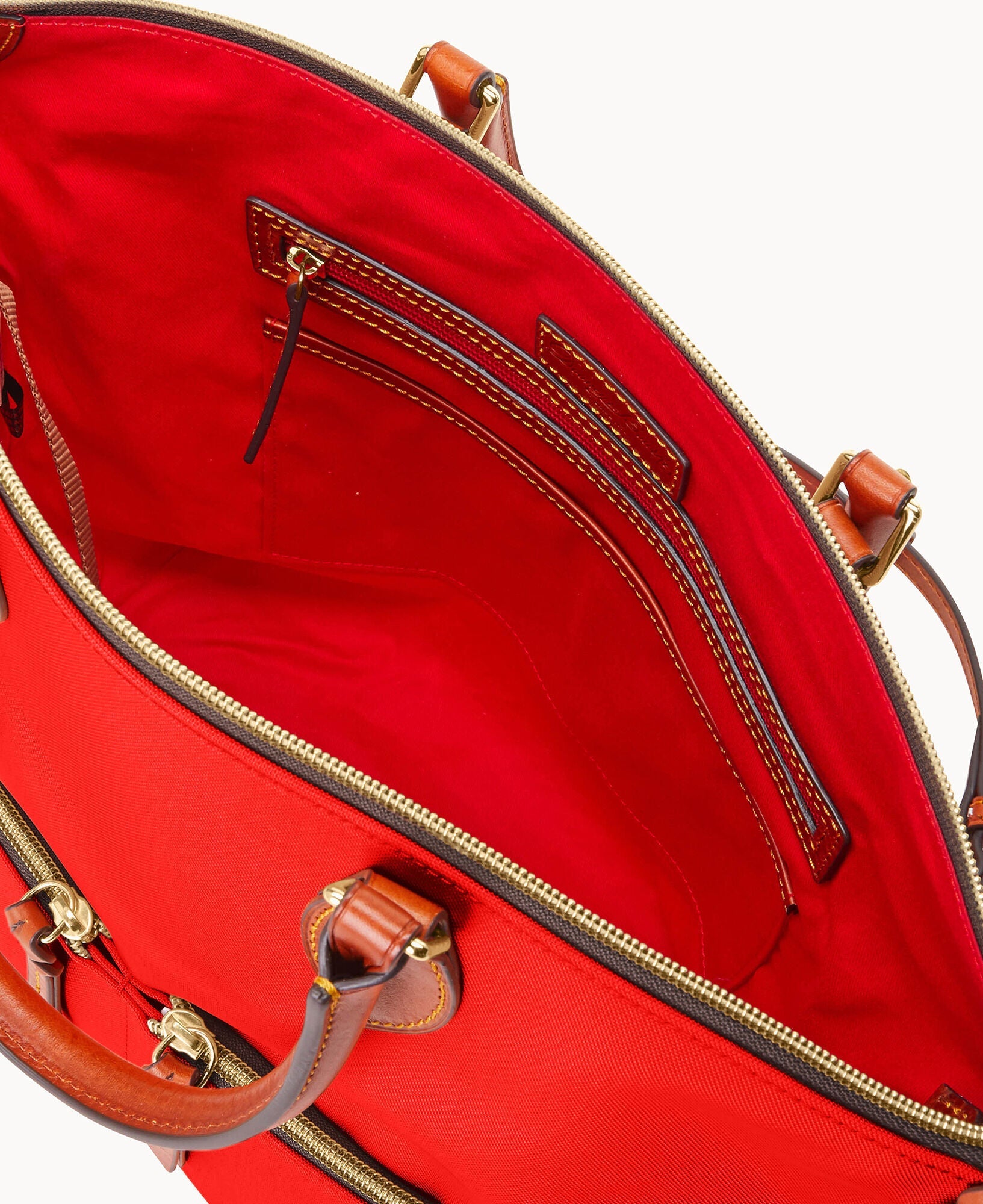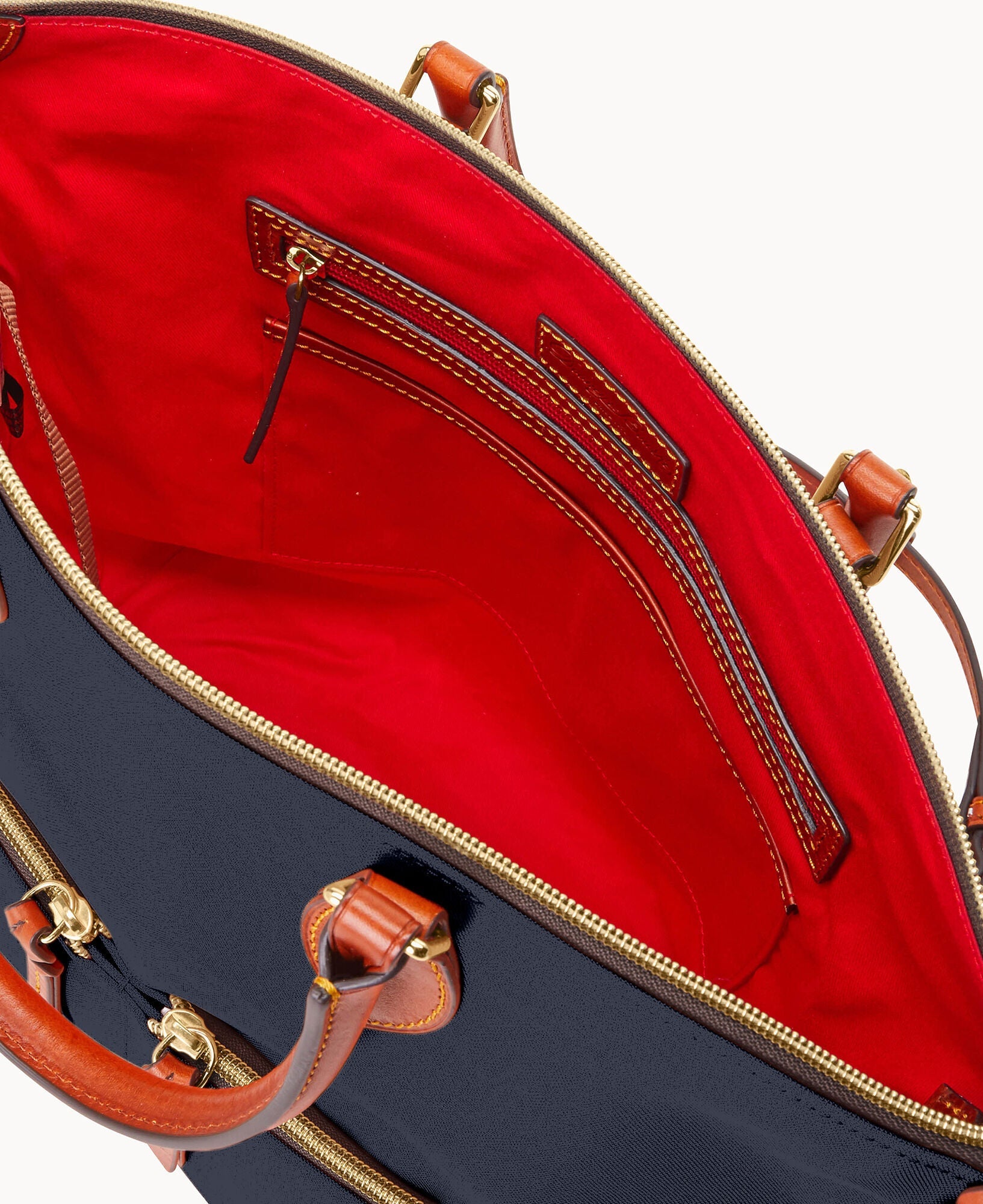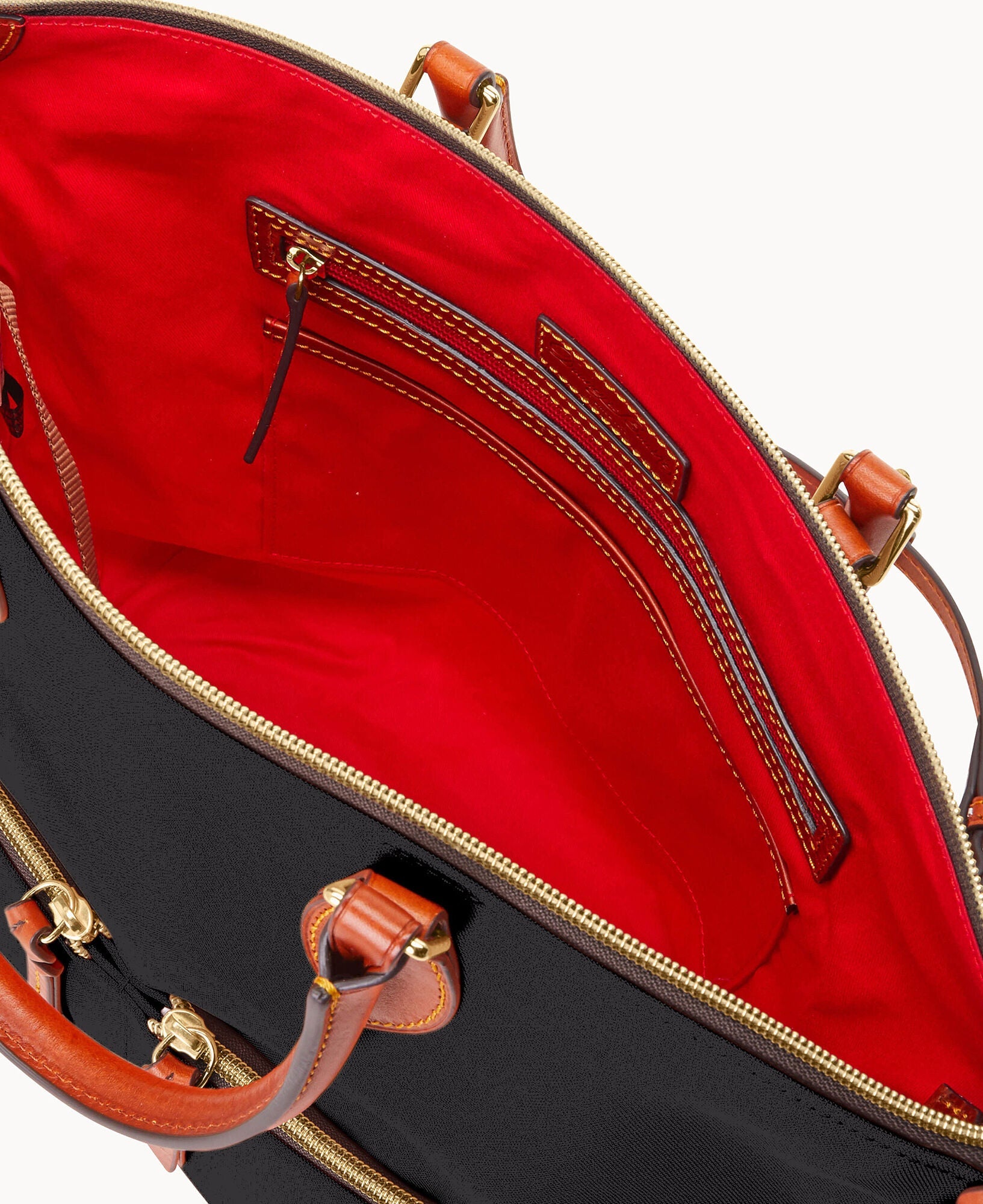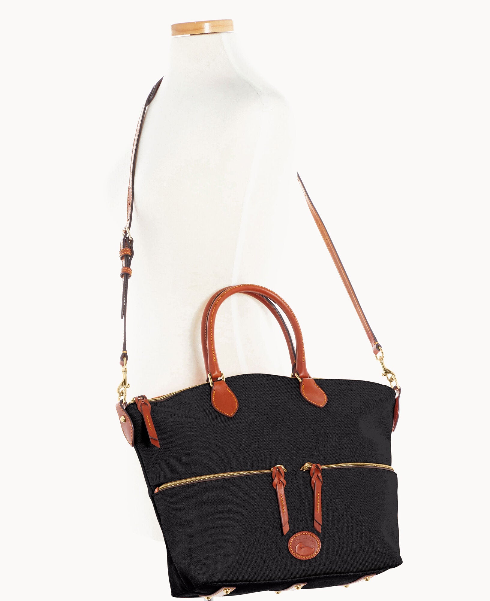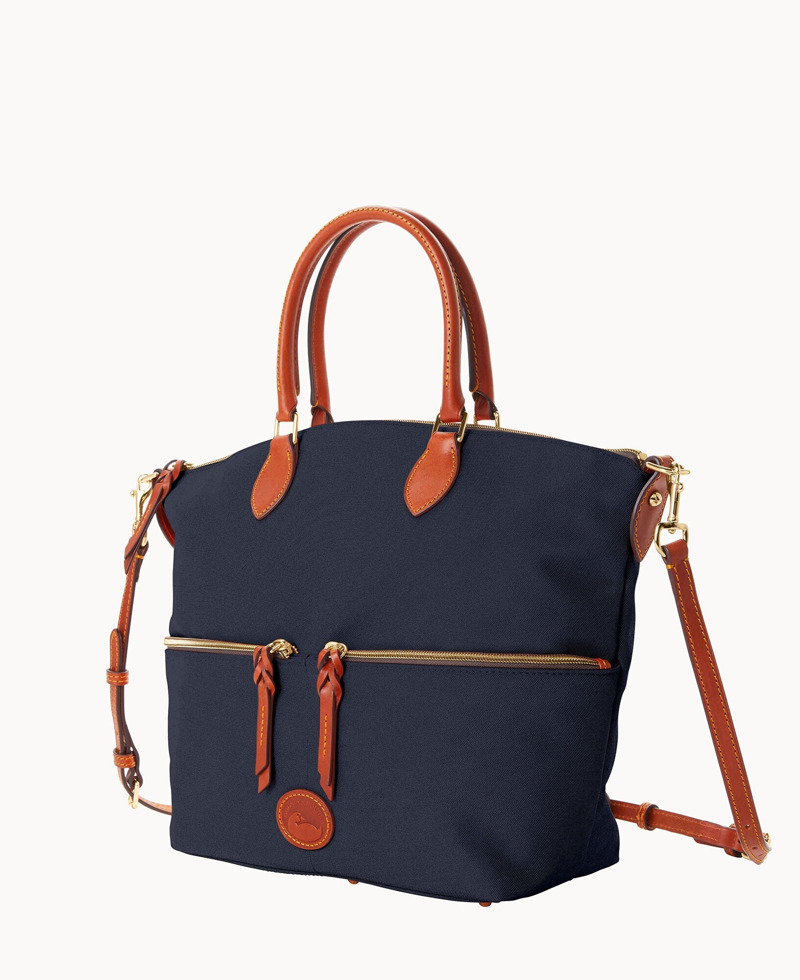 Two outside zip pockets. One inside zip pocket. Two inside pockets. Cell phone pocket. Inside key hook. Handle drop length 5.5". Adjustable, detachable shoulder strap. Strap drop length 22". Lined. Feet. Zipper closure.
