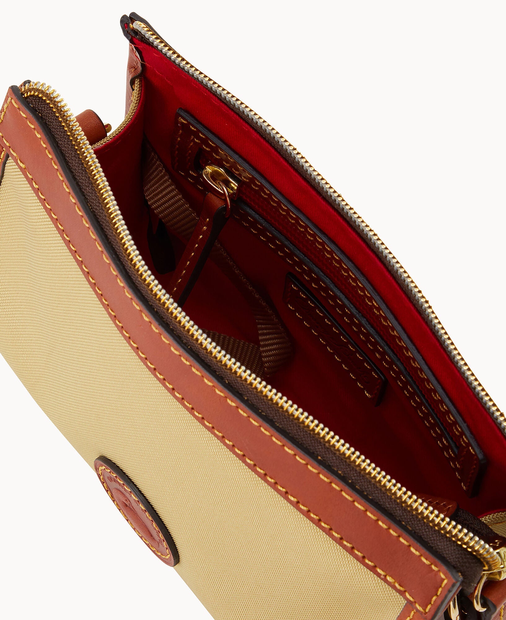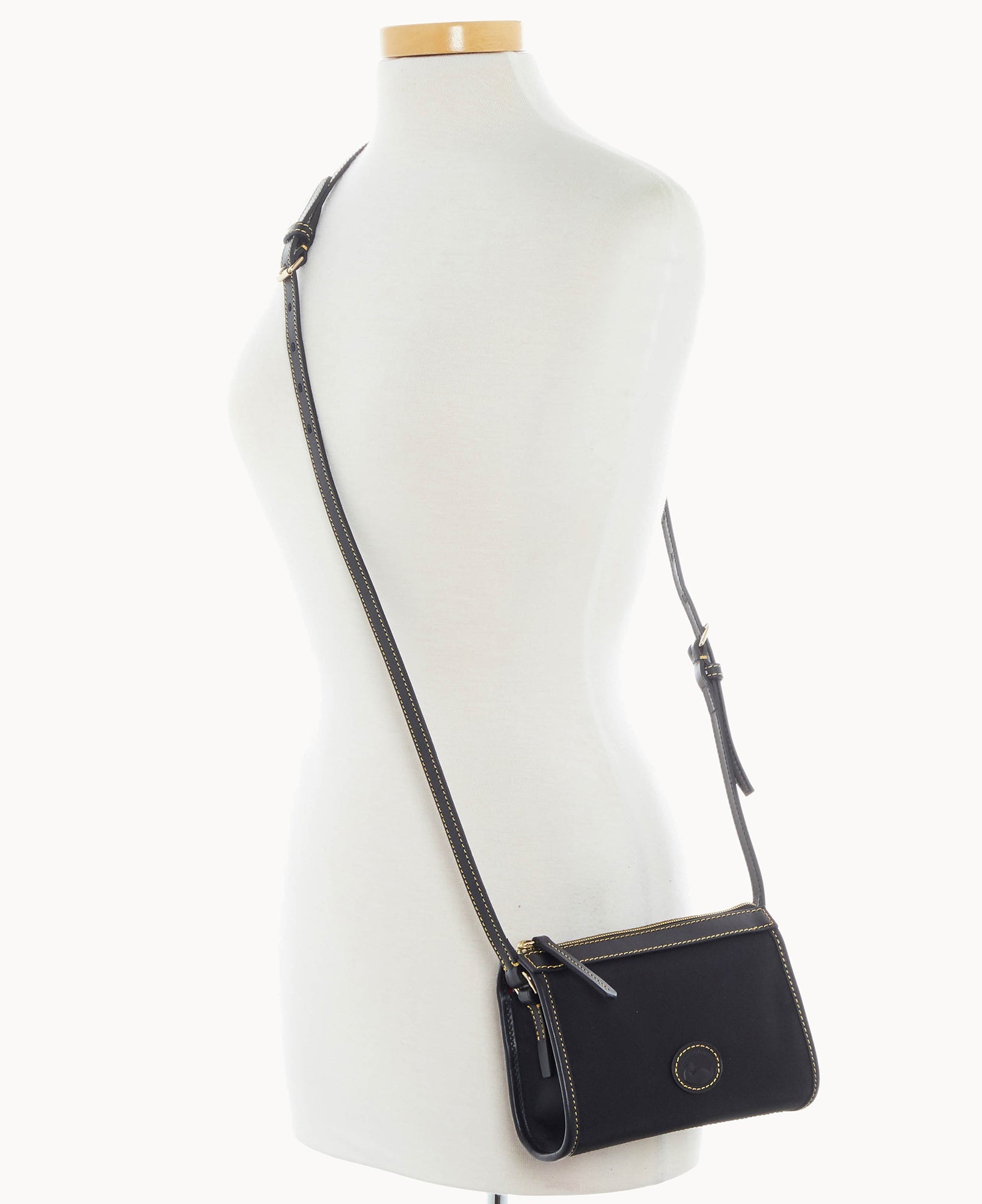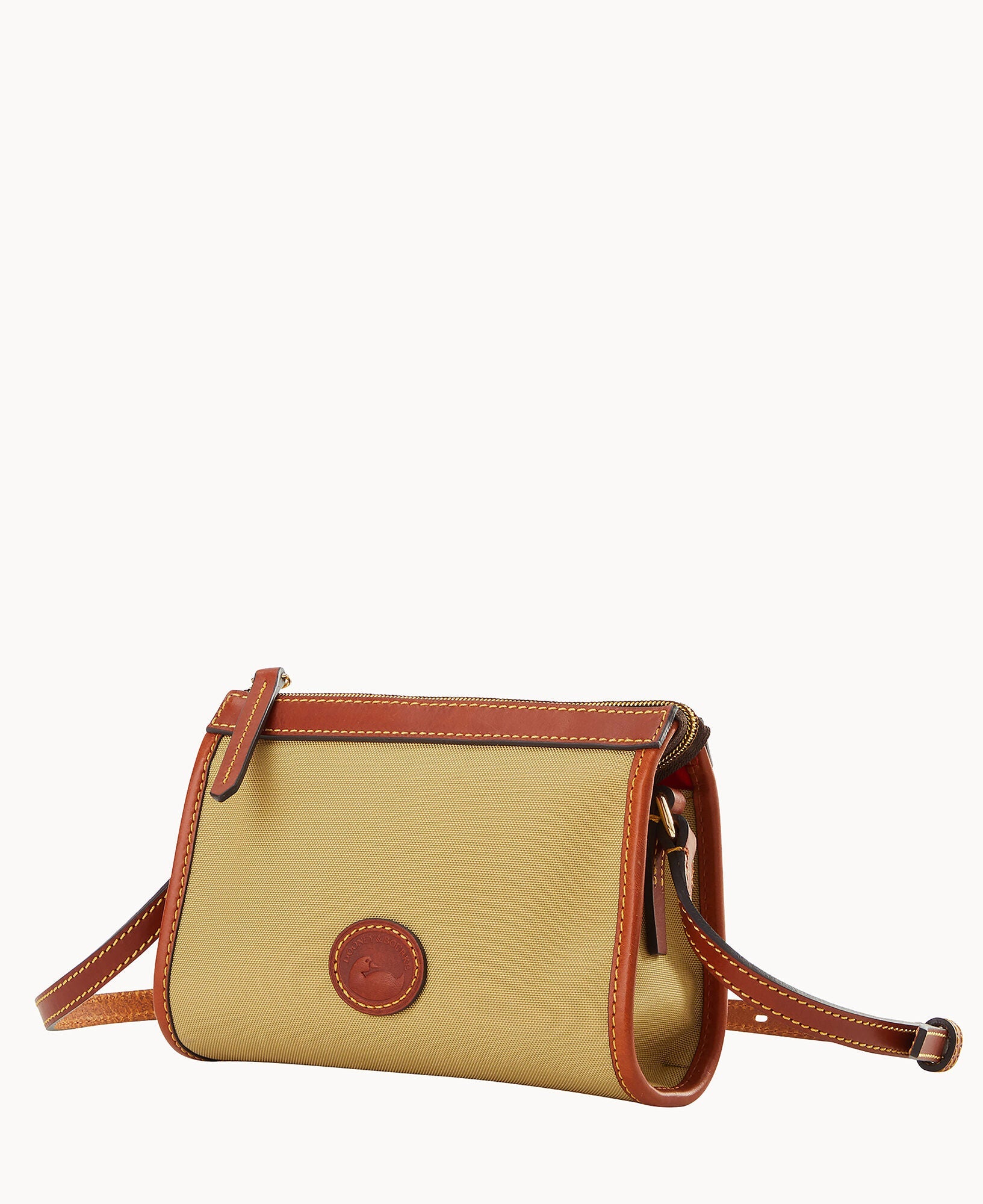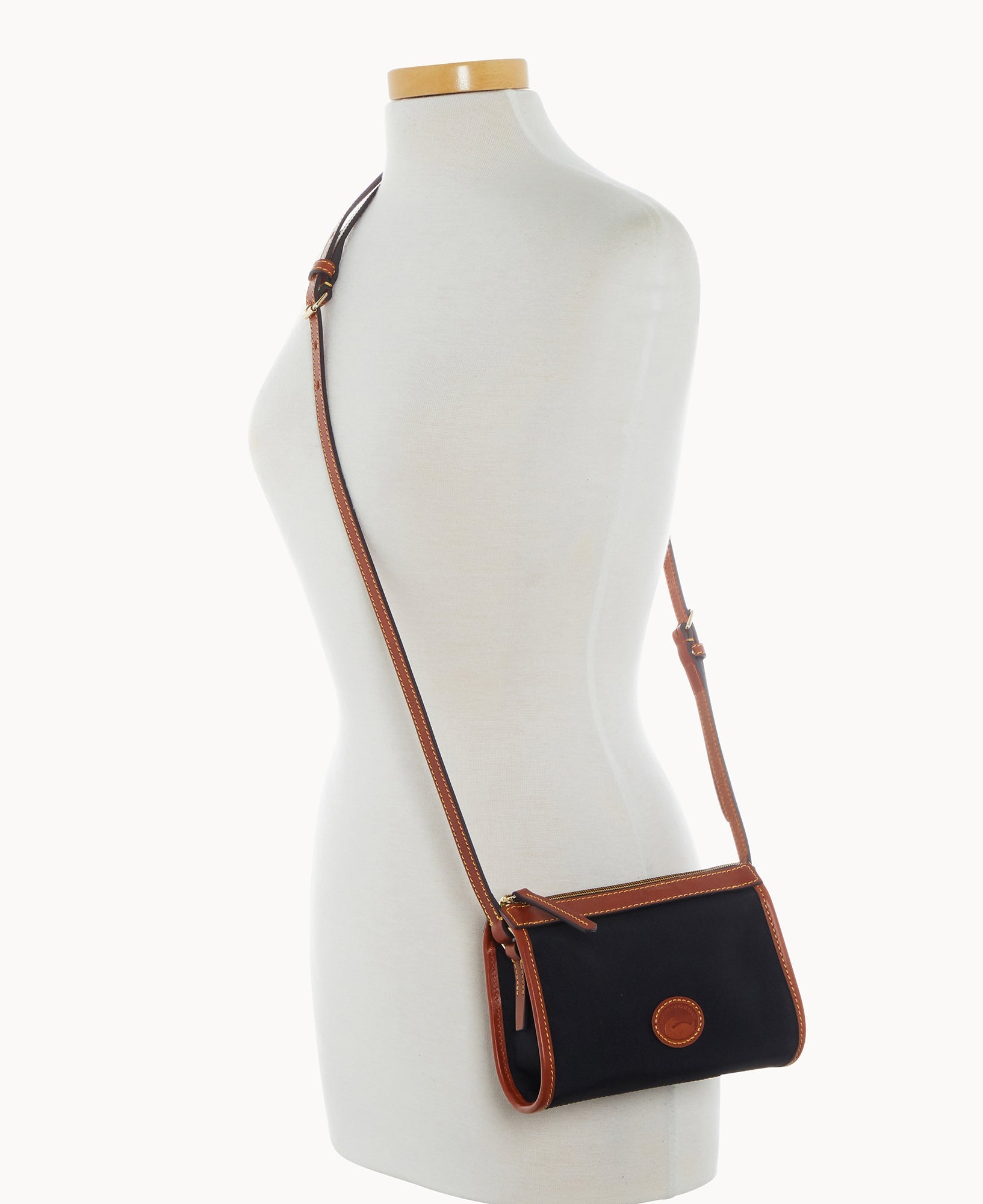 One inside pocket. One inside zip pocket. Inside key hook. Strap drop length 23". Lined. Zipper closure.